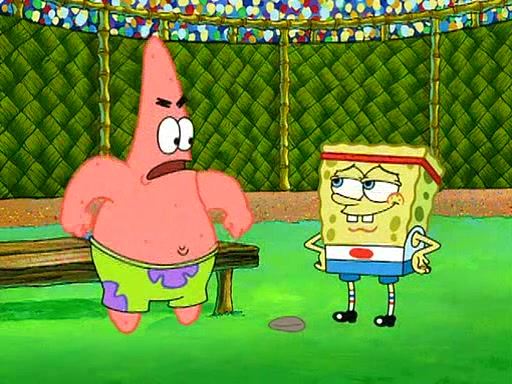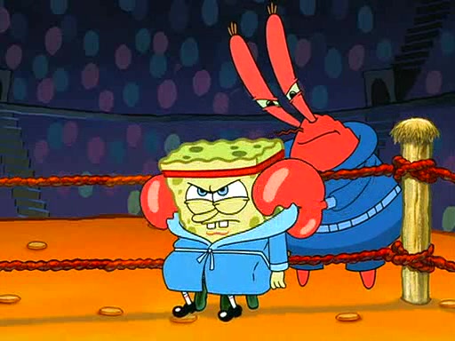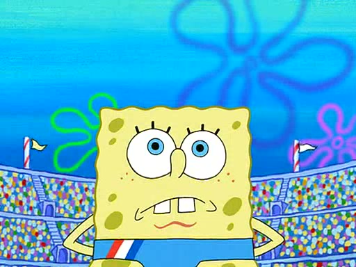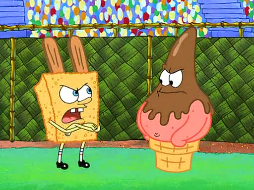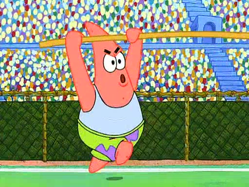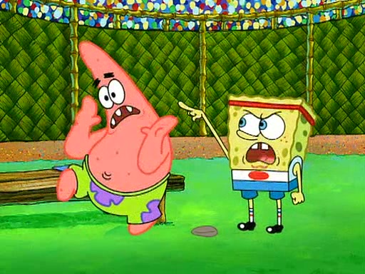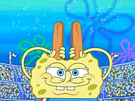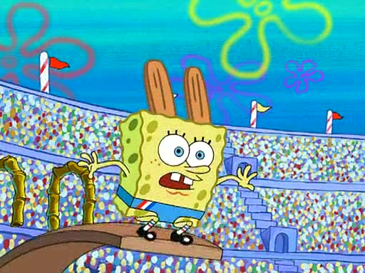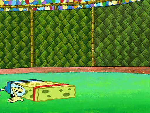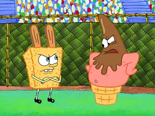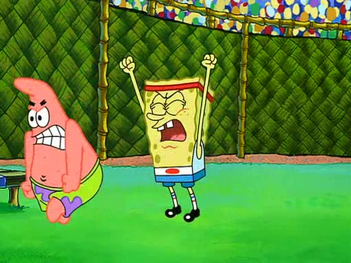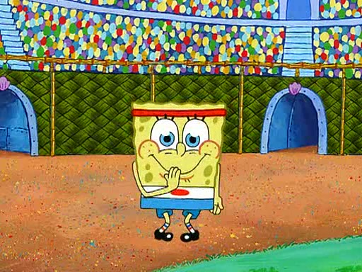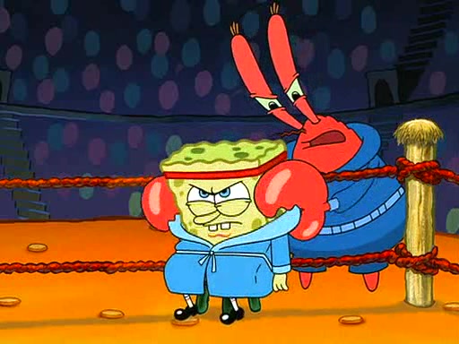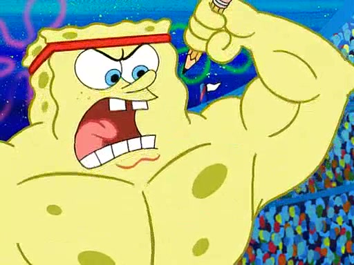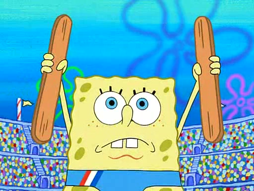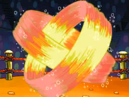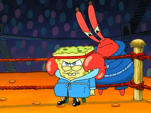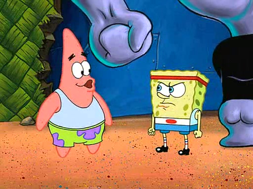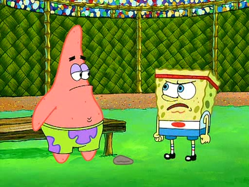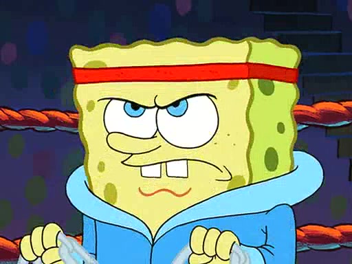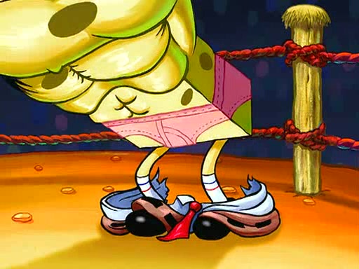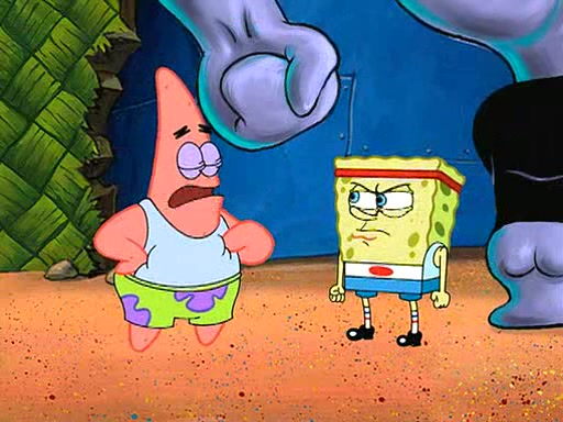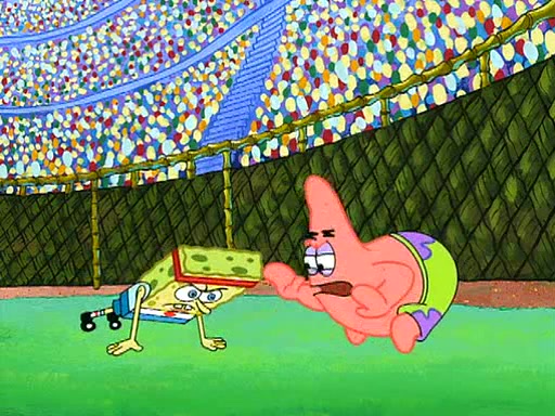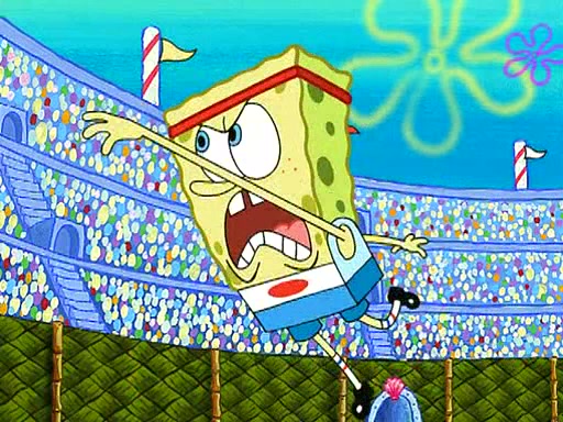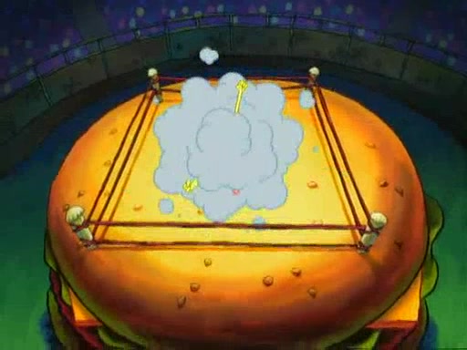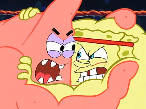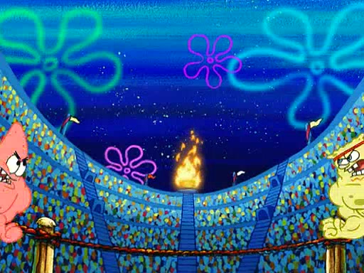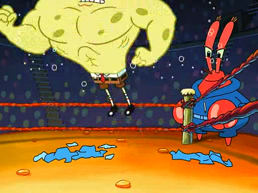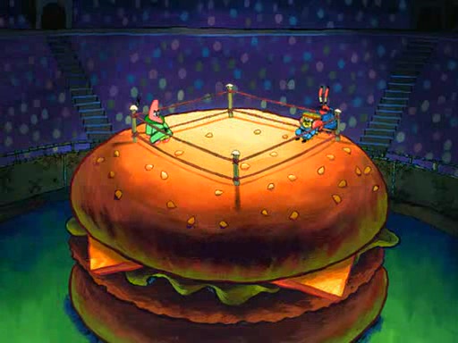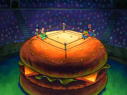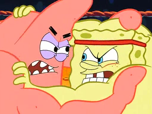 Finally, after a short montage, SpongeBob and Patrick's scores are tied when they face off against each other in the final event, "Bun Wrestling," which is just regular wrestling only on a bun. Mr. Krabs and Plankton instigate by saying: (Mr. Krabs) "Don't forget he called ye yellow" and (Plankton) "Don't forget, he called you pink!" To intimidate Patrick, SpongeBob bites a chain and grins with the chains wrapped around his teeth looking similar to braces. To intimidate SpongeBob, Patrick rips a lemon in half an pushes the halves into his eyes, then screams. SpongeBob rips his robe off revealing a large muscular body. Patrick follows by ripping his robe off, revealing only a business outfit. He realizes his mistake and tears of the suit revealing a body similar to SpongeBob's. As the bell sounds for the fight to begin, they jump into the air yelling. They collide and begin fighting.