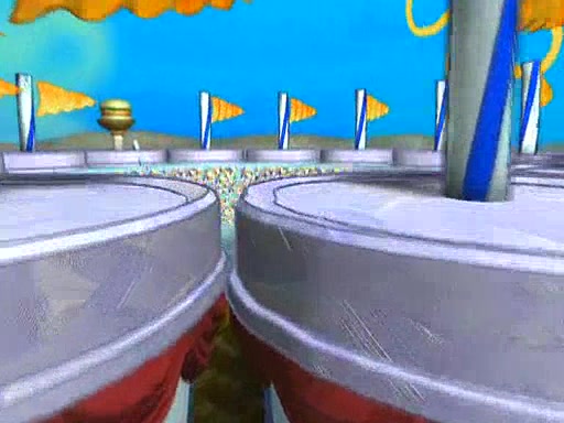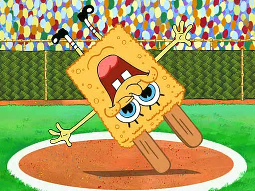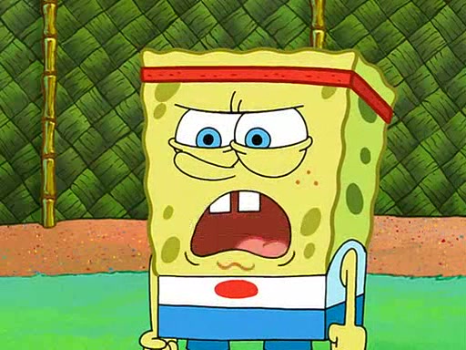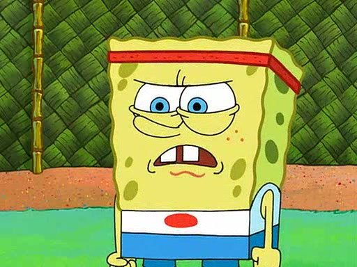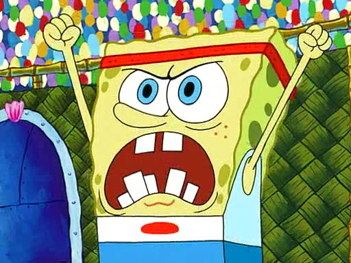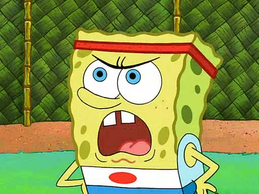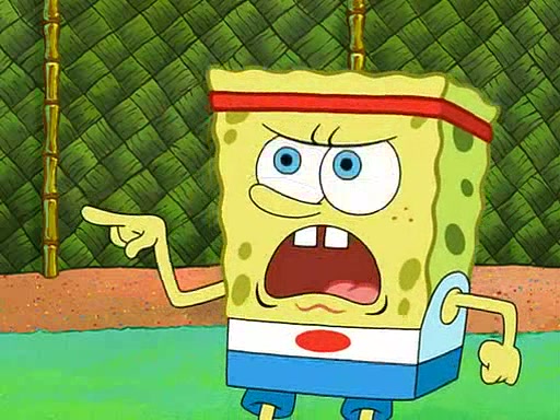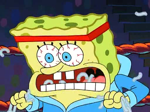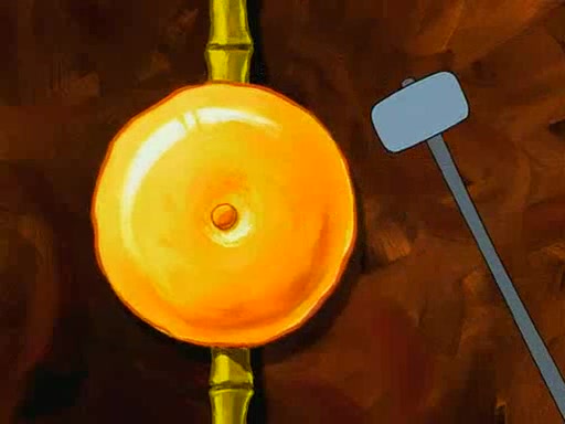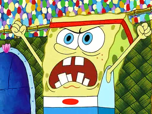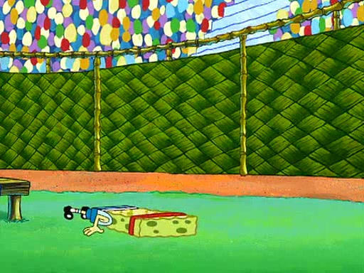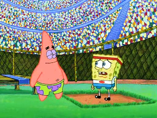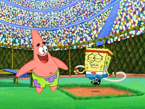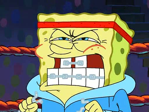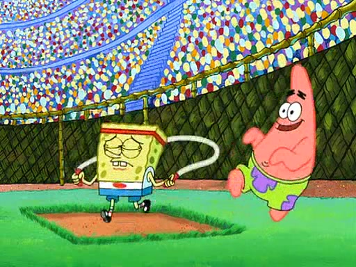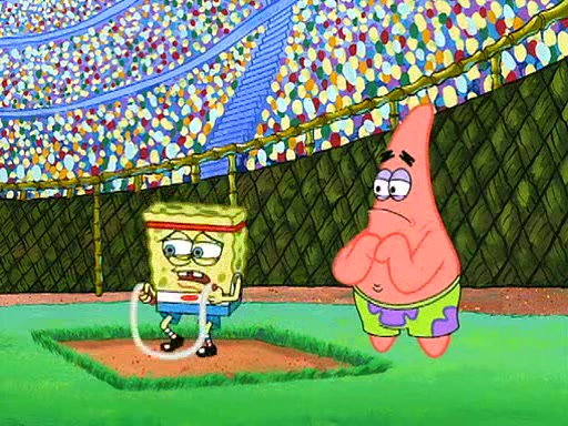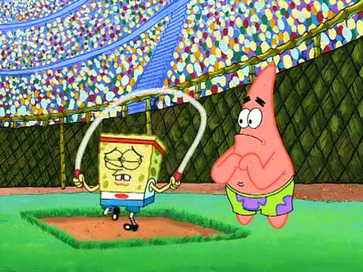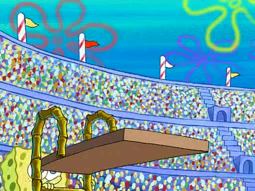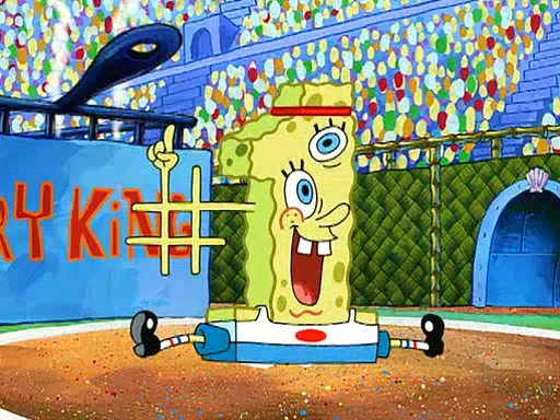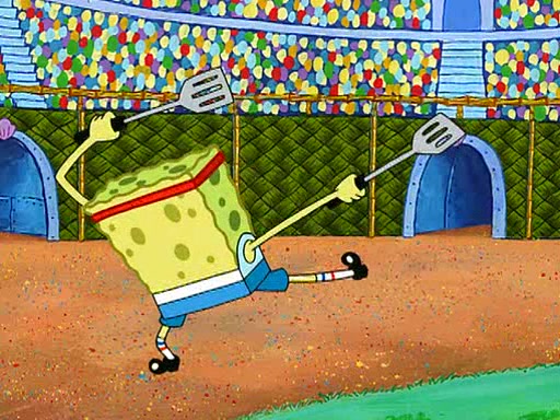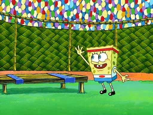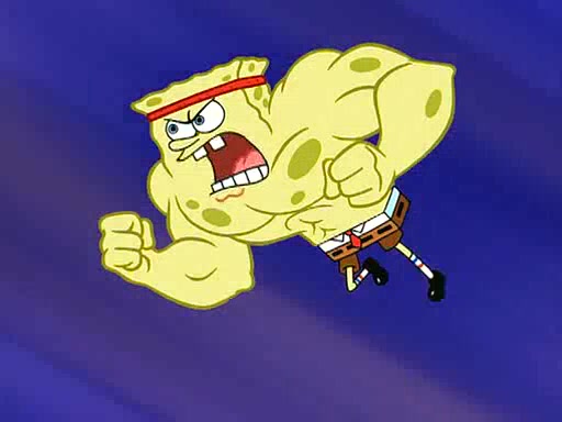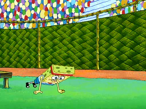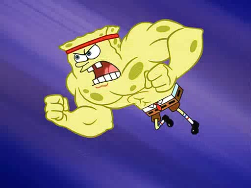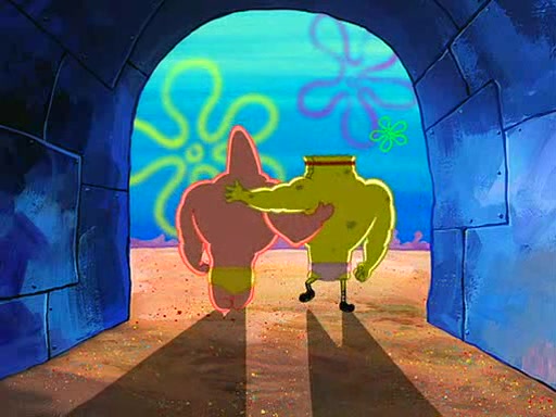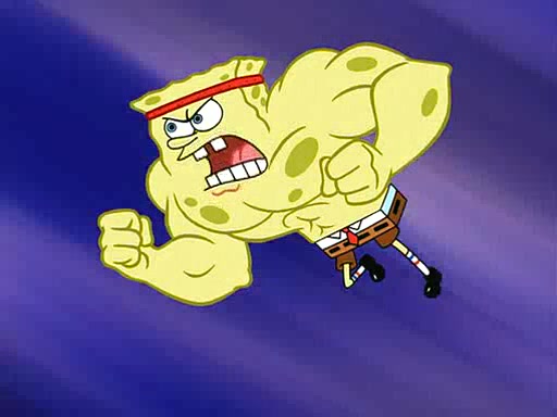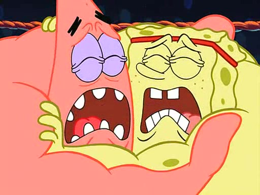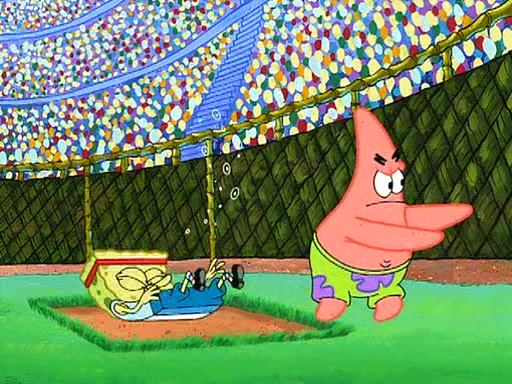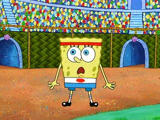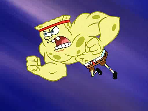 Finally, after a short montage, SpongeBob and Patrick's scores are tied when they face off against each other in the final event, "Bun Wrestling," which is just regular wrestling only on a bun. Mr. Krabs and Plankton instigate by saying: (Mr. Krabs) "Don't forget he called ye yellow" and (Plankton) "Don't forget, he called you pink!" To intimidate Patrick, SpongeBob bites a chain and grins with the chains wrapped around his teeth looking similar to braces. To intimidate SpongeBob, Patrick rips a lemon in half an pushes the halves into his eyes, then screams. SpongeBob rips his robe off revealing a large muscular body. Patrick follows by ripping his robe off, revealing only a business outfit. He realizes his mistake and tears of the suit revealing a body similar to SpongeBob's. As the bell sounds for the fight to begin, they jump into the air yelling. They collide and begin fighting.