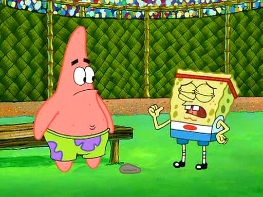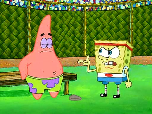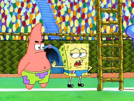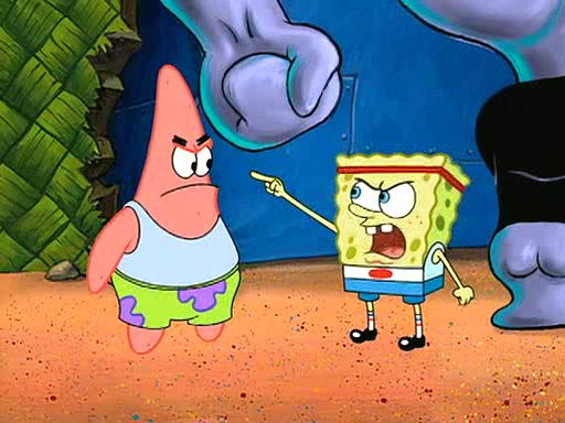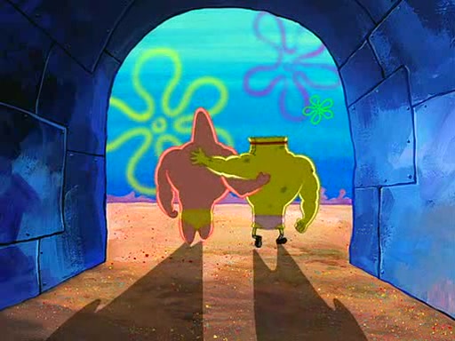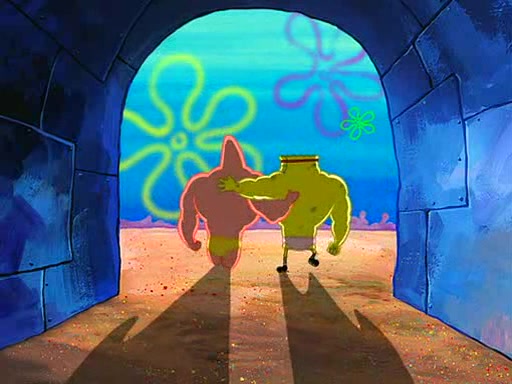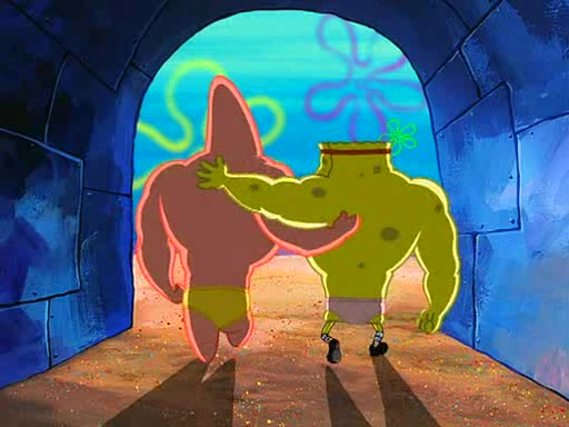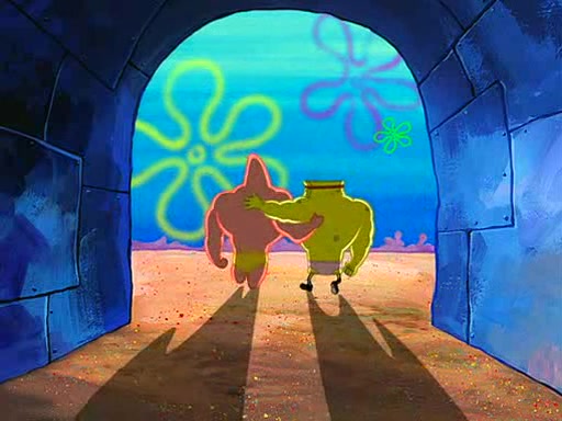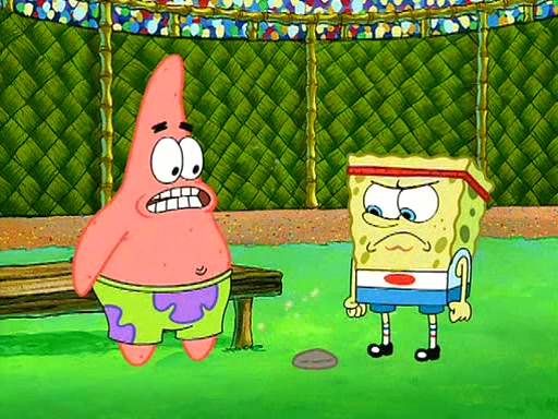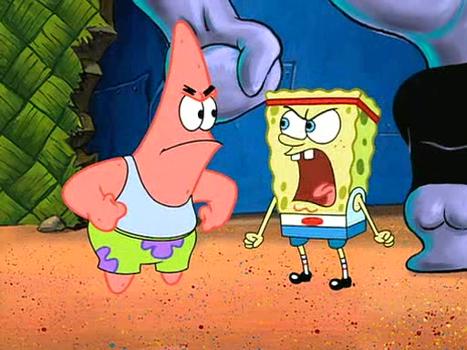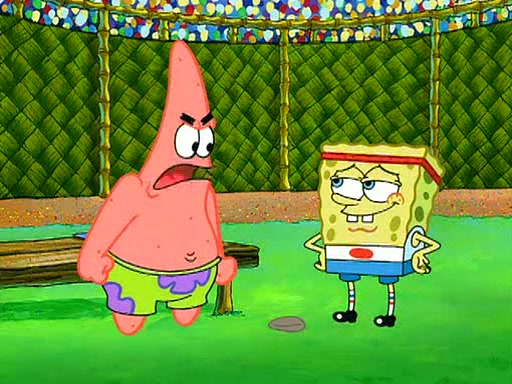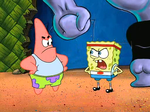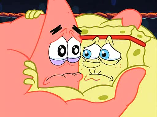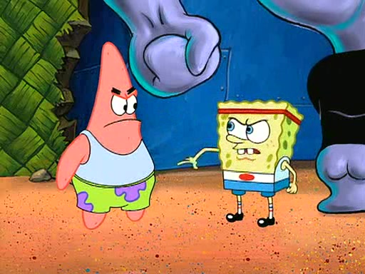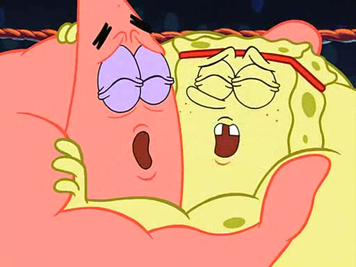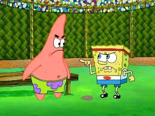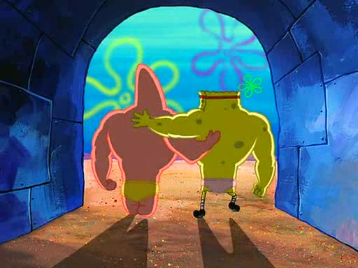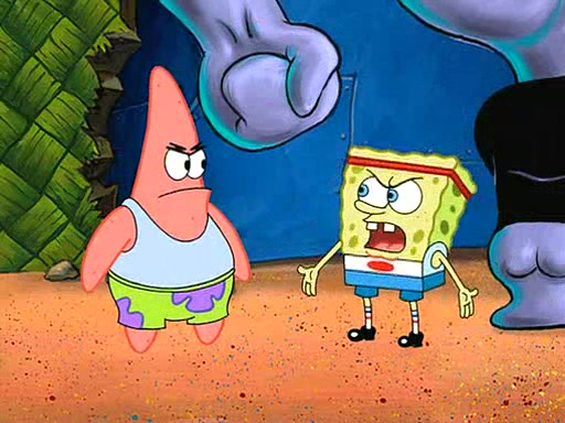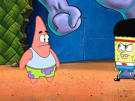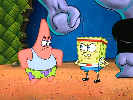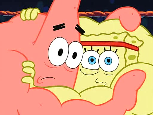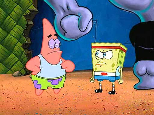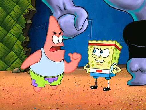 Patrick decides to throw away his ambition to fight for the Chum Bucket by saying, "Forget the Chum Bucket. This is personal." He takes off SpongeBob's shoe and then he licks his foot which cause SpongeBob to scream out in disgust. In retaliation for this, SpongeBob erases the "Pat" in "Patrick" on Patrick's nametag. Patrick responds by yelling, "My name's not Riiiiiiiiiiiiick!" Towards the end of the fight they get into a grapple stating how much they hate each other. Suddenly their pants rip revealing underwear similar to each other's skin color. Both of them cry, "You do care!" Afterwards they vow to never fight each other again and leave the stadium. Mr. Krabs and Plankton demand that they "Get back here and kill each other!" Patrick says, "You're my best friend ever SpongeBob." SpongeBob responds by saying,"You too, Patrick." As the episode ends with the two walking down the road into the sunset, Patrick says "You know these were white when I bought them," referring to his underwear.