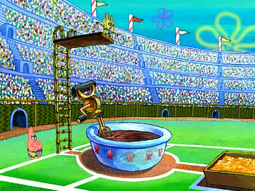 The competitions include fast food-related versions of actual Olympic sports, such as the "Deep Fry Pole Vault" (Pole-vaulting over a deep-fryer) and the "Chocolate High-Dive" (Diving from a springboard to a vat of chocolate, making the diver look like ice cream), among others.