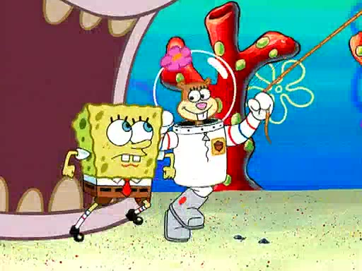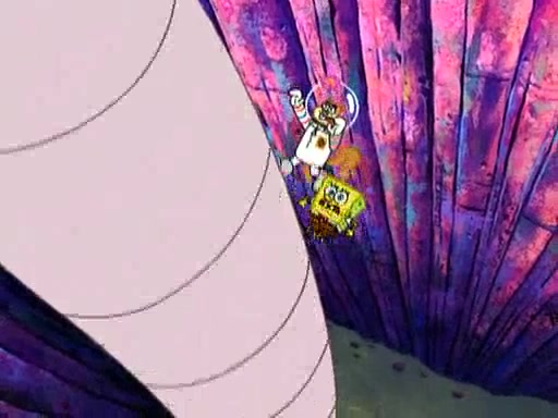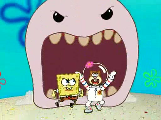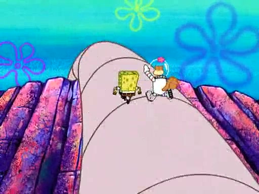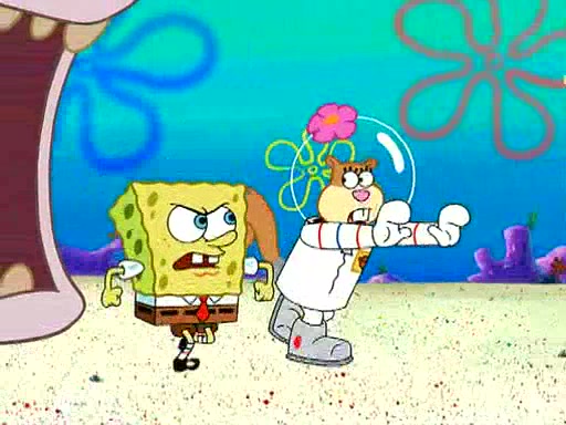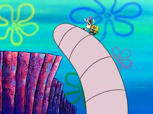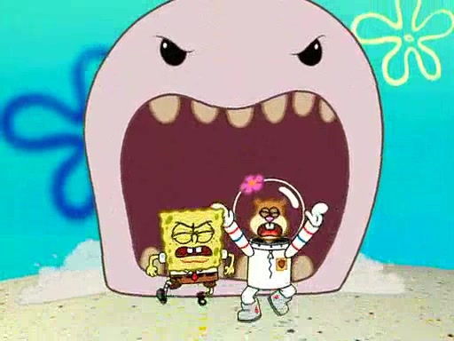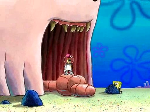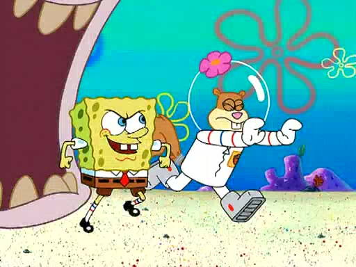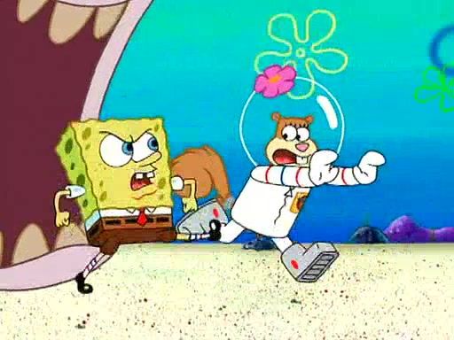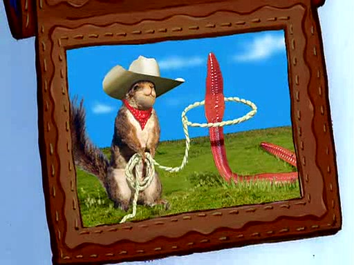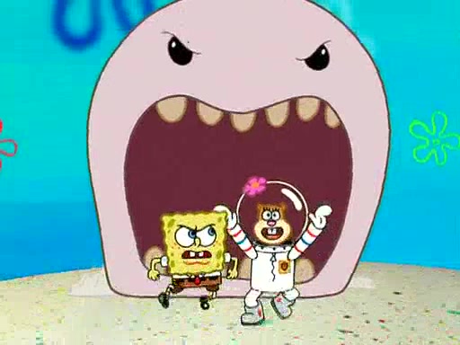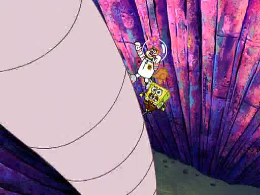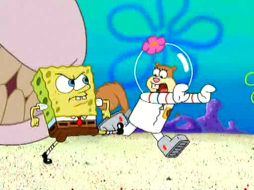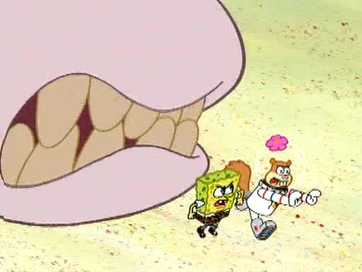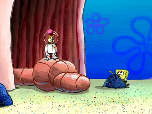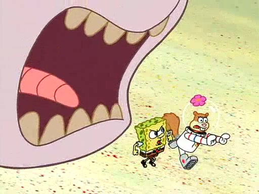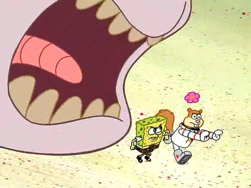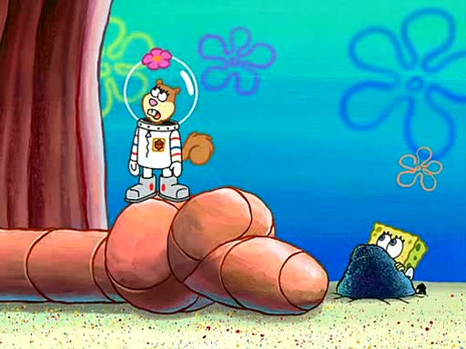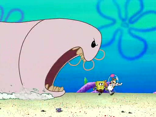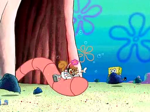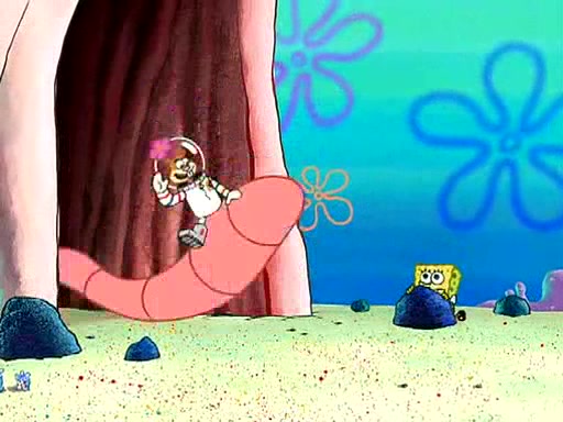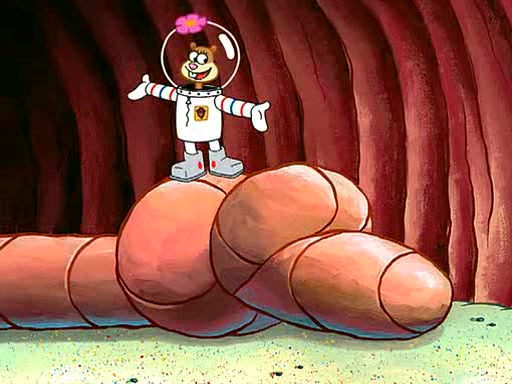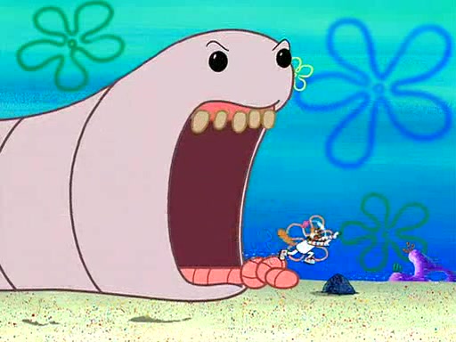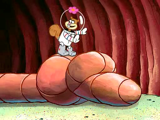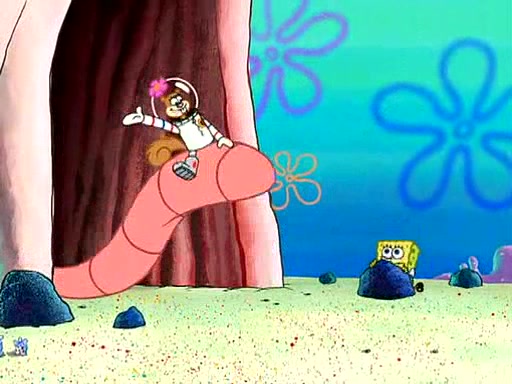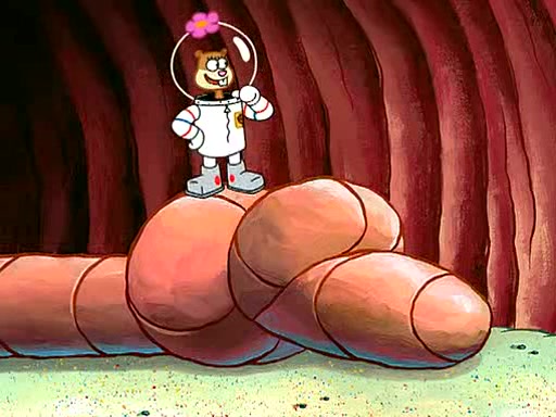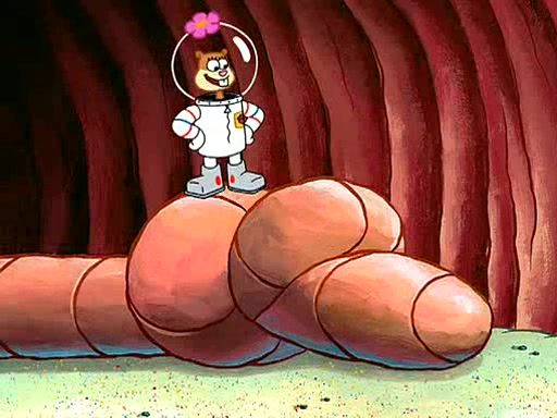 Patrick soon suggests moving the town to another location. But all the people disagree with this and Mr. Krabs suggests that there has to be someone tough enough who can take on the worm. An old man with a hook scrapes the window and looks like he's just the man to fight it, but is revealed to be a weak man who actually needed to go to the restroom. Sandy decides to fight the monster, as revenge for stealing her tail. SpongeBob tries to persuade her not to go near it, but she keeps on going at his every attempt because she says that she is strong. SpongeBob starts crying and tells her that he doesn't want her to be killed, but Sandy doesn't give in. So she continues walking along with SpongeBob trying to get her to turn back, until they reach a cave that Sandy identifies as the worm's lair. She goes inside the cave, while SpongeBob hides behind a small rock, panicking, and Sandy keeps on coming out, telling SpongeBob good news that she's winning. He keeps trying to tell her something but she doesn't give him enough time and goes back in. When she comes out on the "worm," she states that she won and she even reclaimed her tail. However, SpongeBob reveals that she didn't defeat the worm, but she defeated its tongue, and the entire cave is the worm. Upon realizing this, Sandy begins calm then screams "RUN FOR YOUR LIFE!!!!!" as the worm begins chasing them. SpongeBob and Sandy run, and during their attempt to escape, SpongeBob reveals that he was right and Sandy was never strong enough for the worm, and she admits it after SpongeBob persuades her to say it. Suddenly, they escape the worm by using a paper clip and a piece of string which SpongeBob said was Sandy's tail earlier in the episode, and uses it this time to grapple onto a tree, and Sandy says, "We should be nice and safe up here" while they balance on the worm's back, but then the worm falls off a cliff. SpongeBob and Sandy scream and make it off the worm's tail to the land and think they have saved the town, and head off to tell everyone.