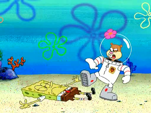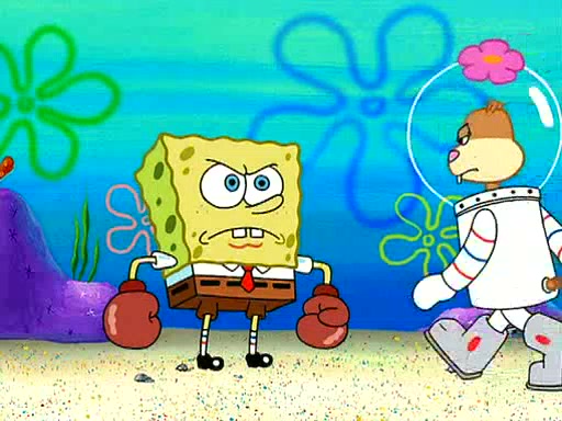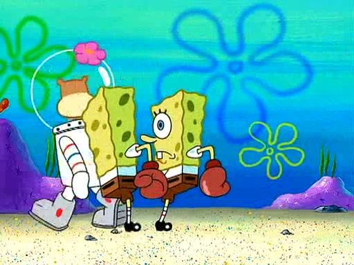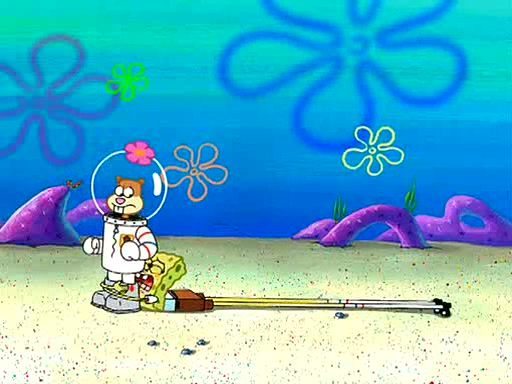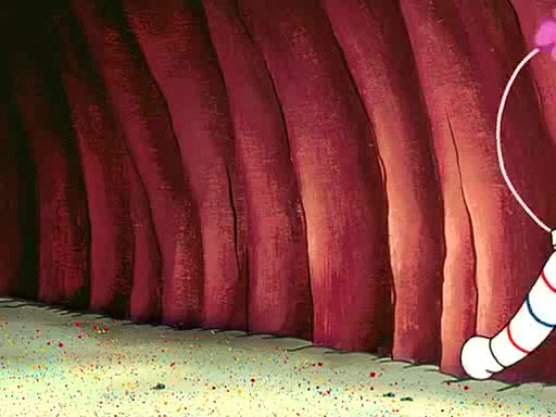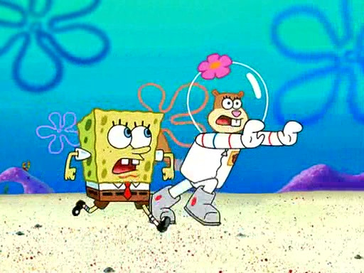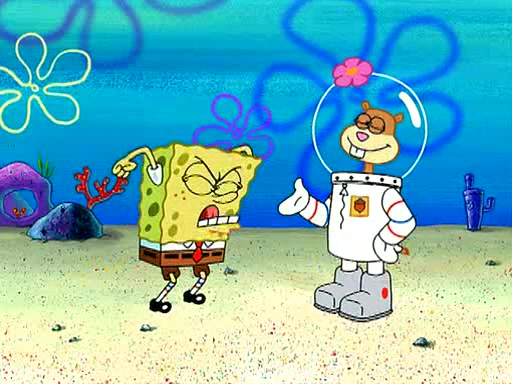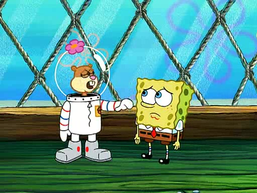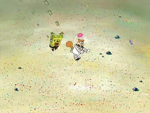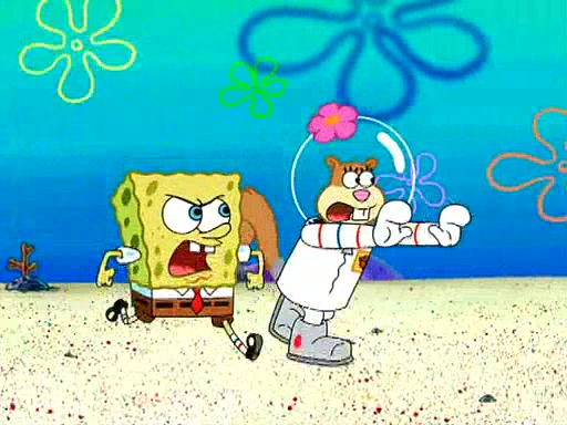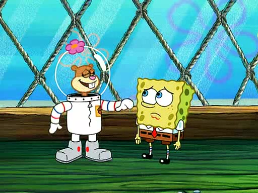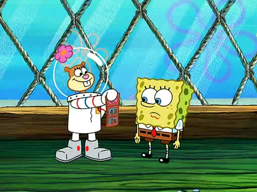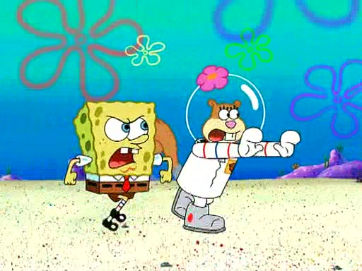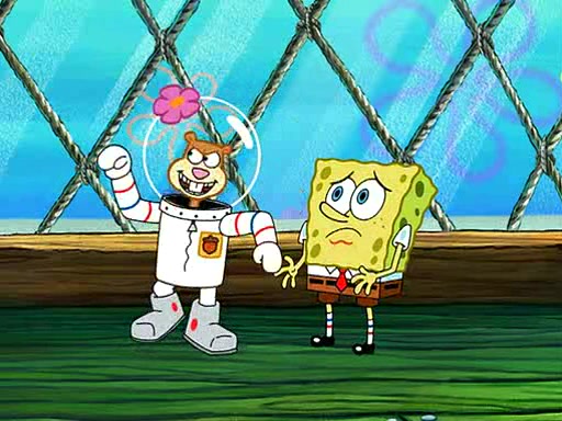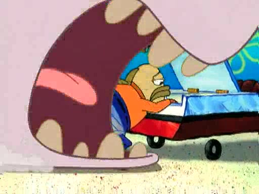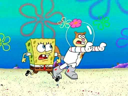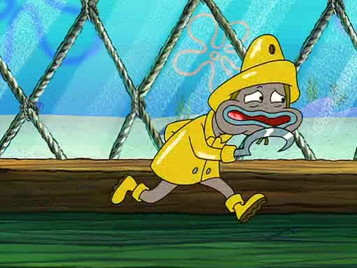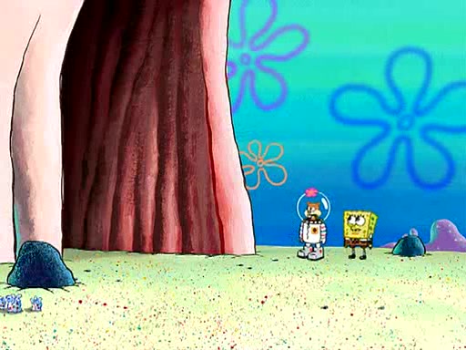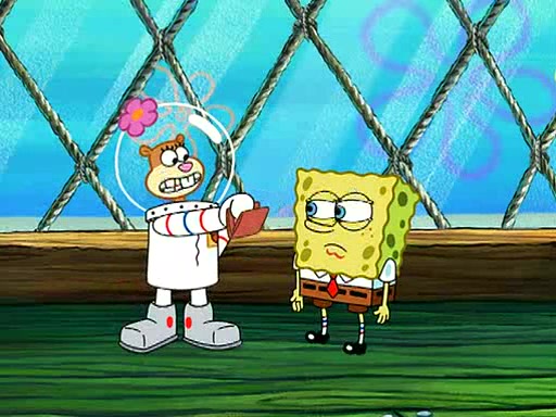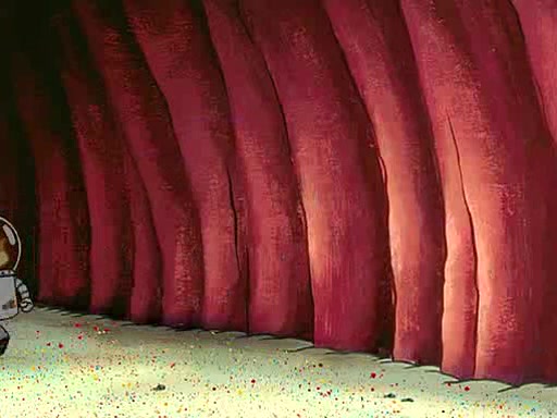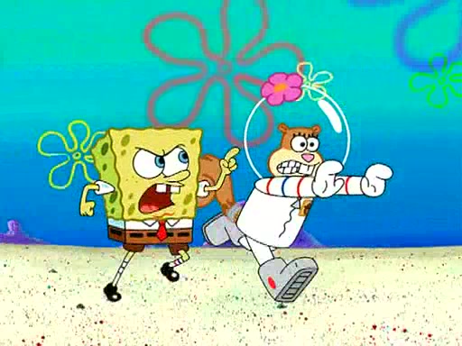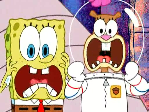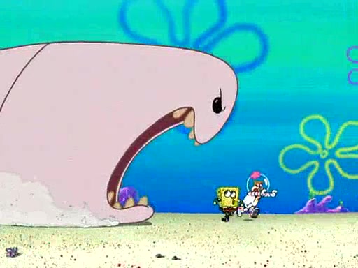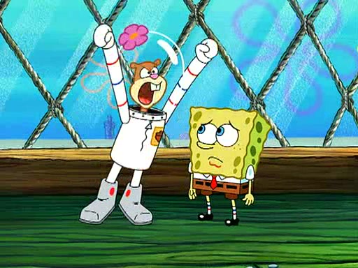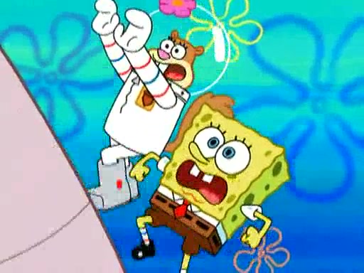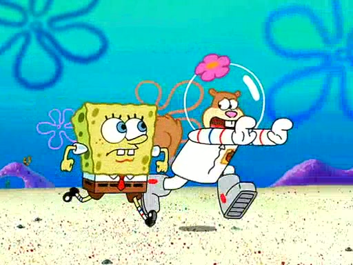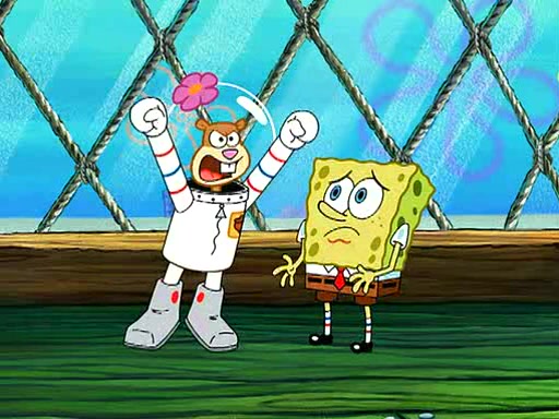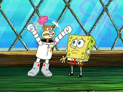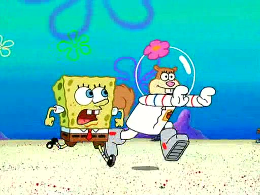 Patrick soon suggests moving the town to another location. But all the people disagree with this and Mr. Krabs suggests that there has to be someone tough enough who can take on the worm. An old man with a hook scrapes the window and looks like he's just the man to fight it, but is revealed to be a weak man who actually needed to go to the restroom. Sandy decides to fight the monster, as revenge for stealing her tail. SpongeBob tries to persuade her not to go near it, but she keeps on going at his every attempt because she says that she is strong. SpongeBob starts crying and tells her that he doesn't want her to be killed, but Sandy doesn't give in. So she continues walking along with SpongeBob trying to get her to turn back, until they reach a cave that Sandy identifies as the worm's lair. She goes inside the cave, while SpongeBob hides behind a small rock, panicking, and Sandy keeps on coming out, telling SpongeBob good news that she's winning. He keeps trying to tell her something but she doesn't give him enough time and goes back in. When she comes out on the "worm," she states that she won and she even reclaimed her tail. However, SpongeBob reveals that she didn't defeat the worm, but she defeated its tongue, and the entire cave is the worm. Upon realizing this, Sandy begins calm then screams "RUN FOR YOUR LIFE!!!!!" as the worm begins chasing them. SpongeBob and Sandy run, and during their attempt to escape, SpongeBob reveals that he was right and Sandy was never strong enough for the worm, and she admits it after SpongeBob persuades her to say it. Suddenly, they escape the worm by using a paper clip and a piece of string which SpongeBob said was Sandy's tail earlier in the episode, and uses it this time to grapple onto a tree, and Sandy says, "We should be nice and safe up here" while they balance on the worm's back, but then the worm falls off a cliff. SpongeBob and Sandy scream and make it off the worm's tail to the land and think they have saved the town, and head off to tell everyone.