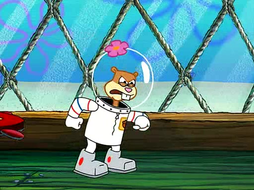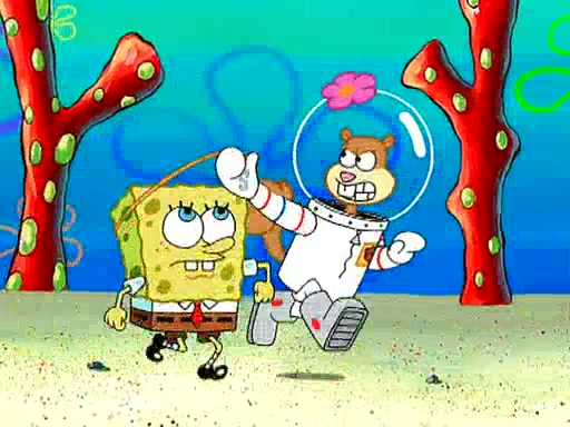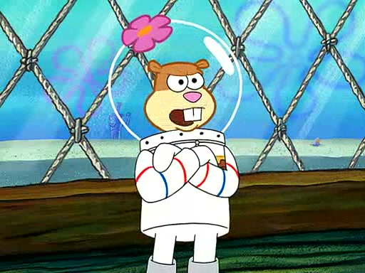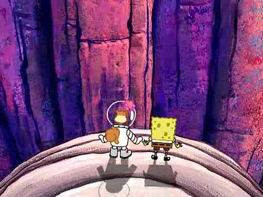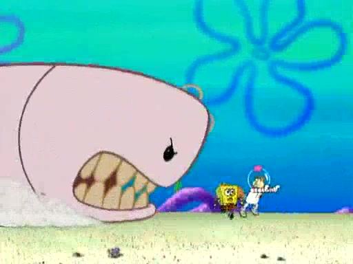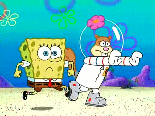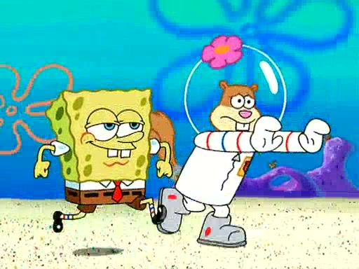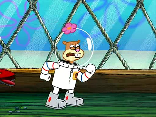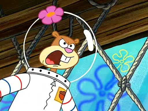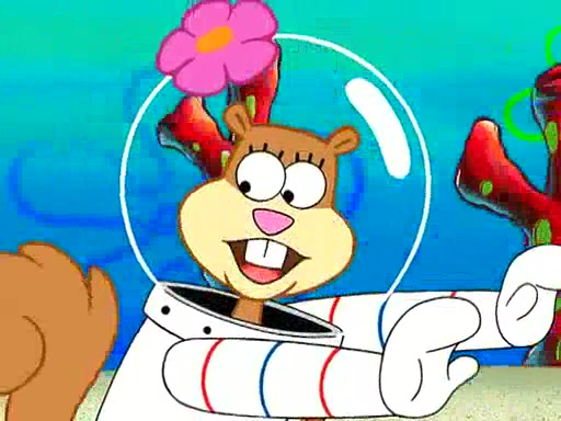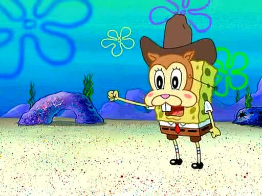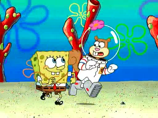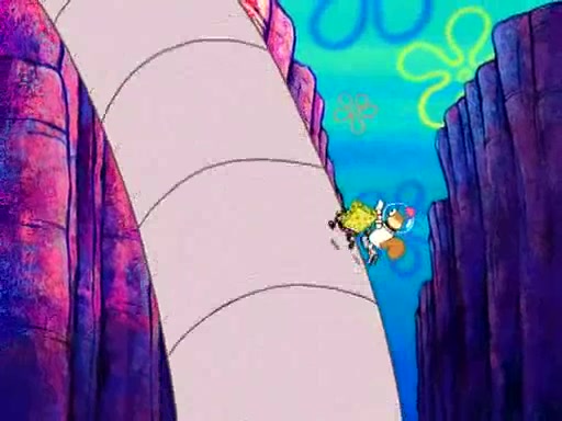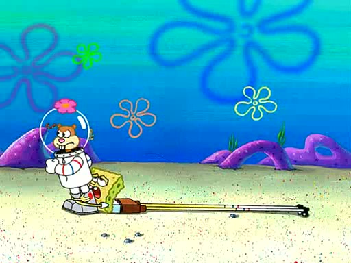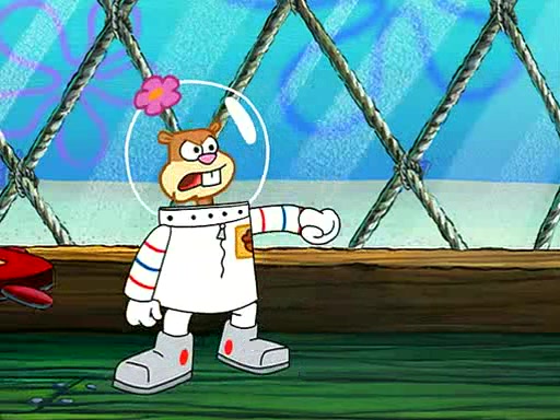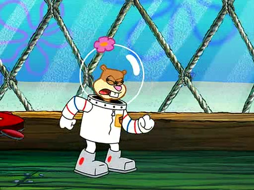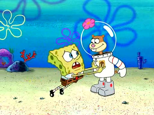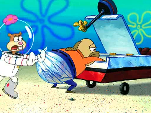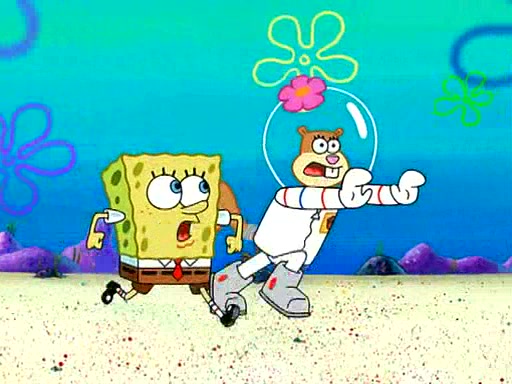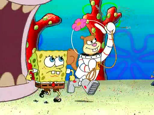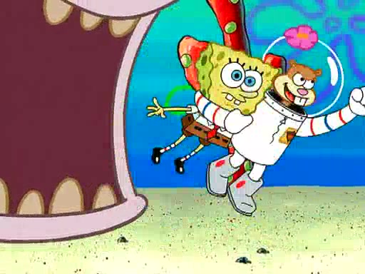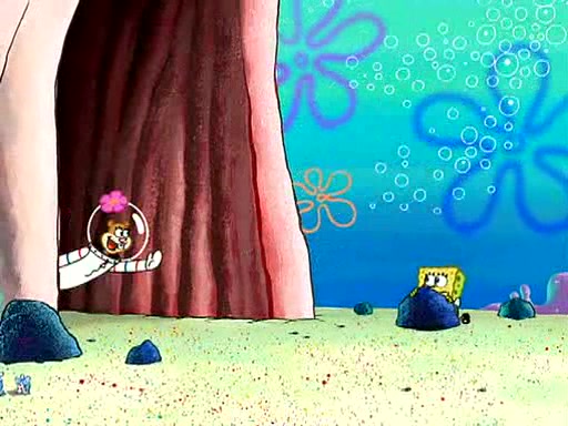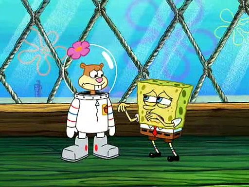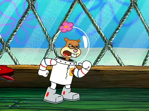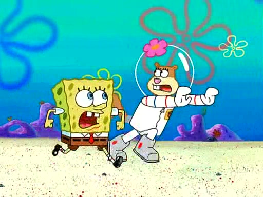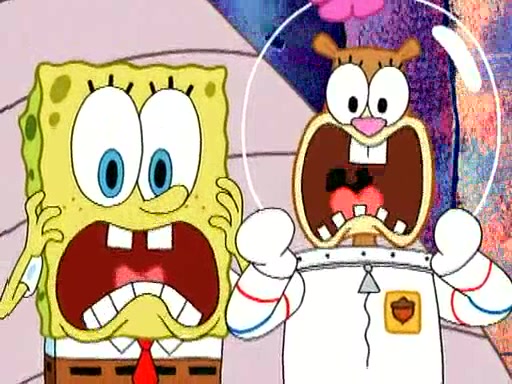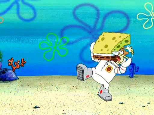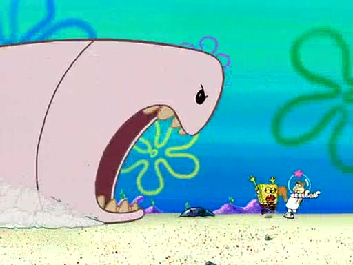 Patrick soon suggests moving the town to another location. But all the people disagree with this and Mr. Krabs suggests that there has to be someone tough enough who can take on the worm. An old man with a hook scrapes the window and looks like he's just the man to fight it, but is revealed to be a weak man who actually needed to go to the restroom. Sandy decides to fight the monster, as revenge for stealing her tail. SpongeBob tries to persuade her not to go near it, but she keeps on going at his every attempt because she says that she is strong. SpongeBob starts crying and tells her that he doesn't want her to be killed, but Sandy doesn't give in. So she continues walking along with SpongeBob trying to get her to turn back, until they reach a cave that Sandy identifies as the worm's lair. She goes inside the cave, while SpongeBob hides behind a small rock, panicking, and Sandy keeps on coming out, telling SpongeBob good news that she's winning. He keeps trying to tell her something but she doesn't give him enough time and goes back in. When she comes out on the "worm," she states that she won and she even reclaimed her tail. However, SpongeBob reveals that she didn't defeat the worm, but she defeated its tongue, and the entire cave is the worm. Upon realizing this, Sandy begins calm then screams "RUN FOR YOUR LIFE!!!!!" as the worm begins chasing them. SpongeBob and Sandy run, and during their attempt to escape, SpongeBob reveals that he was right and Sandy was never strong enough for the worm, and she admits it after SpongeBob persuades her to say it. Suddenly, they escape the worm by using a paper clip and a piece of string which SpongeBob said was Sandy's tail earlier in the episode, and uses it this time to grapple onto a tree, and Sandy says, "We should be nice and safe up here" while they balance on the worm's back, but then the worm falls off a cliff. SpongeBob and Sandy scream and make it off the worm's tail to the land and think they have saved the town, and head off to tell everyone.