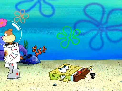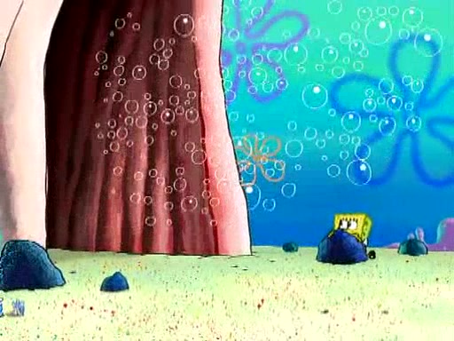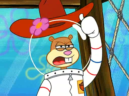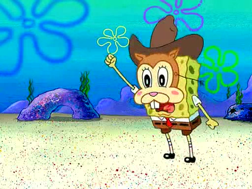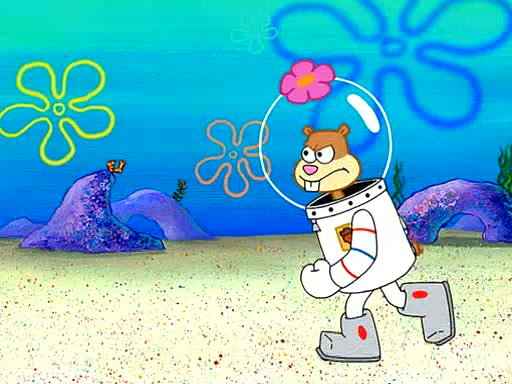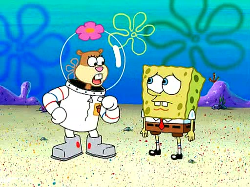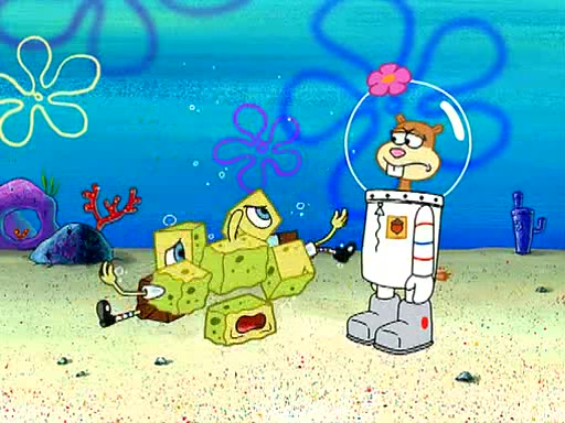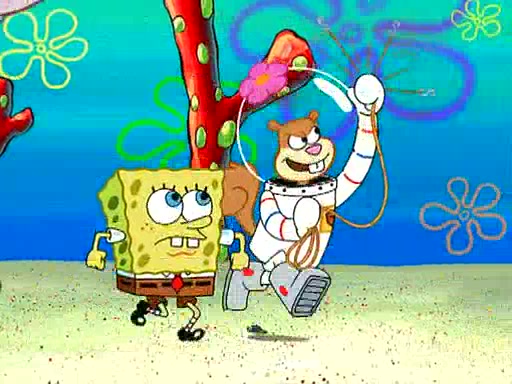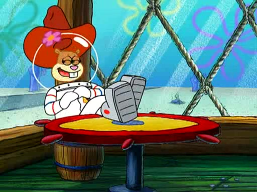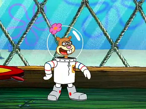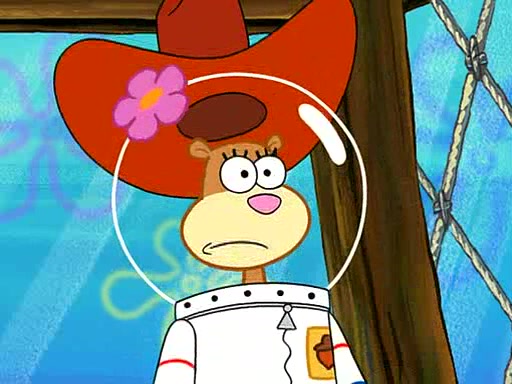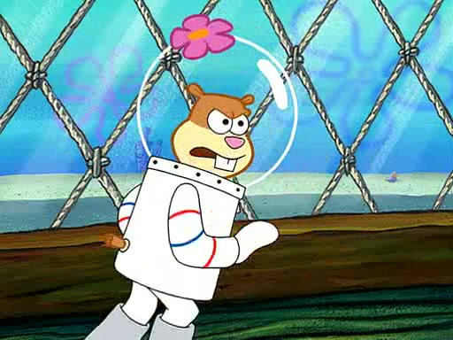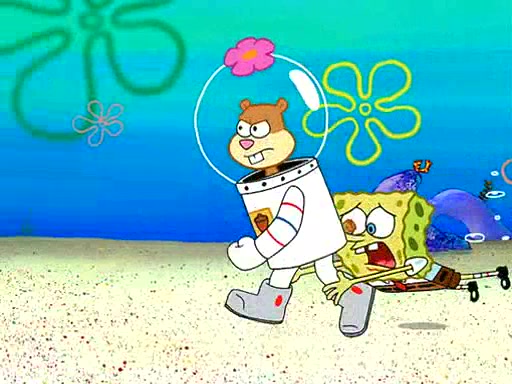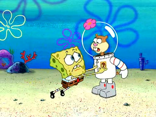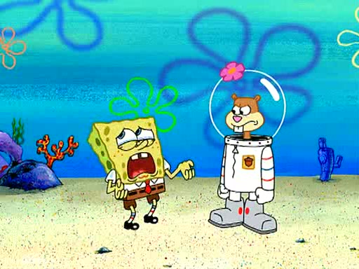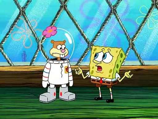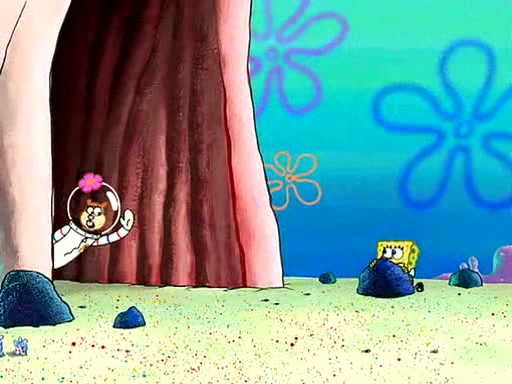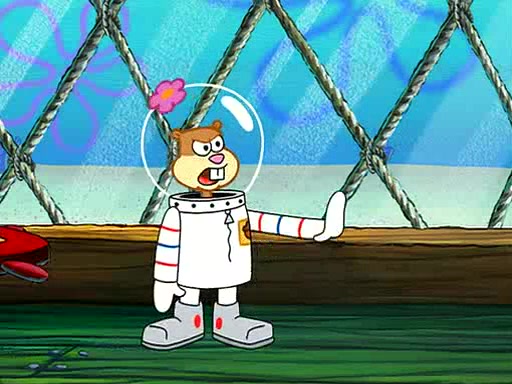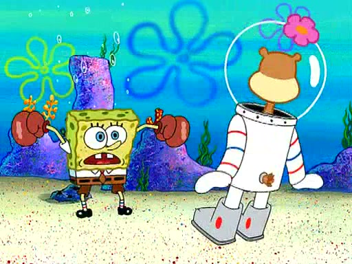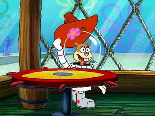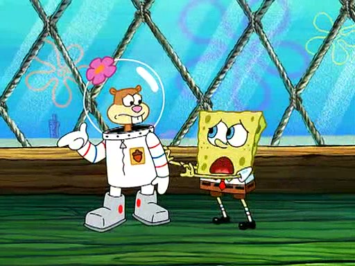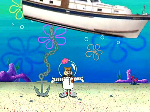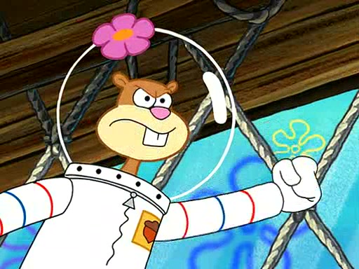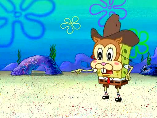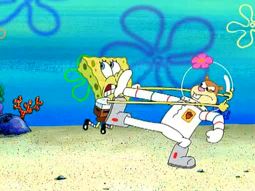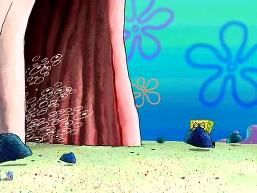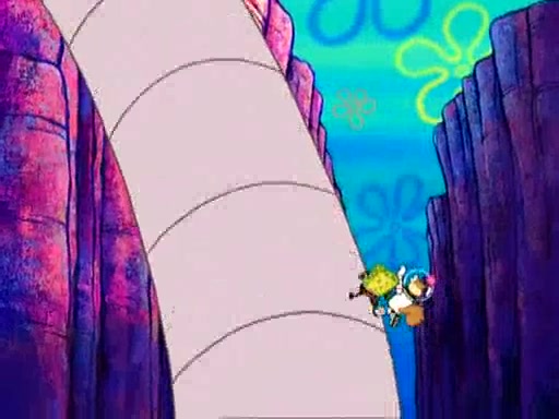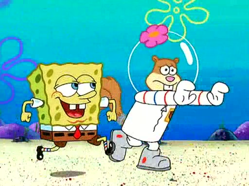 Patrick soon suggests moving the town to another location. But all the people disagree with this and Mr. Krabs suggests that there has to be someone tough enough who can take on the worm. An old man with a hook scrapes the window and looks like he's just the man to fight it, but is revealed to be a weak man who actually needed to go to the restroom. Sandy decides to fight the monster, as revenge for stealing her tail. SpongeBob tries to persuade her not to go near it, but she keeps on going at his every attempt because she says that she is strong. SpongeBob starts crying and tells her that he doesn't want her to be killed, but Sandy doesn't give in. So she continues walking along with SpongeBob trying to get her to turn back, until they reach a cave that Sandy identifies as the worm's lair. She goes inside the cave, while SpongeBob hides behind a small rock, panicking, and Sandy keeps on coming out, telling SpongeBob good news that she's winning. He keeps trying to tell her something but she doesn't give him enough time and goes back in. When she comes out on the "worm," she states that she won and she even reclaimed her tail. However, SpongeBob reveals that she didn't defeat the worm, but she defeated its tongue, and the entire cave is the worm. Upon realizing this, Sandy begins calm then screams "RUN FOR YOUR LIFE!!!!!" as the worm begins chasing them. SpongeBob and Sandy run, and during their attempt to escape, SpongeBob reveals that he was right and Sandy was never strong enough for the worm, and she admits it after SpongeBob persuades her to say it. Suddenly, they escape the worm by using a paper clip and a piece of string which SpongeBob said was Sandy's tail earlier in the episode, and uses it this time to grapple onto a tree, and Sandy says, "We should be nice and safe up here" while they balance on the worm's back, but then the worm falls off a cliff. SpongeBob and Sandy scream and make it off the worm's tail to the land and think they have saved the town, and head off to tell everyone.