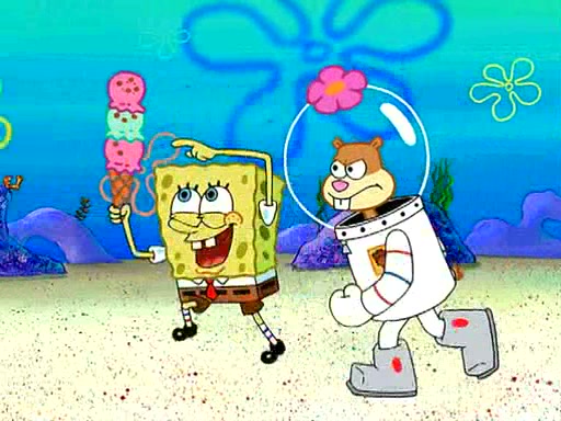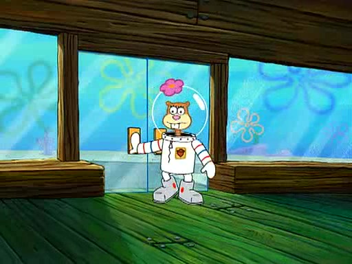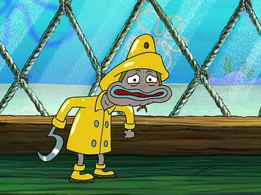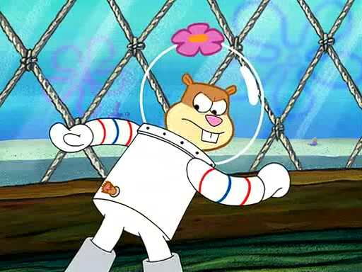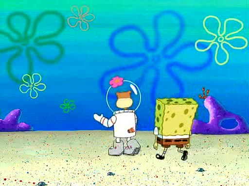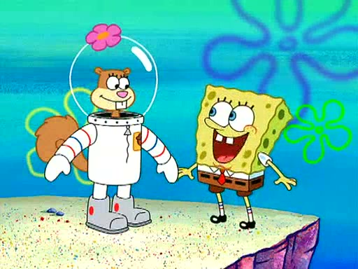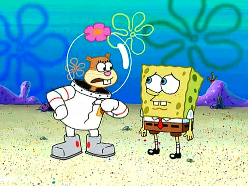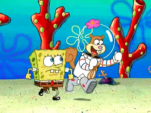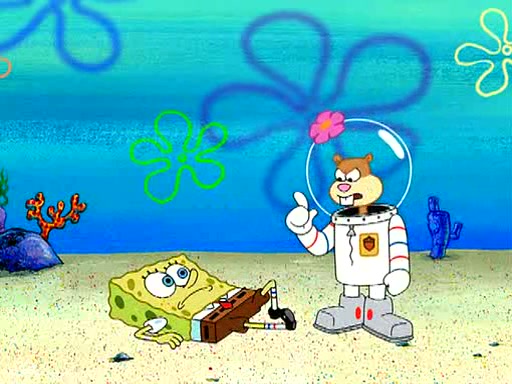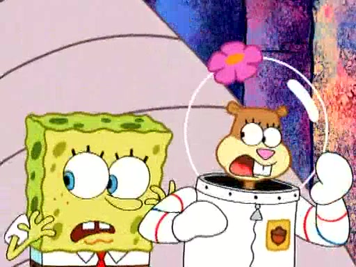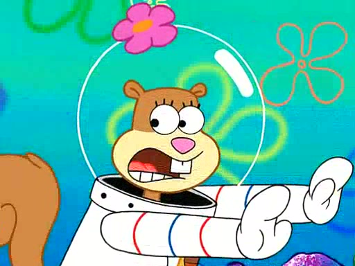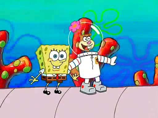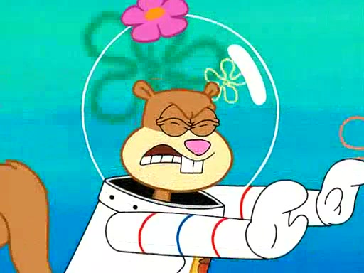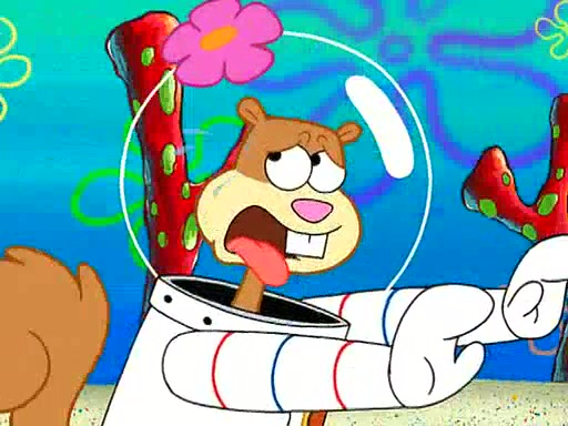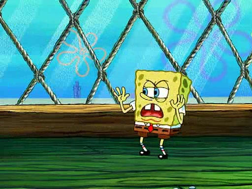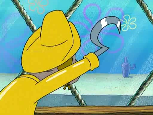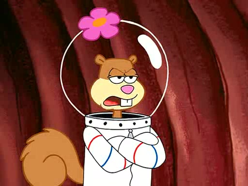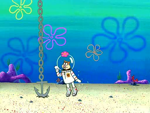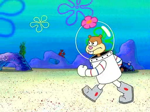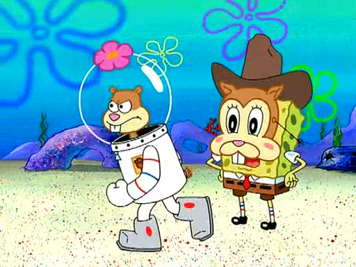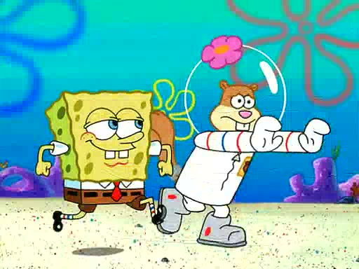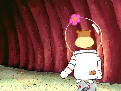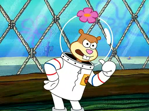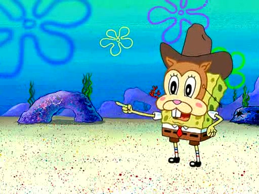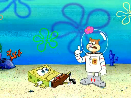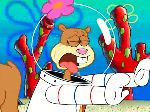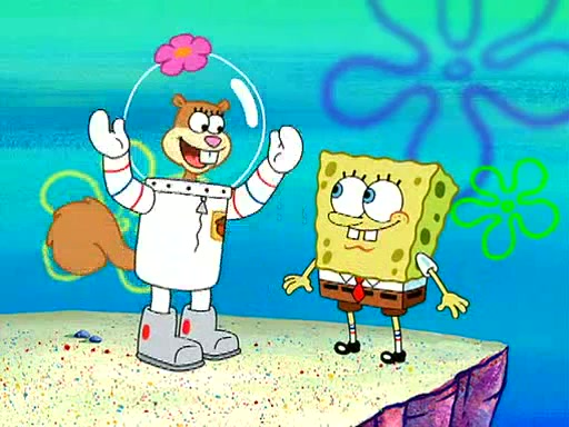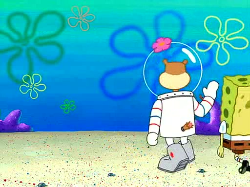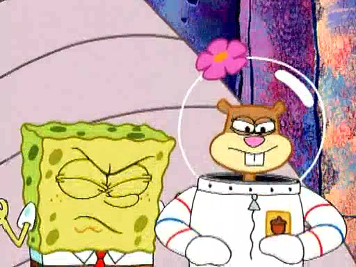 Patrick soon suggests moving the town to another location. But all the people disagree with this and Mr. Krabs suggests that there has to be someone tough enough who can take on the worm. An old man with a hook scrapes the window and looks like he's just the man to fight it, but is revealed to be a weak man who actually needed to go to the restroom. Sandy decides to fight the monster, as revenge for stealing her tail. SpongeBob tries to persuade her not to go near it, but she keeps on going at his every attempt because she says that she is strong. SpongeBob starts crying and tells her that he doesn't want her to be killed, but Sandy doesn't give in. So she continues walking along with SpongeBob trying to get her to turn back, until they reach a cave that Sandy identifies as the worm's lair. She goes inside the cave, while SpongeBob hides behind a small rock, panicking, and Sandy keeps on coming out, telling SpongeBob good news that she's winning. He keeps trying to tell her something but she doesn't give him enough time and goes back in. When she comes out on the "worm," she states that she won and she even reclaimed her tail. However, SpongeBob reveals that she didn't defeat the worm, but she defeated its tongue, and the entire cave is the worm. Upon realizing this, Sandy begins calm then screams "RUN FOR YOUR LIFE!!!!!" as the worm begins chasing them. SpongeBob and Sandy run, and during their attempt to escape, SpongeBob reveals that he was right and Sandy was never strong enough for the worm, and she admits it after SpongeBob persuades her to say it. Suddenly, they escape the worm by using a paper clip and a piece of string which SpongeBob said was Sandy's tail earlier in the episode, and uses it this time to grapple onto a tree, and Sandy says, "We should be nice and safe up here" while they balance on the worm's back, but then the worm falls off a cliff. SpongeBob and Sandy scream and make it off the worm's tail to the land and think they have saved the town, and head off to tell everyone.