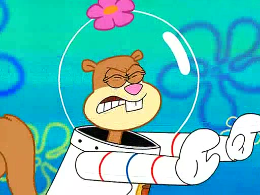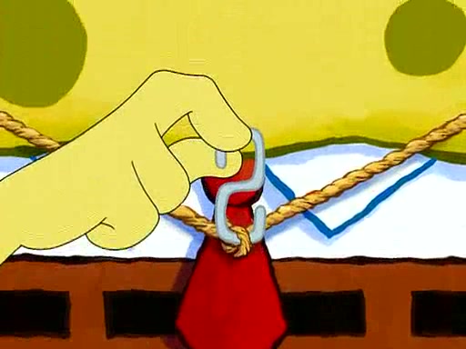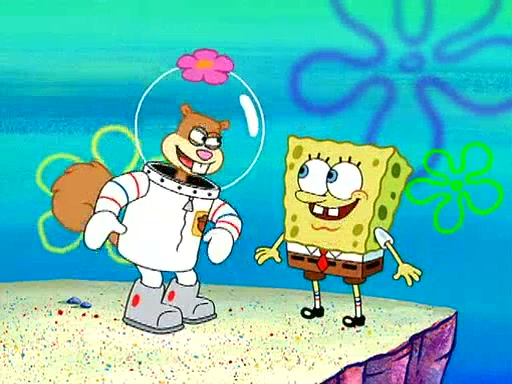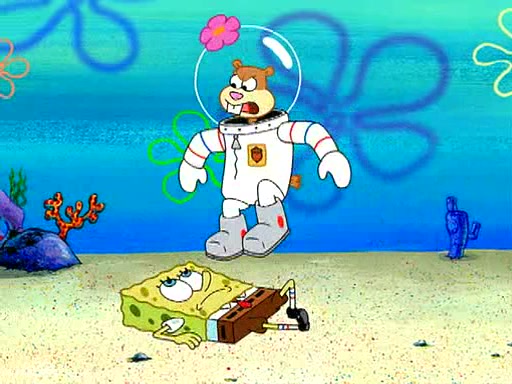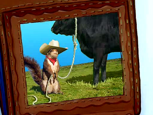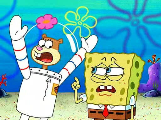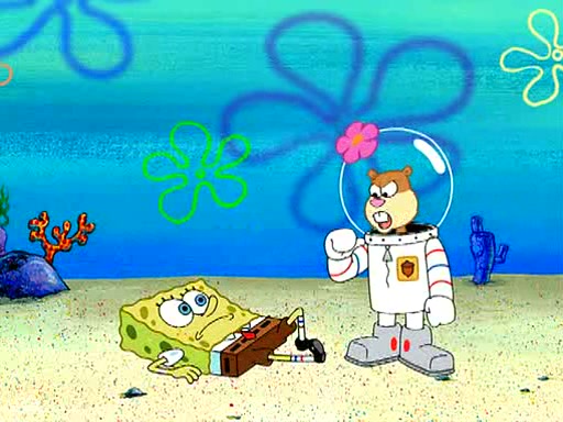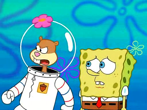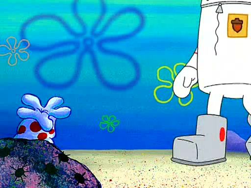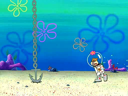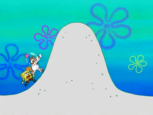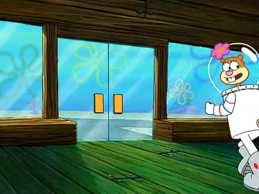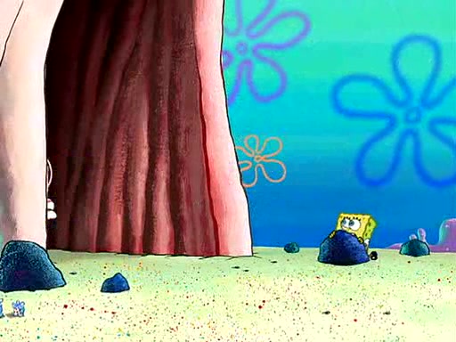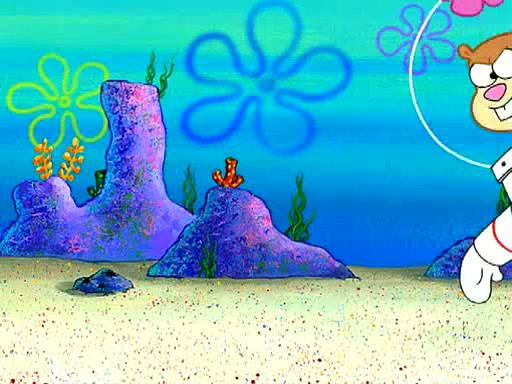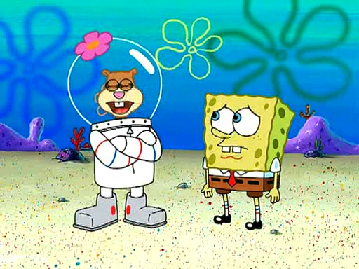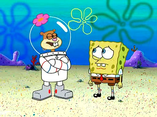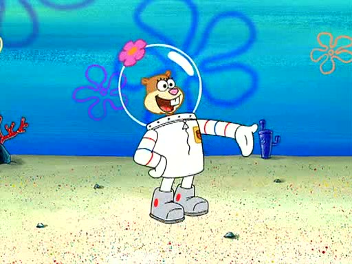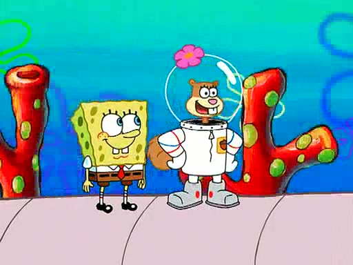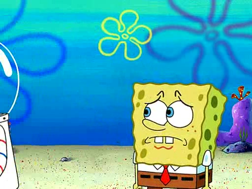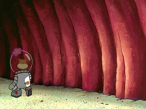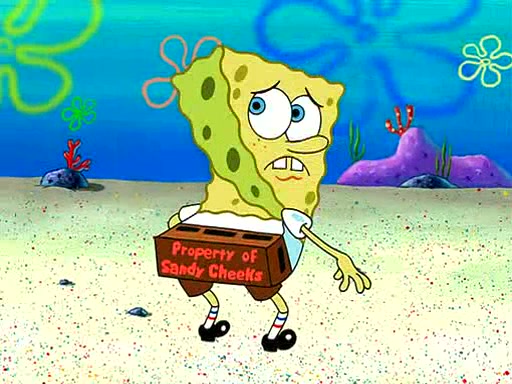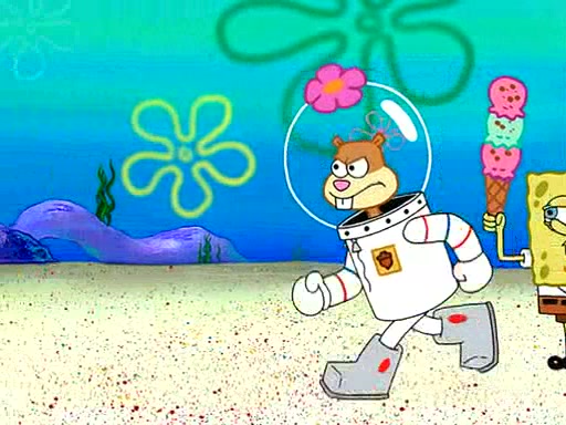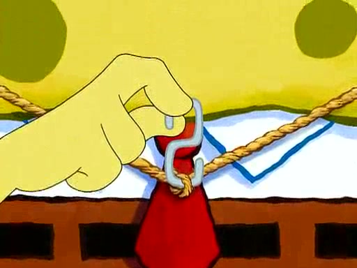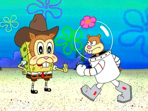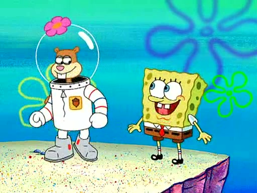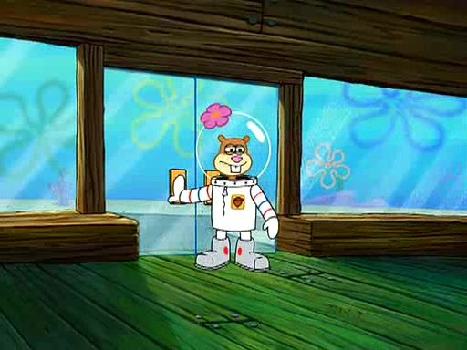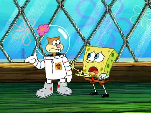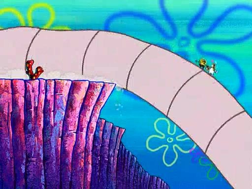 Patrick soon suggests moving the town to another location. But all the people disagree with this and Mr. Krabs suggests that there has to be someone tough enough who can take on the worm. An old man with a hook scrapes the window and looks like he's just the man to fight it, but is revealed to be a weak man who actually needed to go to the restroom. Sandy decides to fight the monster, as revenge for stealing her tail. SpongeBob tries to persuade her not to go near it, but she keeps on going at his every attempt because she says that she is strong. SpongeBob starts crying and tells her that he doesn't want her to be killed, but Sandy doesn't give in. So she continues walking along with SpongeBob trying to get her to turn back, until they reach a cave that Sandy identifies as the worm's lair. She goes inside the cave, while SpongeBob hides behind a small rock, panicking, and Sandy keeps on coming out, telling SpongeBob good news that she's winning. He keeps trying to tell her something but she doesn't give him enough time and goes back in. When she comes out on the "worm," she states that she won and she even reclaimed her tail. However, SpongeBob reveals that she didn't defeat the worm, but she defeated its tongue, and the entire cave is the worm. Upon realizing this, Sandy begins calm then screams "RUN FOR YOUR LIFE!!!!!" as the worm begins chasing them. SpongeBob and Sandy run, and during their attempt to escape, SpongeBob reveals that he was right and Sandy was never strong enough for the worm, and she admits it after SpongeBob persuades her to say it. Suddenly, they escape the worm by using a paper clip and a piece of string which SpongeBob said was Sandy's tail earlier in the episode, and uses it this time to grapple onto a tree, and Sandy says, "We should be nice and safe up here" while they balance on the worm's back, but then the worm falls off a cliff. SpongeBob and Sandy scream and make it off the worm's tail to the land and think they have saved the town, and head off to tell everyone.
