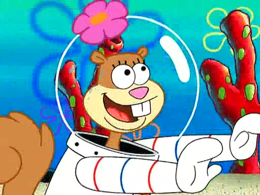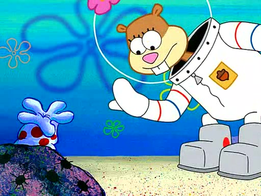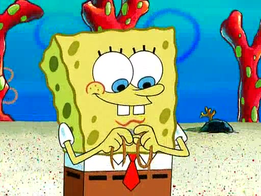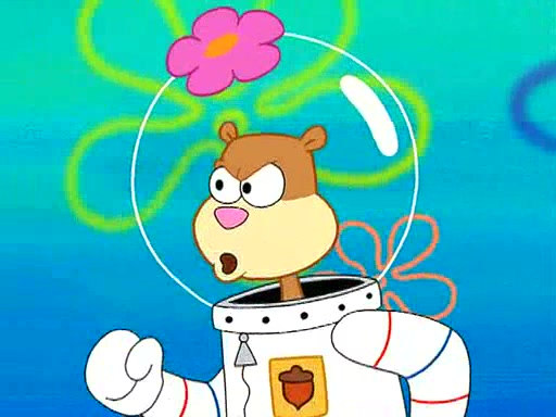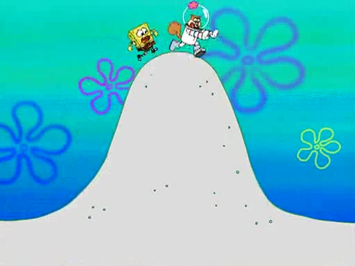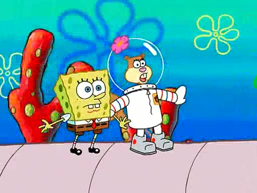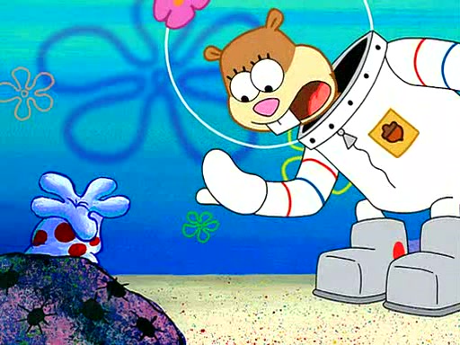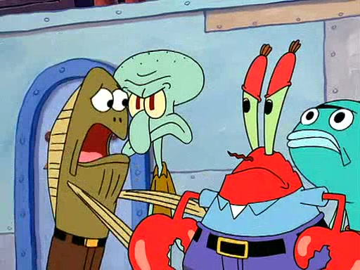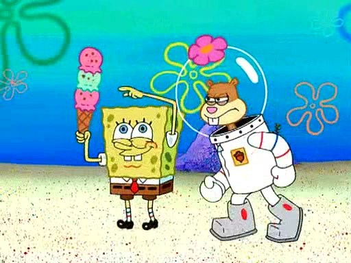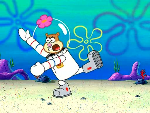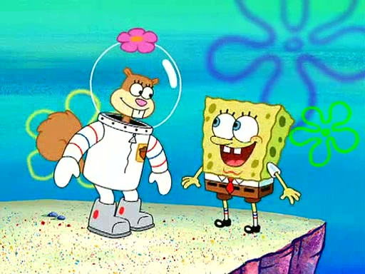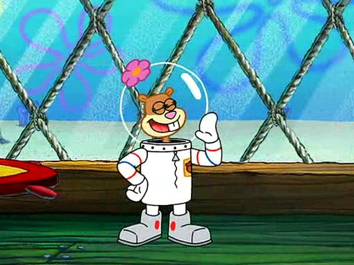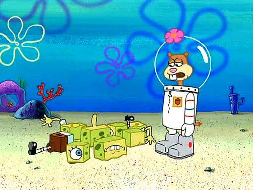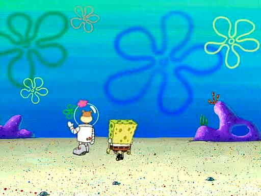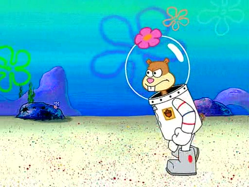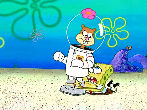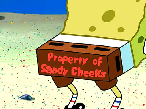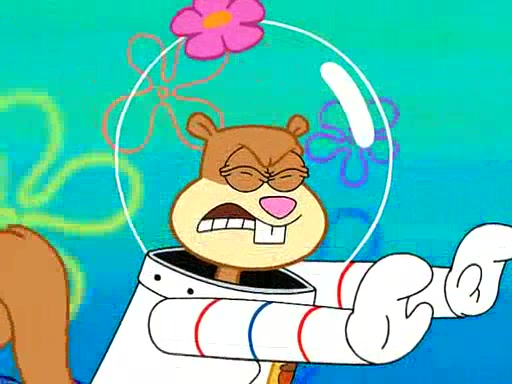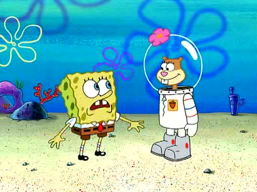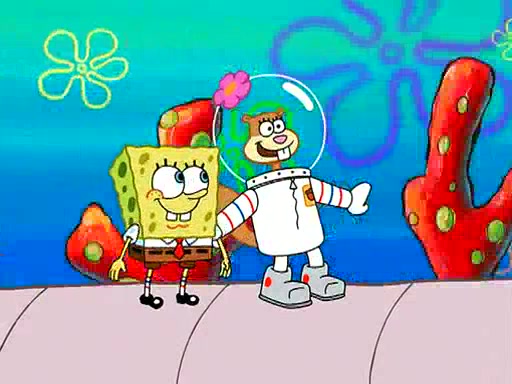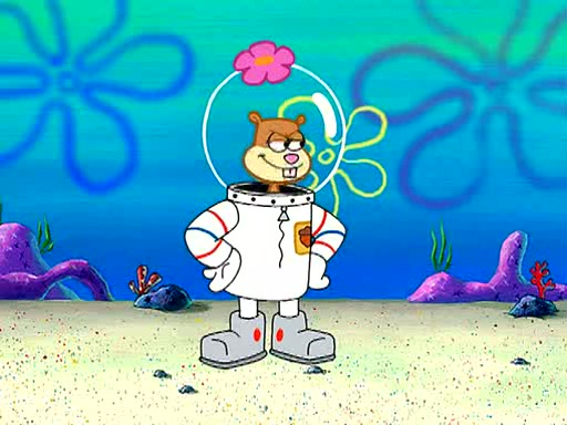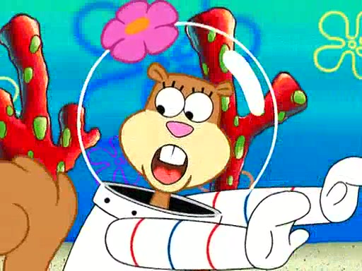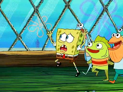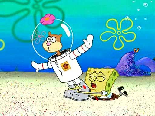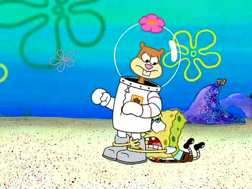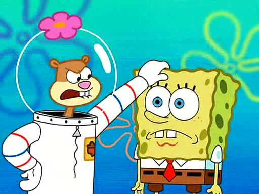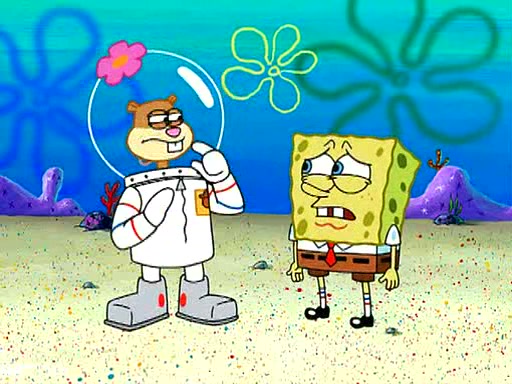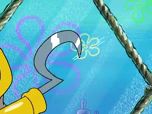 Patrick soon suggests moving the town to another location. But all the people disagree with this and Mr. Krabs suggests that there has to be someone tough enough who can take on the worm. An old man with a hook scrapes the window and looks like he's just the man to fight it, but is revealed to be a weak man who actually needed to go to the restroom. Sandy decides to fight the monster, as revenge for stealing her tail. SpongeBob tries to persuade her not to go near it, but she keeps on going at his every attempt because she says that she is strong. SpongeBob starts crying and tells her that he doesn't want her to be killed, but Sandy doesn't give in. So she continues walking along with SpongeBob trying to get her to turn back, until they reach a cave that Sandy identifies as the worm's lair. She goes inside the cave, while SpongeBob hides behind a small rock, panicking, and Sandy keeps on coming out, telling SpongeBob good news that she's winning. He keeps trying to tell her something but she doesn't give him enough time and goes back in. When she comes out on the "worm," she states that she won and she even reclaimed her tail. However, SpongeBob reveals that she didn't defeat the worm, but she defeated its tongue, and the entire cave is the worm. Upon realizing this, Sandy begins calm then screams "RUN FOR YOUR LIFE!!!!!" as the worm begins chasing them. SpongeBob and Sandy run, and during their attempt to escape, SpongeBob reveals that he was right and Sandy was never strong enough for the worm, and she admits it after SpongeBob persuades her to say it. Suddenly, they escape the worm by using a paper clip and a piece of string which SpongeBob said was Sandy's tail earlier in the episode, and uses it this time to grapple onto a tree, and Sandy says, "We should be nice and safe up here" while they balance on the worm's back, but then the worm falls off a cliff. SpongeBob and Sandy scream and make it off the worm's tail to the land and think they have saved the town, and head off to tell everyone.