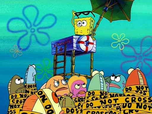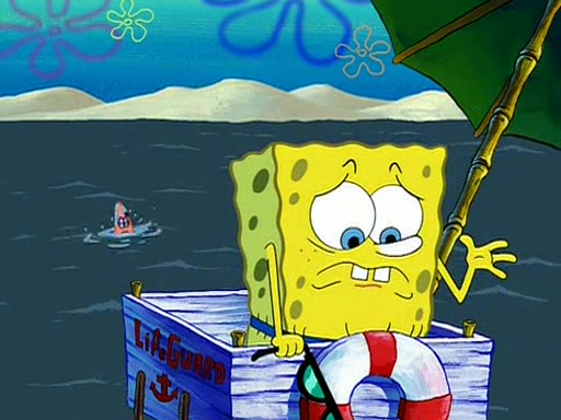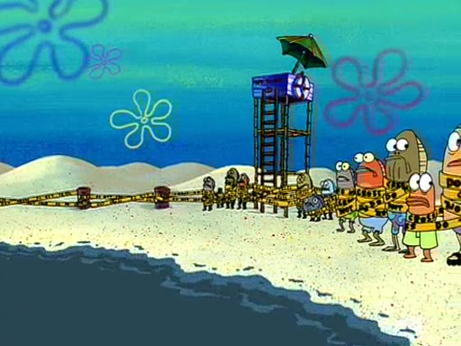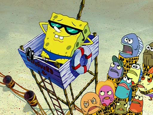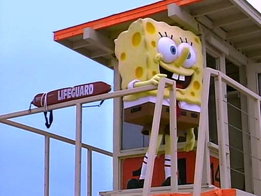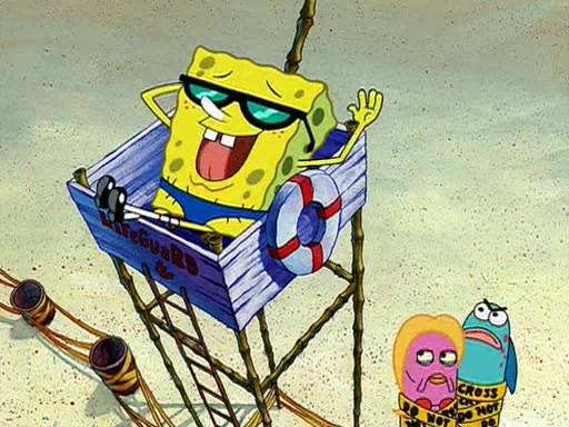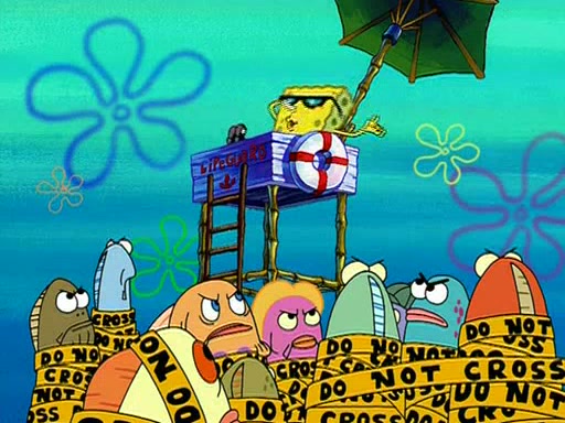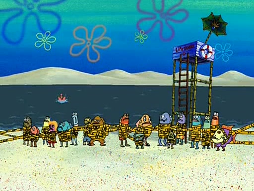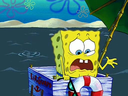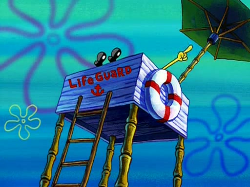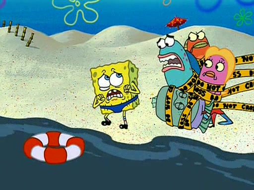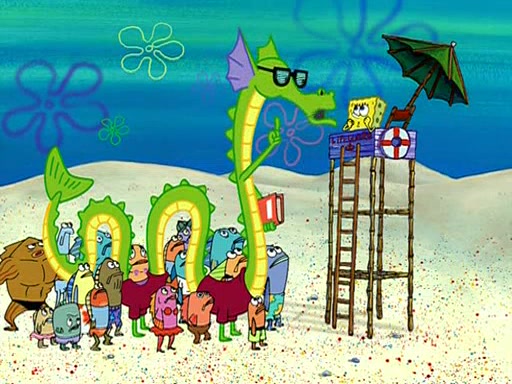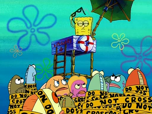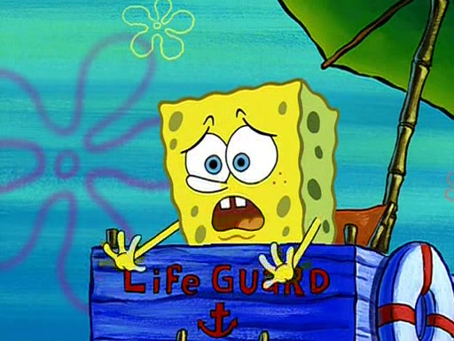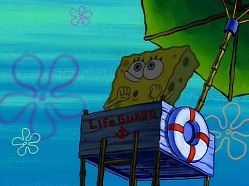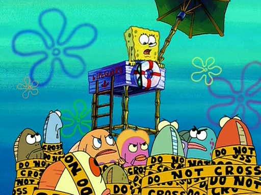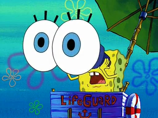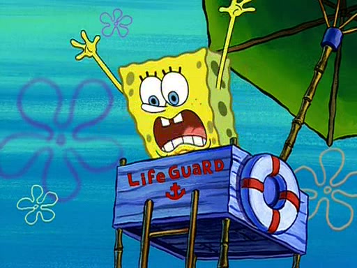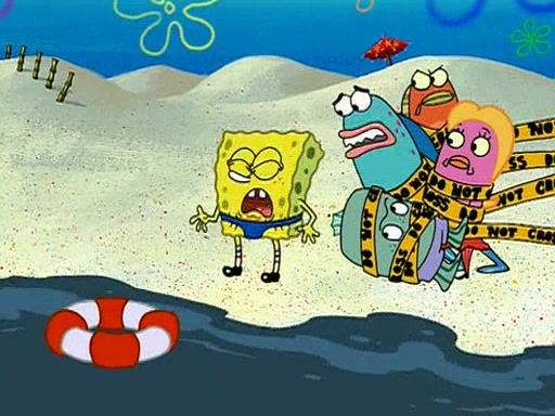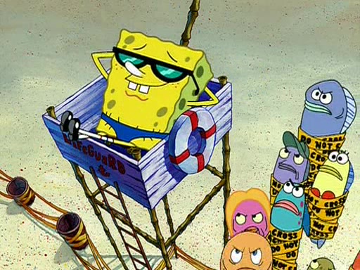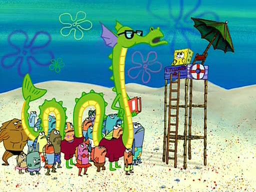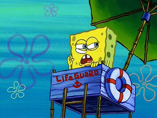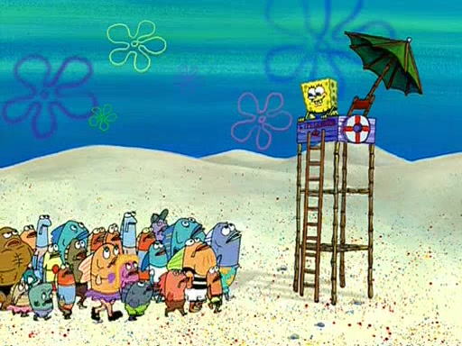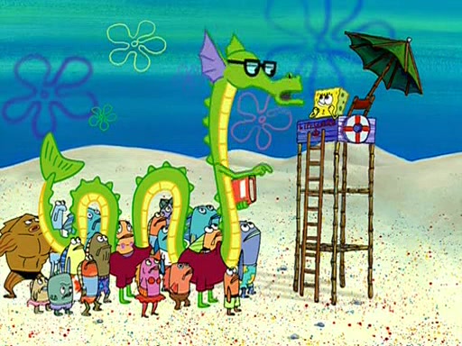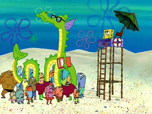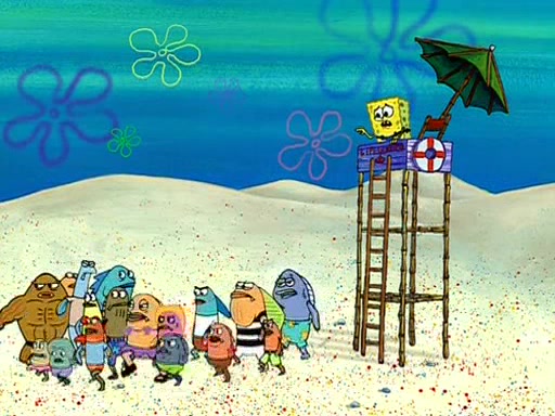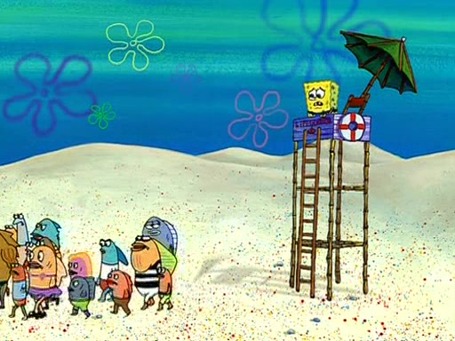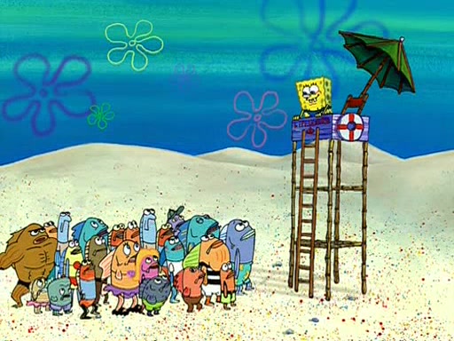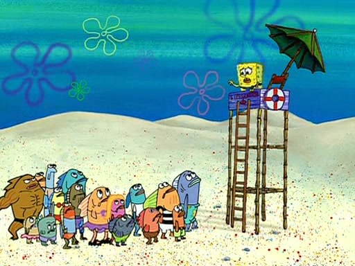 As a lifeguard, SpongeBob becomes very popular and does many fun activities. However, when Larry hears Bill drowning and saves him, SpongeBob realizes that being a lifeguard is much more than giving ice cream and sitting in a tower, but that it also means that he has to guard other people's lives. Larry suddenly leaves for a tanning booth, leaving SpongeBob, who can't swim, in charge of the beach. SpongeBob then imagines all the fish dead in a graveyard in the goo, and then alerts all the fish to an "emergency" that is not even going on. When everybody asks, confused as to what the "emergency" is, SpongeBob, forgetting that sharks are sea animals too, improvises and states that the "emergency" is a shark attack. A shark family then says that they are the ones he is referring to. Then he announces that there is a sea monster, but a sea monster then emerges from the crowd, slapping SpongeBob with his tail fin after explaining how impolite he is to sea monsters and everybody then knows that there is no emergency.