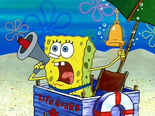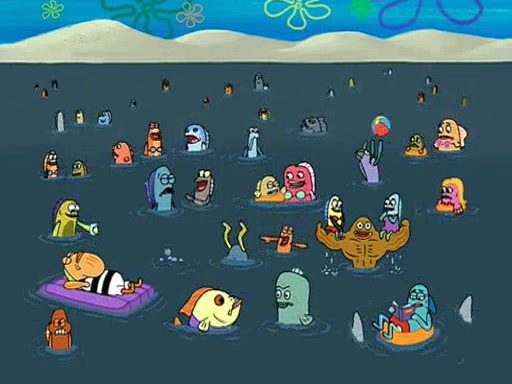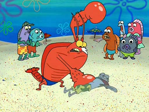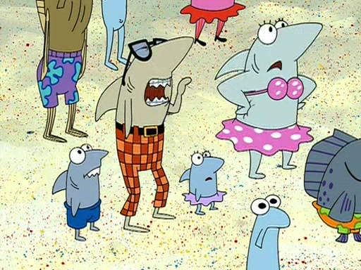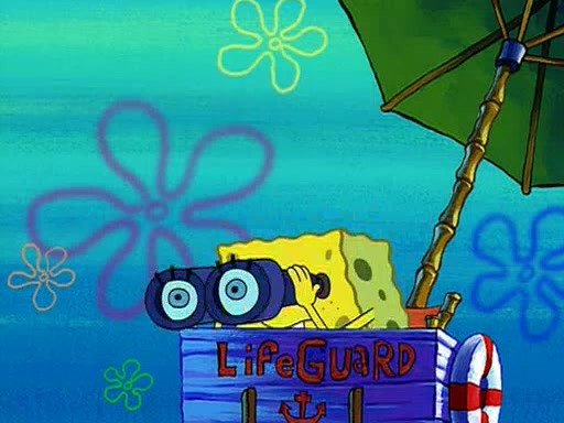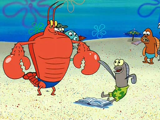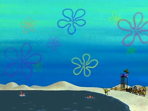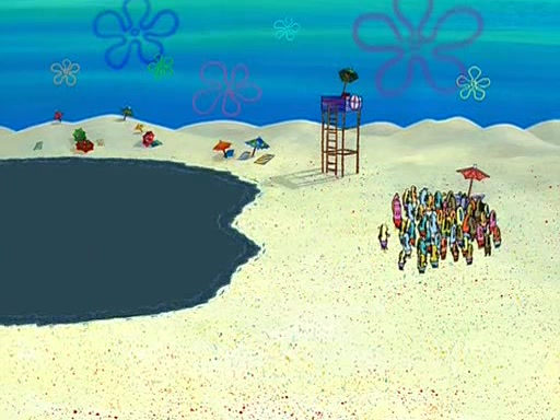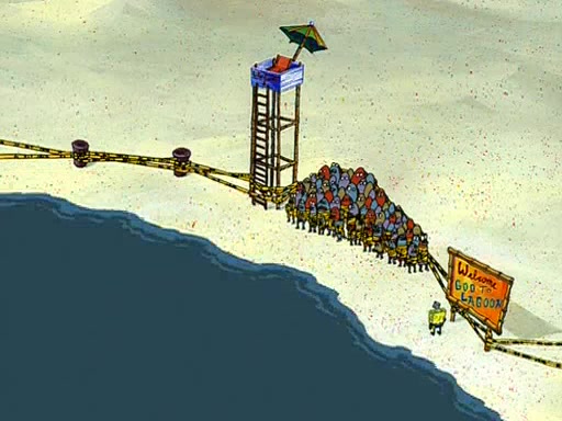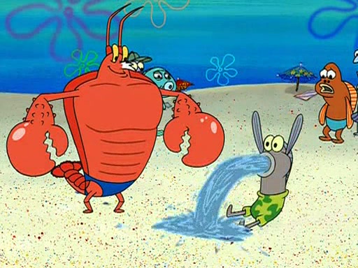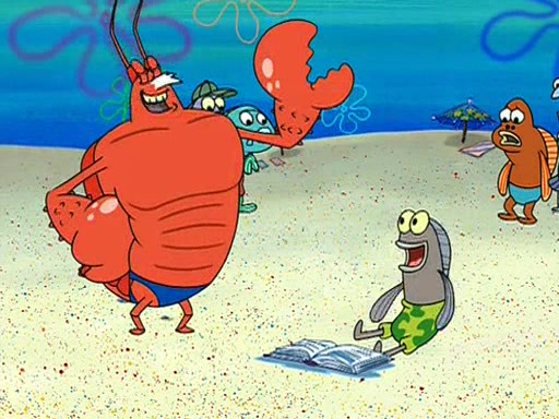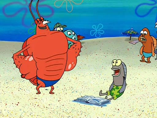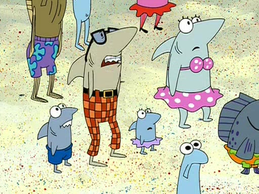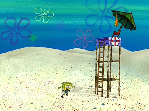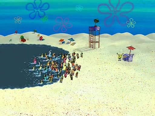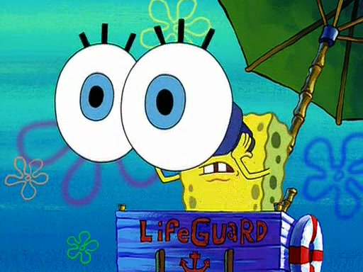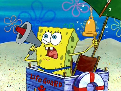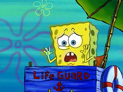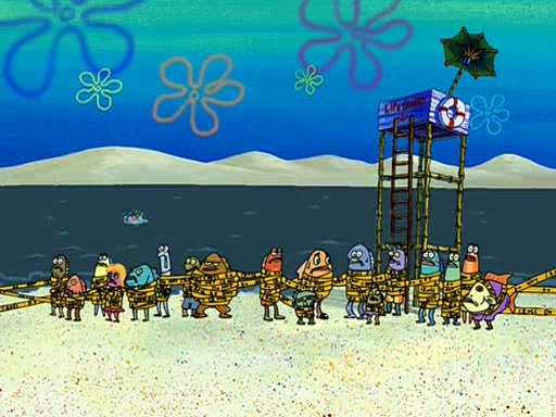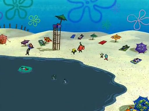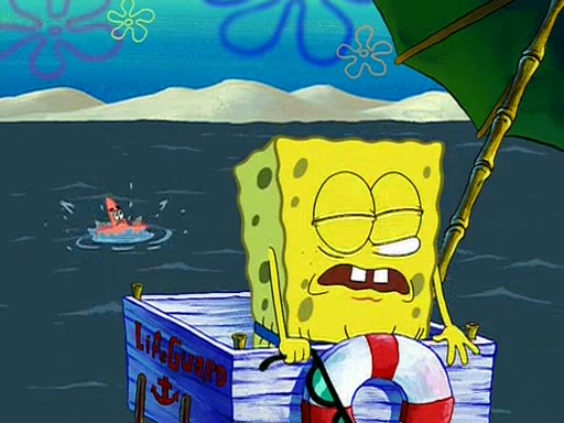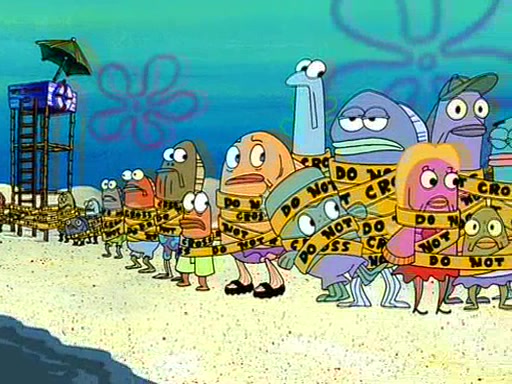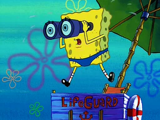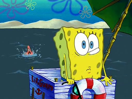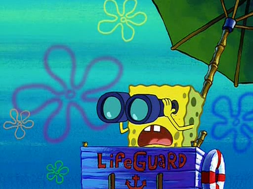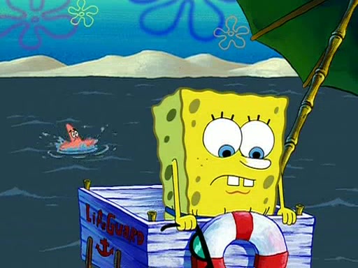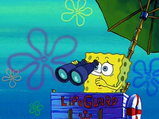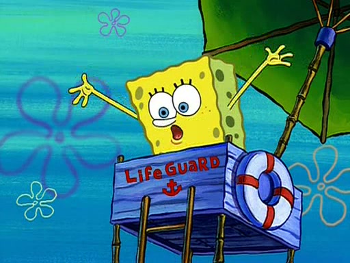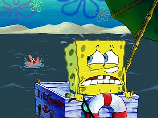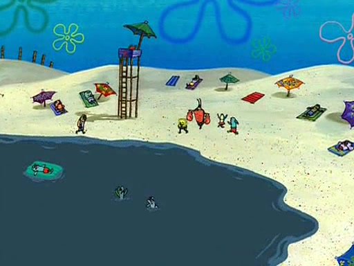 As a lifeguard, SpongeBob becomes very popular and does many fun activities. However, when Larry hears Bill drowning and saves him, SpongeBob realizes that being a lifeguard is much more than giving ice cream and sitting in a tower, but that it also means that he has to guard other people's lives. Larry suddenly leaves for a tanning booth, leaving SpongeBob, who can't swim, in charge of the beach. SpongeBob then imagines all the fish dead in a graveyard in the goo, and then alerts all the fish to an "emergency" that is not even going on. When everybody asks, confused as to what the "emergency" is, SpongeBob, forgetting that sharks are sea animals too, improvises and states that the "emergency" is a shark attack. A shark family then says that they are the ones he is referring to. Then he announces that there is a sea monster, but a sea monster then emerges from the crowd, slapping SpongeBob with his tail fin after explaining how impolite he is to sea monsters and everybody then knows that there is no emergency.