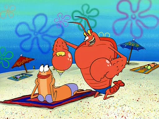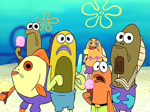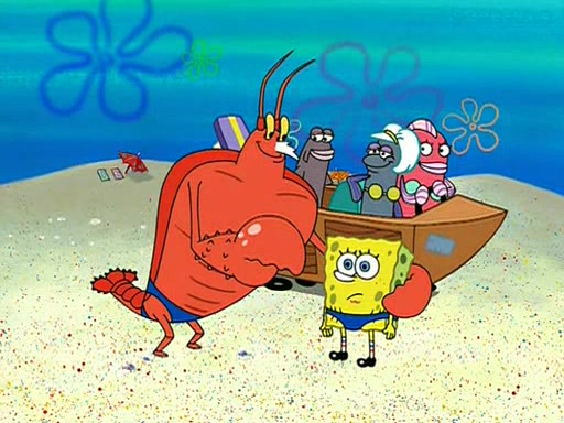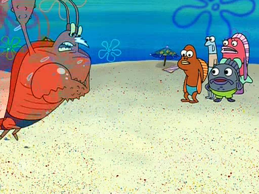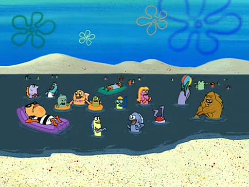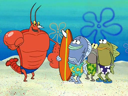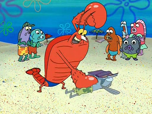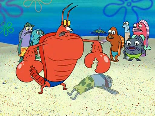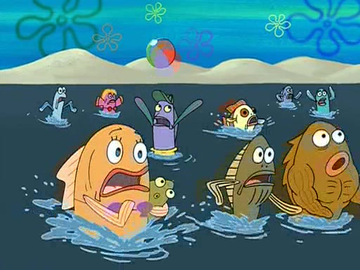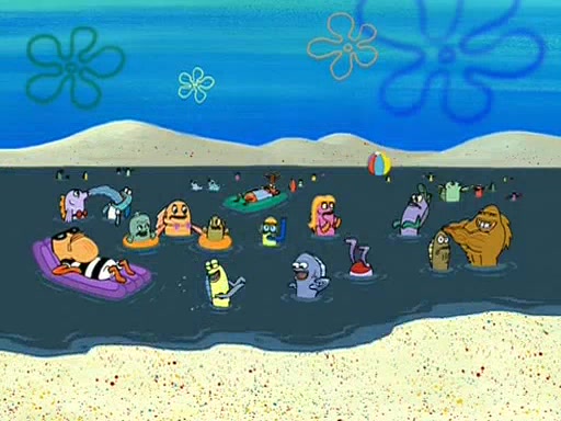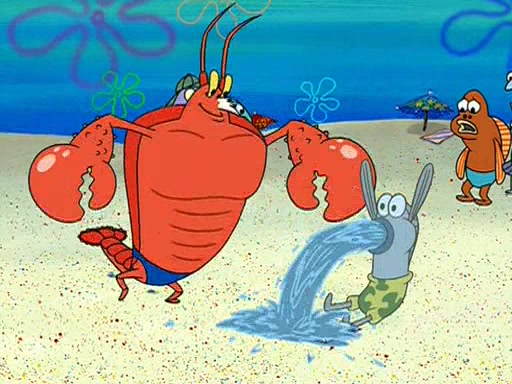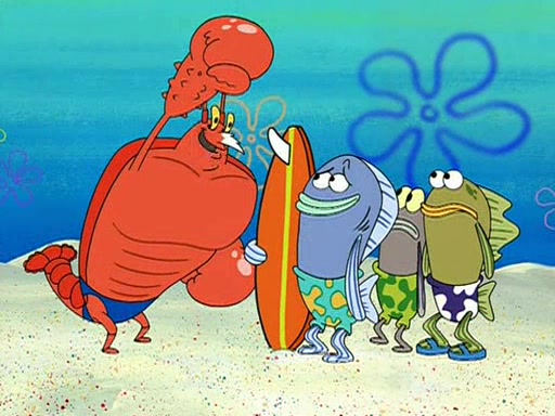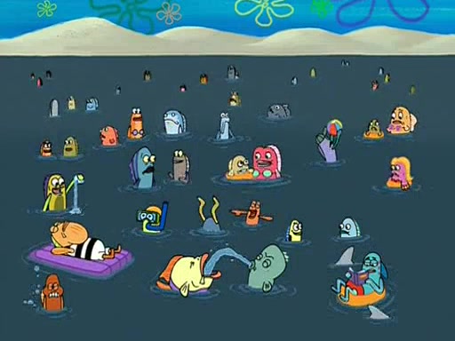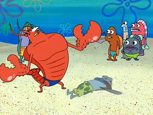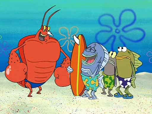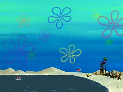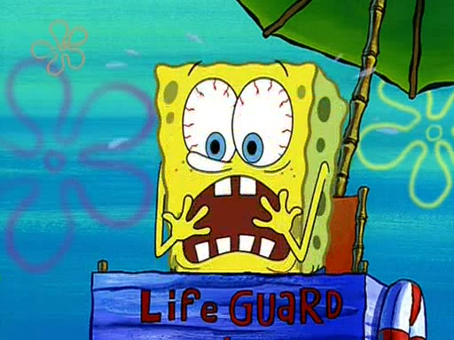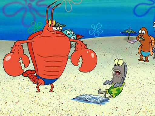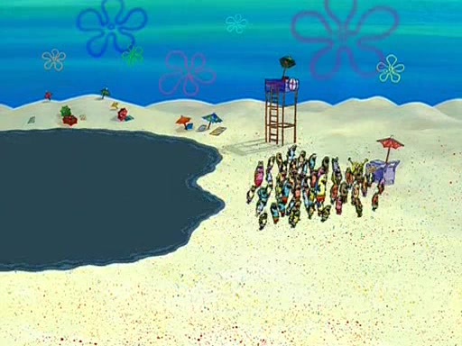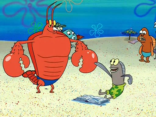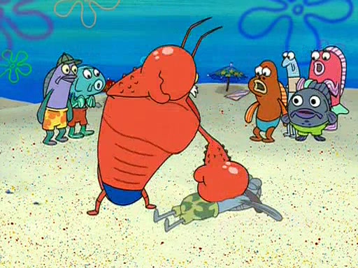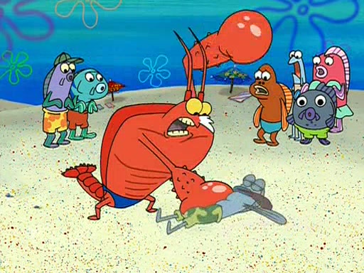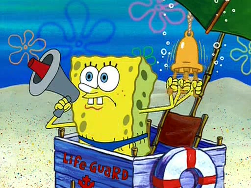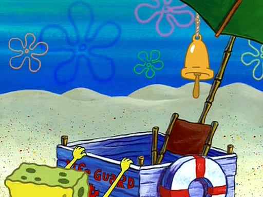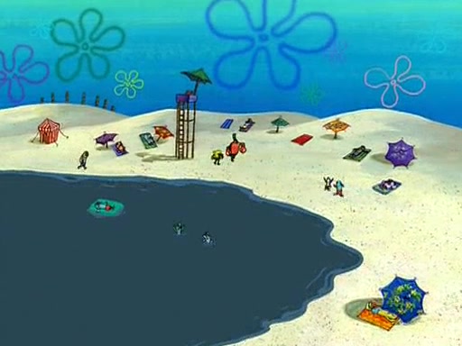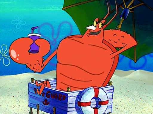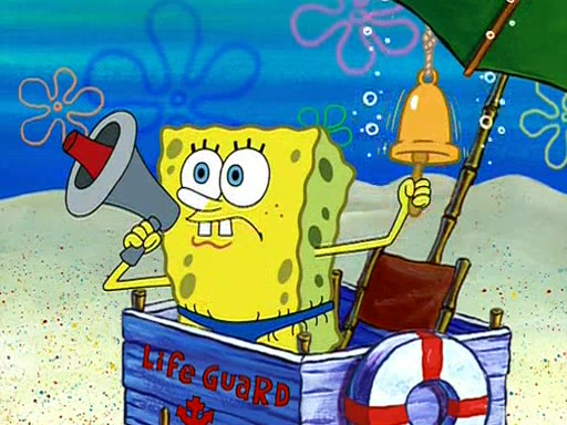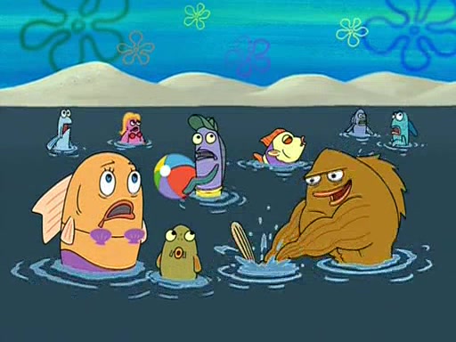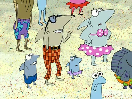 As a lifeguard, SpongeBob becomes very popular and does many fun activities. However, when Larry hears Bill drowning and saves him, SpongeBob realizes that being a lifeguard is much more than giving ice cream and sitting in a tower, but that it also means that he has to guard other people's lives. Larry suddenly leaves for a tanning booth, leaving SpongeBob, who can't swim, in charge of the beach. SpongeBob then imagines all the fish dead in a graveyard in the goo, and then alerts all the fish to an "emergency" that is not even going on. When everybody asks, confused as to what the "emergency" is, SpongeBob, forgetting that sharks are sea animals too, improvises and states that the "emergency" is a shark attack. A shark family then says that they are the ones he is referring to. Then he announces that there is a sea monster, but a sea monster then emerges from the crowd, slapping SpongeBob with his tail fin after explaining how impolite he is to sea monsters and everybody then knows that there is no emergency.