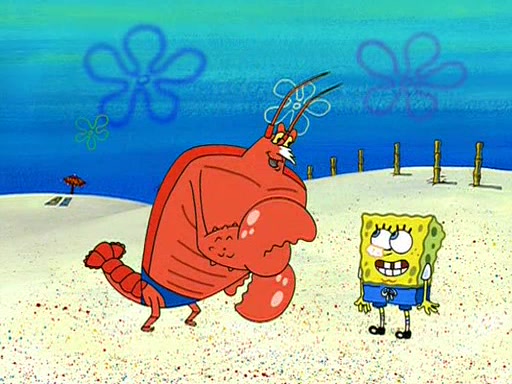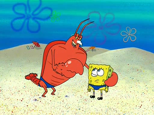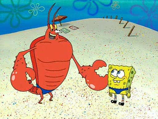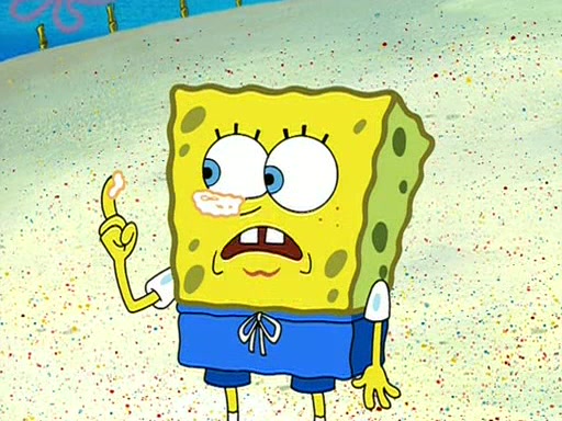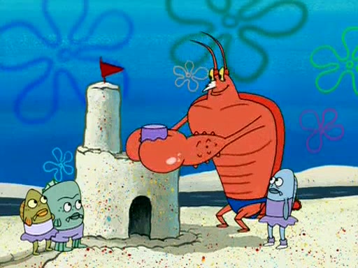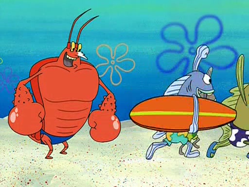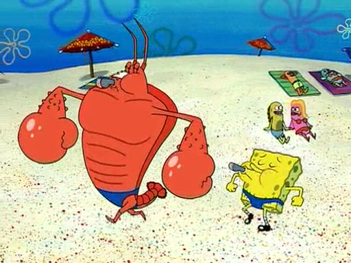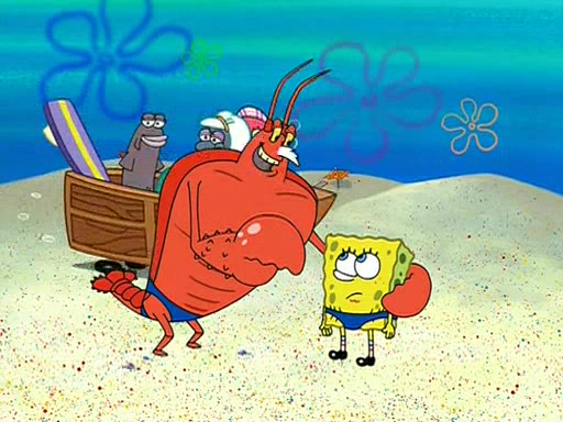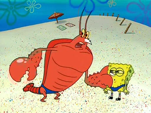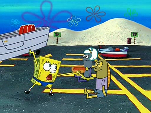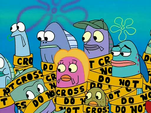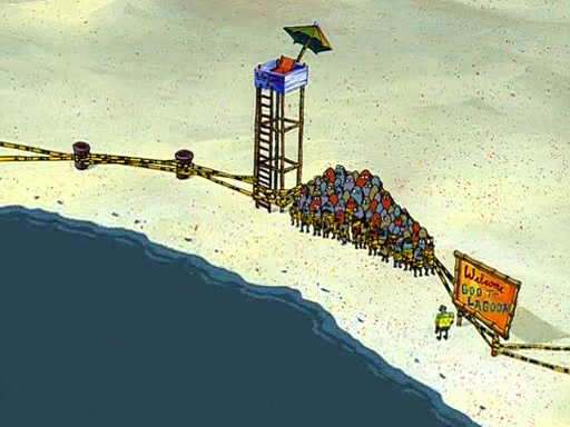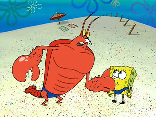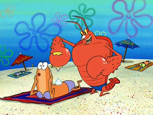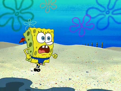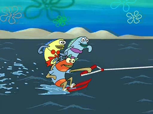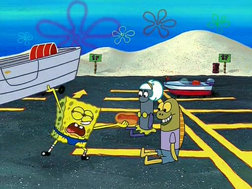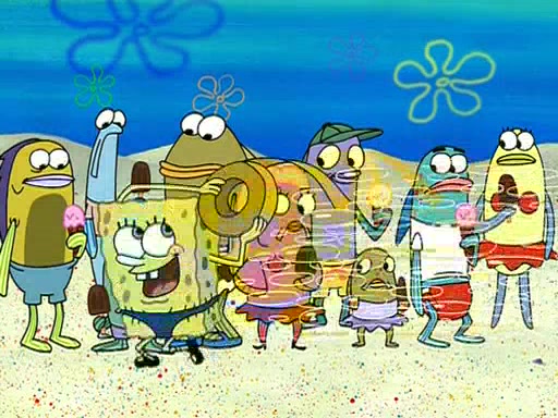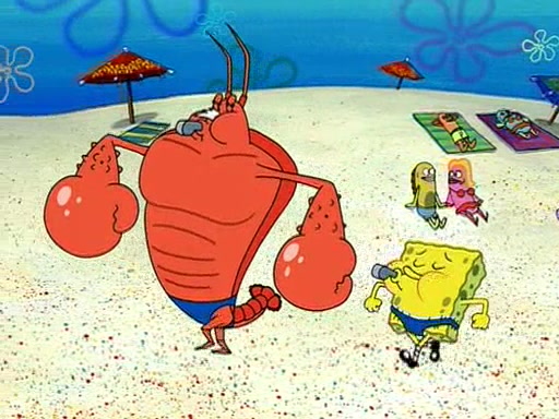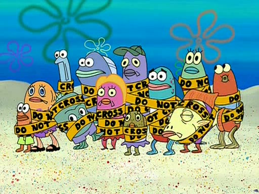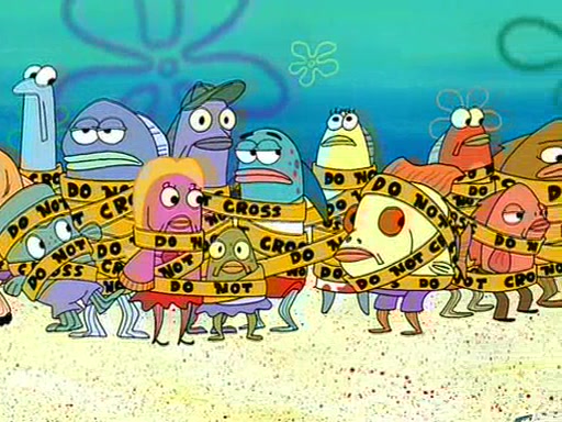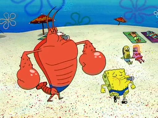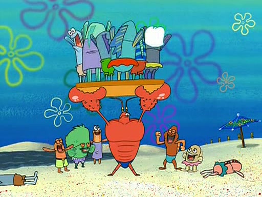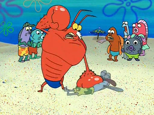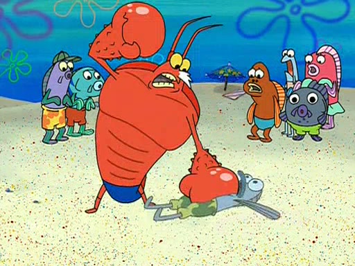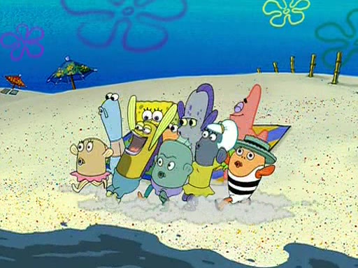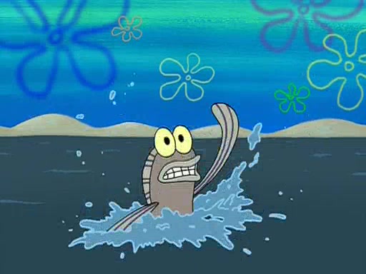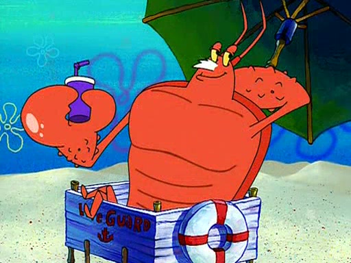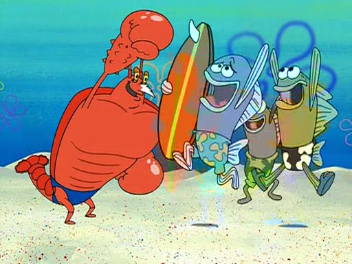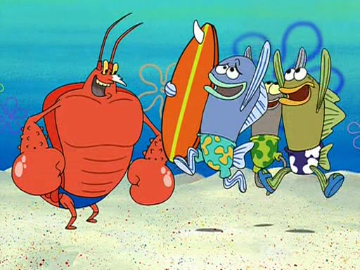 As a lifeguard, SpongeBob becomes very popular and does many fun activities. However, when Larry hears Bill drowning and saves him, SpongeBob realizes that being a lifeguard is much more than giving ice cream and sitting in a tower, but that it also means that he has to guard other people's lives. Larry suddenly leaves for a tanning booth, leaving SpongeBob, who can't swim, in charge of the beach. SpongeBob then imagines all the fish dead in a graveyard in the goo, and then alerts all the fish to an "emergency" that is not even going on. When everybody asks, confused as to what the "emergency" is, SpongeBob, forgetting that sharks are sea animals too, improvises and states that the "emergency" is a shark attack. A shark family then says that they are the ones he is referring to. Then he announces that there is a sea monster, but a sea monster then emerges from the crowd, slapping SpongeBob with his tail fin after explaining how impolite he is to sea monsters and everybody then knows that there is no emergency.