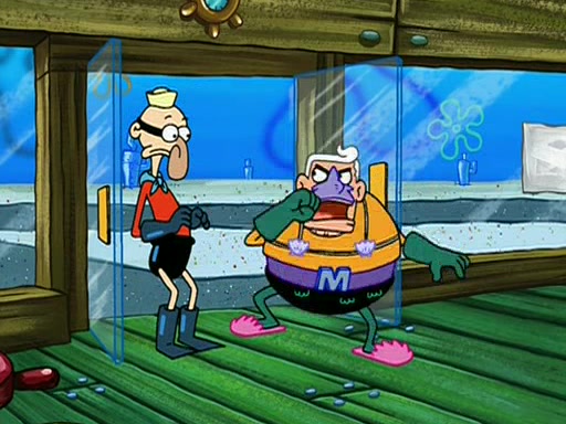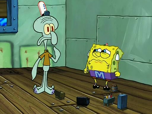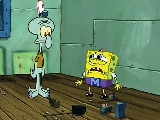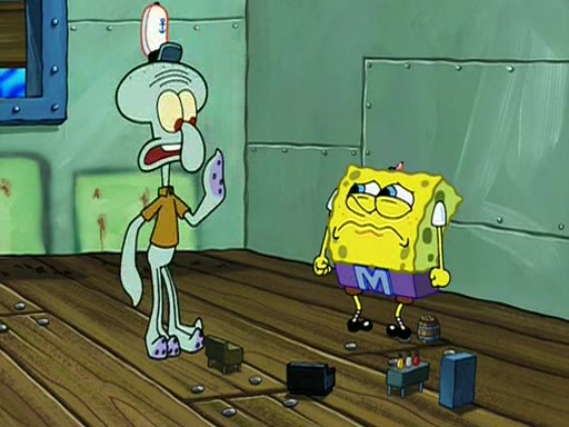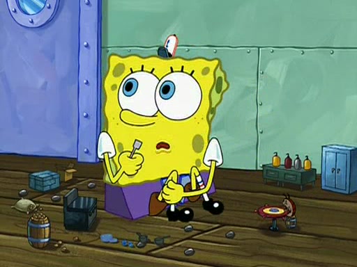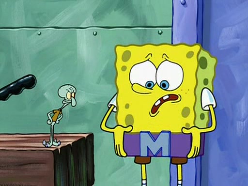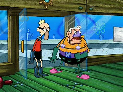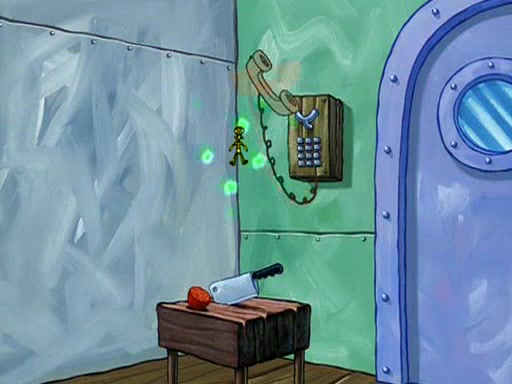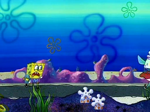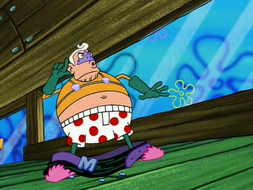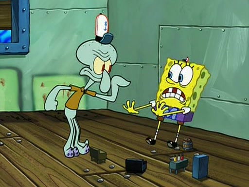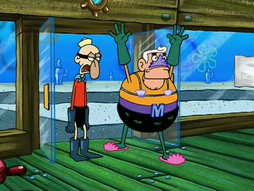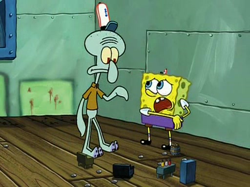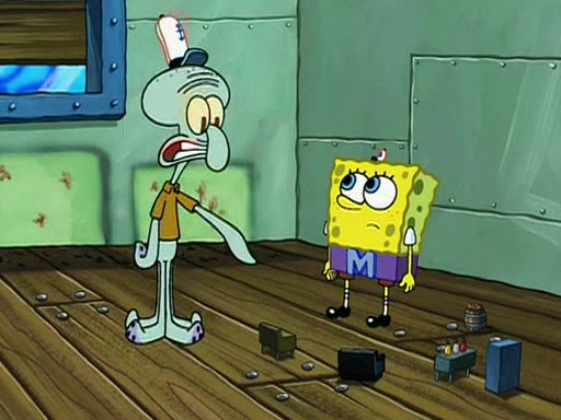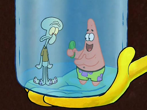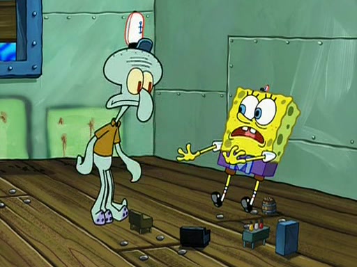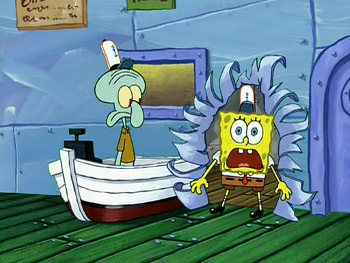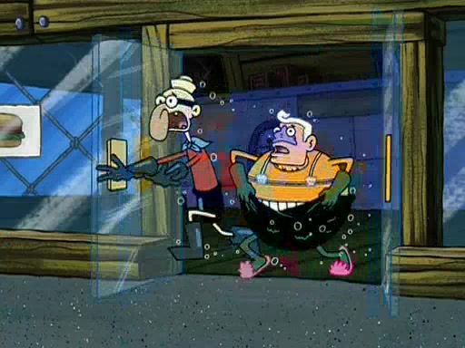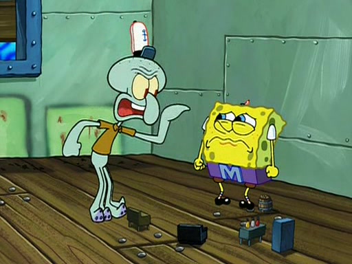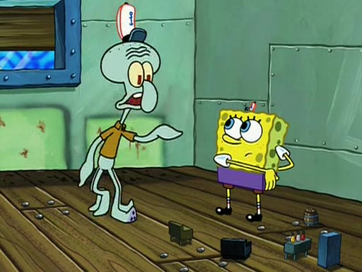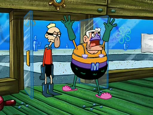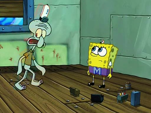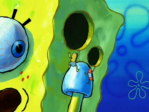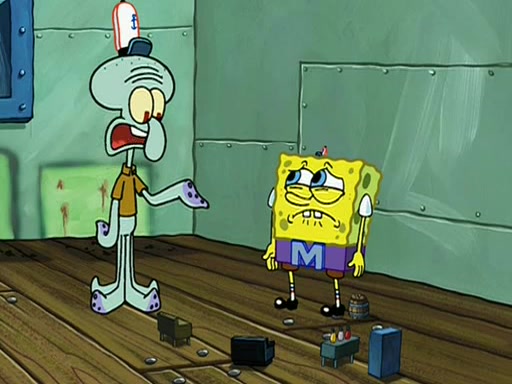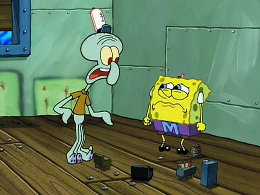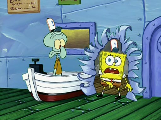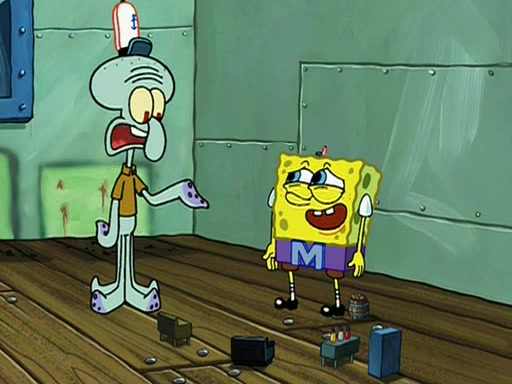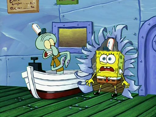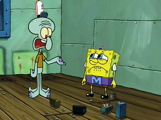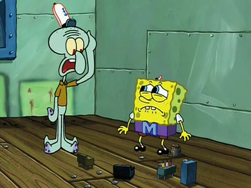 Mermaid Man & Barnacle Boy are entering the Krusty Krab, most likely for lunch, and upon realizing this, SpongeBob goes into an excited frenzy, bursting through a steel wall in order to get their autograph. The heroes run away from him, accidentally leaving Mermaid Man's utility belt inside. SpongeBob finds it, and tries to give it back, but they drive away in the Invisible Boat Mobile before he can do so. SpongeBob decides to wear the belt and play with it, thinking that he could hold on to it until after work. He discovers the "Small Ray," and starts shrinking the items in the kitchen. However, Squidward enters the room and sees SpongeBob serving tiny Krabby Patties to cockroaches and asks SpongeBob why is everything in the kitchen so tiny. Squidward discovers that SpongeBob has Mermaid Man's belt. Assuming that SpongeBob has stolen the belt, he plans to do the right thing and call Mermaid Man in order to get revenge, and tell on him. SpongeBob realizes that if Squidward tells on him, Mermaid Man will find out and he will be kicked out of his fan club for sure. In order to stop Squidward, SpongeBob shrinks him, and promises to find a way to return him to normal after Squidward demands SpongeBob to return him to normal size. He tries to use the different buttons to make Squidward big, but none of them work. Not wanting Mermaid Man to find out due to how he might react, he leaves to find someone that can help him.