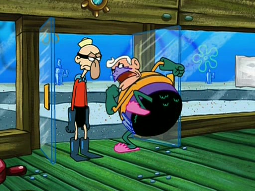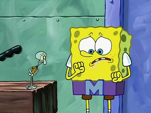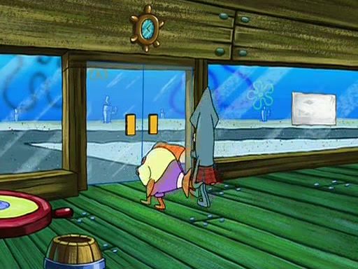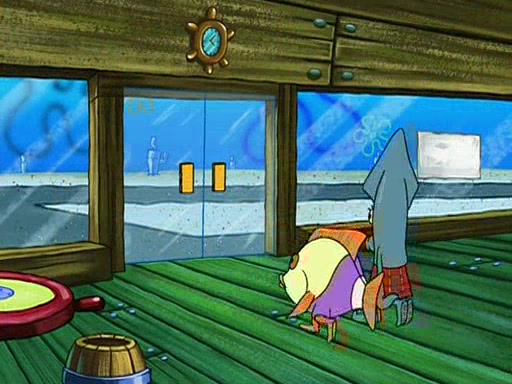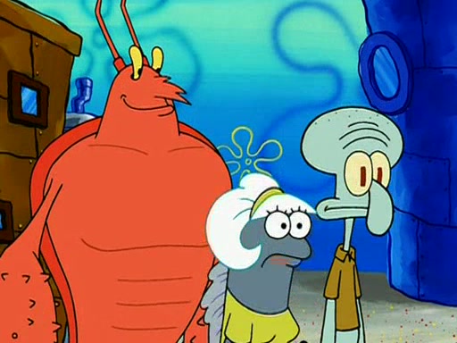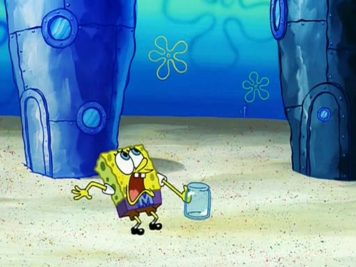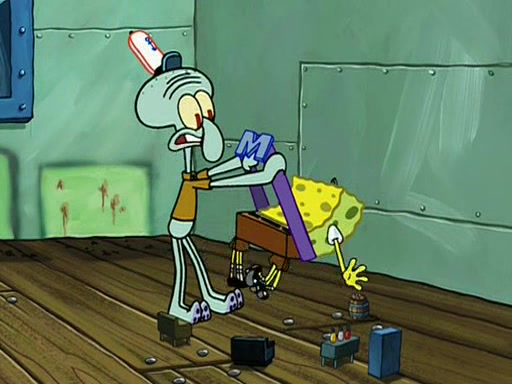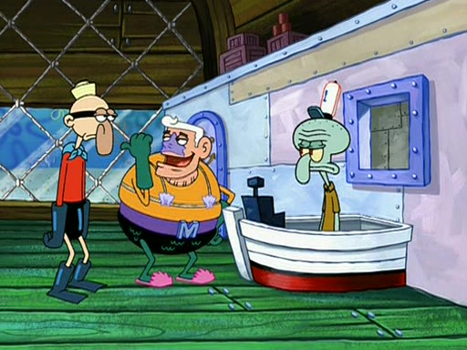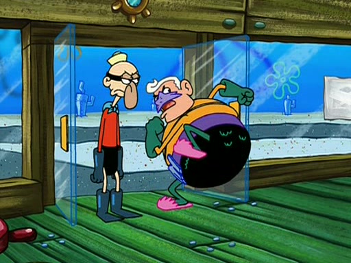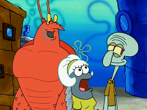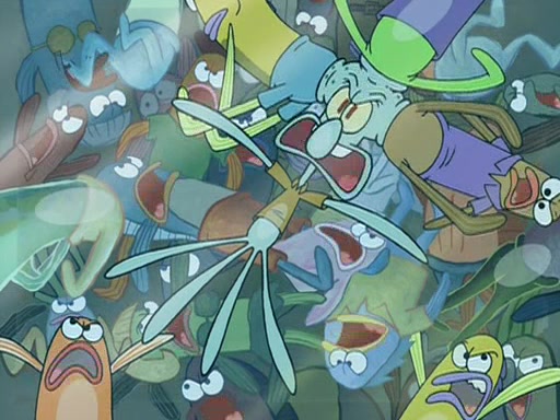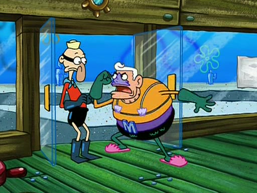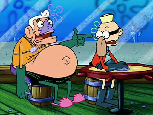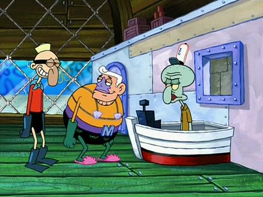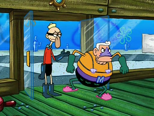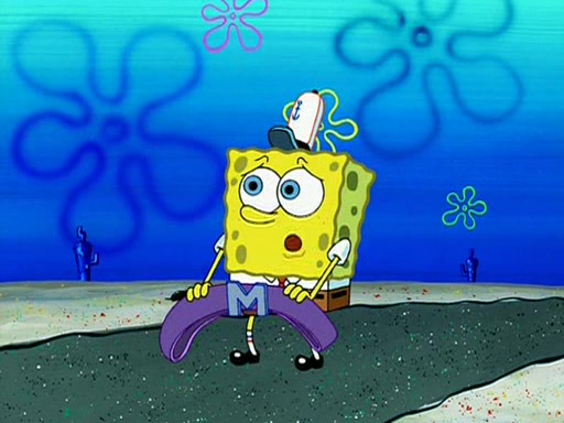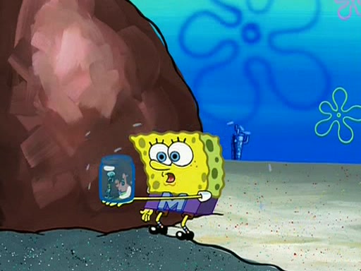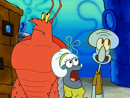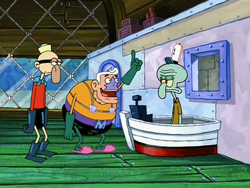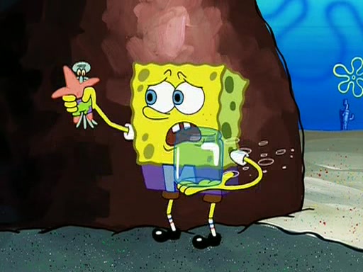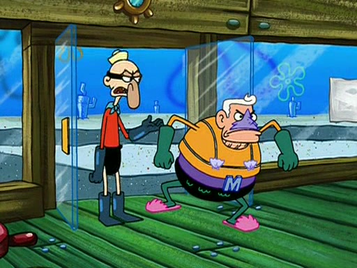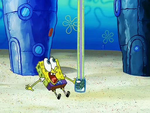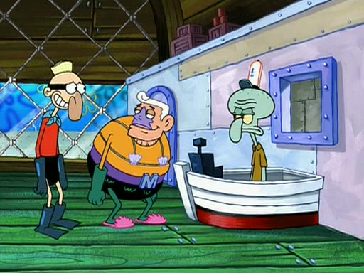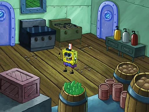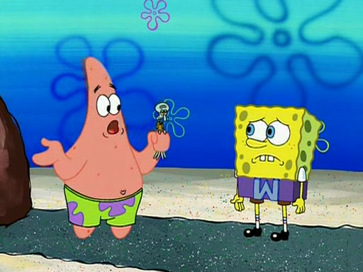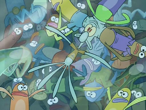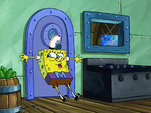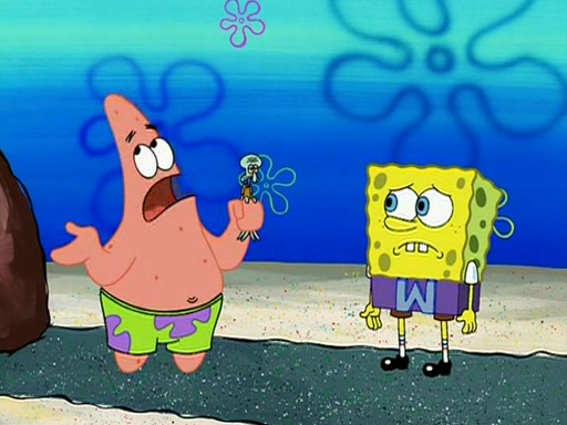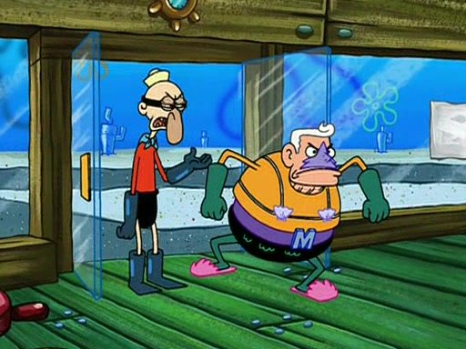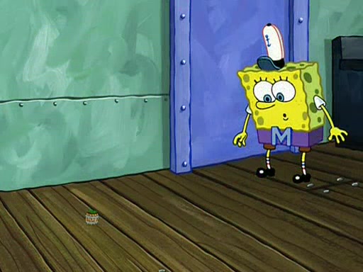 Mermaid Man & Barnacle Boy are entering the Krusty Krab, most likely for lunch, and upon realizing this, SpongeBob goes into an excited frenzy, bursting through a steel wall in order to get their autograph. The heroes run away from him, accidentally leaving Mermaid Man's utility belt inside. SpongeBob finds it, and tries to give it back, but they drive away in the Invisible Boat Mobile before he can do so. SpongeBob decides to wear the belt and play with it, thinking that he could hold on to it until after work. He discovers the "Small Ray," and starts shrinking the items in the kitchen. However, Squidward enters the room and sees SpongeBob serving tiny Krabby Patties to cockroaches and asks SpongeBob why is everything in the kitchen so tiny. Squidward discovers that SpongeBob has Mermaid Man's belt. Assuming that SpongeBob has stolen the belt, he plans to do the right thing and call Mermaid Man in order to get revenge, and tell on him. SpongeBob realizes that if Squidward tells on him, Mermaid Man will find out and he will be kicked out of his fan club for sure. In order to stop Squidward, SpongeBob shrinks him, and promises to find a way to return him to normal after Squidward demands SpongeBob to return him to normal size. He tries to use the different buttons to make Squidward big, but none of them work. Not wanting Mermaid Man to find out due to how he might react, he leaves to find someone that can help him.