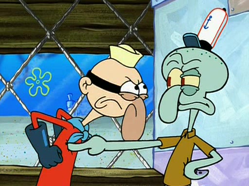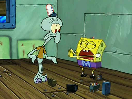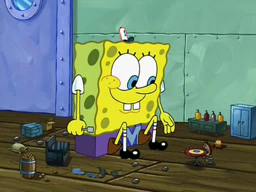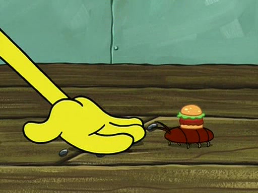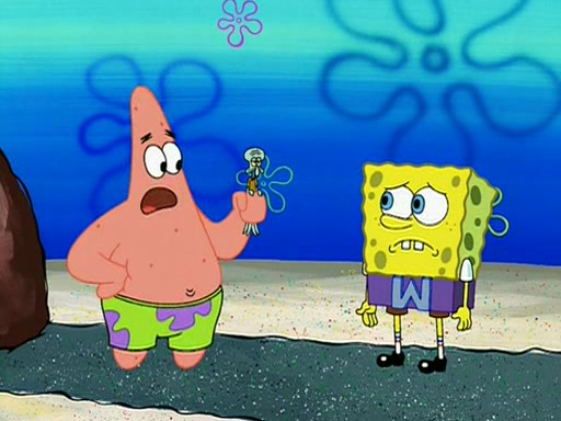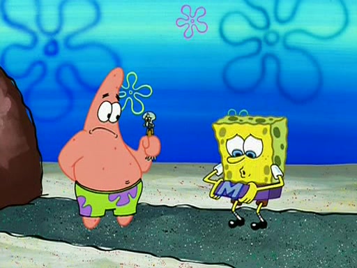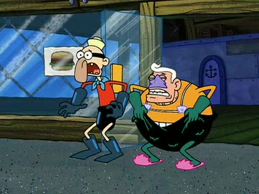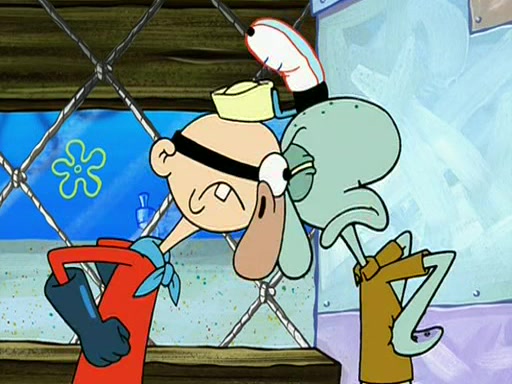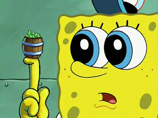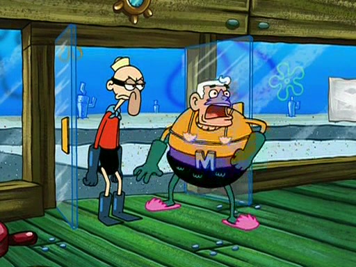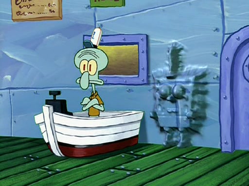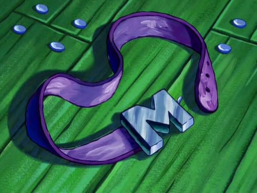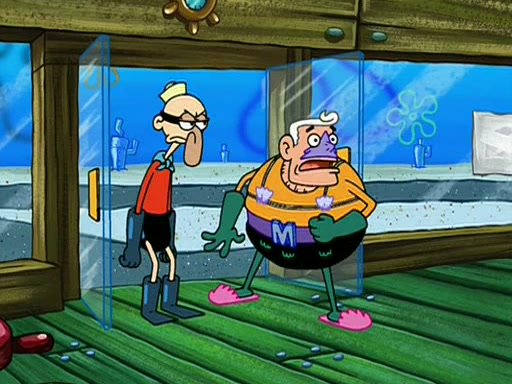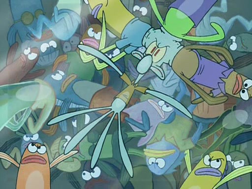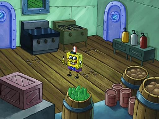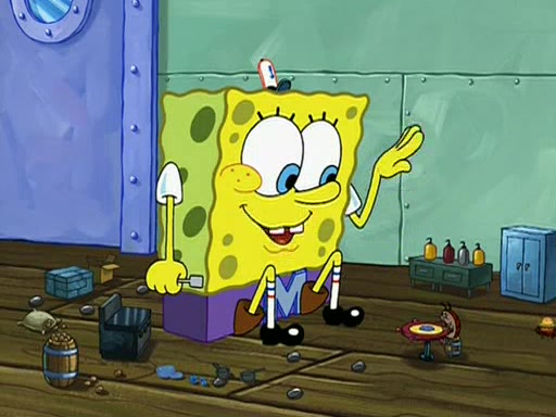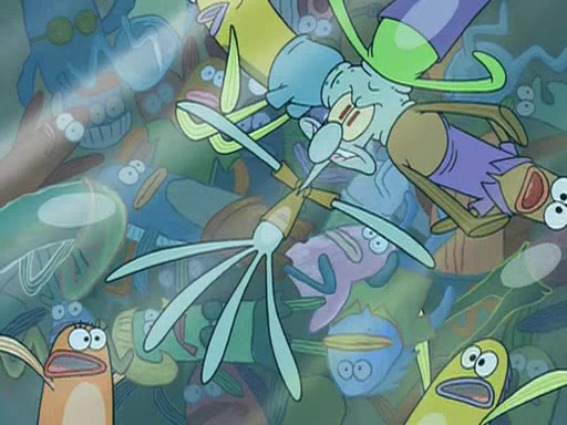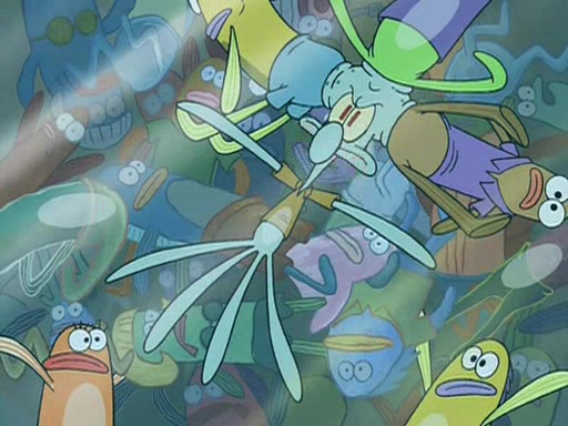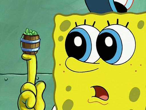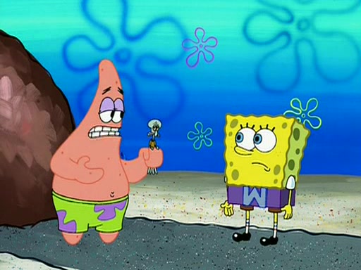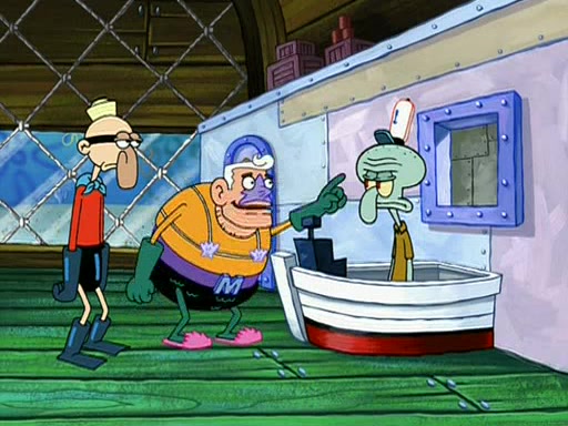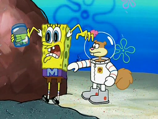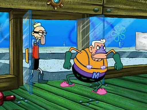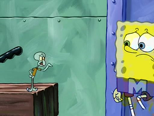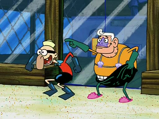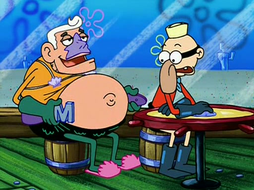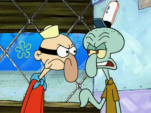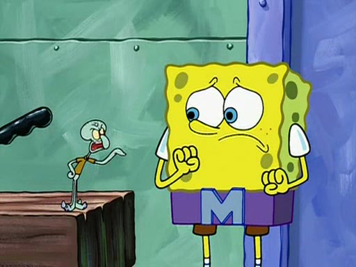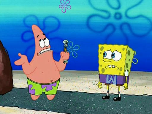Mermaid Man & Barnacle Boy are entering the Krusty Krab, most likely for lunch, and upon realizing this, SpongeBob goes into an excited frenzy, bursting through a steel wall in order to get their autograph. The heroes run away from him, accidentally leaving Mermaid Man's utility belt inside. SpongeBob finds it, and tries to give it back, but they drive away in the Invisible Boat Mobile before he can do so. SpongeBob decides to wear the belt and play with it, thinking that he could hold on to it until after work. He discovers the "Small Ray," and starts shrinking the items in the kitchen. However, Squidward enters the room and sees SpongeBob serving tiny Krabby Patties to cockroaches and asks SpongeBob why is everything in the kitchen so tiny. Squidward discovers that SpongeBob has Mermaid Man's belt. Assuming that SpongeBob has stolen the belt, he plans to do the right thing and call Mermaid Man in order to get revenge, and tell on him. SpongeBob realizes that if Squidward tells on him, Mermaid Man will find out and he will be kicked out of his fan club for sure. In order to stop Squidward, SpongeBob shrinks him, and promises to find a way to return him to normal after Squidward demands SpongeBob to return him to normal size. He tries to use the different buttons to make Squidward big, but none of them work. Not wanting Mermaid Man to find out due to how he might react, he leaves to find someone that can help him.