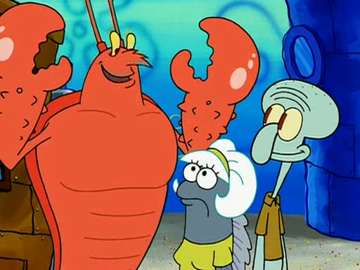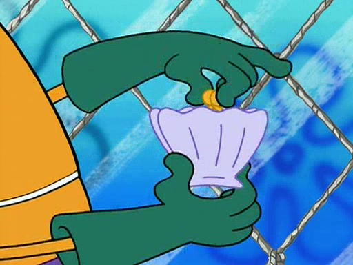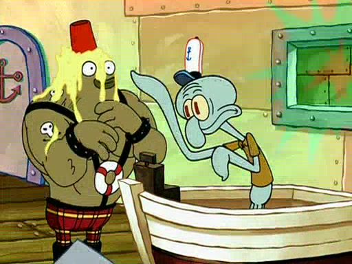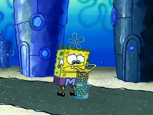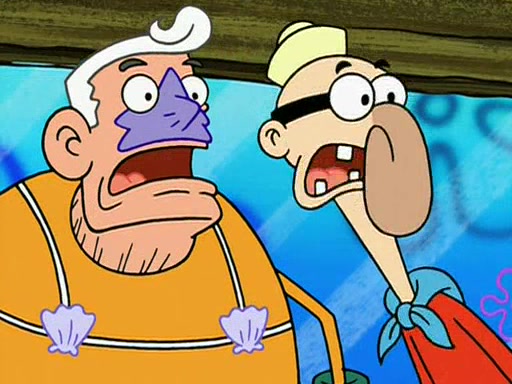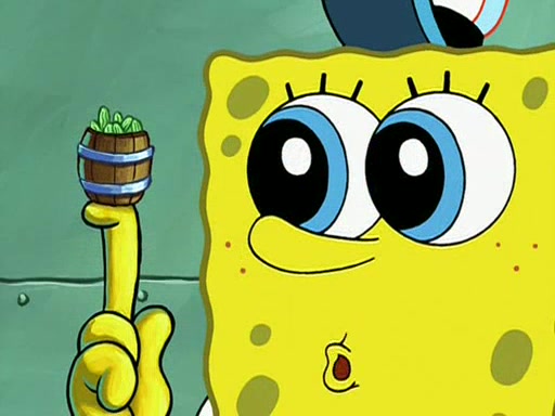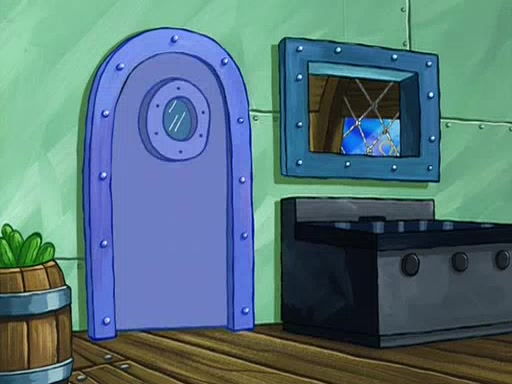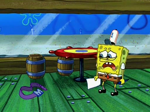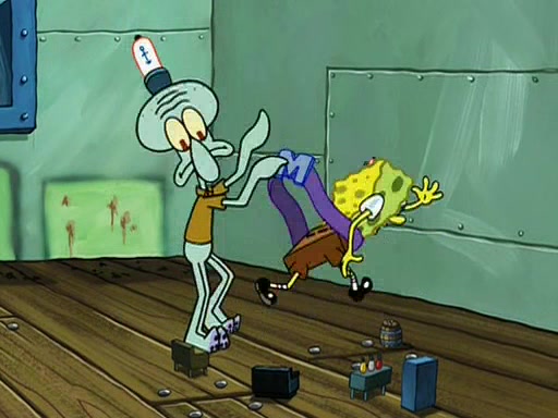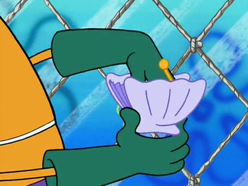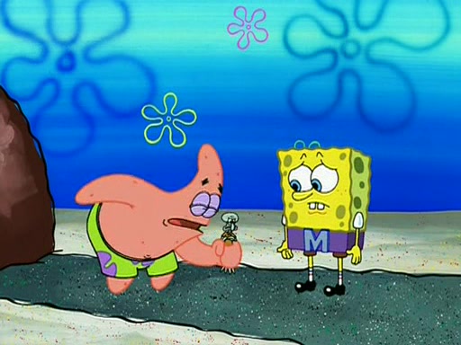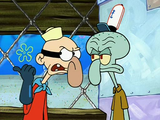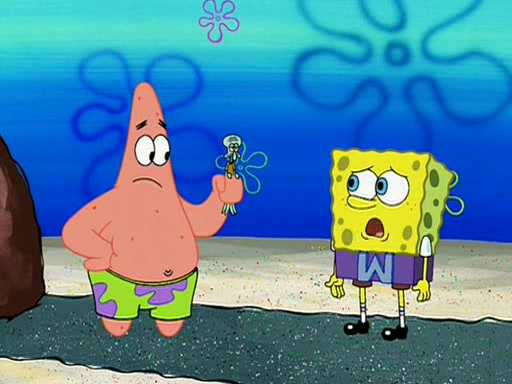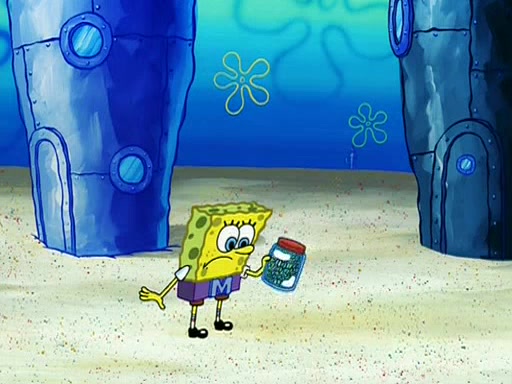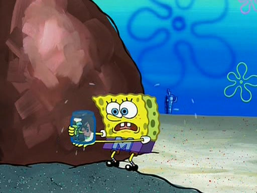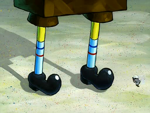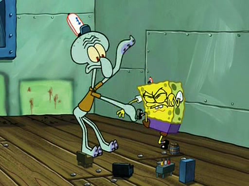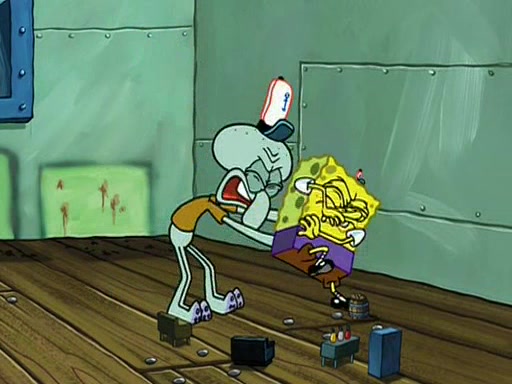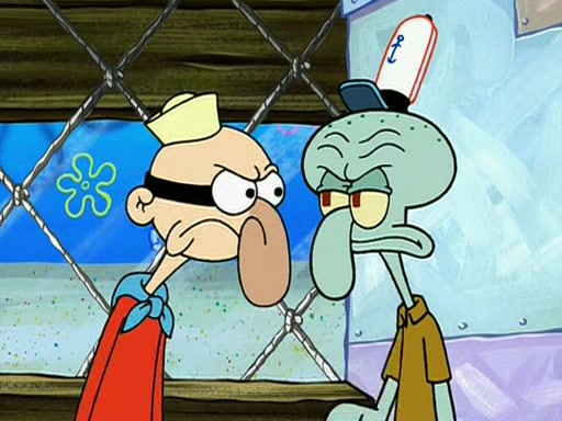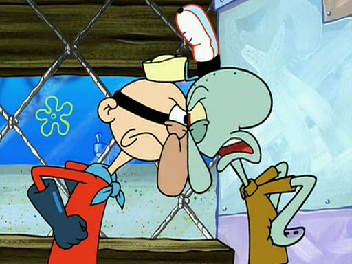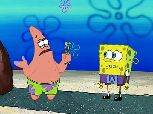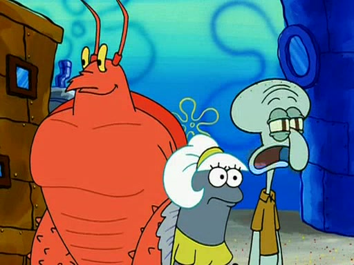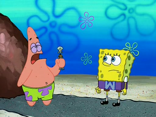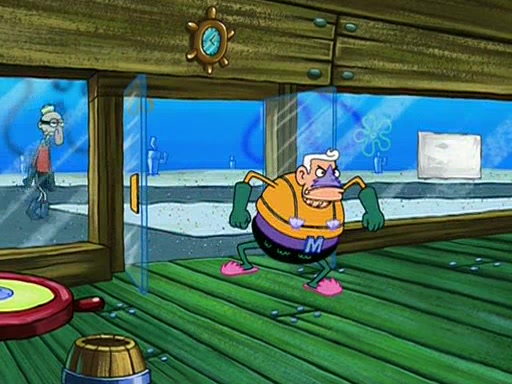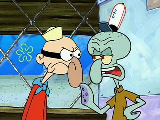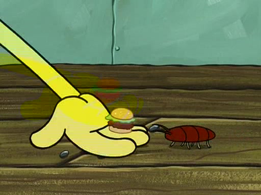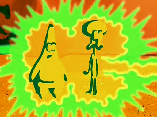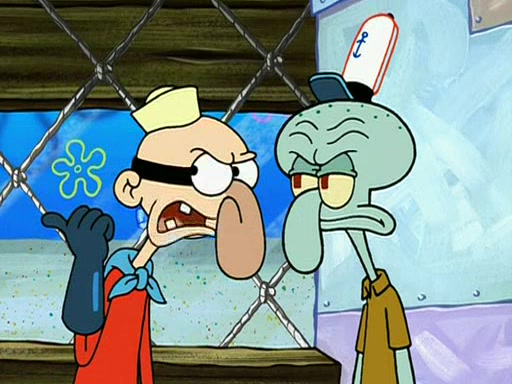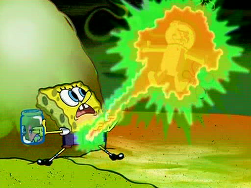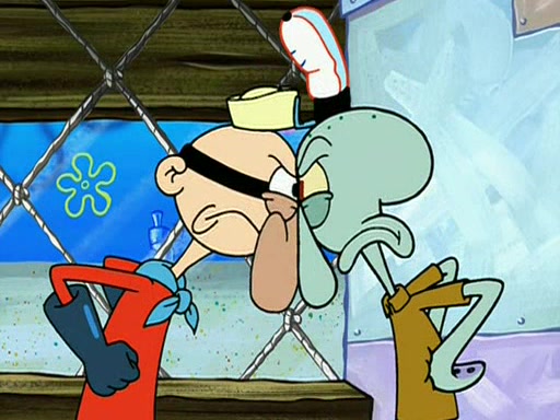 Mermaid Man & Barnacle Boy are entering the Krusty Krab, most likely for lunch, and upon realizing this, SpongeBob goes into an excited frenzy, bursting through a steel wall in order to get their autograph. The heroes run away from him, accidentally leaving Mermaid Man's utility belt inside. SpongeBob finds it, and tries to give it back, but they drive away in the Invisible Boat Mobile before he can do so. SpongeBob decides to wear the belt and play with it, thinking that he could hold on to it until after work. He discovers the "Small Ray," and starts shrinking the items in the kitchen. However, Squidward enters the room and sees SpongeBob serving tiny Krabby Patties to cockroaches and asks SpongeBob why is everything in the kitchen so tiny. Squidward discovers that SpongeBob has Mermaid Man's belt. Assuming that SpongeBob has stolen the belt, he plans to do the right thing and call Mermaid Man in order to get revenge, and tell on him. SpongeBob realizes that if Squidward tells on him, Mermaid Man will find out and he will be kicked out of his fan club for sure. In order to stop Squidward, SpongeBob shrinks him, and promises to find a way to return him to normal after Squidward demands SpongeBob to return him to normal size. He tries to use the different buttons to make Squidward big, but none of them work. Not wanting Mermaid Man to find out due to how he might react, he leaves to find someone that can help him.