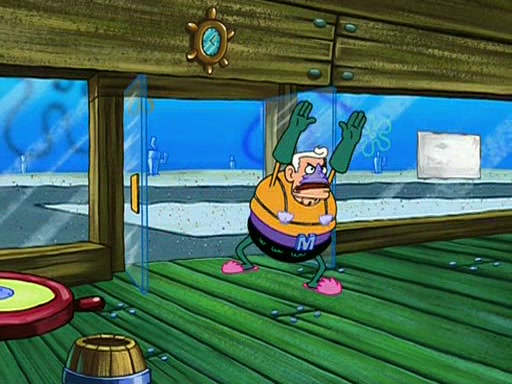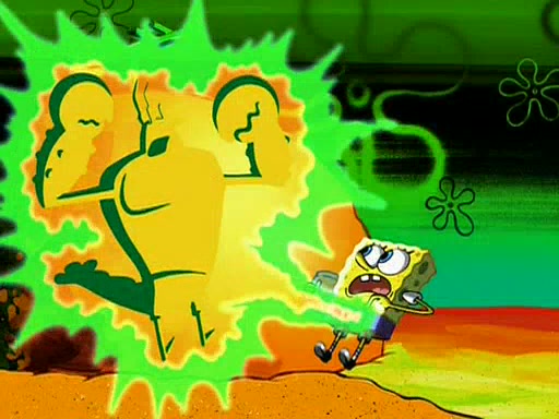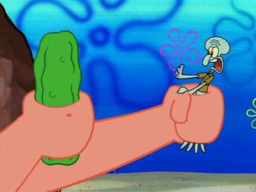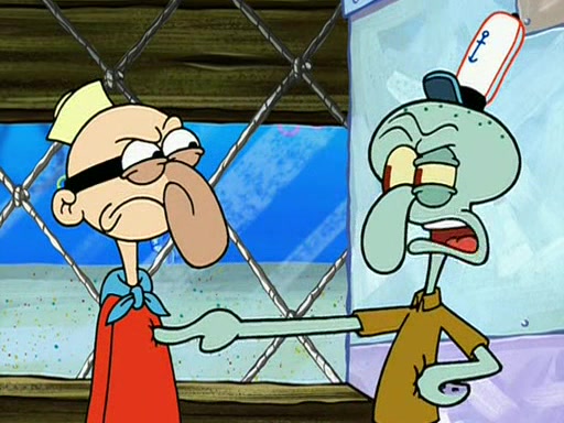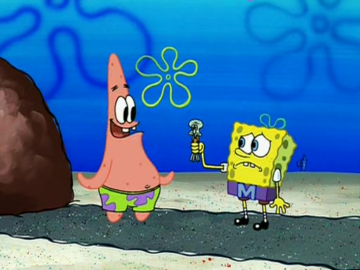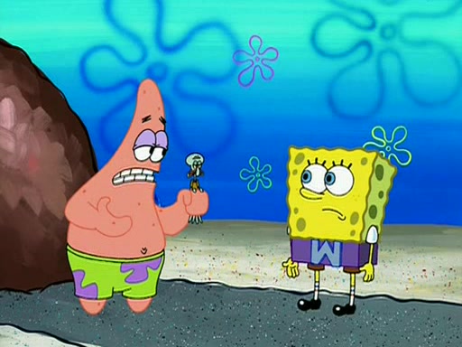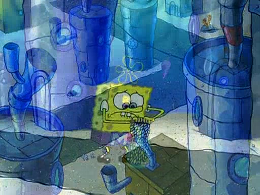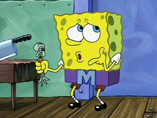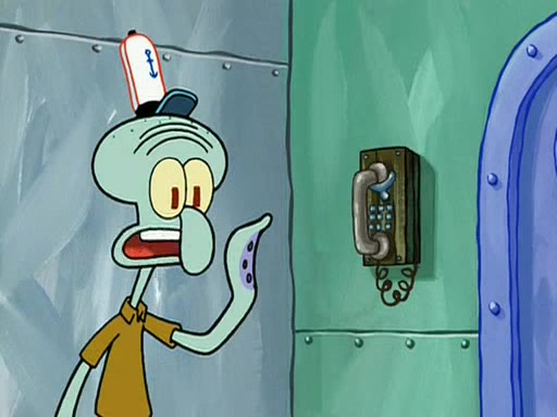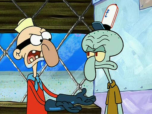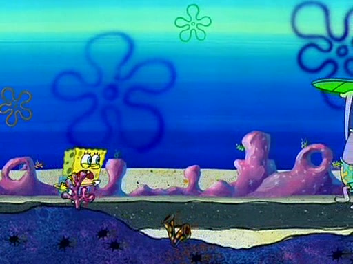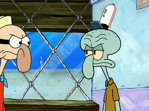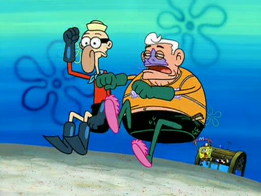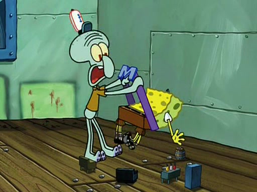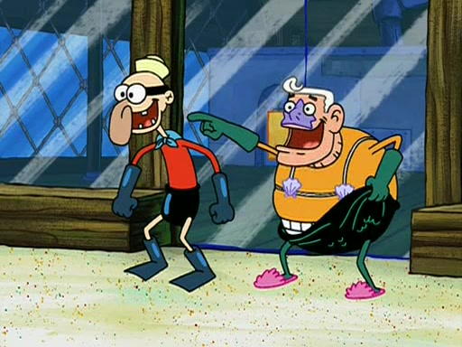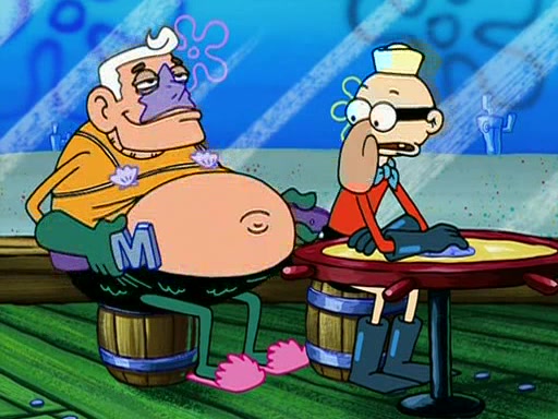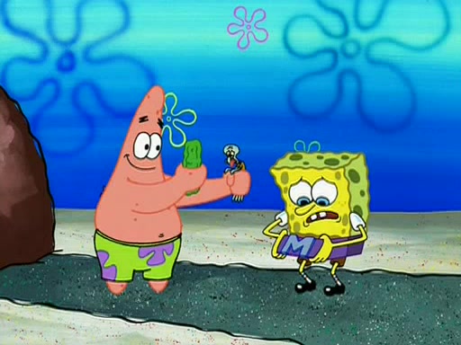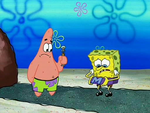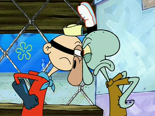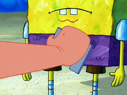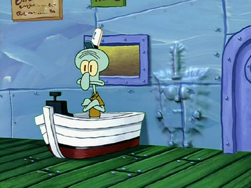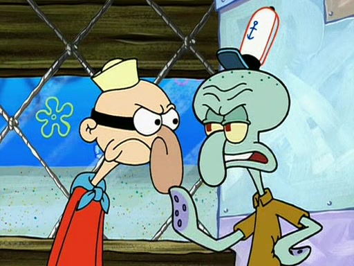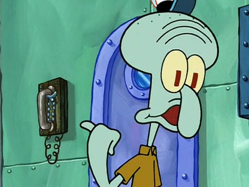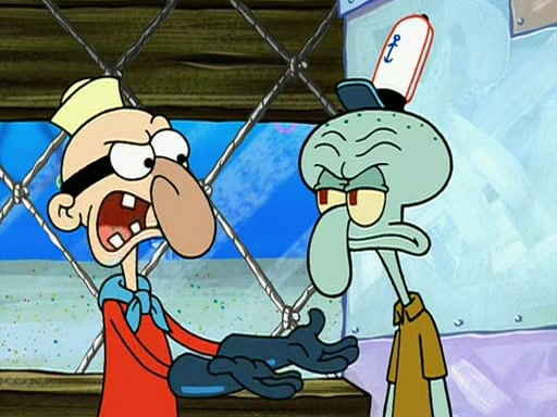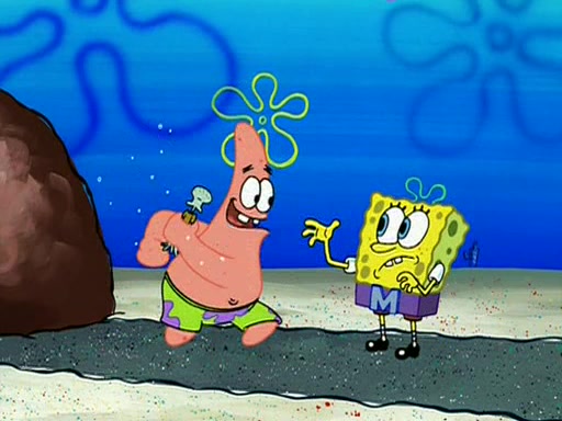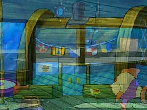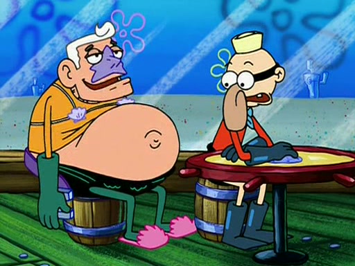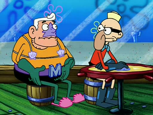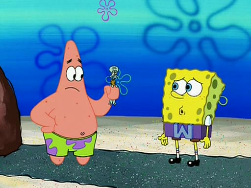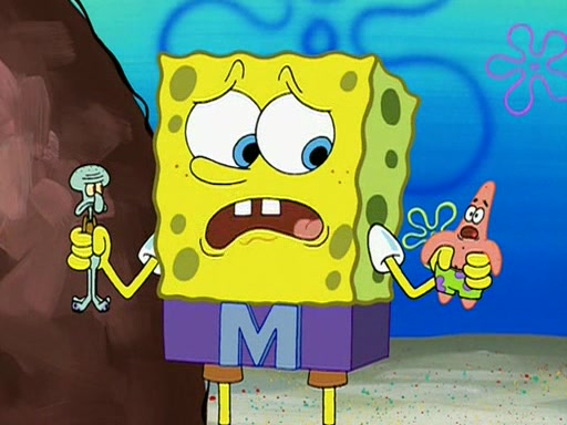 Mermaid Man & Barnacle Boy are entering the Krusty Krab, most likely for lunch, and upon realizing this, SpongeBob goes into an excited frenzy, bursting through a steel wall in order to get their autograph. The heroes run away from him, accidentally leaving Mermaid Man's utility belt inside. SpongeBob finds it, and tries to give it back, but they drive away in the Invisible Boat Mobile before he can do so. SpongeBob decides to wear the belt and play with it, thinking that he could hold on to it until after work. He discovers the "Small Ray," and starts shrinking the items in the kitchen. However, Squidward enters the room and sees SpongeBob serving tiny Krabby Patties to cockroaches and asks SpongeBob why is everything in the kitchen so tiny. Squidward discovers that SpongeBob has Mermaid Man's belt. Assuming that SpongeBob has stolen the belt, he plans to do the right thing and call Mermaid Man in order to get revenge, and tell on him. SpongeBob realizes that if Squidward tells on him, Mermaid Man will find out and he will be kicked out of his fan club for sure. In order to stop Squidward, SpongeBob shrinks him, and promises to find a way to return him to normal after Squidward demands SpongeBob to return him to normal size. He tries to use the different buttons to make Squidward big, but none of them work. Not wanting Mermaid Man to find out due to how he might react, he leaves to find someone that can help him.