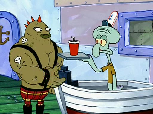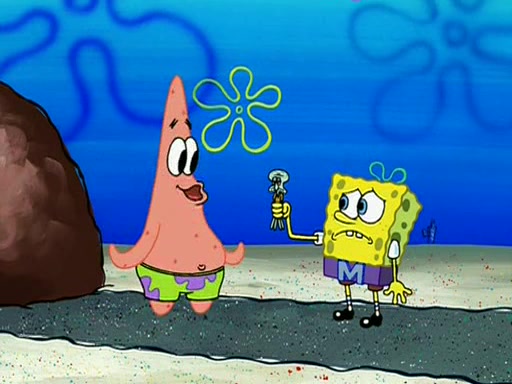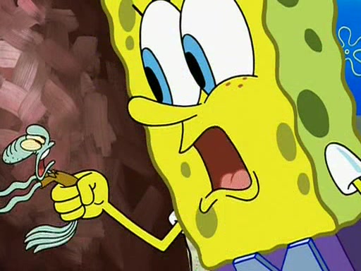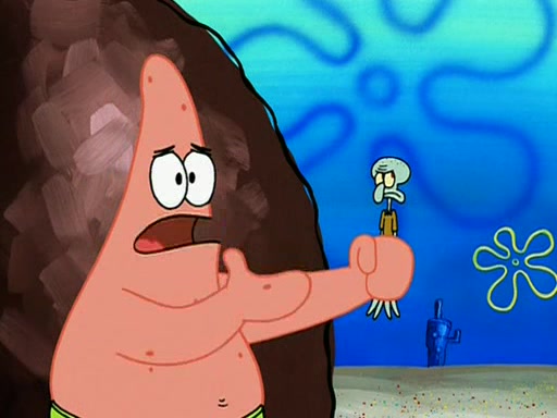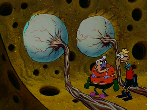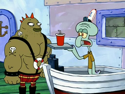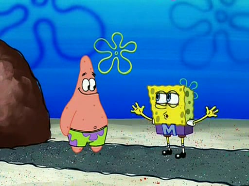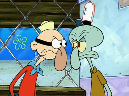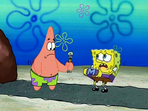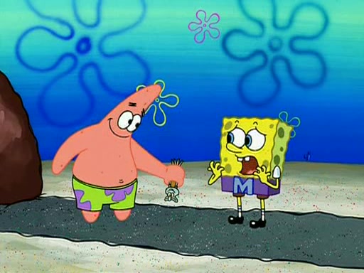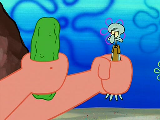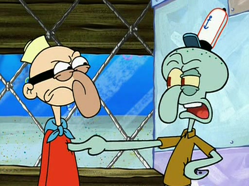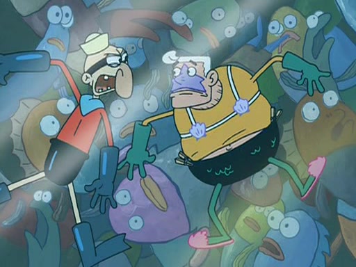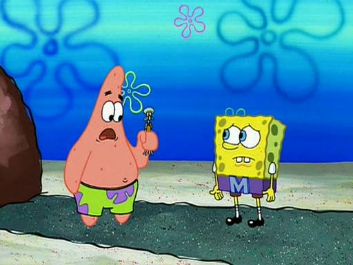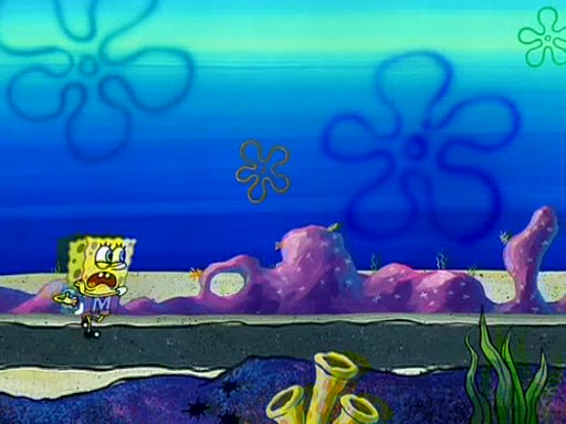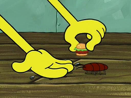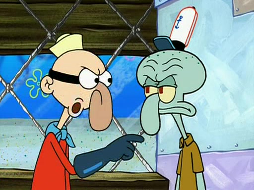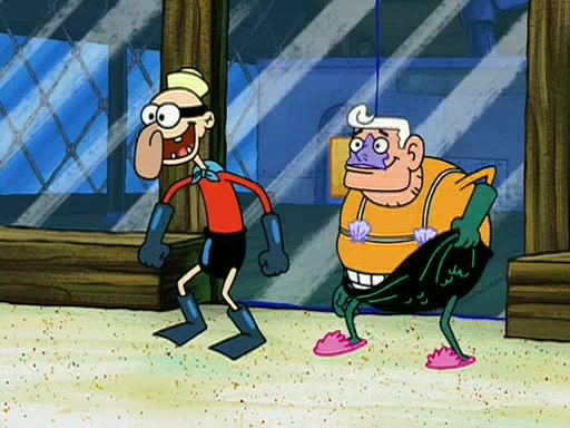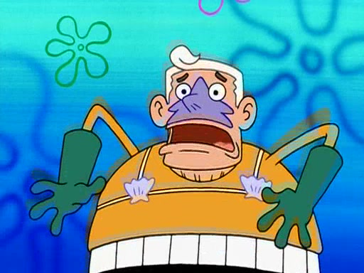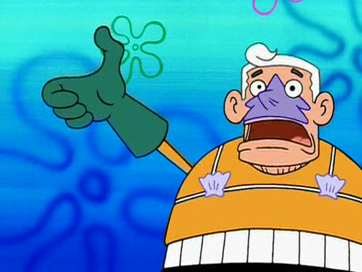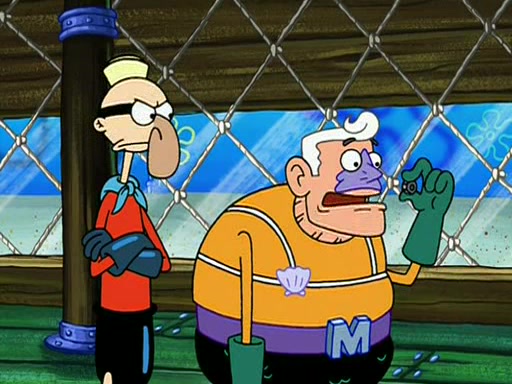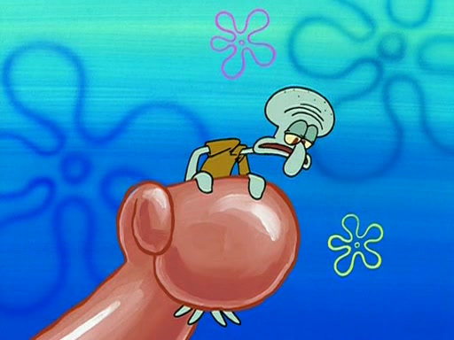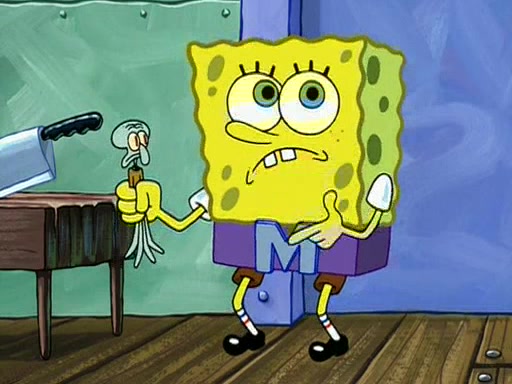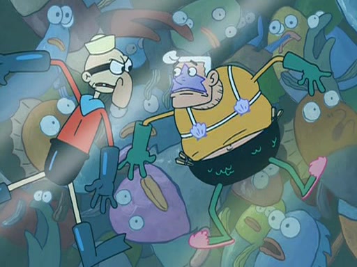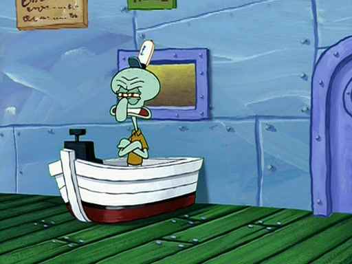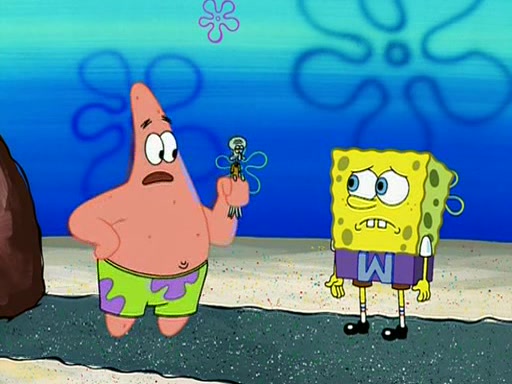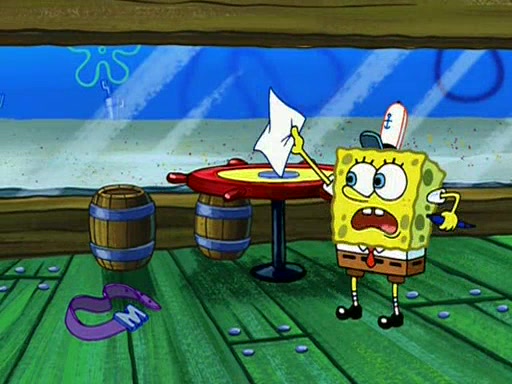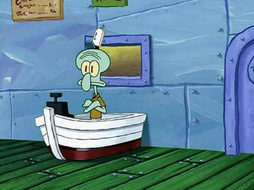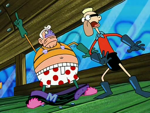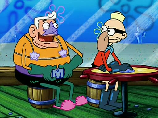 Mermaid Man & Barnacle Boy are entering the Krusty Krab, most likely for lunch, and upon realizing this, SpongeBob goes into an excited frenzy, bursting through a steel wall in order to get their autograph. The heroes run away from him, accidentally leaving Mermaid Man's utility belt inside. SpongeBob finds it, and tries to give it back, but they drive away in the Invisible Boat Mobile before he can do so. SpongeBob decides to wear the belt and play with it, thinking that he could hold on to it until after work. He discovers the "Small Ray," and starts shrinking the items in the kitchen. However, Squidward enters the room and sees SpongeBob serving tiny Krabby Patties to cockroaches and asks SpongeBob why is everything in the kitchen so tiny. Squidward discovers that SpongeBob has Mermaid Man's belt. Assuming that SpongeBob has stolen the belt, he plans to do the right thing and call Mermaid Man in order to get revenge, and tell on him. SpongeBob realizes that if Squidward tells on him, Mermaid Man will find out and he will be kicked out of his fan club for sure. In order to stop Squidward, SpongeBob shrinks him, and promises to find a way to return him to normal after Squidward demands SpongeBob to return him to normal size. He tries to use the different buttons to make Squidward big, but none of them work. Not wanting Mermaid Man to find out due to how he might react, he leaves to find someone that can help him.
