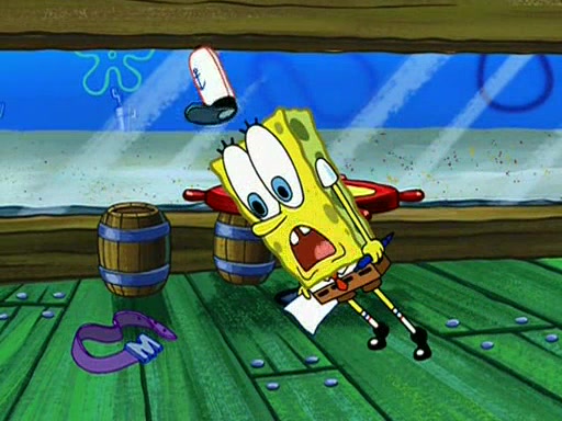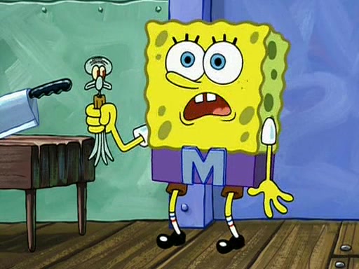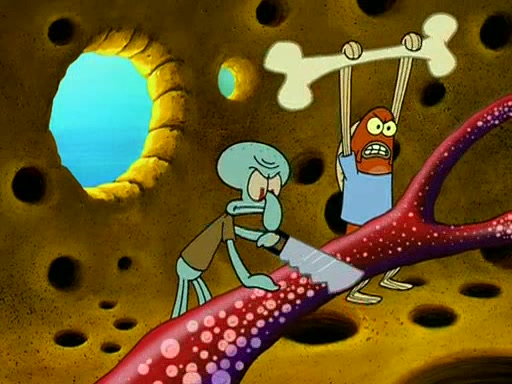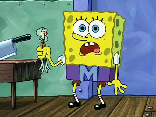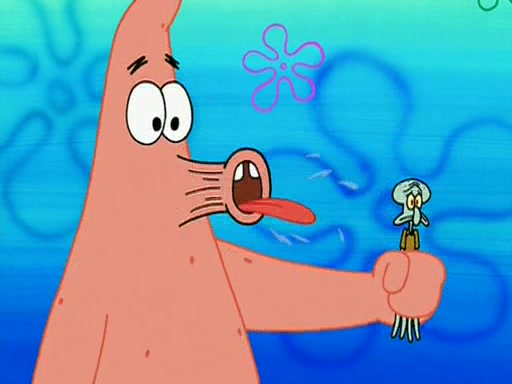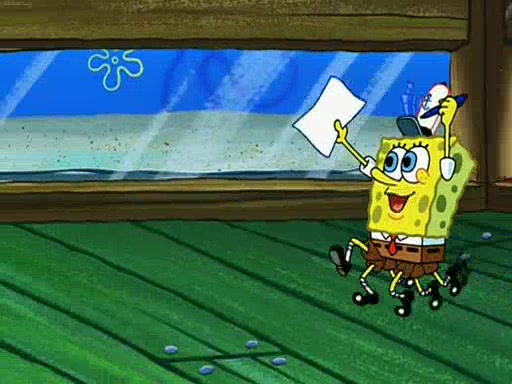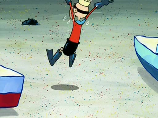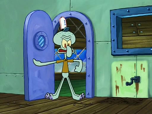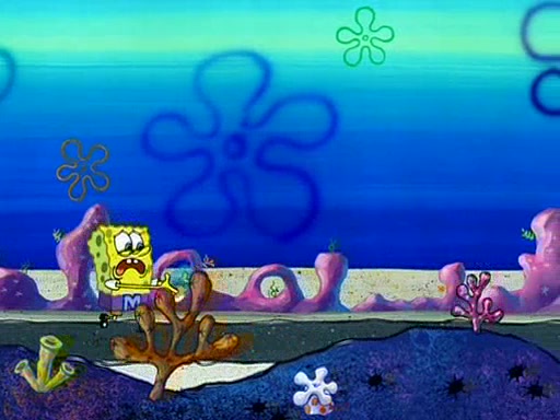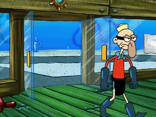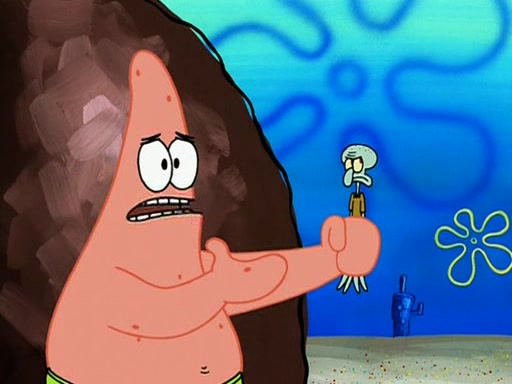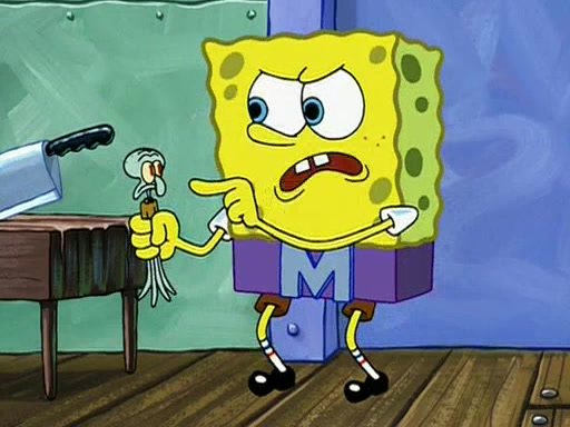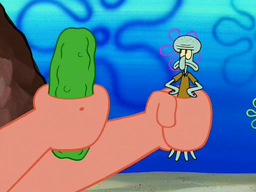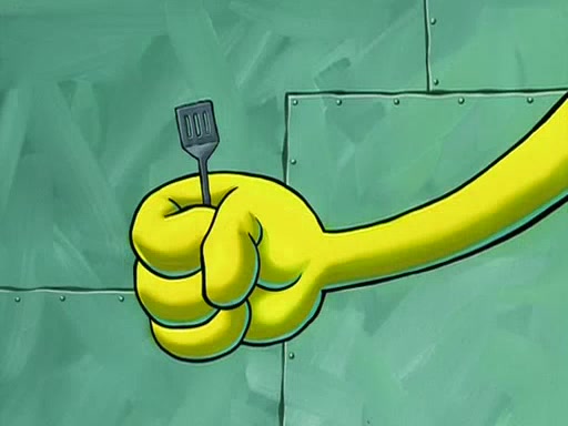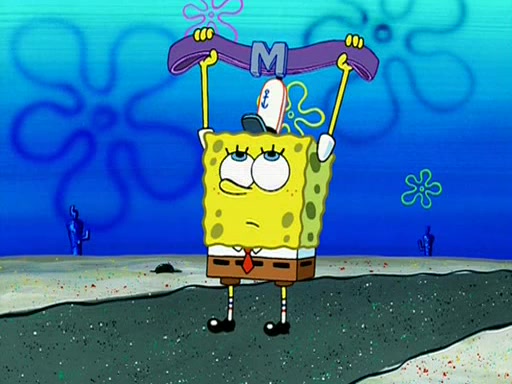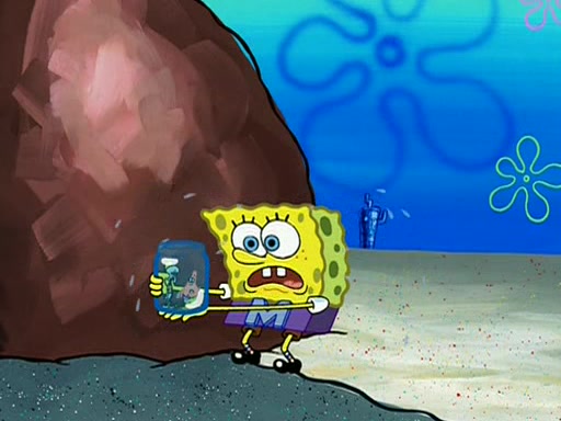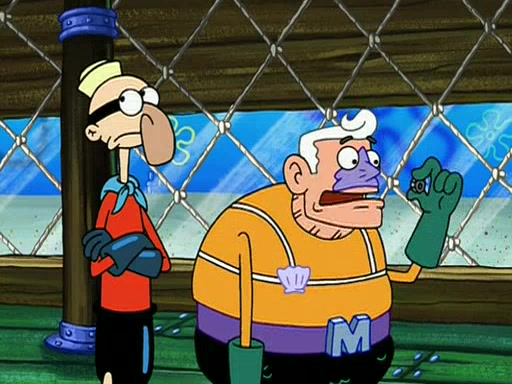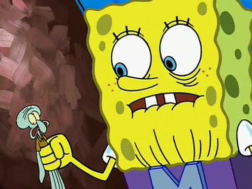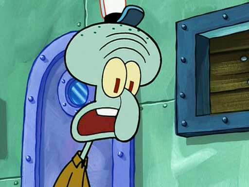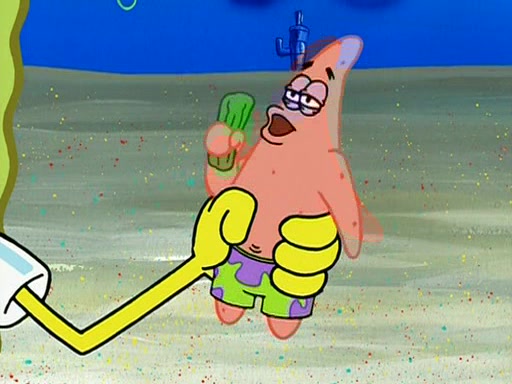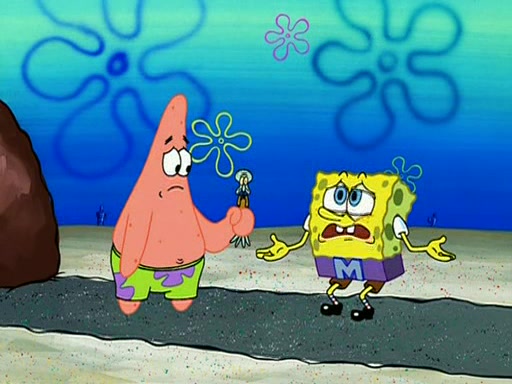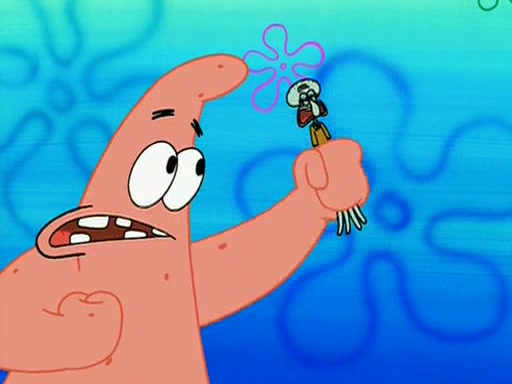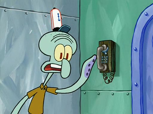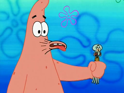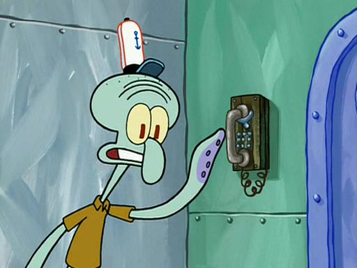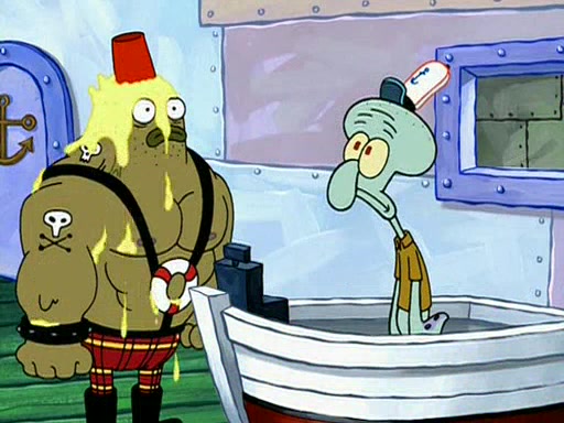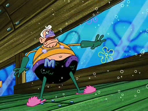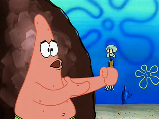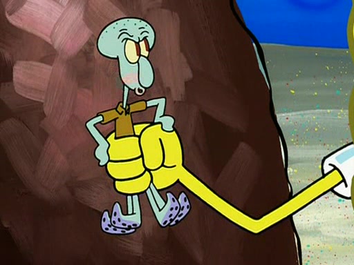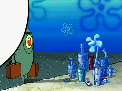 Mermaid Man & Barnacle Boy are entering the Krusty Krab, most likely for lunch, and upon realizing this, SpongeBob goes into an excited frenzy, bursting through a steel wall in order to get their autograph. The heroes run away from him, accidentally leaving Mermaid Man's utility belt inside. SpongeBob finds it, and tries to give it back, but they drive away in the Invisible Boat Mobile before he can do so. SpongeBob decides to wear the belt and play with it, thinking that he could hold on to it until after work. He discovers the "Small Ray," and starts shrinking the items in the kitchen. However, Squidward enters the room and sees SpongeBob serving tiny Krabby Patties to cockroaches and asks SpongeBob why is everything in the kitchen so tiny. Squidward discovers that SpongeBob has Mermaid Man's belt. Assuming that SpongeBob has stolen the belt, he plans to do the right thing and call Mermaid Man in order to get revenge, and tell on him. SpongeBob realizes that if Squidward tells on him, Mermaid Man will find out and he will be kicked out of his fan club for sure. In order to stop Squidward, SpongeBob shrinks him, and promises to find a way to return him to normal after Squidward demands SpongeBob to return him to normal size. He tries to use the different buttons to make Squidward big, but none of them work. Not wanting Mermaid Man to find out due to how he might react, he leaves to find someone that can help him.