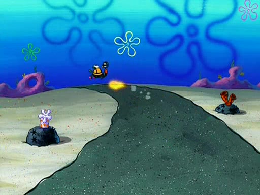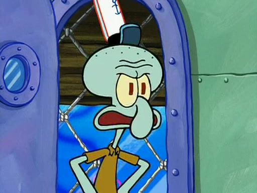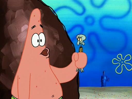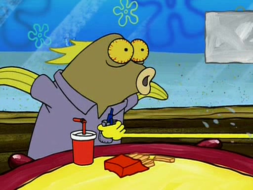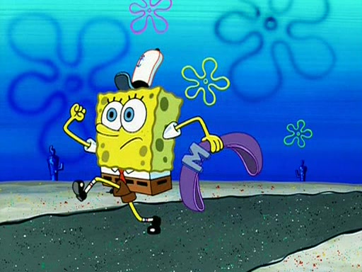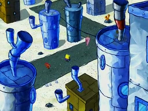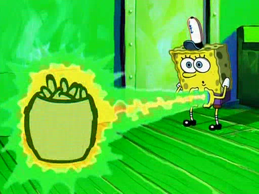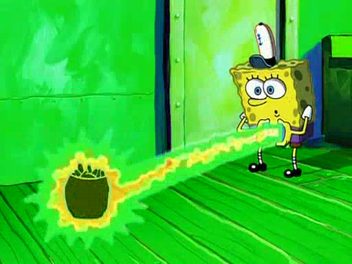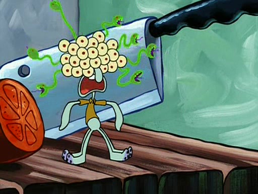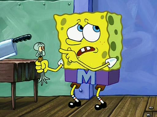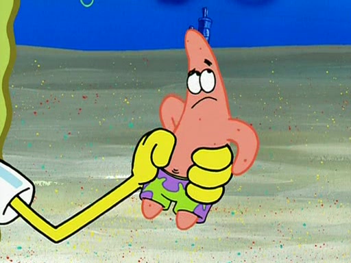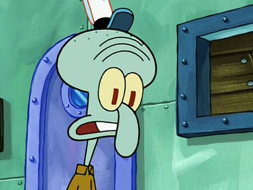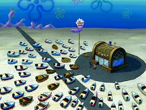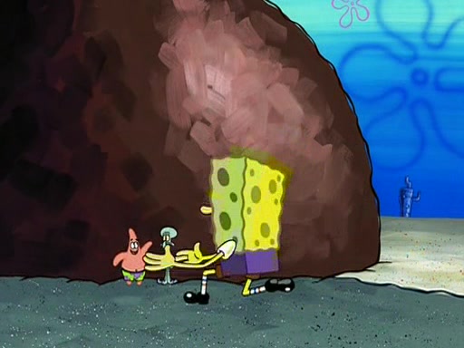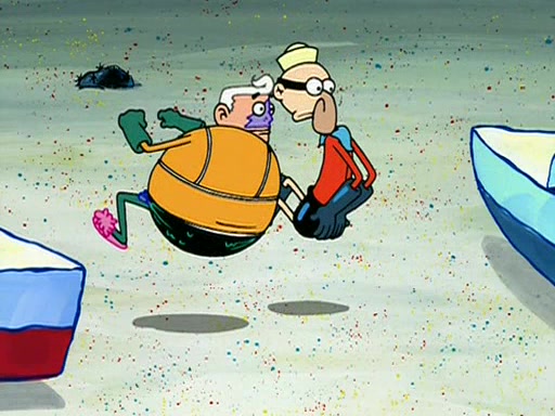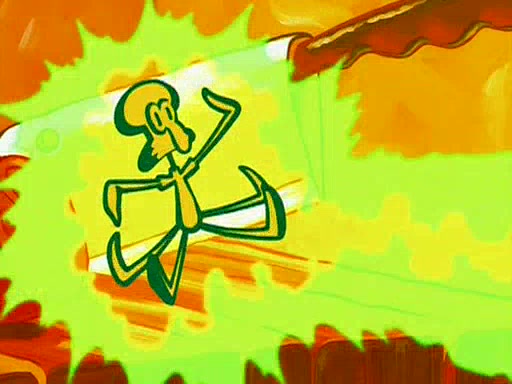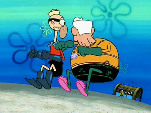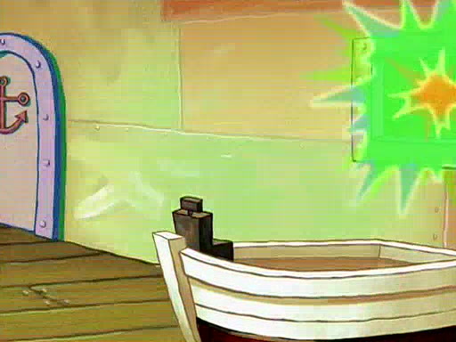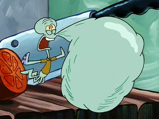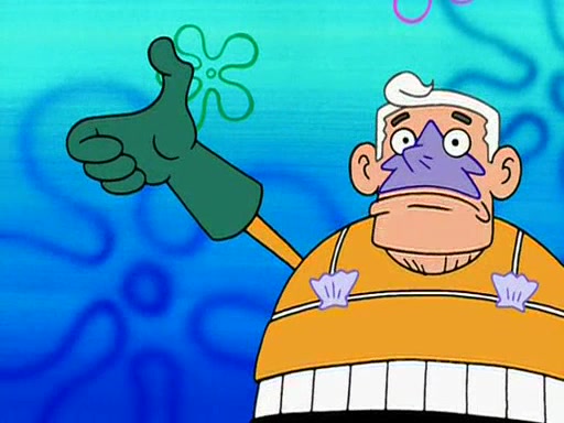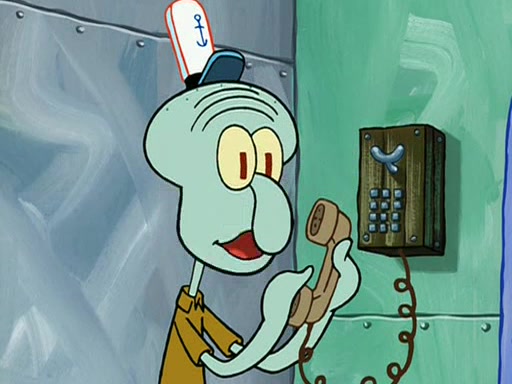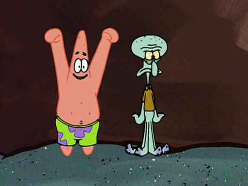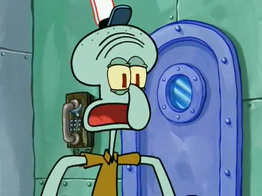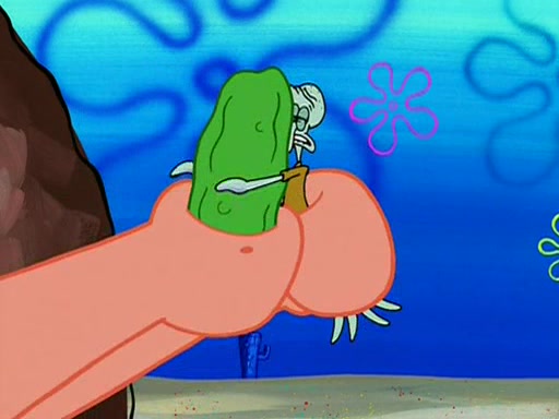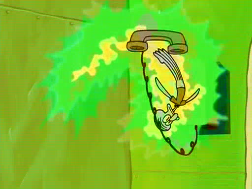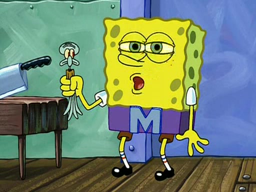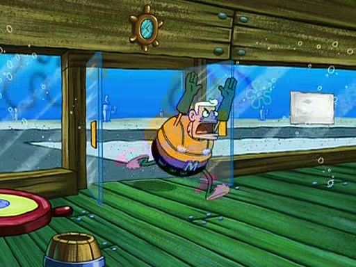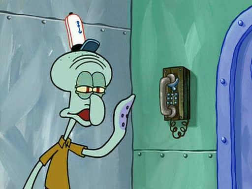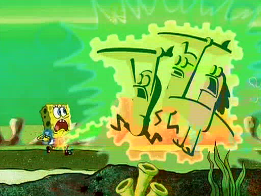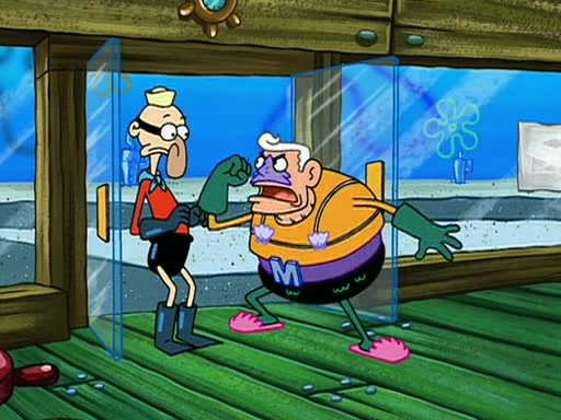 Mermaid Man & Barnacle Boy are entering the Krusty Krab, most likely for lunch, and upon realizing this, SpongeBob goes into an excited frenzy, bursting through a steel wall in order to get their autograph. The heroes run away from him, accidentally leaving Mermaid Man's utility belt inside. SpongeBob finds it, and tries to give it back, but they drive away in the Invisible Boat Mobile before he can do so. SpongeBob decides to wear the belt and play with it, thinking that he could hold on to it until after work. He discovers the "Small Ray," and starts shrinking the items in the kitchen. However, Squidward enters the room and sees SpongeBob serving tiny Krabby Patties to cockroaches and asks SpongeBob why is everything in the kitchen so tiny. Squidward discovers that SpongeBob has Mermaid Man's belt. Assuming that SpongeBob has stolen the belt, he plans to do the right thing and call Mermaid Man in order to get revenge, and tell on him. SpongeBob realizes that if Squidward tells on him, Mermaid Man will find out and he will be kicked out of his fan club for sure. In order to stop Squidward, SpongeBob shrinks him, and promises to find a way to return him to normal after Squidward demands SpongeBob to return him to normal size. He tries to use the different buttons to make Squidward big, but none of them work. Not wanting Mermaid Man to find out due to how he might react, he leaves to find someone that can help him.
