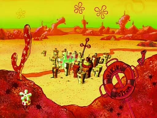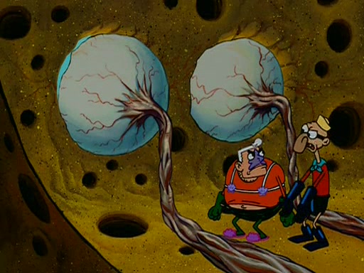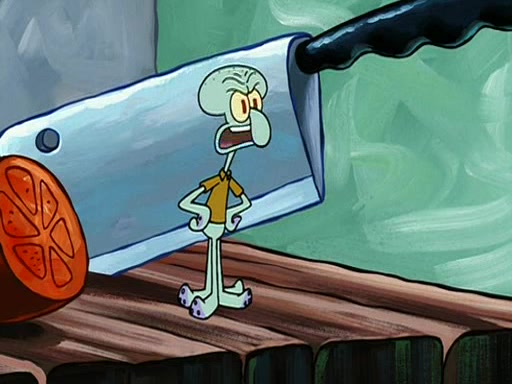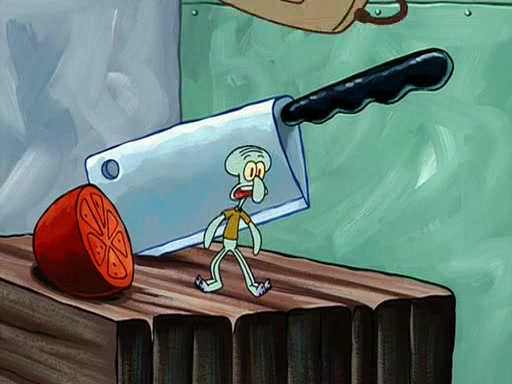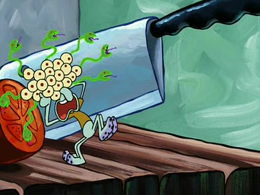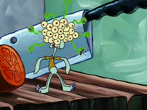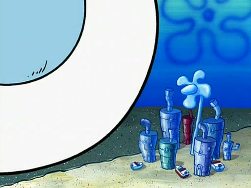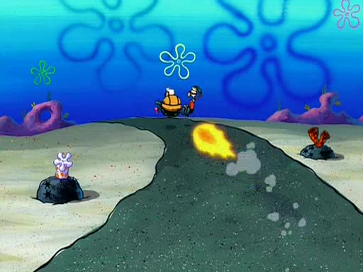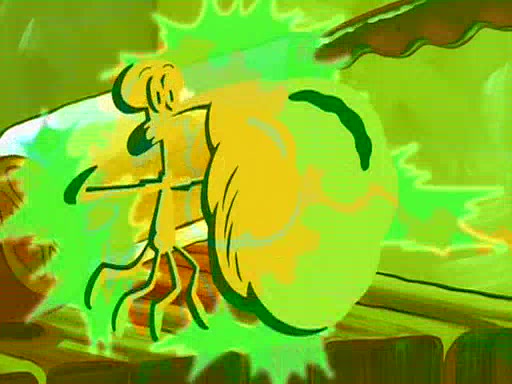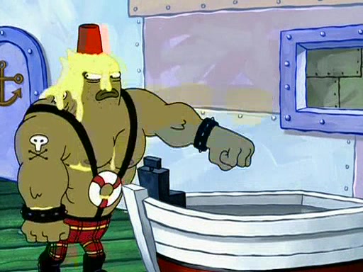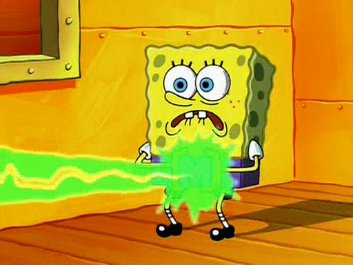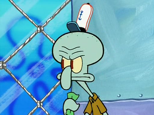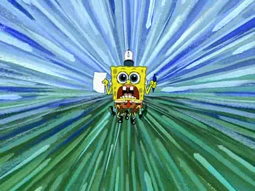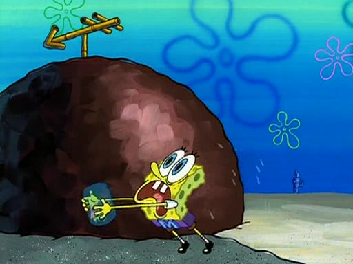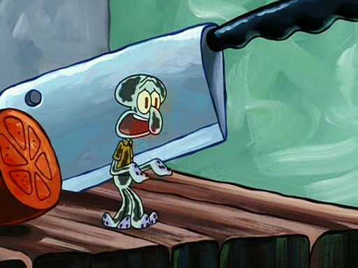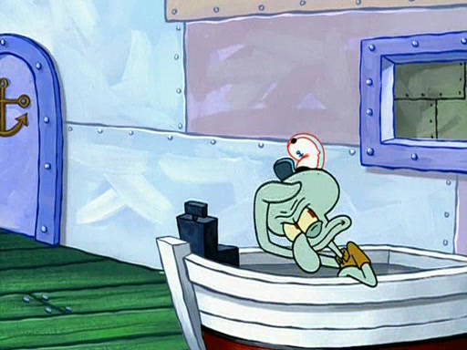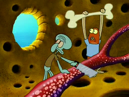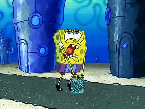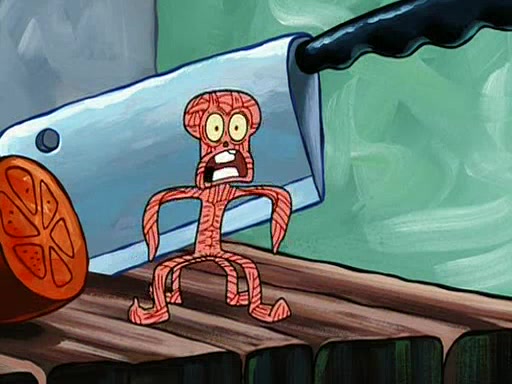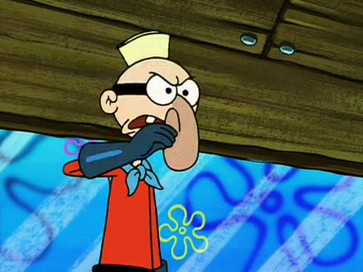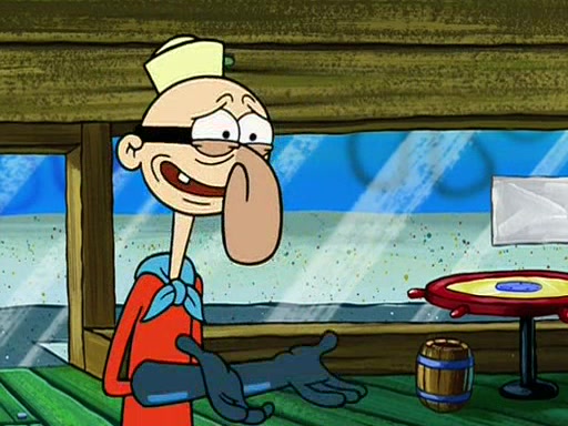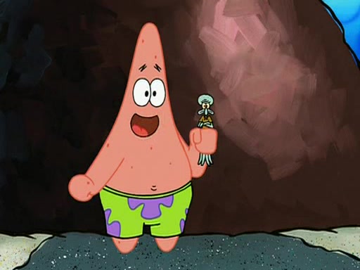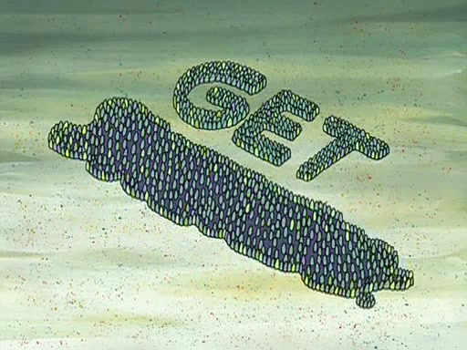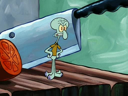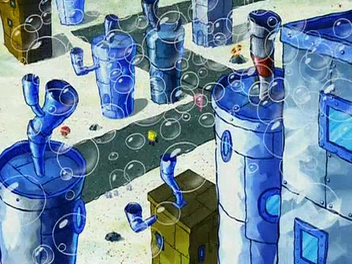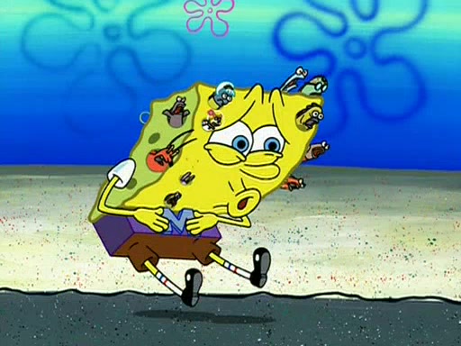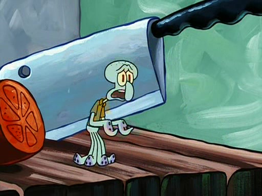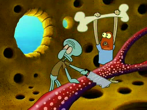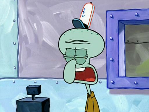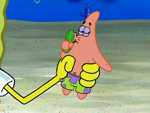 Mermaid Man & Barnacle Boy are entering the Krusty Krab, most likely for lunch, and upon realizing this, SpongeBob goes into an excited frenzy, bursting through a steel wall in order to get their autograph. The heroes run away from him, accidentally leaving Mermaid Man's utility belt inside. SpongeBob finds it, and tries to give it back, but they drive away in the Invisible Boat Mobile before he can do so. SpongeBob decides to wear the belt and play with it, thinking that he could hold on to it until after work. He discovers the "Small Ray," and starts shrinking the items in the kitchen. However, Squidward enters the room and sees SpongeBob serving tiny Krabby Patties to cockroaches and asks SpongeBob why is everything in the kitchen so tiny. Squidward discovers that SpongeBob has Mermaid Man's belt. Assuming that SpongeBob has stolen the belt, he plans to do the right thing and call Mermaid Man in order to get revenge, and tell on him. SpongeBob realizes that if Squidward tells on him, Mermaid Man will find out and he will be kicked out of his fan club for sure. In order to stop Squidward, SpongeBob shrinks him, and promises to find a way to return him to normal after Squidward demands SpongeBob to return him to normal size. He tries to use the different buttons to make Squidward big, but none of them work. Not wanting Mermaid Man to find out due to how he might react, he leaves to find someone that can help him.