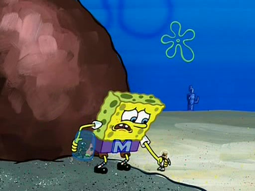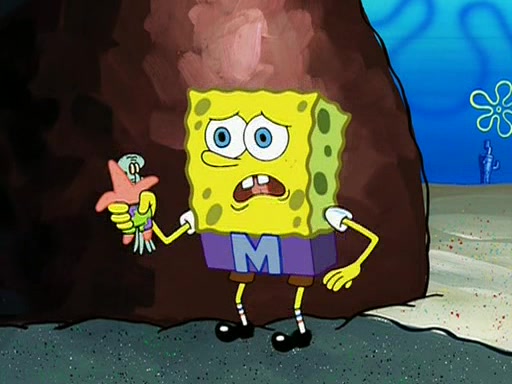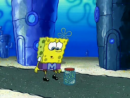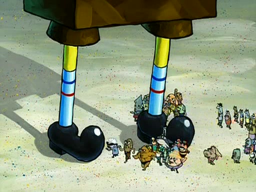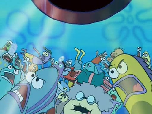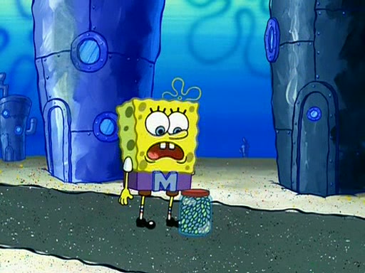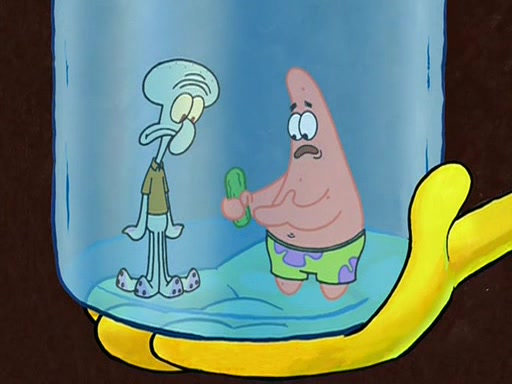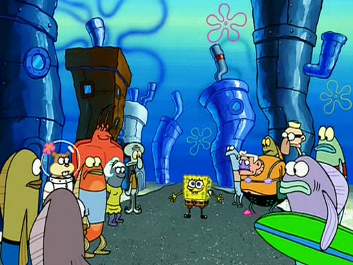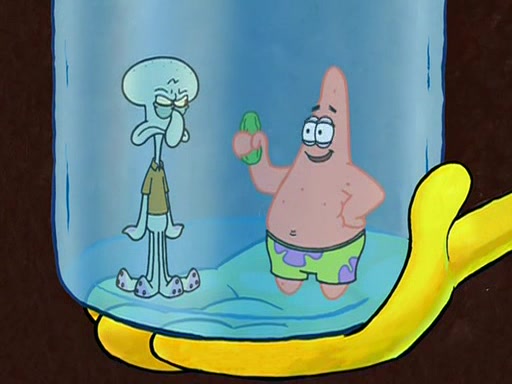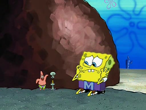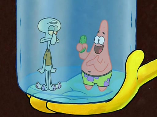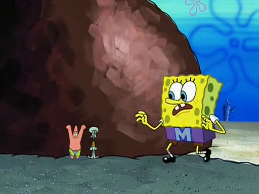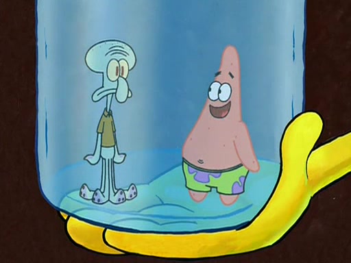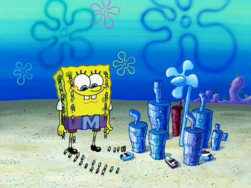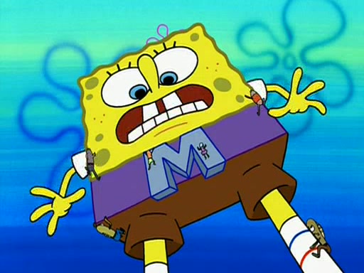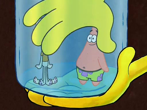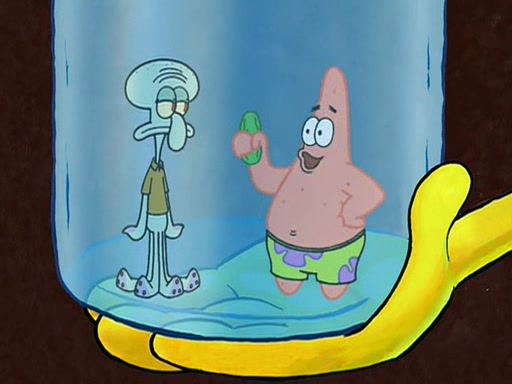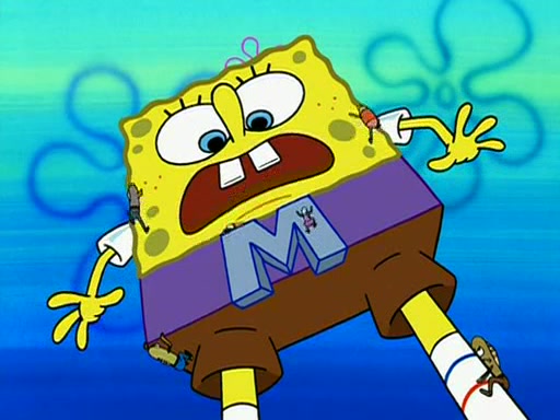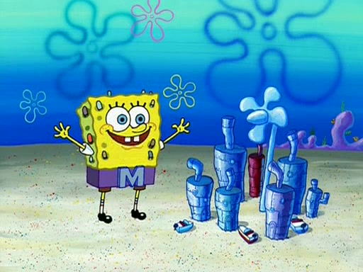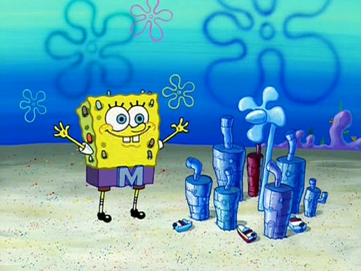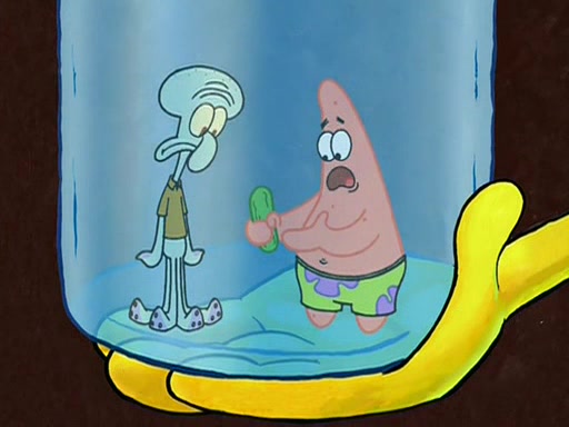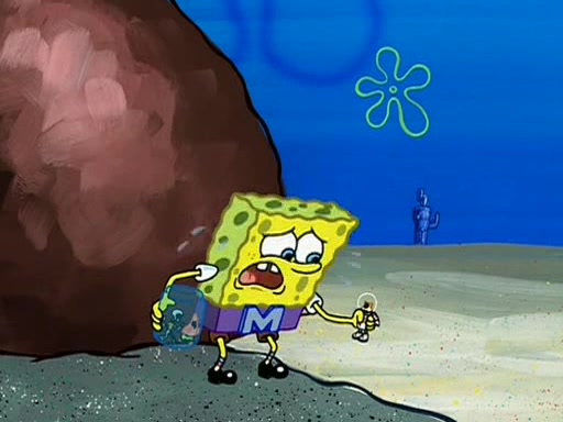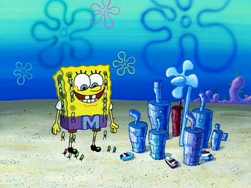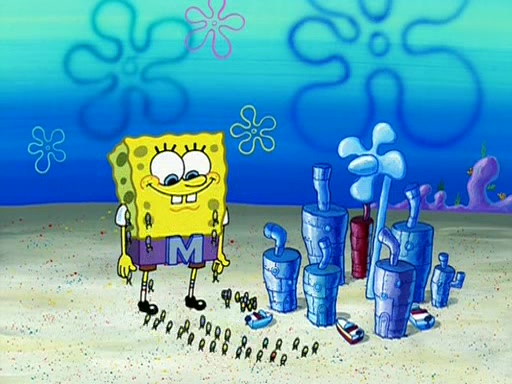 SpongeBob goes to Patrick for help, and Patrick mistakes Squidward for a "Squidward Action Figure" and starts playing with him, even after realizing that it is the real Squidward. Patrick then suggests to turn the "M" upside down, setting the belt to W for "Wumbo." SpongeBob questions the validity of this, but after Patrick responds by stating the many uses of "Wumbo," SpongeBob is convinced and tests it out, but then accidentally shrinks Patrick. Seconds later, citizens start coming and greeting to SpongeBob, making him shrink them so that they can't tell Mermaid Man. Eventually, SpongeBob has shrunken everyone (including his mother) in Bikini Bottom, and stuffs them into a jar. He then realizes that he has shrunken Mermaid Man and Barnacle Boy as well, and he asks them how to "unshrink" objects. Mermaid Man asks him if he has tried setting it to Wumbo, and upon realizing that he does not know how to unshrink them either, the people except for Mermaid Man and Barnacle Boy form a mob and get out of the jar. They go inside of SpongeBob's body and beat him up. This continues for a while until eventually everyone says that everything is too big. This gives SpongeBob the idea to shrink Bikini Bottom itself, which satisfies the people, who see no discernible difference from their previous lives in living in a miniature Bikini Bottom. Finally, SpongeBob shrinks himself, and the tiny city begins celebrating. The closing scene shows Plankton getting off a bus, returning to Bikini Bottom from a vacation. He is surprised to see that he is now taller than Bikini Bottom.