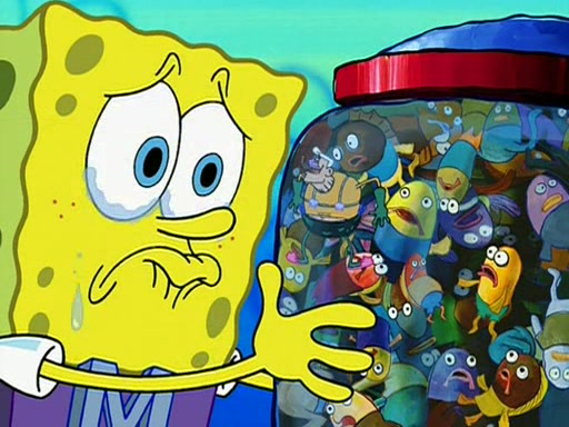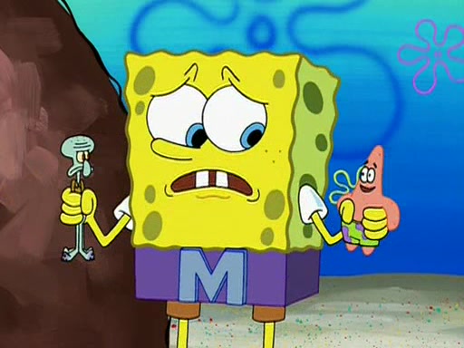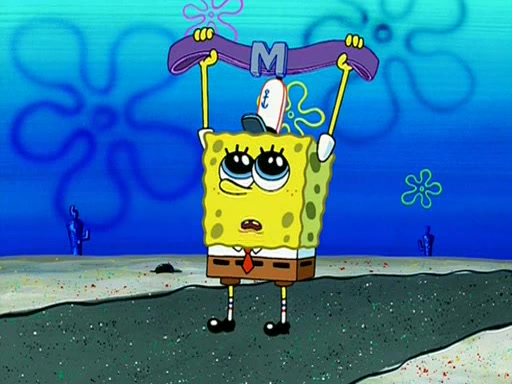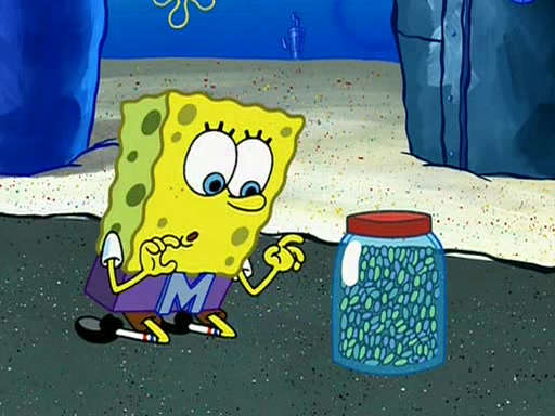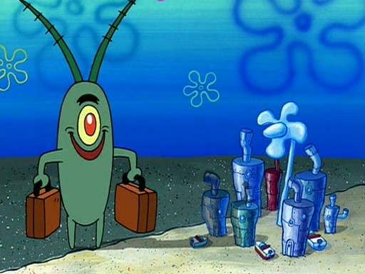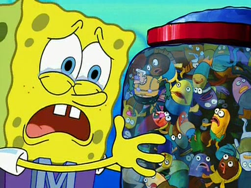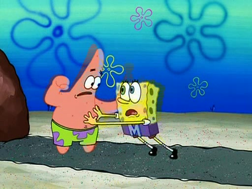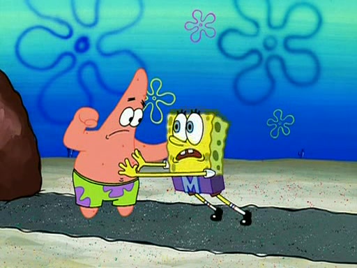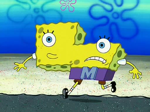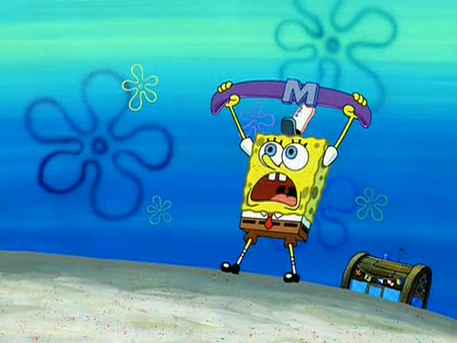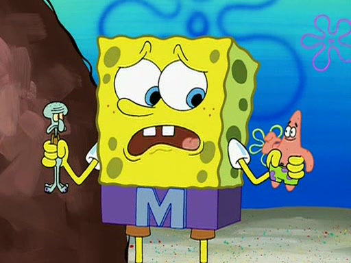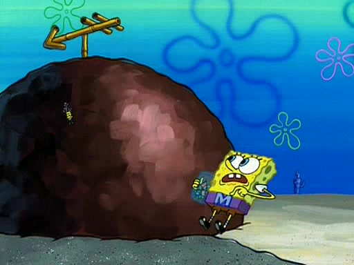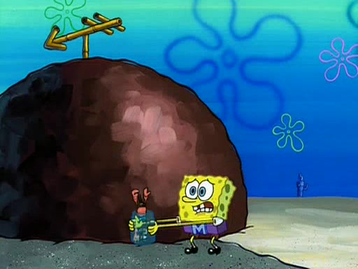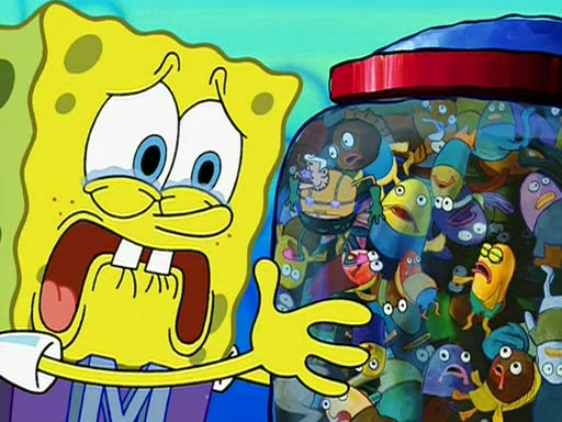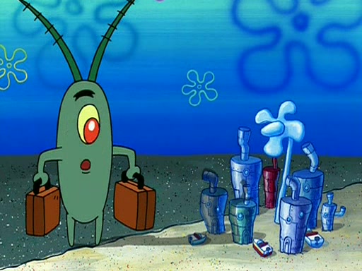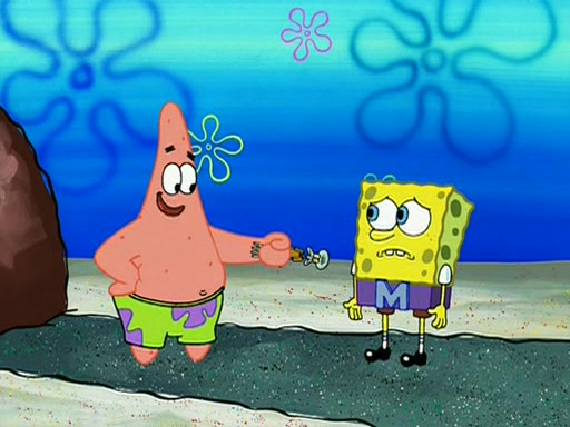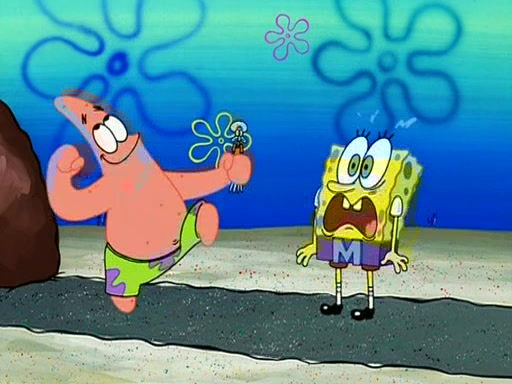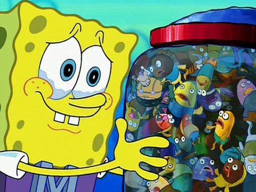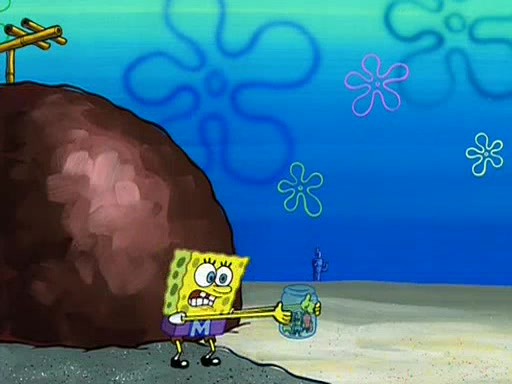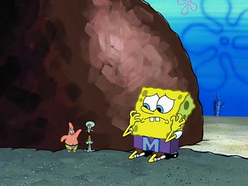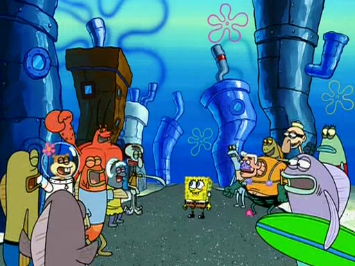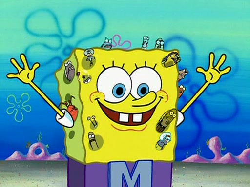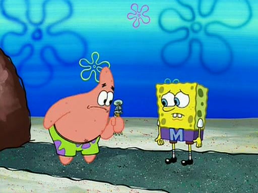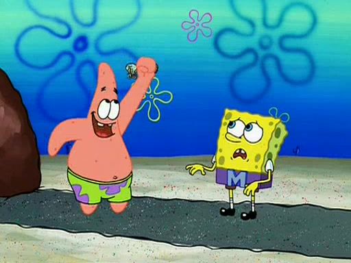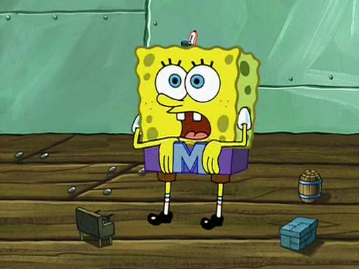SpongeBob goes to Patrick for help, and Patrick mistakes Squidward for a "Squidward Action Figure" and starts playing with him, even after realizing that it is the real Squidward. Patrick then suggests to turn the "M" upside down, setting the belt to W for "Wumbo." SpongeBob questions the validity of this, but after Patrick responds by stating the many uses of "Wumbo," SpongeBob is convinced and tests it out, but then accidentally shrinks Patrick. Seconds later, citizens start coming and greeting to SpongeBob, making him shrink them so that they can't tell Mermaid Man. Eventually, SpongeBob has shrunken everyone (including his mother) in Bikini Bottom, and stuffs them into a jar. He then realizes that he has shrunken Mermaid Man and Barnacle Boy as well, and he asks them how to "unshrink" objects. Mermaid Man asks him if he has tried setting it to Wumbo, and upon realizing that he does not know how to unshrink them either, the people except for Mermaid Man and Barnacle Boy form a mob and get out of the jar. They go inside of SpongeBob's body and beat him up. This continues for a while until eventually everyone says that everything is too big. This gives SpongeBob the idea to shrink Bikini Bottom itself, which satisfies the people, who see no discernible difference from their previous lives in living in a miniature Bikini Bottom. Finally, SpongeBob shrinks himself, and the tiny city begins celebrating. The closing scene shows Plankton getting off a bus, returning to Bikini Bottom from a vacation. He is surprised to see that he is now taller than Bikini Bottom.