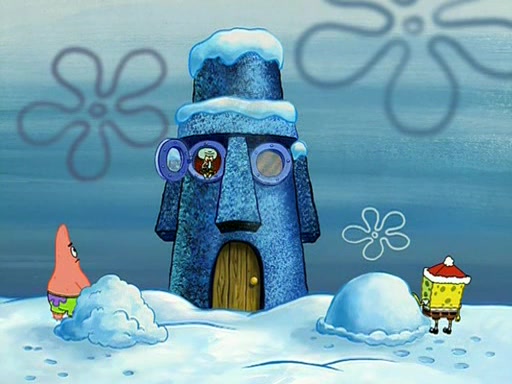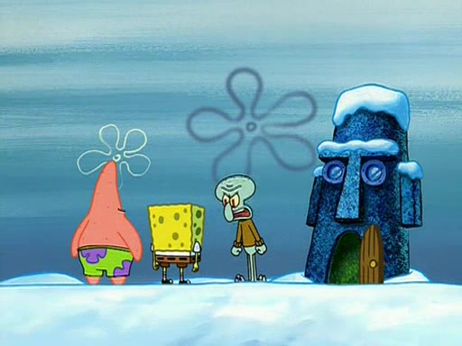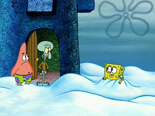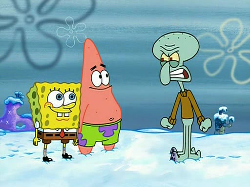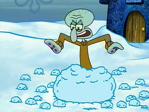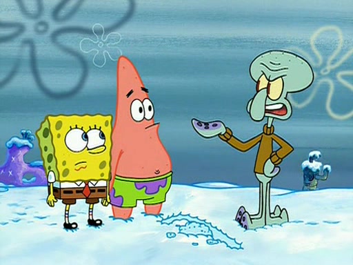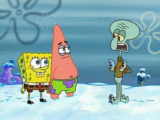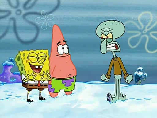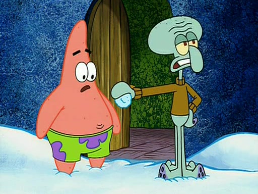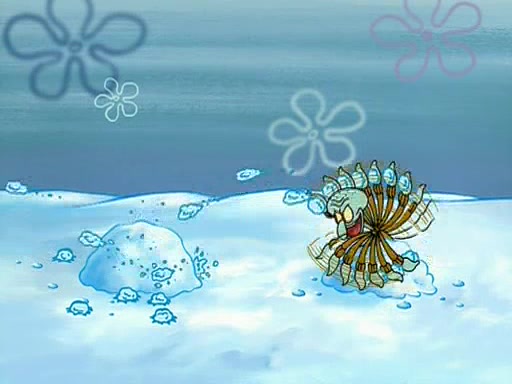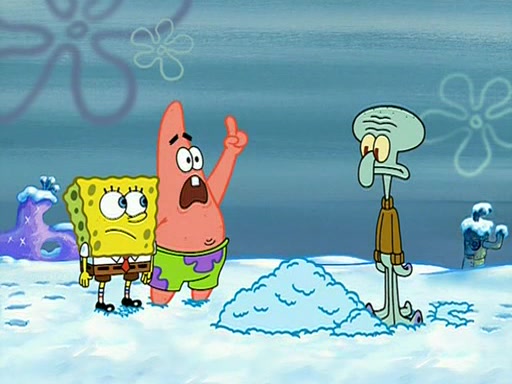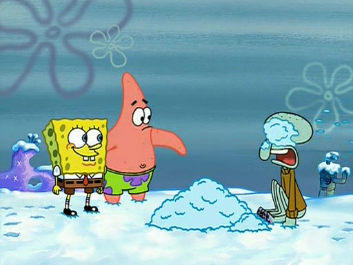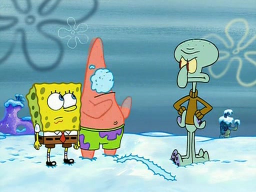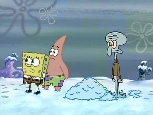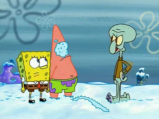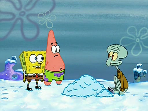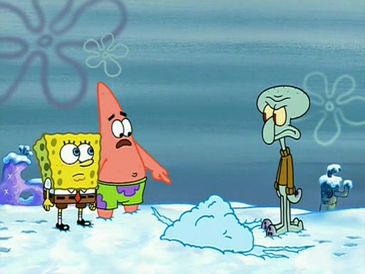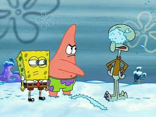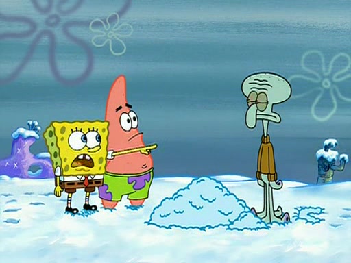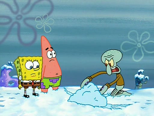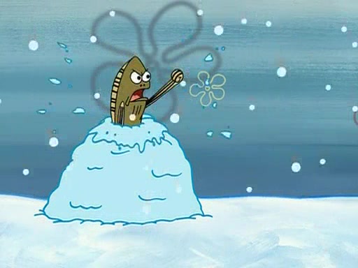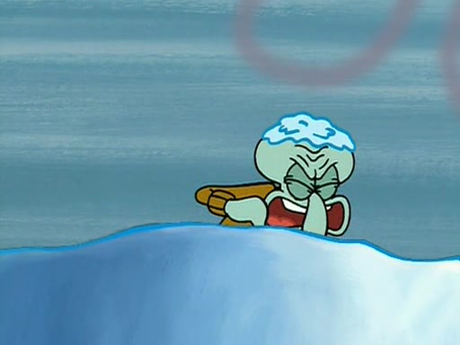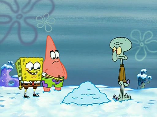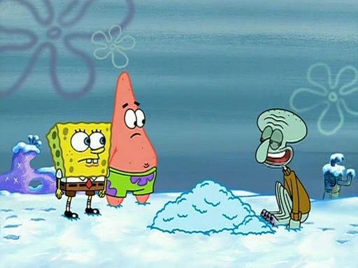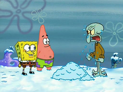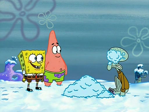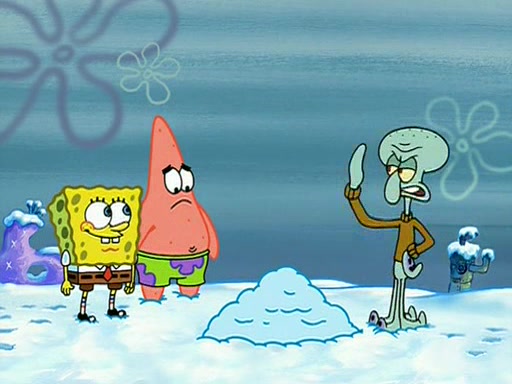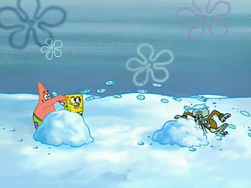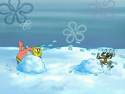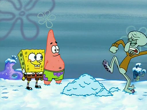 An iceberg travels across the surface of the ocean and stops over Bikini Bottom, causing it to snow underwater. Everyone is having fun in the snow, and SpongeBob and Patrick decide to have a snowball fight. Meanwhile, Squidward is relaxing at home with a cup of tea. He hears the sounds of SpongeBob and Patrick's fighting and tells them to quiet down. They try to convince him to come out and play with them, both trying to get him on their own side, but Squidward shoots both of them down.