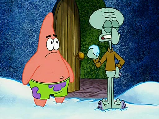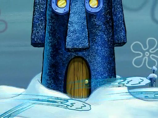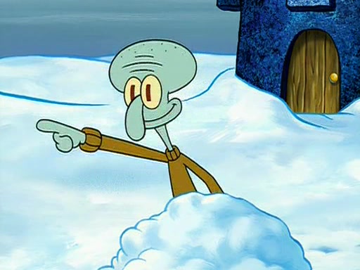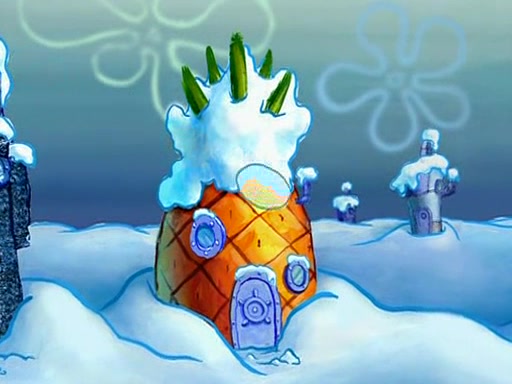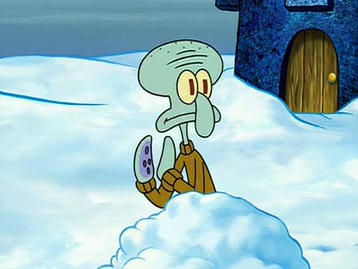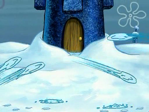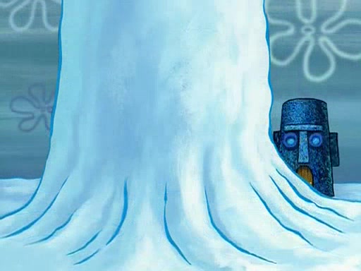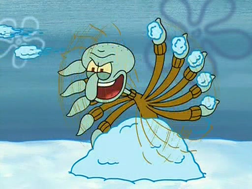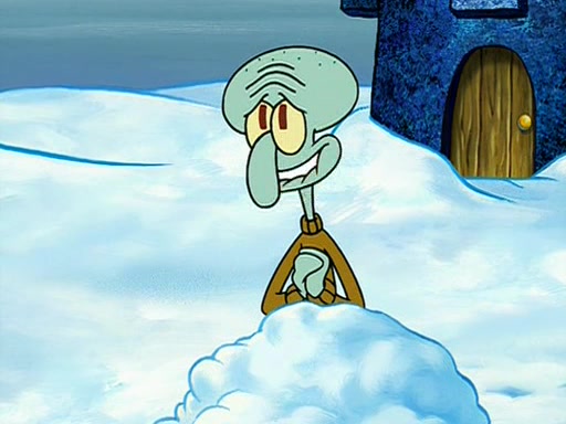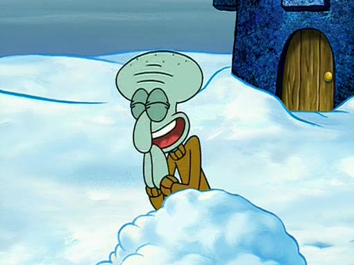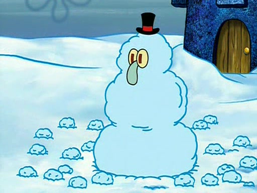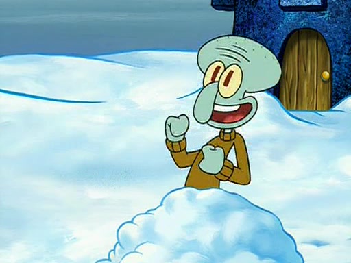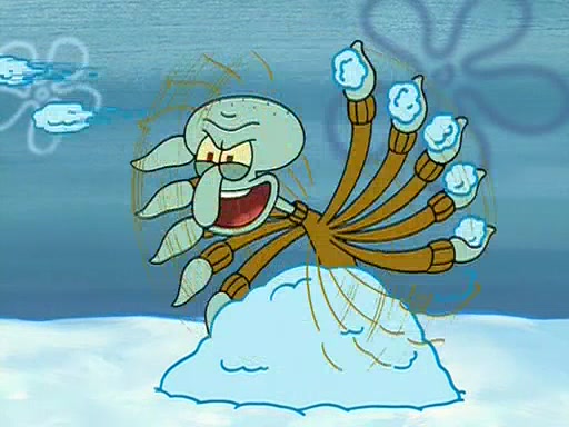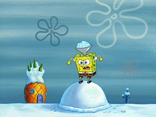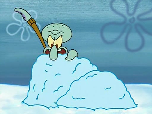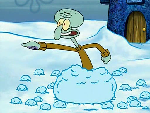 When Squidward notices that the snowballs have "stop falling", Squidward becomes paranoid and riled-up and decides to make his fort bigger and eventually builds it to the size of a tower. Squidward continues to throw snowballs as an overhead tree branch keeps dropping snow on his head that he believes are snowballs being thrown by SpongeBob and Patrick. Meanwhile, SpongeBob and Patrick relax in the pineapple watching TV with hot chocolate and popcorn.