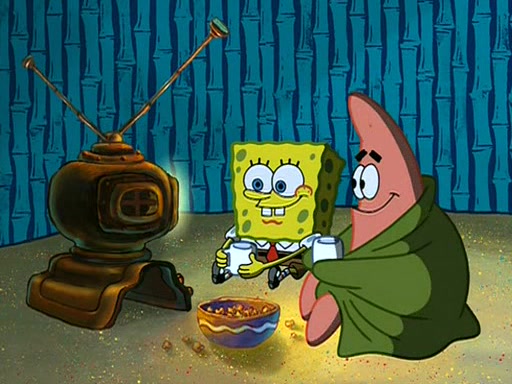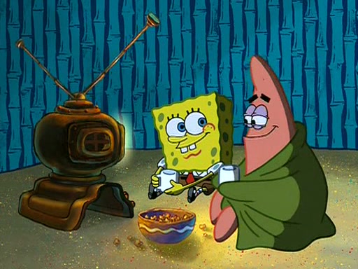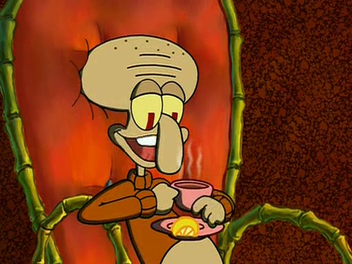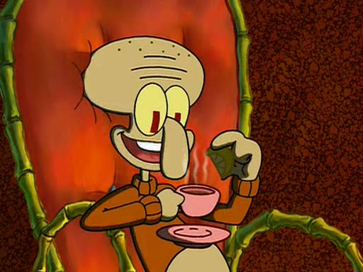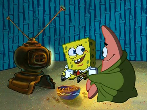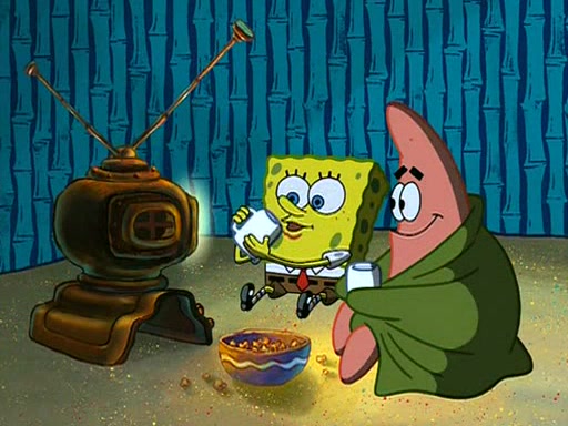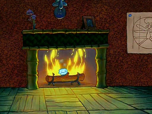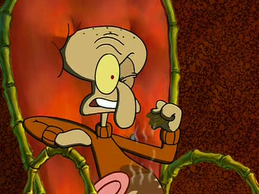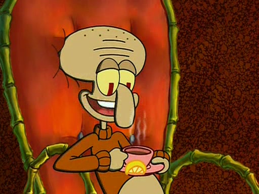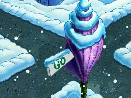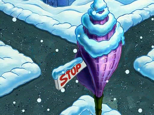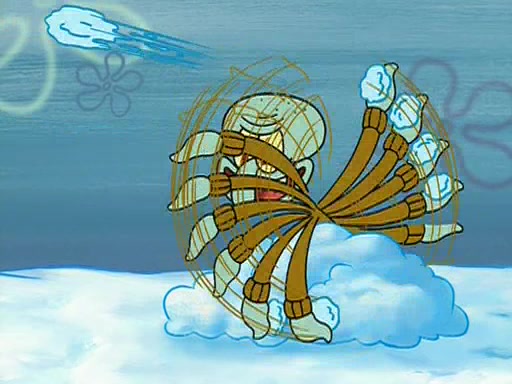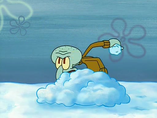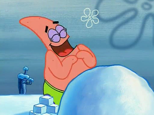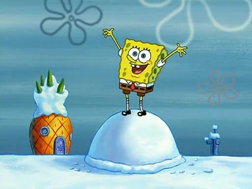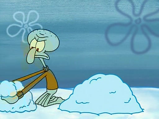 When Squidward notices that the snowballs have "stop falling", Squidward becomes paranoid and riled-up and decides to make his fort bigger and eventually builds it to the size of a tower. Squidward continues to throw snowballs as an overhead tree branch keeps dropping snow on his head that he believes are snowballs being thrown by SpongeBob and Patrick. Meanwhile, SpongeBob and Patrick relax in the pineapple watching TV with hot chocolate and popcorn.