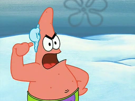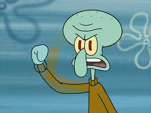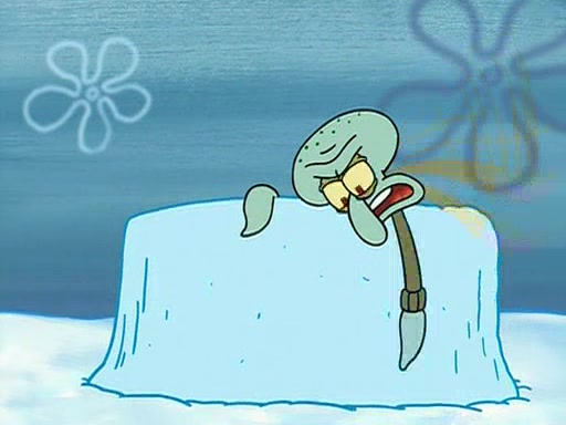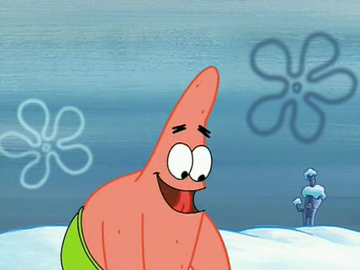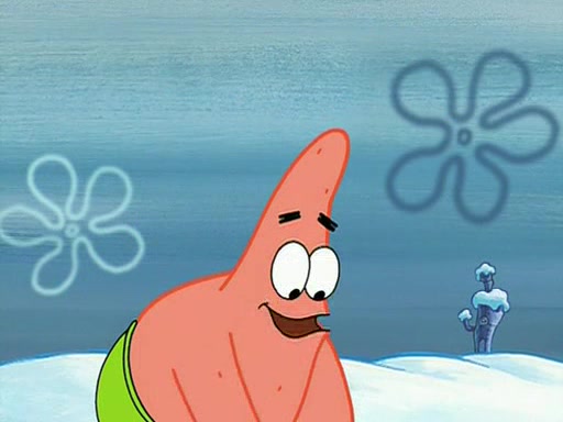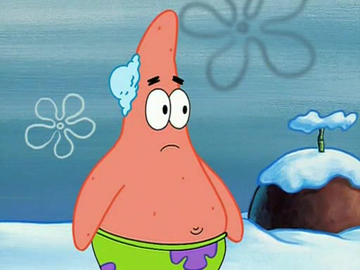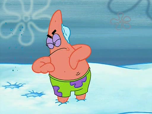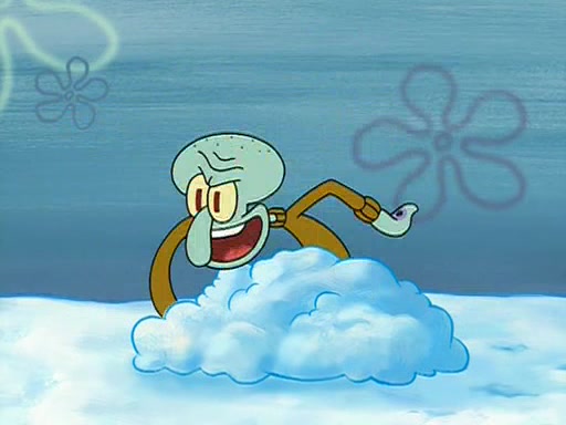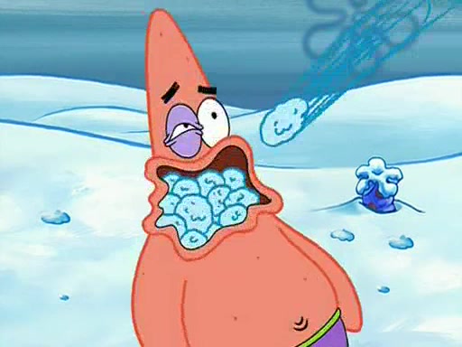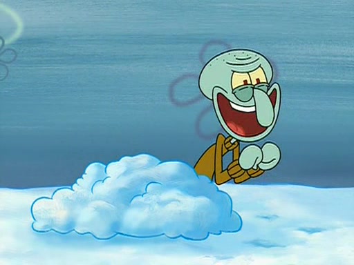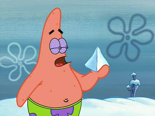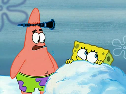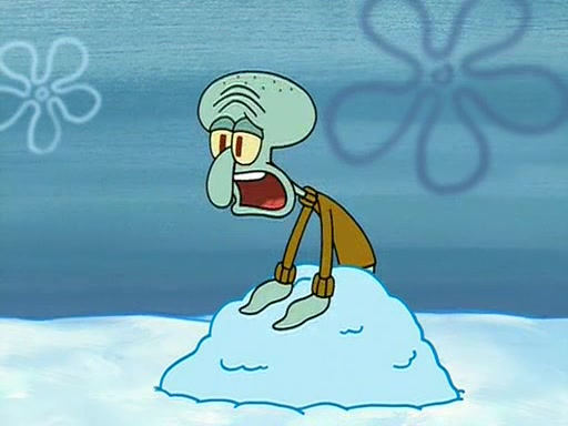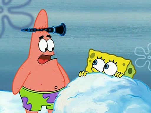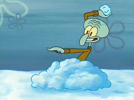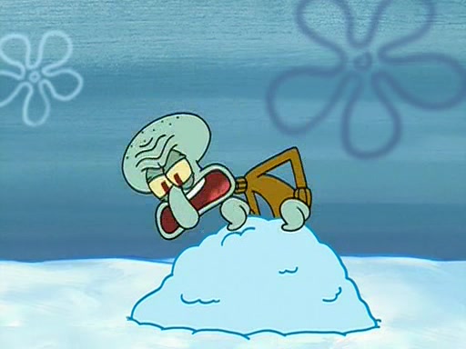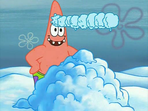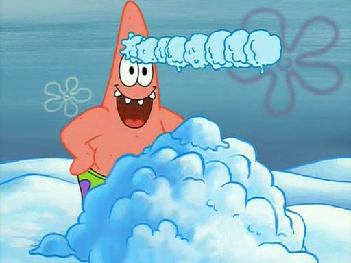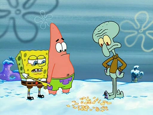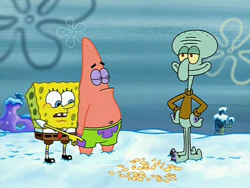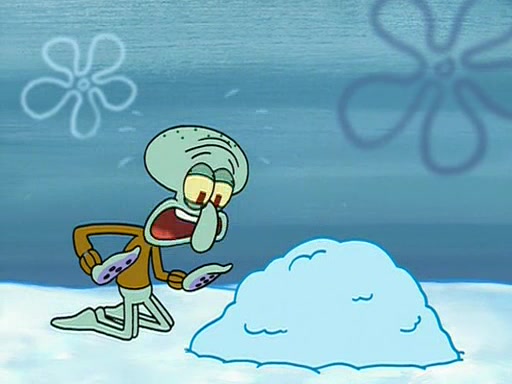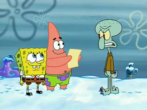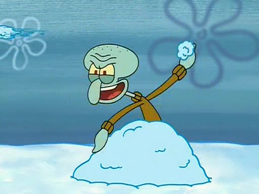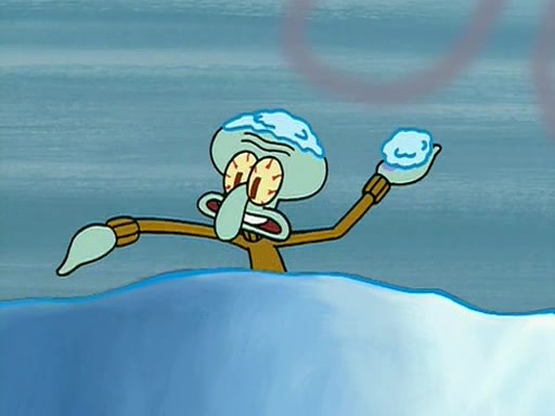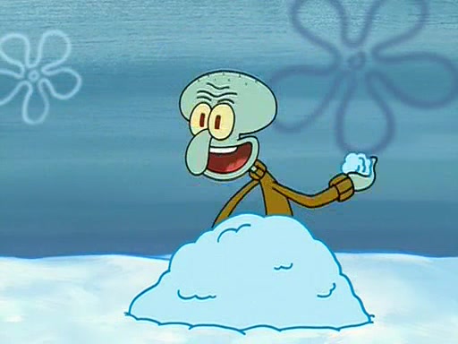 Squidward decides that, as entertainment, he will watch them fight, hoping they will get hurt. SpongeBob and Patrick realize that snowball fights are for children, and they sign a peace treaty. Squidward tries to convince them to continue, but repeatedly gets hit with a snowball by Patrick. He then decides to throw a snowball and misses. SpongeBob and Patrick then proceed to duck behind their fort and mercilessly begin to pelt Squidward with snowballs. A frustrated Squidward then proceeds to throw a snowball and hits SpongeBob right in the face. He then becomes exhilarated and begins relentlessly pelting SpongeBob and Patrick with snowballs. After being hit by a snowball containing his clarinet, SpongeBob and Patrick decide that Squidward is taking the snowball fight far too seriously and sneak off.