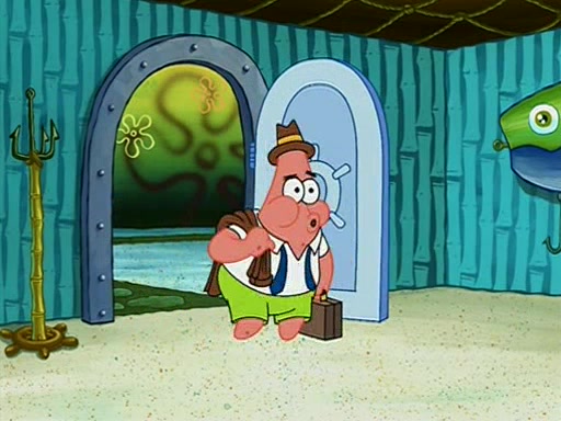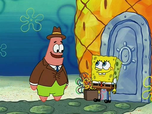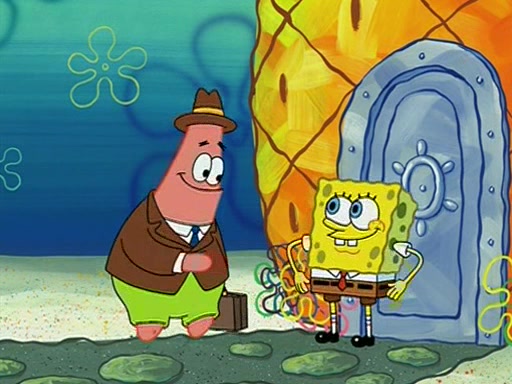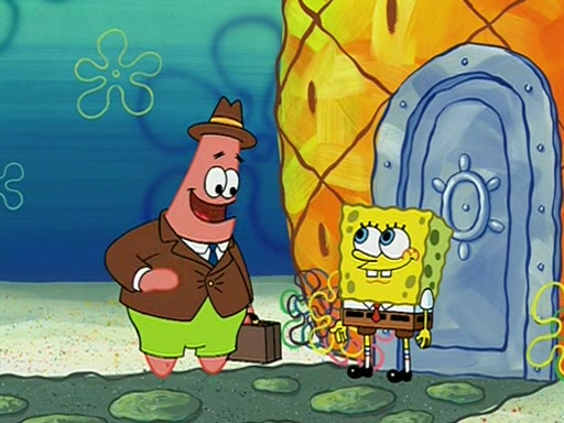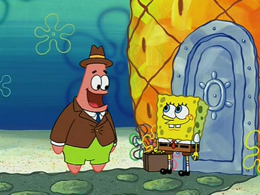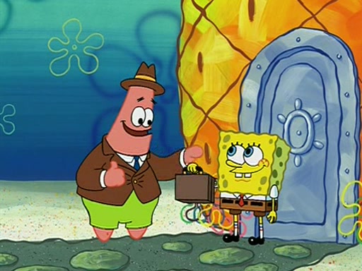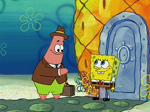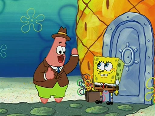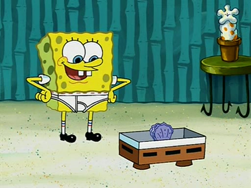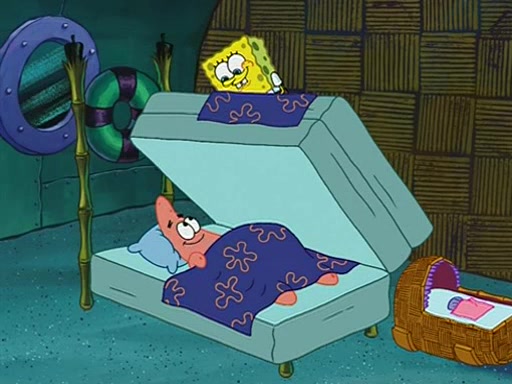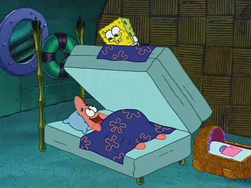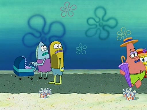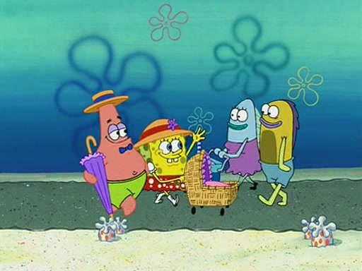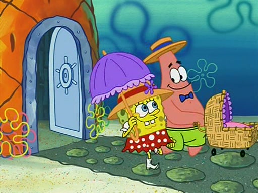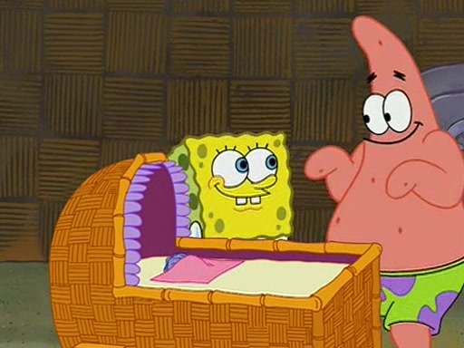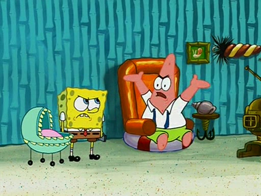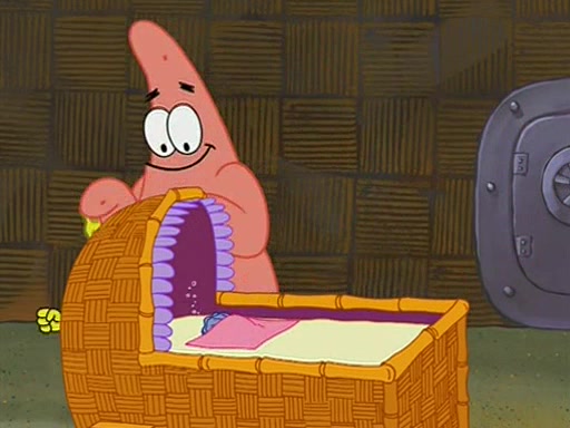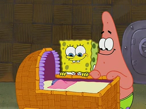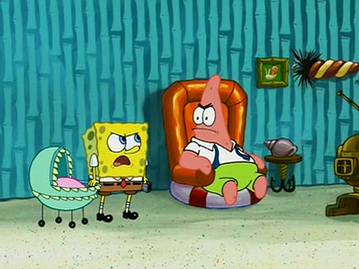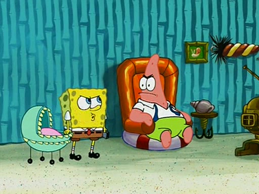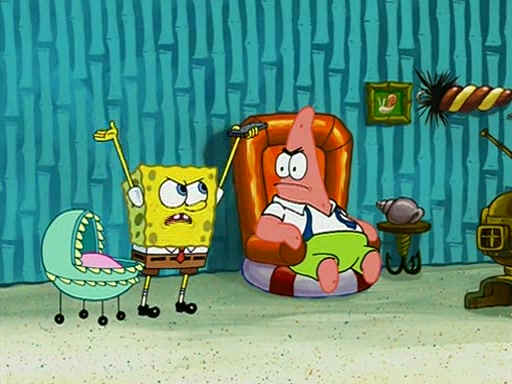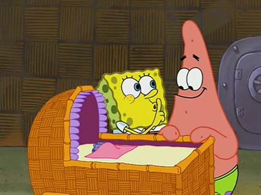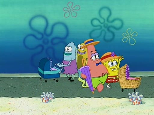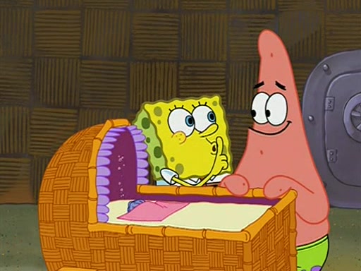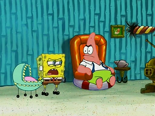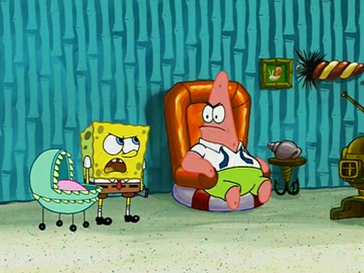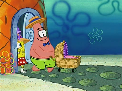 SpongeBob and Patrick are playing with the rubber bands from their newspapers. They then hear chirping and both say they didn't make the noise. They spot a baby scallop in a coral tree who was making the noise. They name him "Junior" and decide to adopt, with SpongeBob as the Mom and Patrick as the Dad. However, the next day Patrick eats breakfast and then explains that he has to go to work as he is the dad thus leaving SpongeBob to do all the house work. He promises to give SpongeBob a break when he gets home. He eventually returns home only to be exhausted from work, and then decides to sit on the chair and watch TV for the rest of the night. This goes on for several days until SpongeBob can't take it anymore. Eventually, SpongeBob angrily lashes out at Patrick. He then shows all the diapers that junior used. Patrick then realized the error of his ways and promised to come home at 6:00 and give SpongeBob the whole night off. However he returns at 12:00 Midnight from a party at work. SpongeBob isn't happy and follows Patrick only to find out that "work" consists of Patrick watching television under his rock. He explains that it isn't as easy at it seems; sometimes he has to move the antenna, sometimes he loses the remote, and sometimes he has an itchy butt. SpongeBob doesn't buy it and then opens up Patrick's briefcase and dumps ice cream and donuts all over Patrick. Patrick then reveals that he wasn't home by 6:00 as he decided to "work" overtime. Angered, SpongeBob yells "OVERTIME?!" Then the two begin to fight, until they see Junior jumping out a two story window. They try to catch him, but fail and begin crying for him, believing him to be no longer alive and proclaiming themselves "bad parents." However, then they realize that Junior's alive and well, and has learned to fly. After Junior kisses SpongeBob and flies away, Patrick asks "Hey! what about Daddy?" Junior drops a coconut on Patrick's head to get back at him for his laziness but still gives him a kiss, and he responds "That's my boy." After the parents say goodbye to their son, Patrick says "Let's have another," and SpongeBob makes a shocked face as the episode ends.