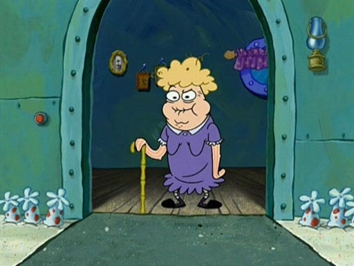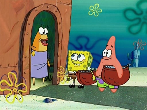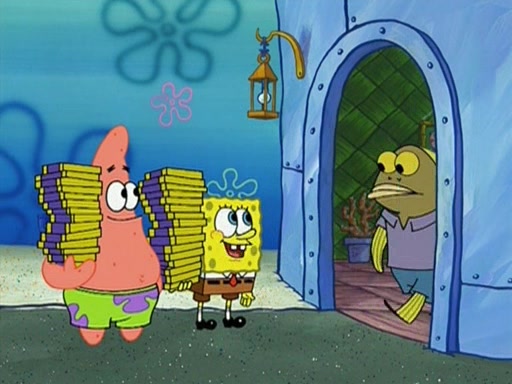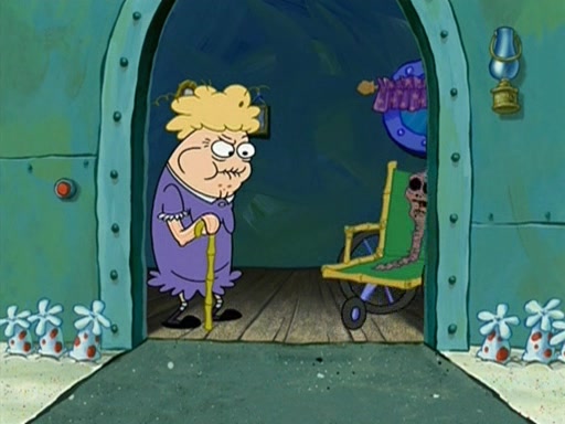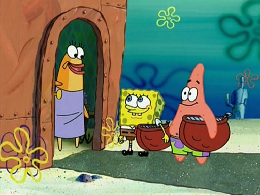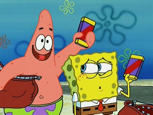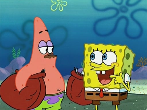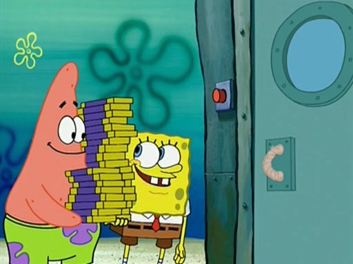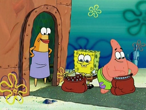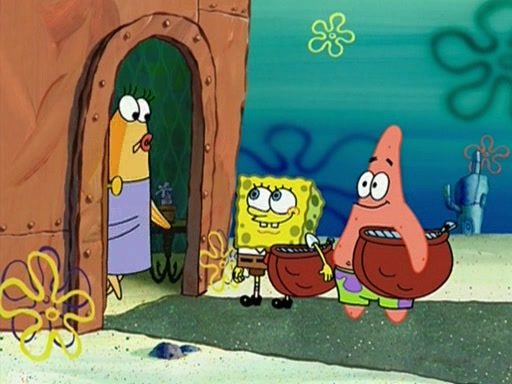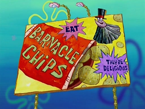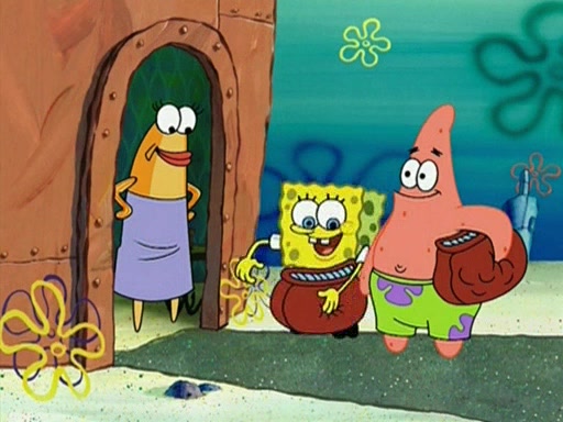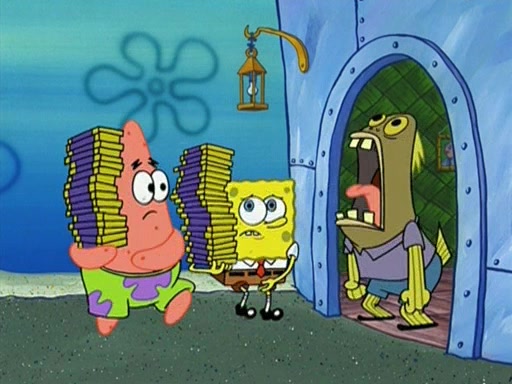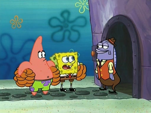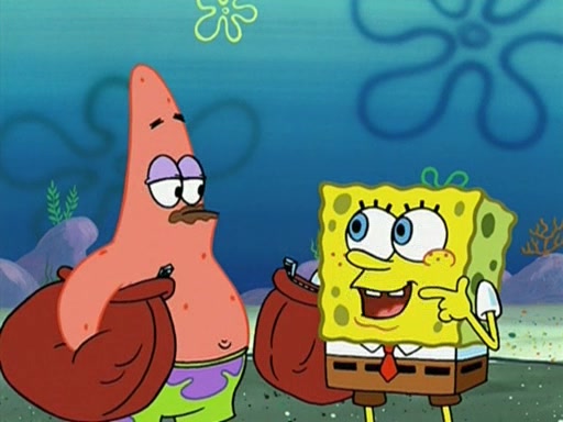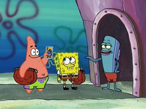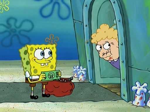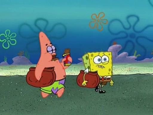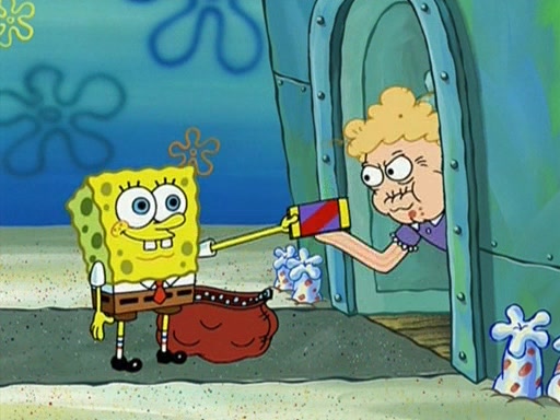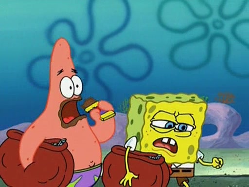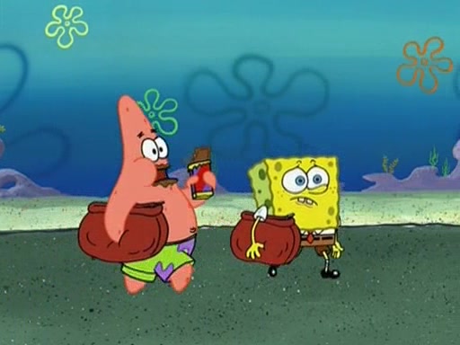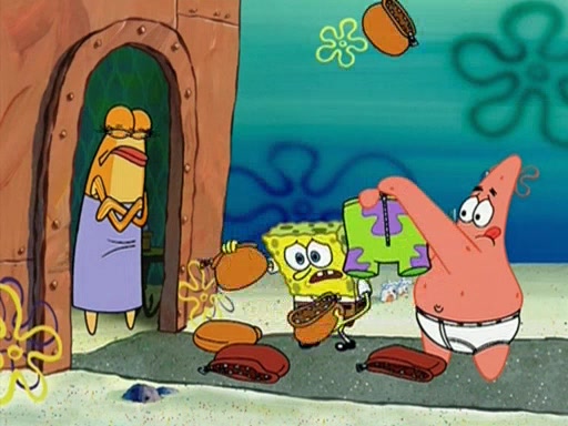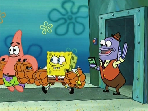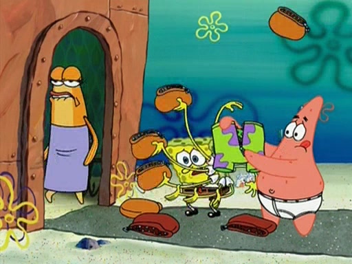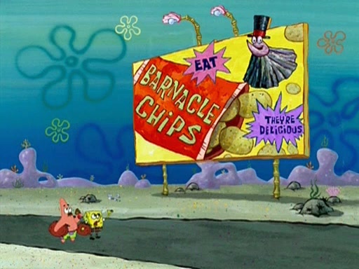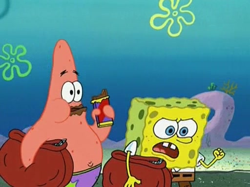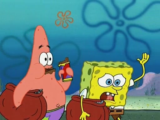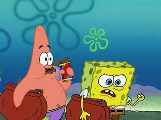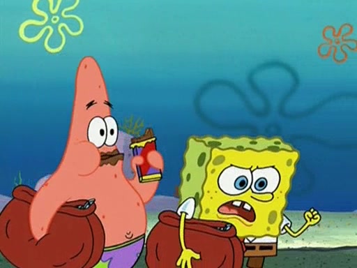 Along the way, SpongeBob and Patrick are also convinced to purchase candy bar carrying bags by a con artist who is only known as The Con Man. He later scams them again, selling them "candy bar bag carrying bags." The next person was Sadie, but SpongeBob couldn't find her candy bar, which made her impatient and slam the door in their faces. After running away from Tom again, they sit in the diner and think about a new approach. Patrick says "Let's get naked," but SpongeBob says they should save that strategy for when they're selling real estate, then decides to be nice. Patrick says "I love you" to the first guy they try this on, but he slams the door in disgust. They try again, but the customer refuses to buy chocolate since it made him obese as a teenager and shows a picture as proof, which Patrick buys. SpongeBob figures that they are too easily distracted and need to stay focused on selling. Patrick takes this literally and freaks out their next customer by focusing on him with his eyes. Eventually, after seeing an advertisement for "Barnacle Chips," SpongeBob and Patrick decide to increase the appeal of their product by "stretching" the truth. The first customers they use this tactic on are an old lady and her very old mother (The mother is so old she is only a shriveled up spine). They claim that the chocolate will make one immortal by rubbing it on their skin, which the extremely old mother is delighted by to her daughter's dismay.