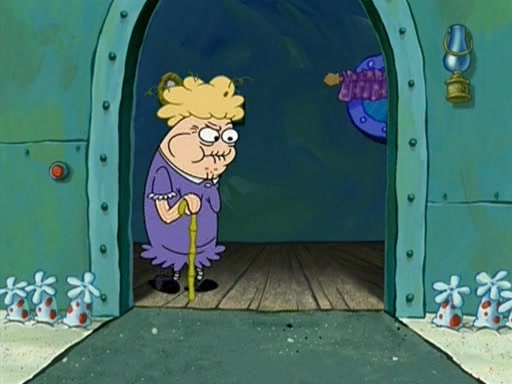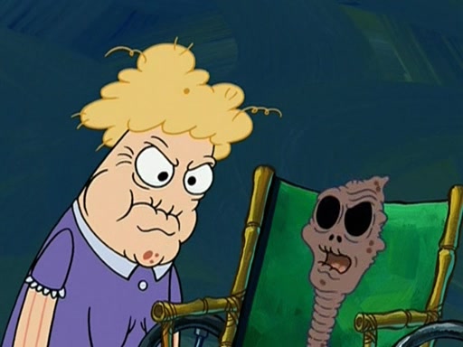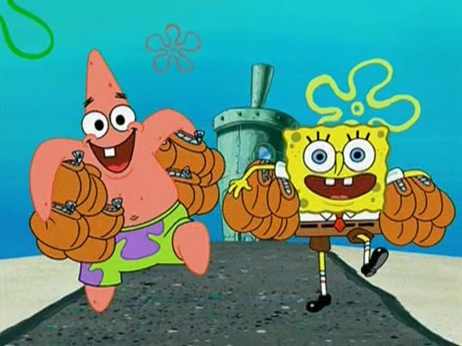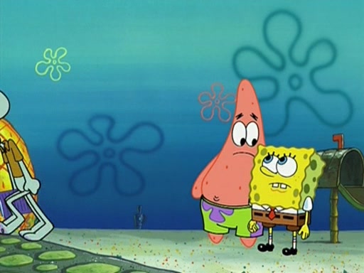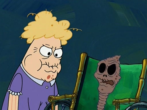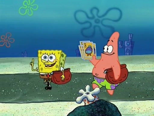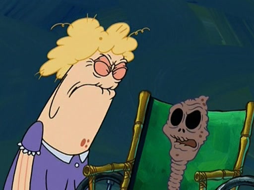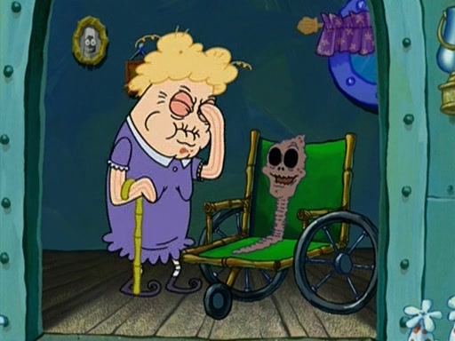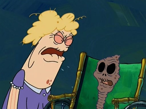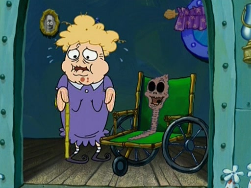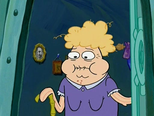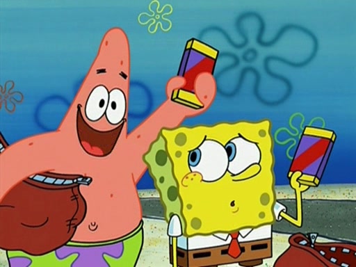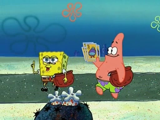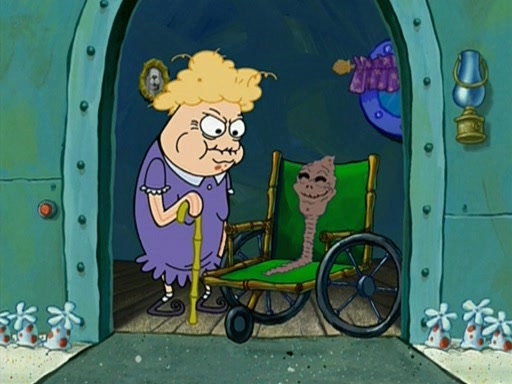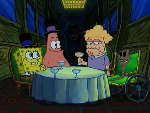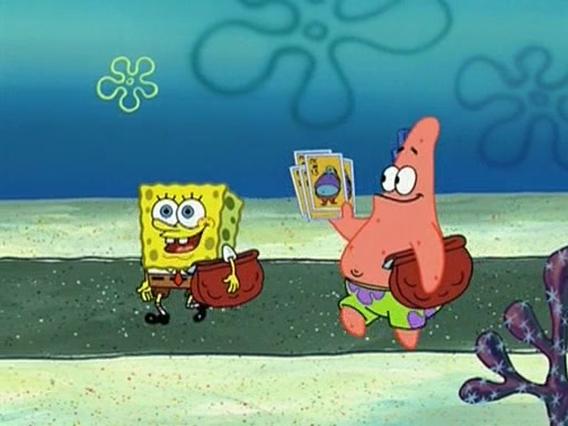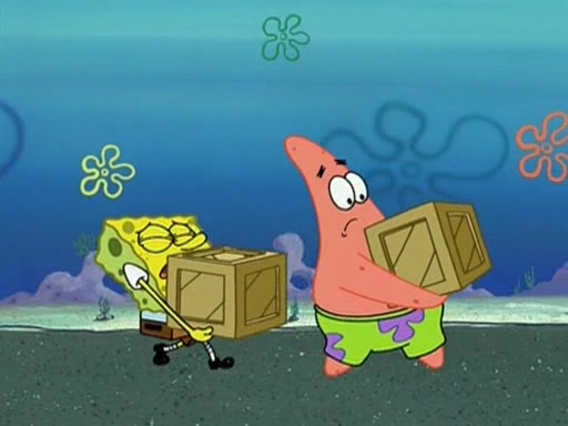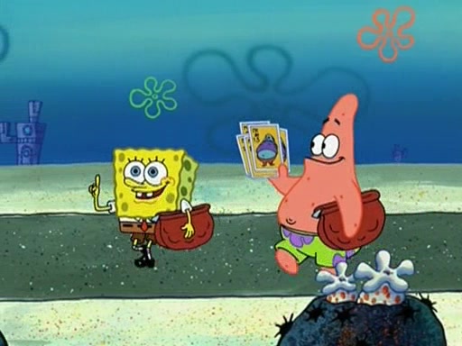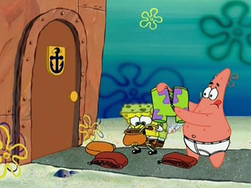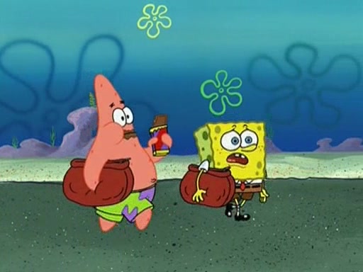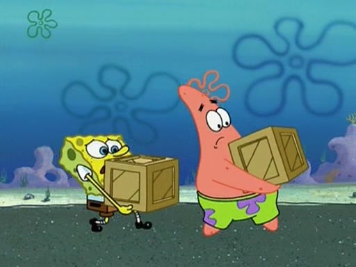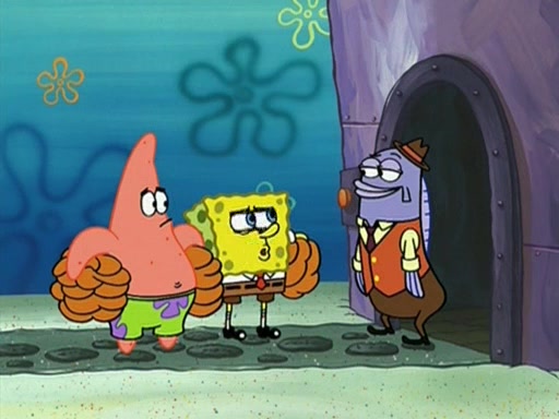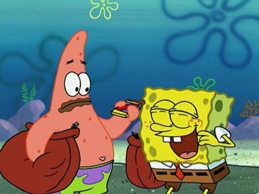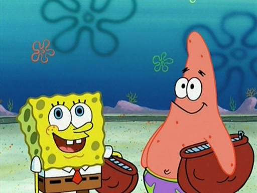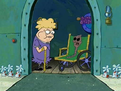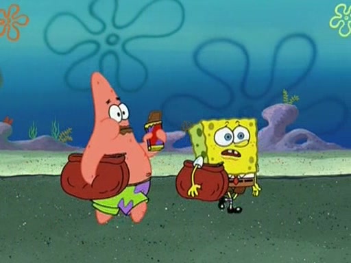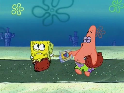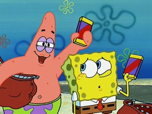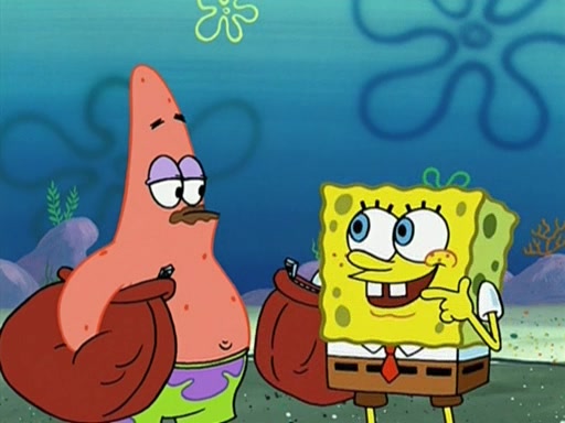 Along the way, SpongeBob and Patrick are also convinced to purchase candy bar carrying bags by a con artist who is only known as The Con Man. He later scams them again, selling them "candy bar bag carrying bags." The next person was Sadie, but SpongeBob couldn't find her candy bar, which made her impatient and slam the door in their faces. After running away from Tom again, they sit in the diner and think about a new approach. Patrick says "Let's get naked," but SpongeBob says they should save that strategy for when they're selling real estate, then decides to be nice. Patrick says "I love you" to the first guy they try this on, but he slams the door in disgust. They try again, but the customer refuses to buy chocolate since it made him obese as a teenager and shows a picture as proof, which Patrick buys. SpongeBob figures that they are too easily distracted and need to stay focused on selling. Patrick takes this literally and freaks out their next customer by focusing on him with his eyes. Eventually, after seeing an advertisement for "Barnacle Chips," SpongeBob and Patrick decide to increase the appeal of their product by "stretching" the truth. The first customers they use this tactic on are an old lady and her very old mother (The mother is so old she is only a shriveled up spine). They claim that the chocolate will make one immortal by rubbing it on their skin, which the extremely old mother is delighted by to her daughter's dismay.