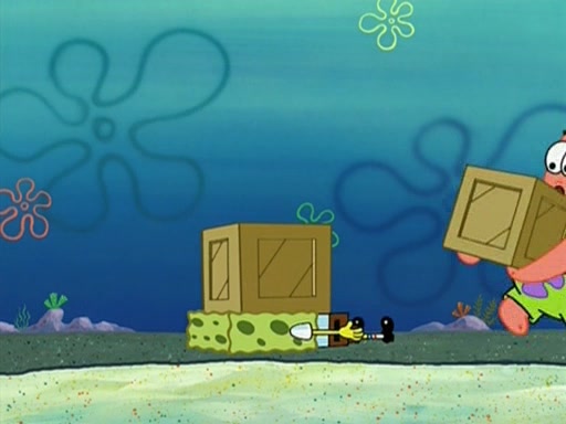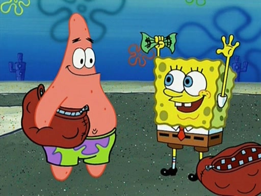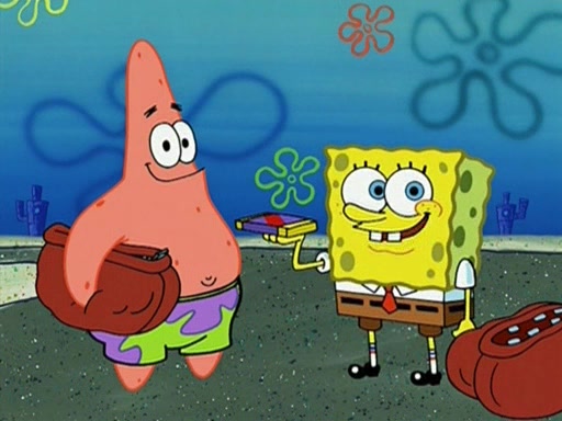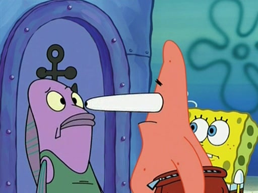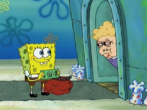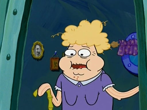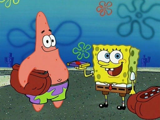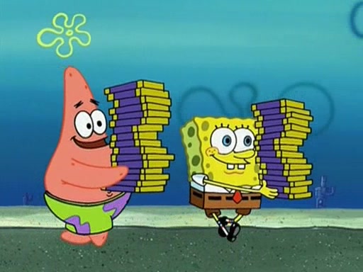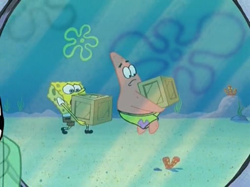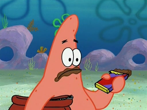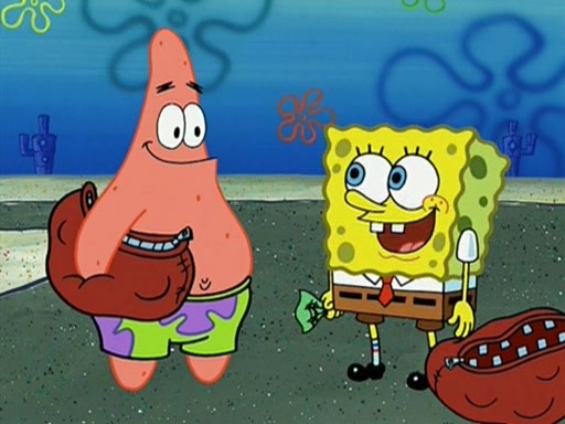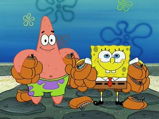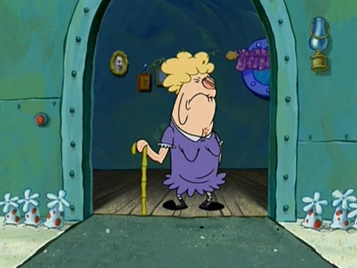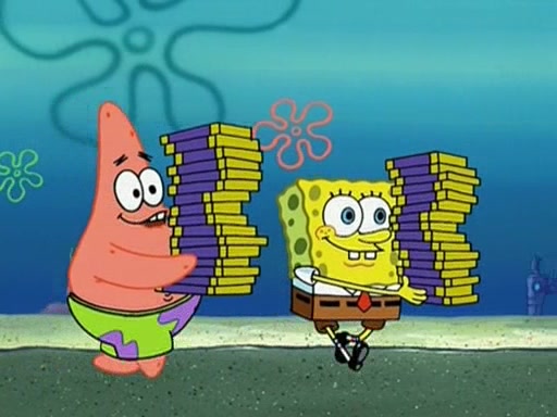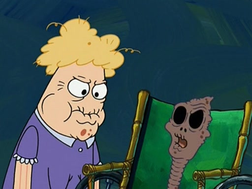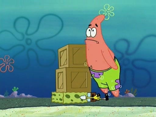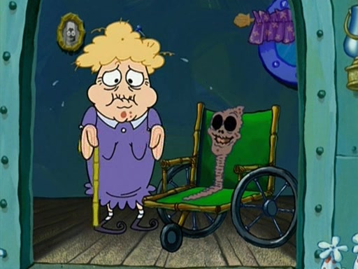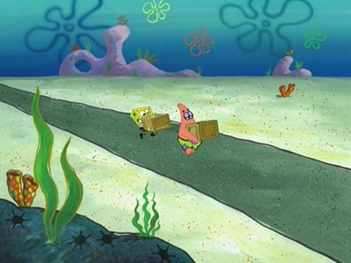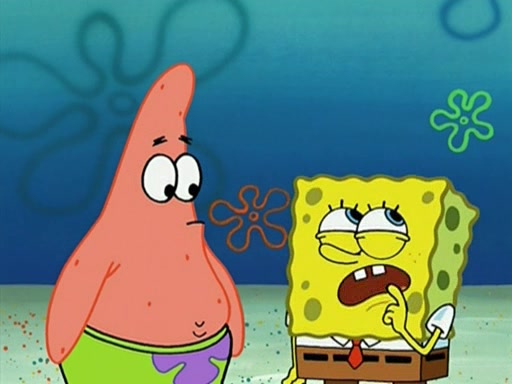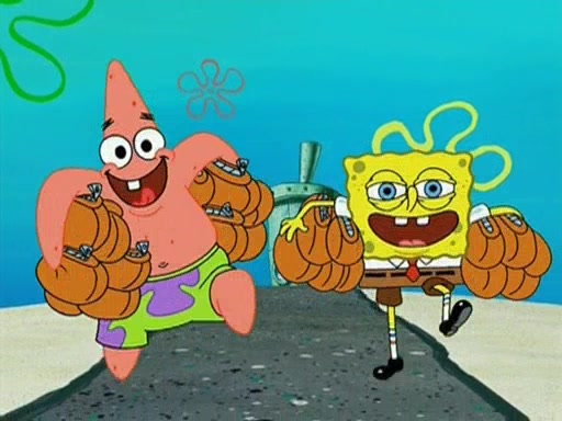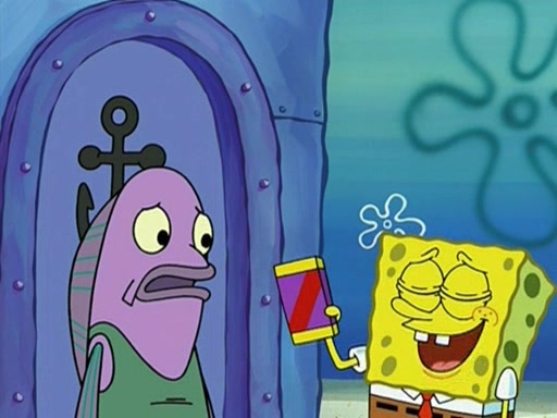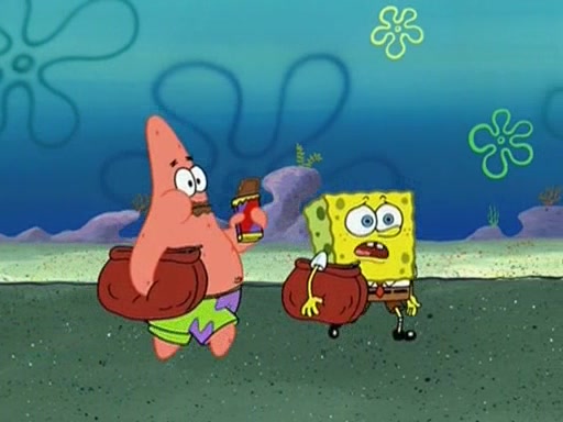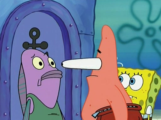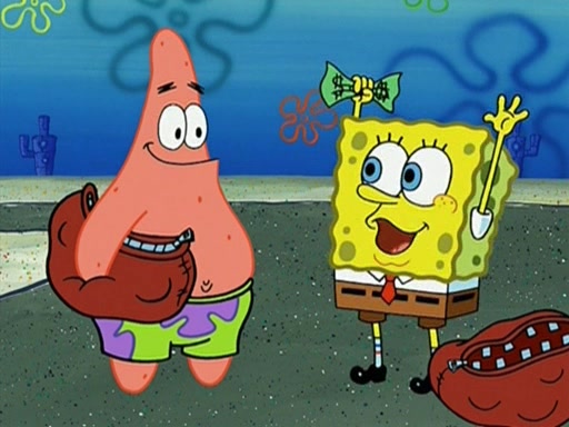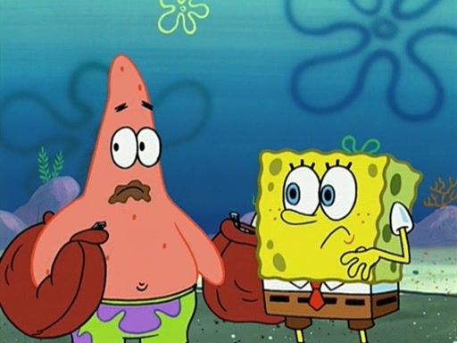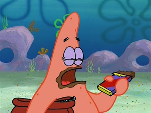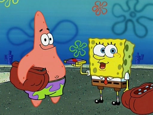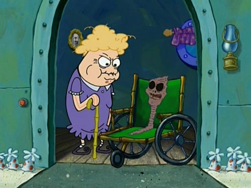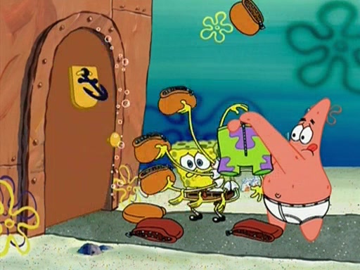 Along the way, SpongeBob and Patrick are also convinced to purchase candy bar carrying bags by a con artist who is only known as The Con Man. He later scams them again, selling them "candy bar bag carrying bags." The next person was Sadie, but SpongeBob couldn't find her candy bar, which made her impatient and slam the door in their faces. After running away from Tom again, they sit in the diner and think about a new approach. Patrick says "Let's get naked," but SpongeBob says they should save that strategy for when they're selling real estate, then decides to be nice. Patrick says "I love you" to the first guy they try this on, but he slams the door in disgust. They try again, but the customer refuses to buy chocolate since it made him obese as a teenager and shows a picture as proof, which Patrick buys. SpongeBob figures that they are too easily distracted and need to stay focused on selling. Patrick takes this literally and freaks out their next customer by focusing on him with his eyes. Eventually, after seeing an advertisement for "Barnacle Chips," SpongeBob and Patrick decide to increase the appeal of their product by "stretching" the truth. The first customers they use this tactic on are an old lady and her very old mother (The mother is so old she is only a shriveled up spine). They claim that the chocolate will make one immortal by rubbing it on their skin, which the extremely old mother is delighted by to her daughter's dismay.