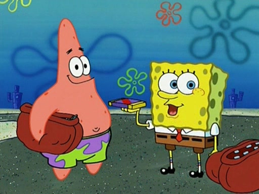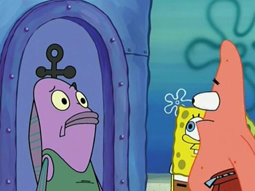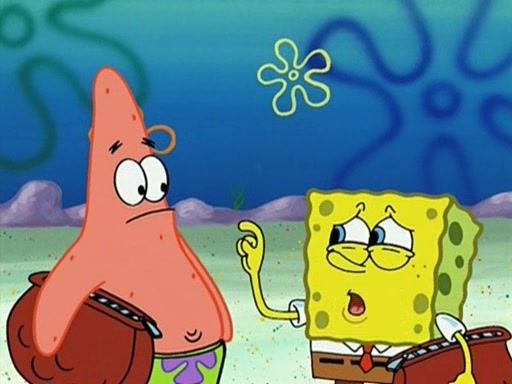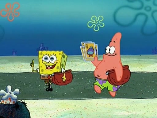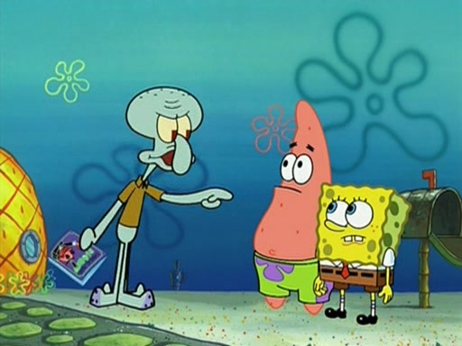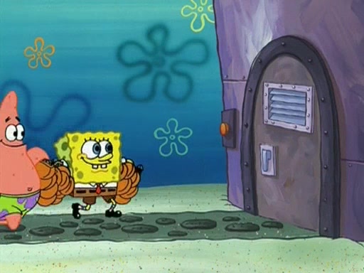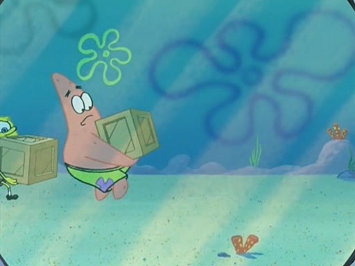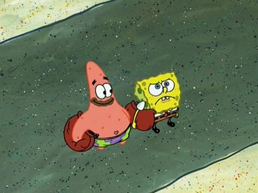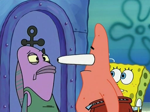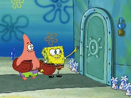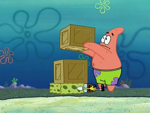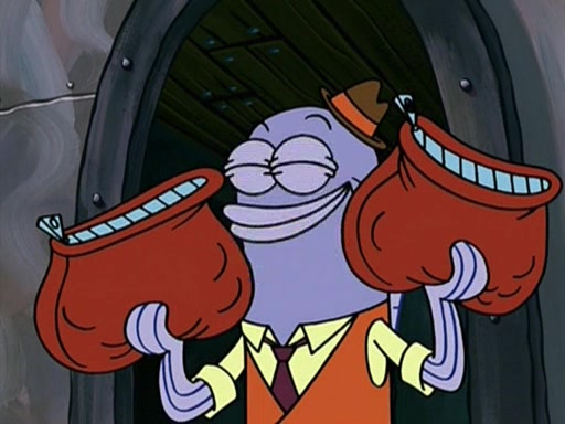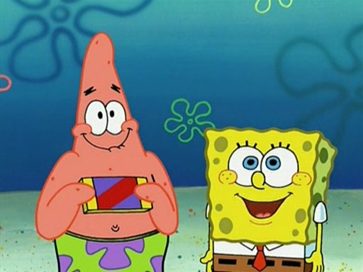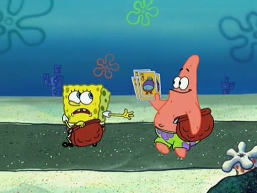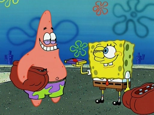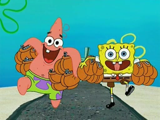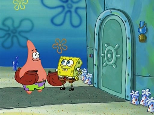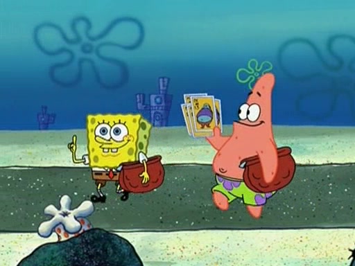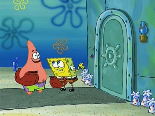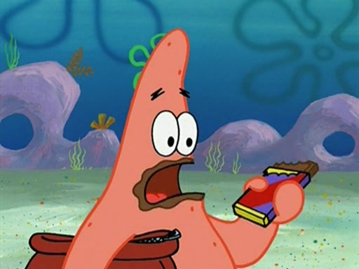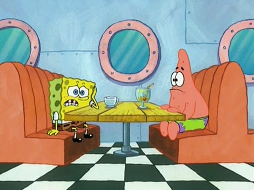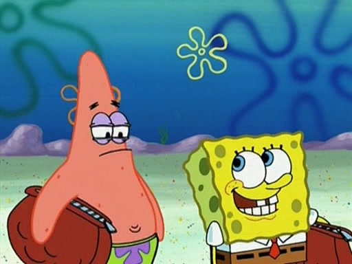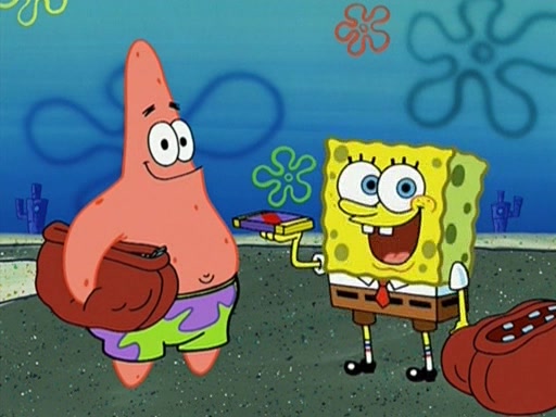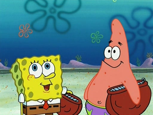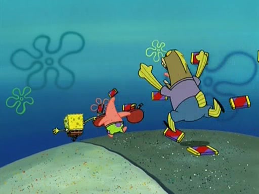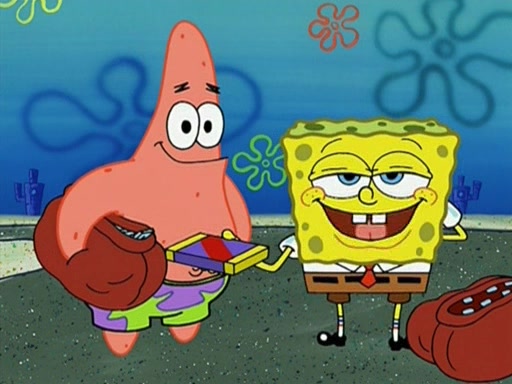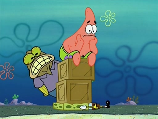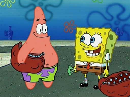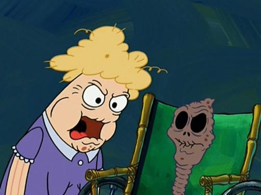Along the way, SpongeBob and Patrick are also convinced to purchase candy bar carrying bags by a con artist who is only known as The Con Man. He later scams them again, selling them "candy bar bag carrying bags." The next person was Sadie, but SpongeBob couldn't find her candy bar, which made her impatient and slam the door in their faces. After running away from Tom again, they sit in the diner and think about a new approach. Patrick says "Let's get naked," but SpongeBob says they should save that strategy for when they're selling real estate, then decides to be nice. Patrick says "I love you" to the first guy they try this on, but he slams the door in disgust. They try again, but the customer refuses to buy chocolate since it made him obese as a teenager and shows a picture as proof, which Patrick buys. SpongeBob figures that they are too easily distracted and need to stay focused on selling. Patrick takes this literally and freaks out their next customer by focusing on him with his eyes. Eventually, after seeing an advertisement for "Barnacle Chips," SpongeBob and Patrick decide to increase the appeal of their product by "stretching" the truth. The first customers they use this tactic on are an old lady and her very old mother (The mother is so old she is only a shriveled up spine). They claim that the chocolate will make one immortal by rubbing it on their skin, which the extremely old mother is delighted by to her daughter's dismay.