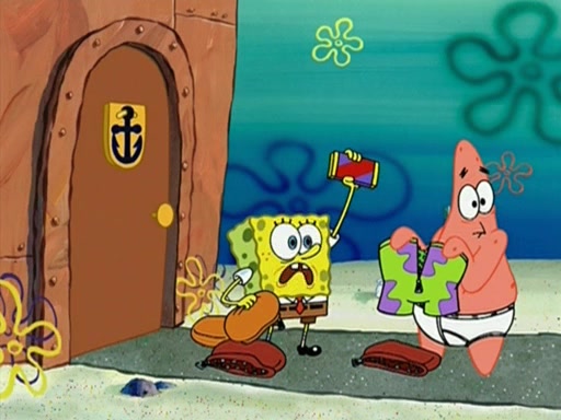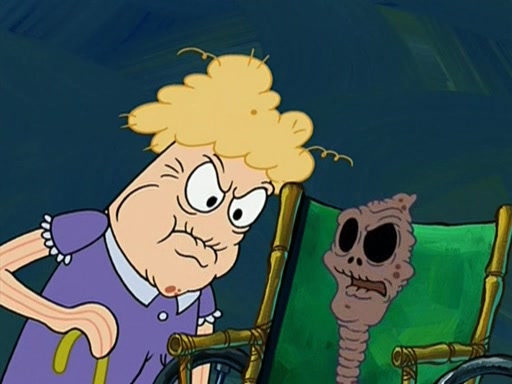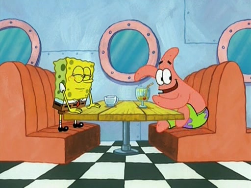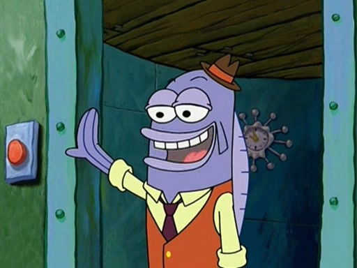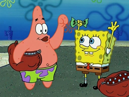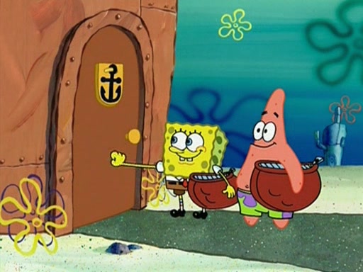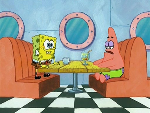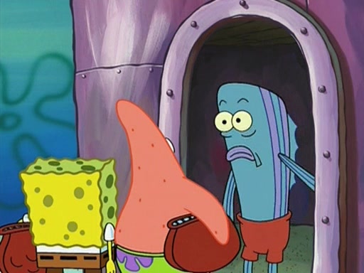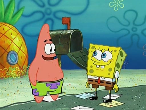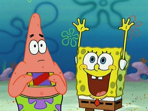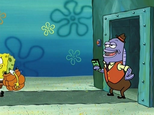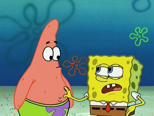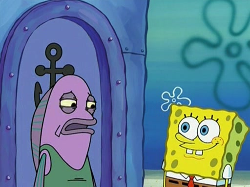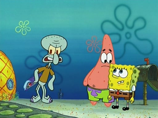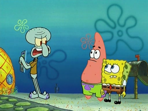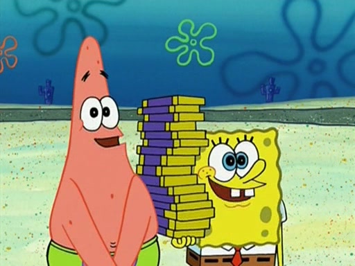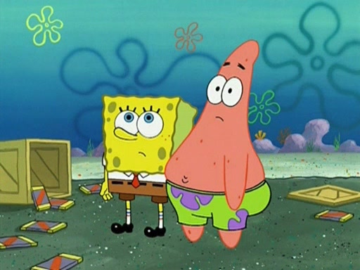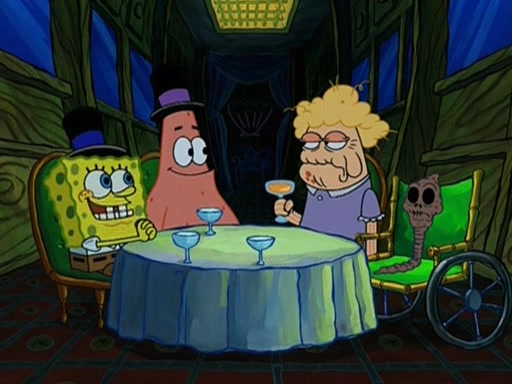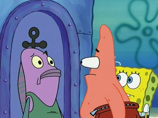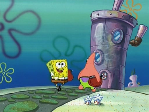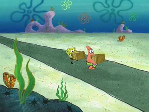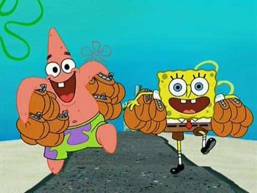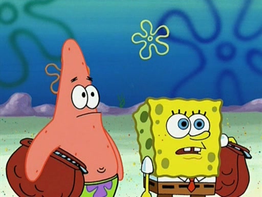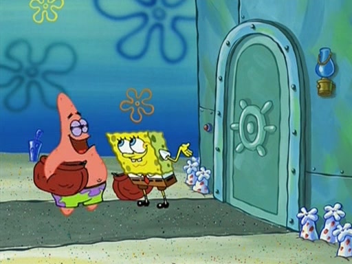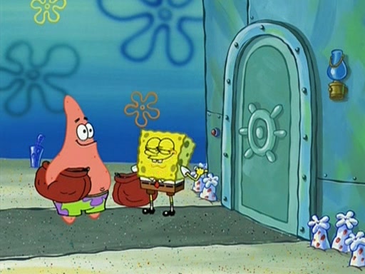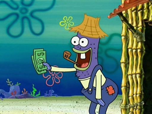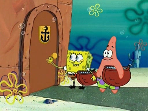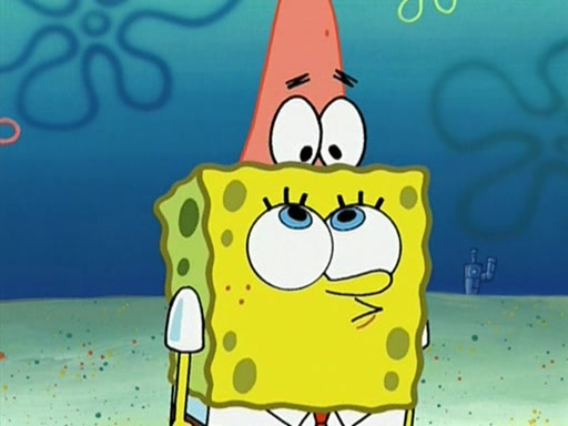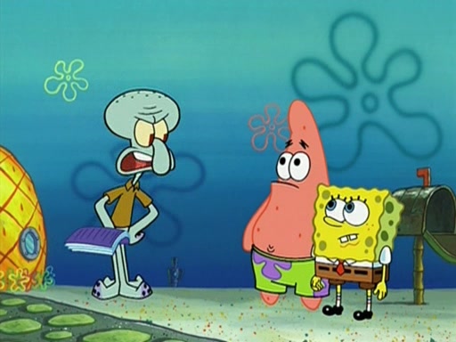 Along the way, SpongeBob and Patrick are also convinced to purchase candy bar carrying bags by a con artist who is only known as The Con Man. He later scams them again, selling them "candy bar bag carrying bags." The next person was Sadie, but SpongeBob couldn't find her candy bar, which made her impatient and slam the door in their faces. After running away from Tom again, they sit in the diner and think about a new approach. Patrick says "Let's get naked," but SpongeBob says they should save that strategy for when they're selling real estate, then decides to be nice. Patrick says "I love you" to the first guy they try this on, but he slams the door in disgust. They try again, but the customer refuses to buy chocolate since it made him obese as a teenager and shows a picture as proof, which Patrick buys. SpongeBob figures that they are too easily distracted and need to stay focused on selling. Patrick takes this literally and freaks out their next customer by focusing on him with his eyes. Eventually, after seeing an advertisement for "Barnacle Chips," SpongeBob and Patrick decide to increase the appeal of their product by "stretching" the truth. The first customers they use this tactic on are an old lady and her very old mother (The mother is so old she is only a shriveled up spine). They claim that the chocolate will make one immortal by rubbing it on their skin, which the extremely old mother is delighted by to her daughter's dismay.
