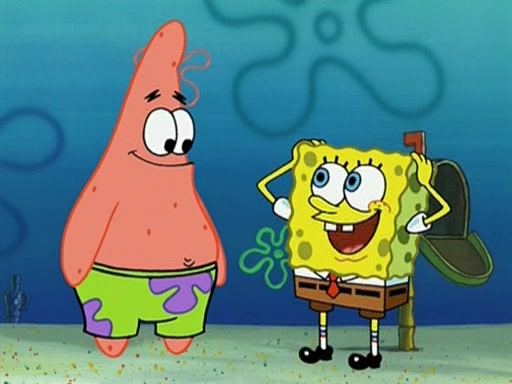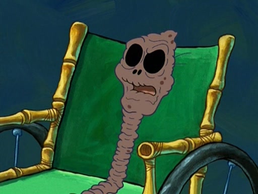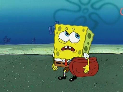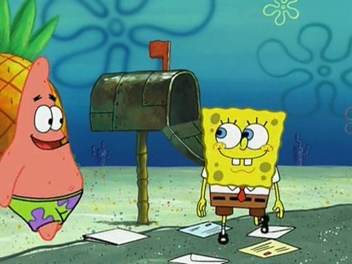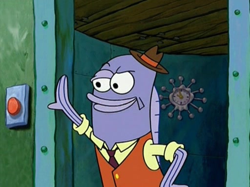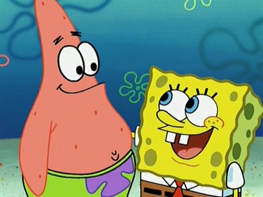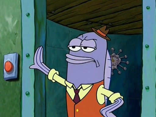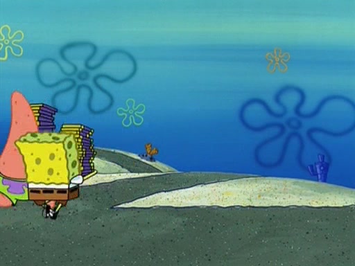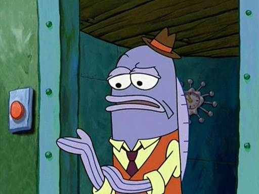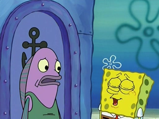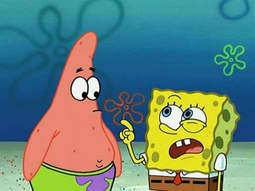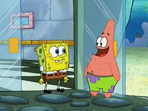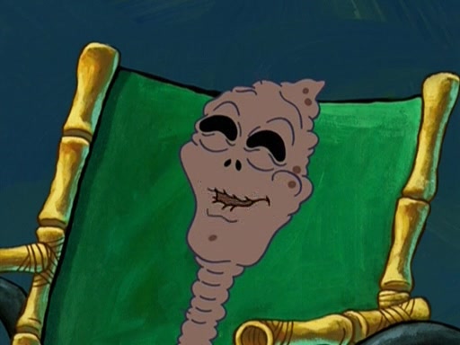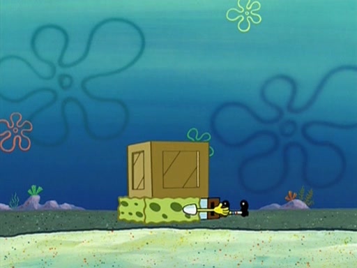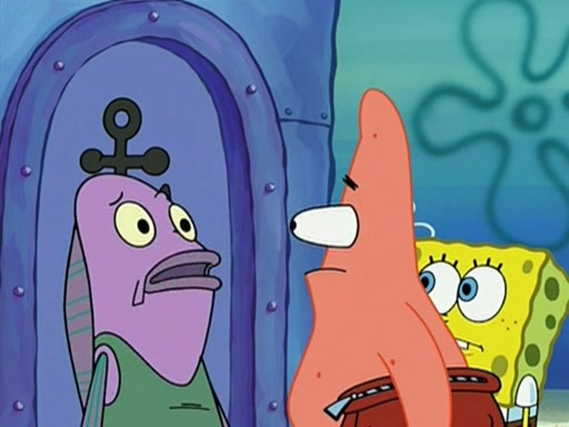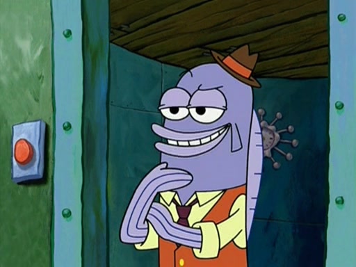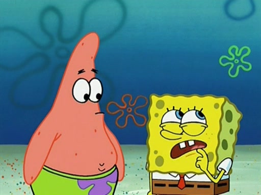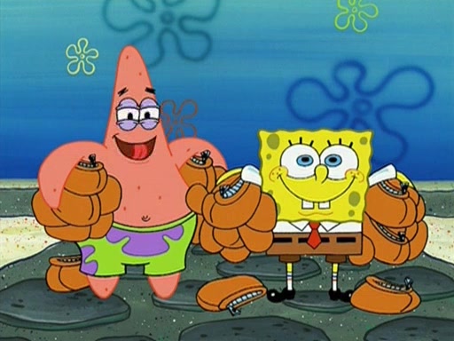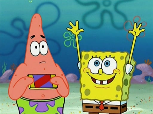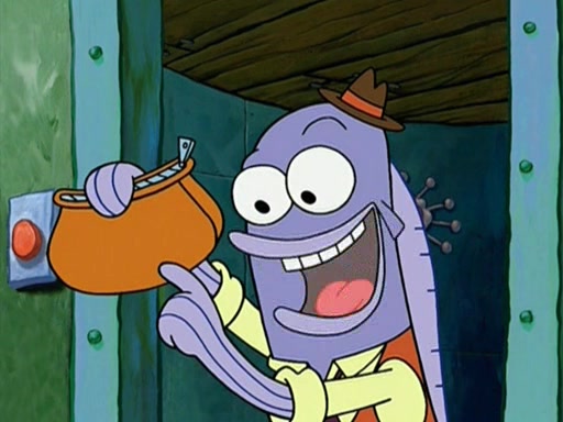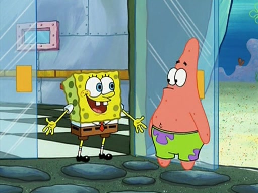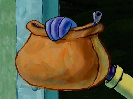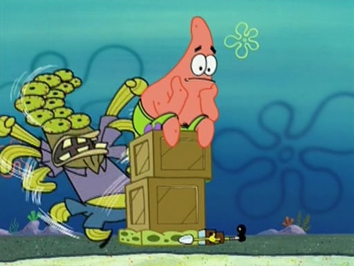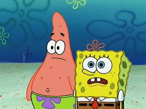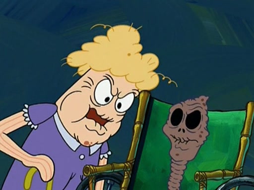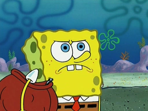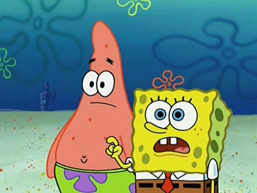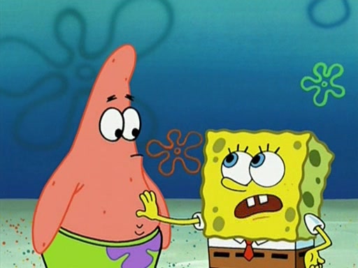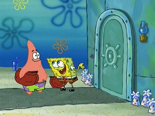 Along the way, SpongeBob and Patrick are also convinced to purchase candy bar carrying bags by a con artist who is only known as The Con Man. He later scams them again, selling them "candy bar bag carrying bags." The next person was Sadie, but SpongeBob couldn't find her candy bar, which made her impatient and slam the door in their faces. After running away from Tom again, they sit in the diner and think about a new approach. Patrick says "Let's get naked," but SpongeBob says they should save that strategy for when they're selling real estate, then decides to be nice. Patrick says "I love you" to the first guy they try this on, but he slams the door in disgust. They try again, but the customer refuses to buy chocolate since it made him obese as a teenager and shows a picture as proof, which Patrick buys. SpongeBob figures that they are too easily distracted and need to stay focused on selling. Patrick takes this literally and freaks out their next customer by focusing on him with his eyes. Eventually, after seeing an advertisement for "Barnacle Chips," SpongeBob and Patrick decide to increase the appeal of their product by "stretching" the truth. The first customers they use this tactic on are an old lady and her very old mother (The mother is so old she is only a shriveled up spine). They claim that the chocolate will make one immortal by rubbing it on their skin, which the extremely old mother is delighted by to her daughter's dismay.