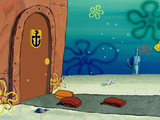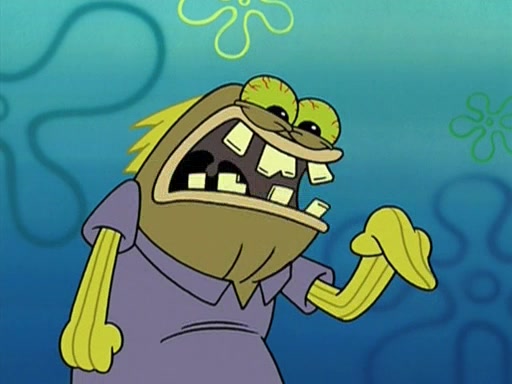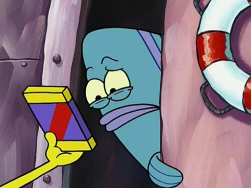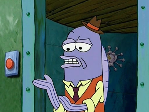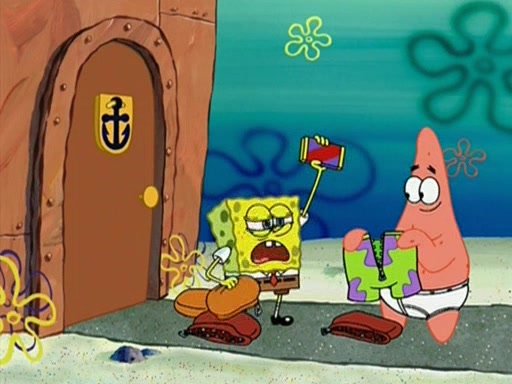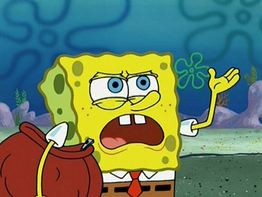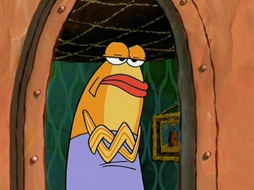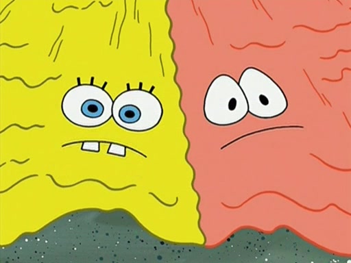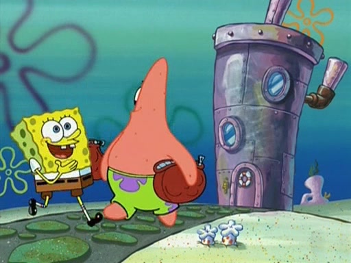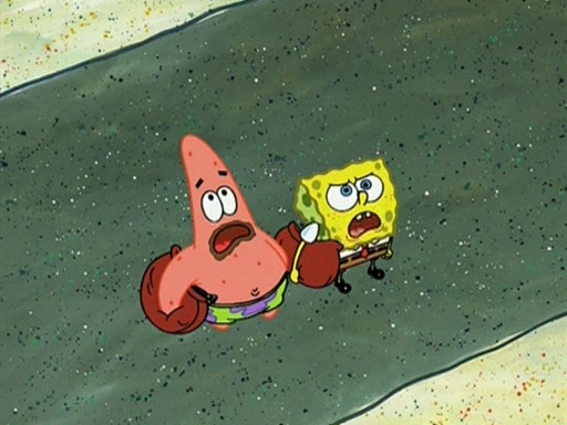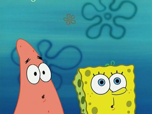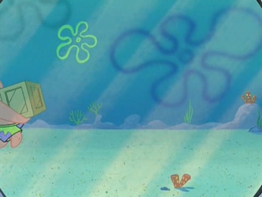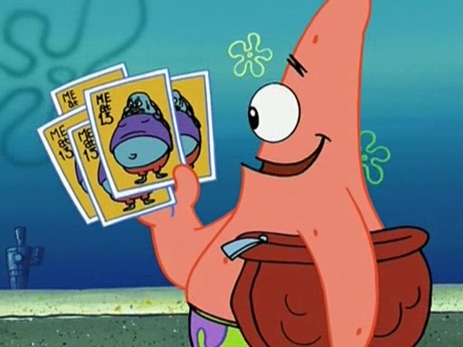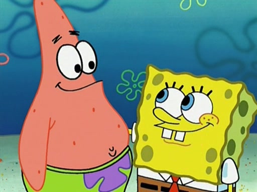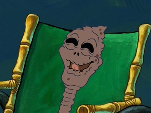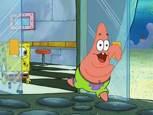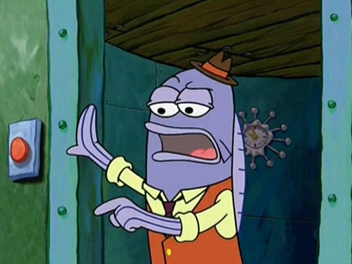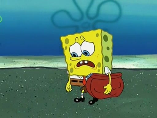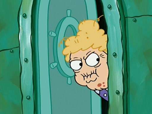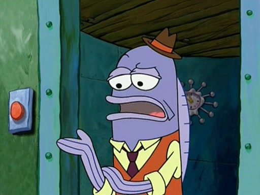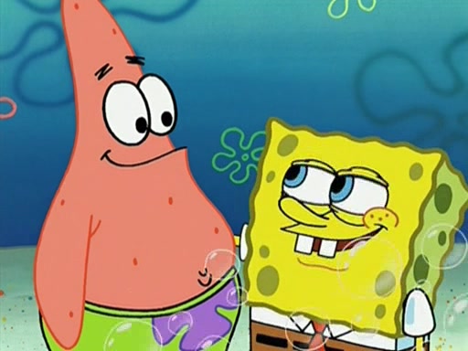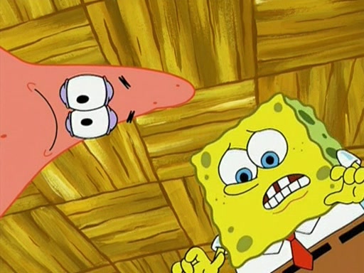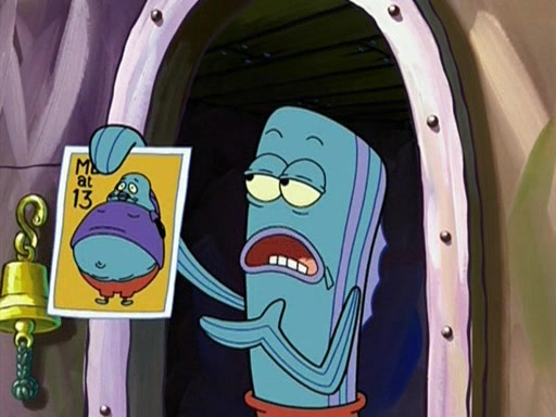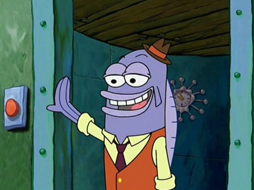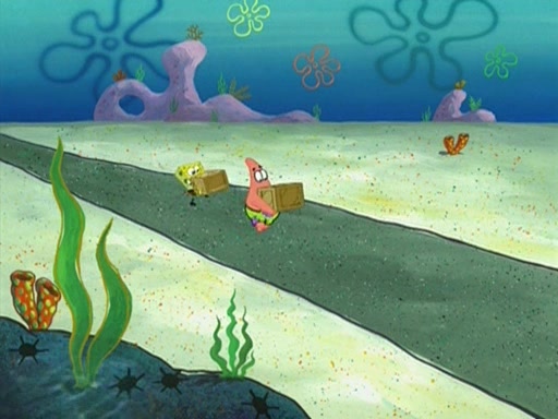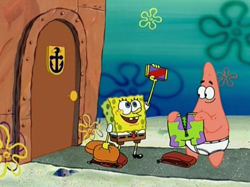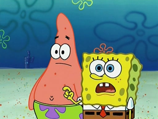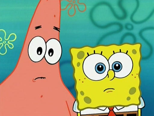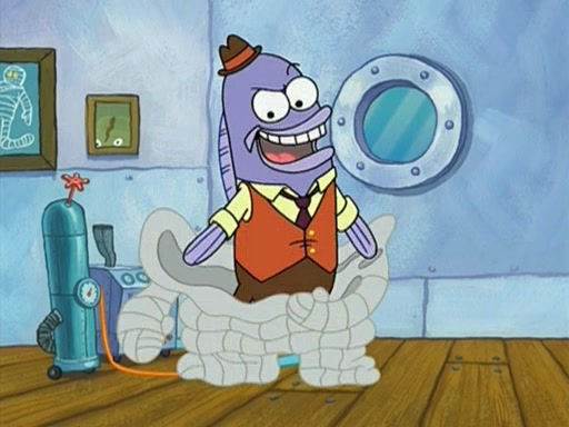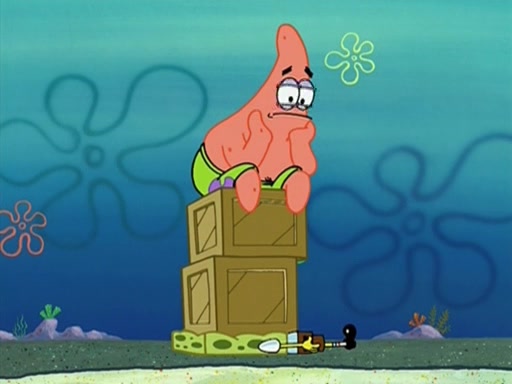 Along the way, SpongeBob and Patrick are also convinced to purchase candy bar carrying bags by a con artist who is only known as The Con Man. He later scams them again, selling them "candy bar bag carrying bags." The next person was Sadie, but SpongeBob couldn't find her candy bar, which made her impatient and slam the door in their faces. After running away from Tom again, they sit in the diner and think about a new approach. Patrick says "Let's get naked," but SpongeBob says they should save that strategy for when they're selling real estate, then decides to be nice. Patrick says "I love you" to the first guy they try this on, but he slams the door in disgust. They try again, but the customer refuses to buy chocolate since it made him obese as a teenager and shows a picture as proof, which Patrick buys. SpongeBob figures that they are too easily distracted and need to stay focused on selling. Patrick takes this literally and freaks out their next customer by focusing on him with his eyes. Eventually, after seeing an advertisement for "Barnacle Chips," SpongeBob and Patrick decide to increase the appeal of their product by "stretching" the truth. The first customers they use this tactic on are an old lady and her very old mother (The mother is so old she is only a shriveled up spine). They claim that the chocolate will make one immortal by rubbing it on their skin, which the extremely old mother is delighted by to her daughter's dismay.