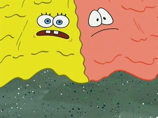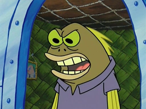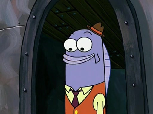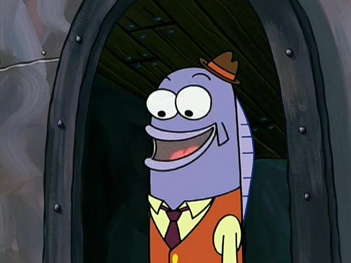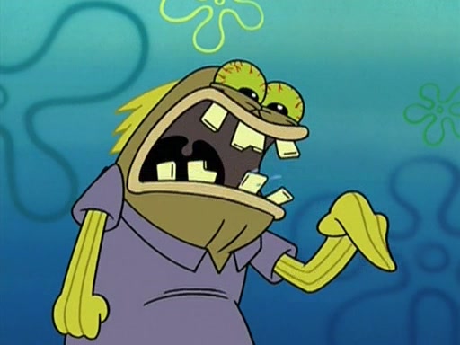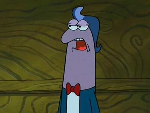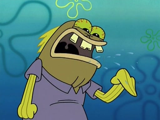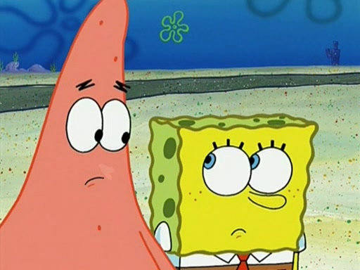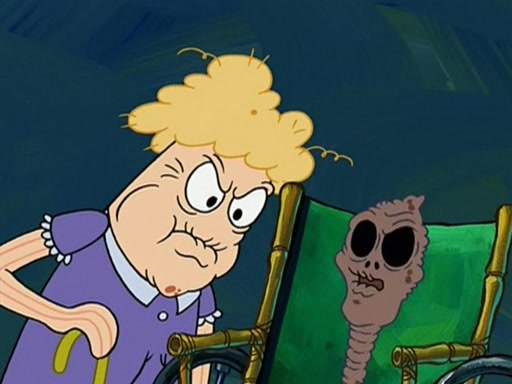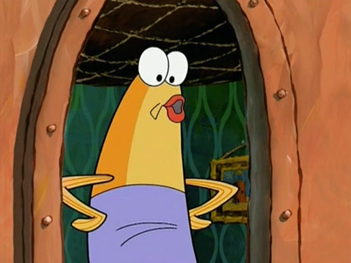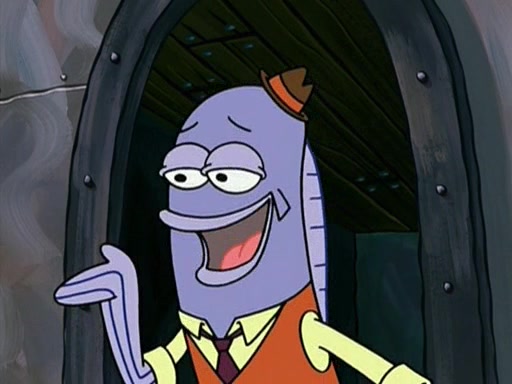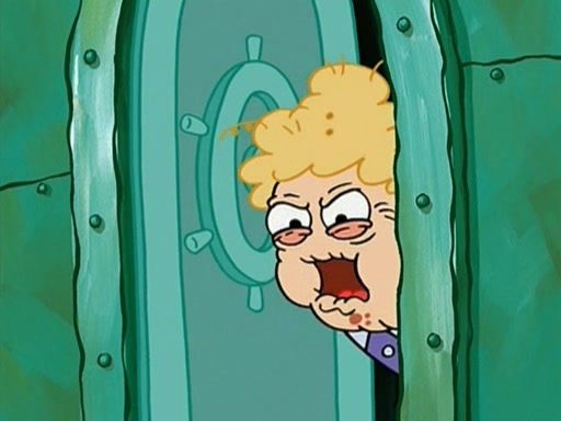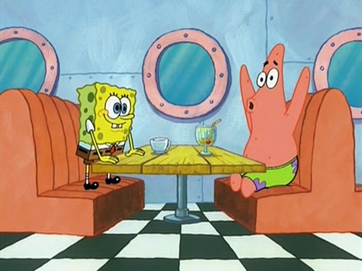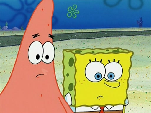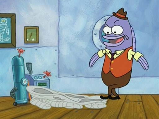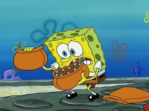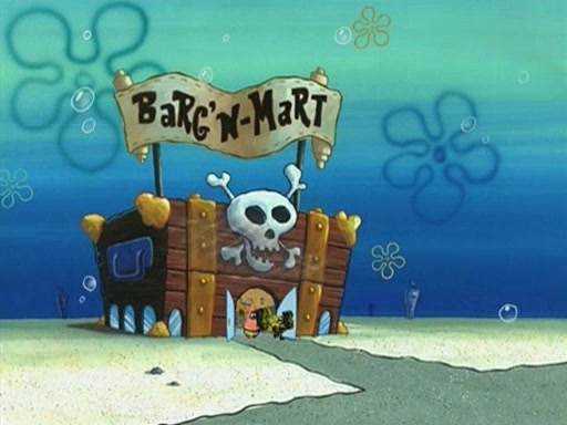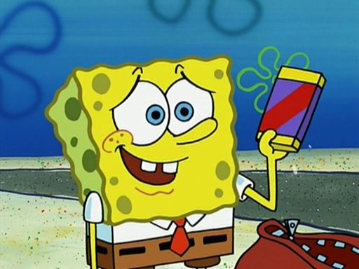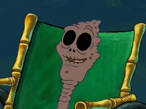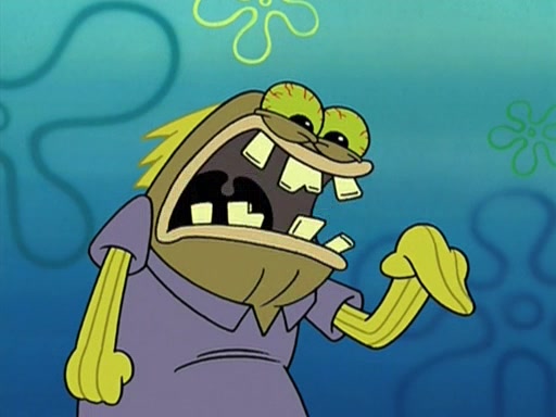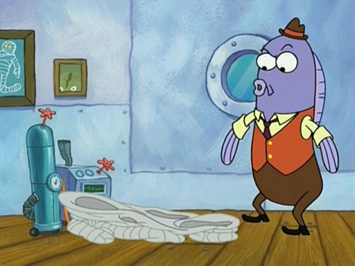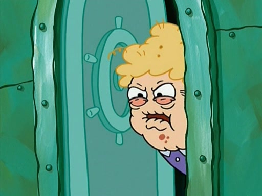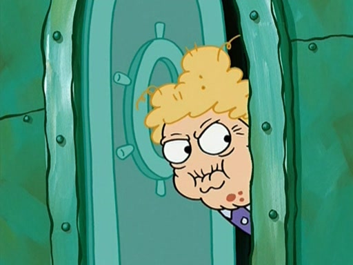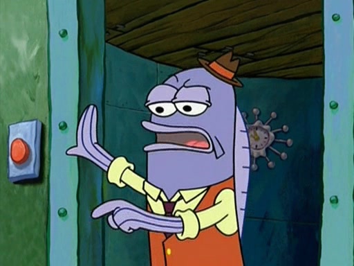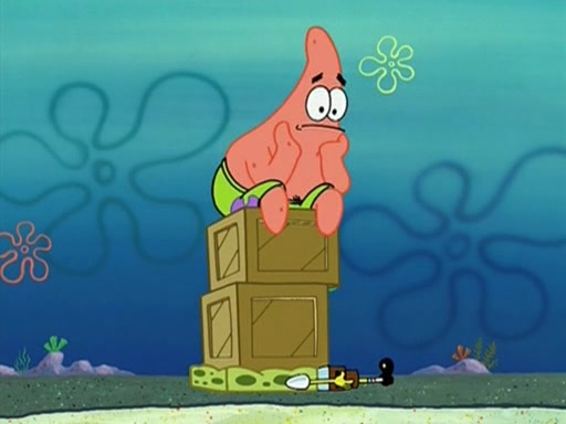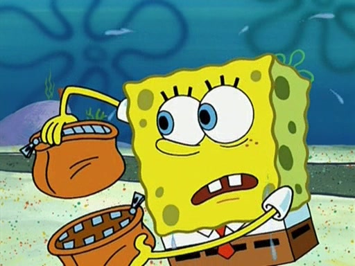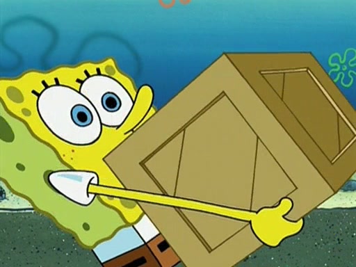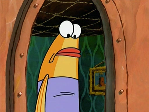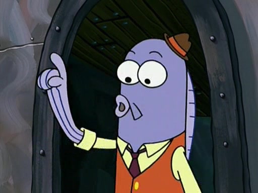 Along the way, SpongeBob and Patrick are also convinced to purchase candy bar carrying bags by a con artist who is only known as The Con Man. He later scams them again, selling them "candy bar bag carrying bags." The next person was Sadie, but SpongeBob couldn't find her candy bar, which made her impatient and slam the door in their faces. After running away from Tom again, they sit in the diner and think about a new approach. Patrick says "Let's get naked," but SpongeBob says they should save that strategy for when they're selling real estate, then decides to be nice. Patrick says "I love you" to the first guy they try this on, but he slams the door in disgust. They try again, but the customer refuses to buy chocolate since it made him obese as a teenager and shows a picture as proof, which Patrick buys. SpongeBob figures that they are too easily distracted and need to stay focused on selling. Patrick takes this literally and freaks out their next customer by focusing on him with his eyes. Eventually, after seeing an advertisement for "Barnacle Chips," SpongeBob and Patrick decide to increase the appeal of their product by "stretching" the truth. The first customers they use this tactic on are an old lady and her very old mother (The mother is so old she is only a shriveled up spine). They claim that the chocolate will make one immortal by rubbing it on their skin, which the extremely old mother is delighted by to her daughter's dismay.