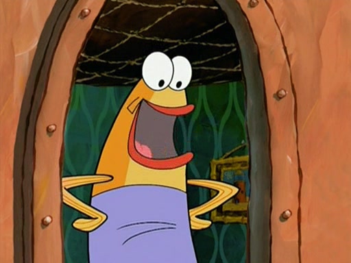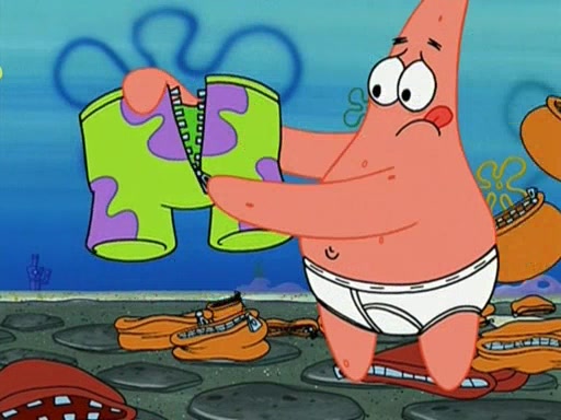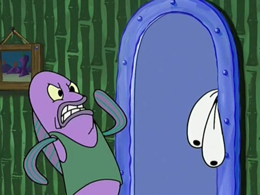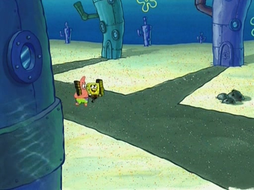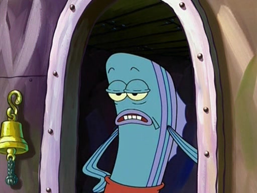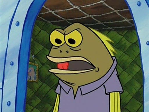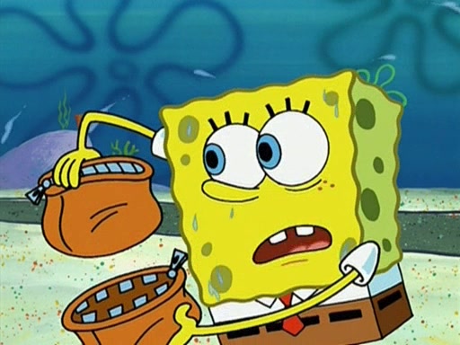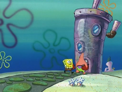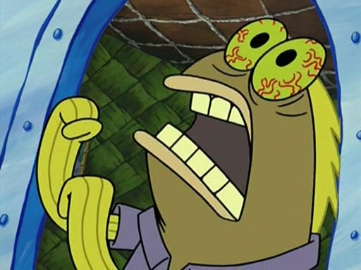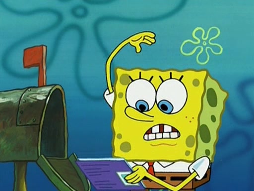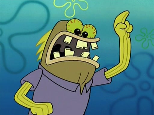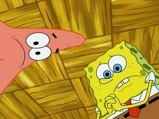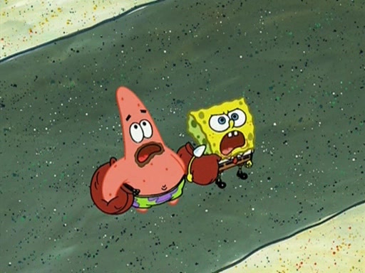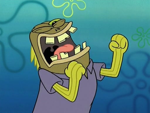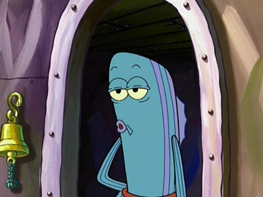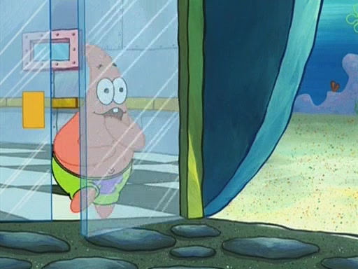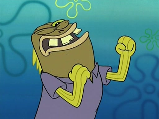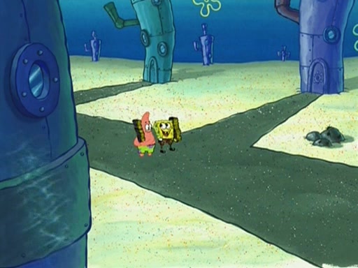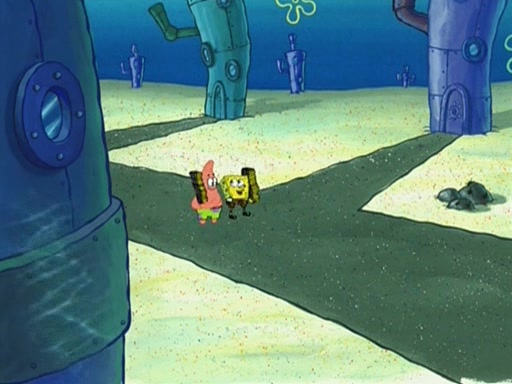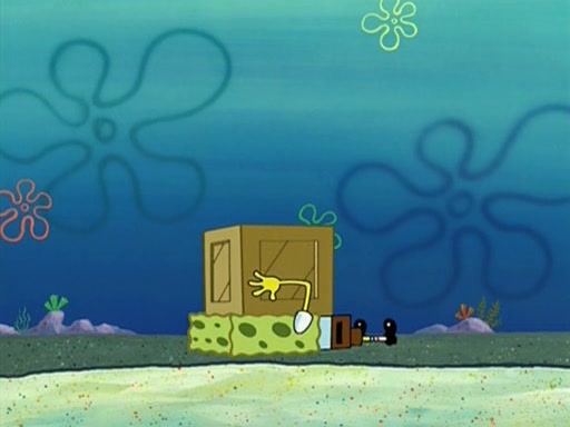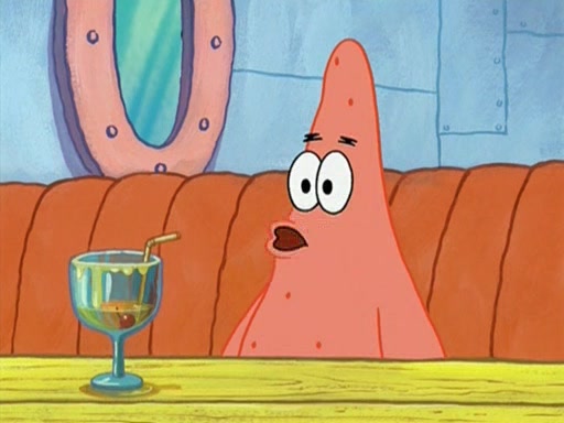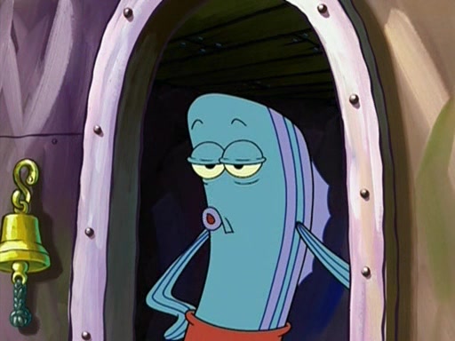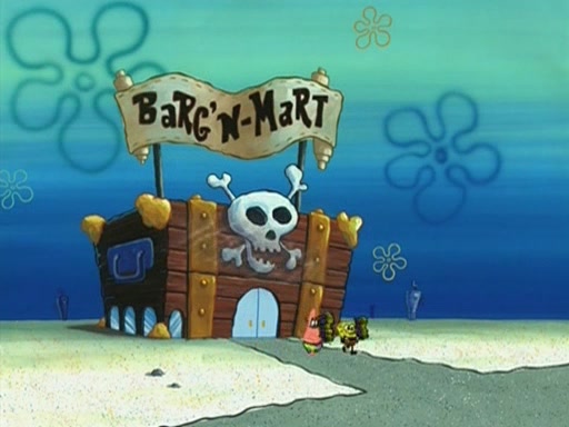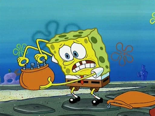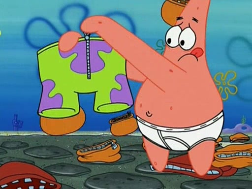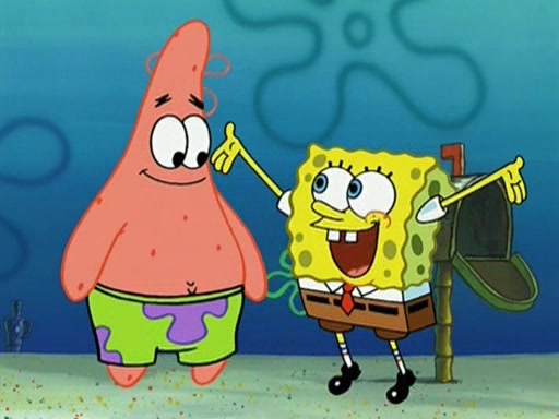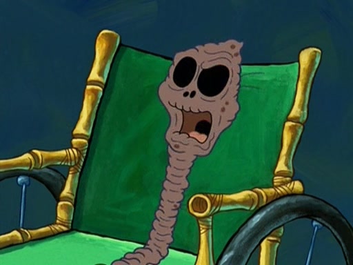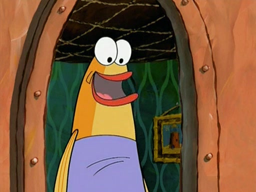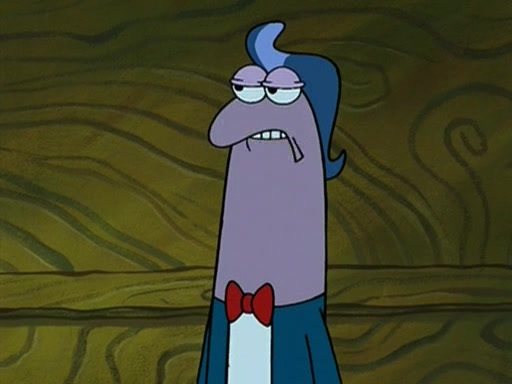 Along the way, SpongeBob and Patrick are also convinced to purchase candy bar carrying bags by a con artist who is only known as The Con Man. He later scams them again, selling them "candy bar bag carrying bags." The next person was Sadie, but SpongeBob couldn't find her candy bar, which made her impatient and slam the door in their faces. After running away from Tom again, they sit in the diner and think about a new approach. Patrick says "Let's get naked," but SpongeBob says they should save that strategy for when they're selling real estate, then decides to be nice. Patrick says "I love you" to the first guy they try this on, but he slams the door in disgust. They try again, but the customer refuses to buy chocolate since it made him obese as a teenager and shows a picture as proof, which Patrick buys. SpongeBob figures that they are too easily distracted and need to stay focused on selling. Patrick takes this literally and freaks out their next customer by focusing on him with his eyes. Eventually, after seeing an advertisement for "Barnacle Chips," SpongeBob and Patrick decide to increase the appeal of their product by "stretching" the truth. The first customers they use this tactic on are an old lady and her very old mother (The mother is so old she is only a shriveled up spine). They claim that the chocolate will make one immortal by rubbing it on their skin, which the extremely old mother is delighted by to her daughter's dismay.
