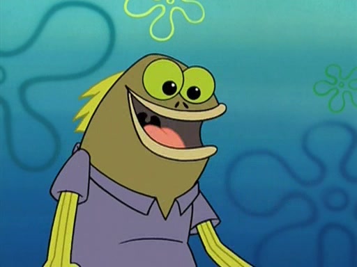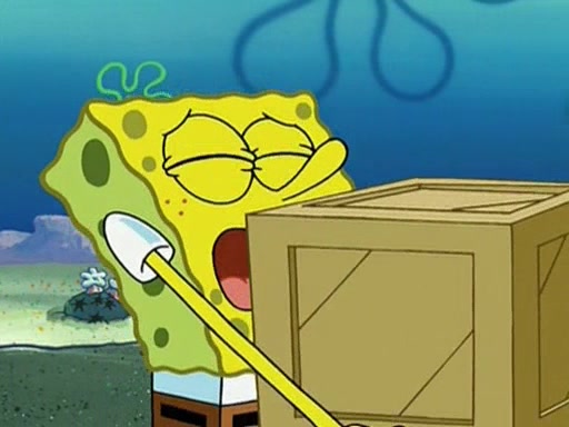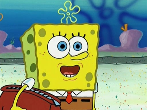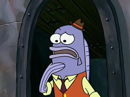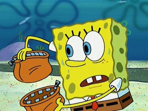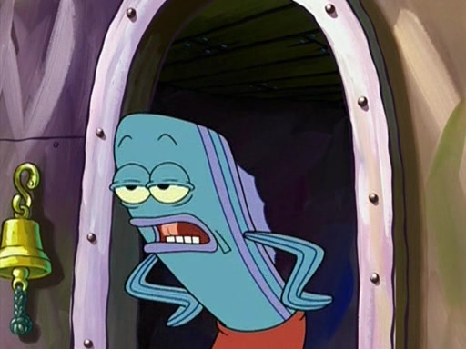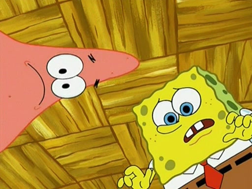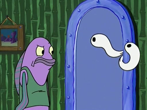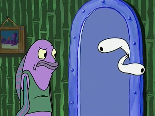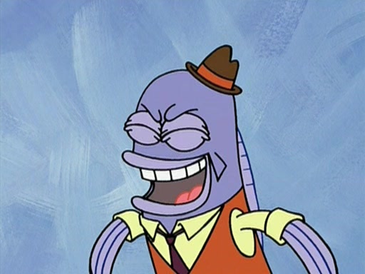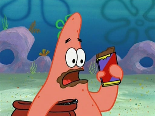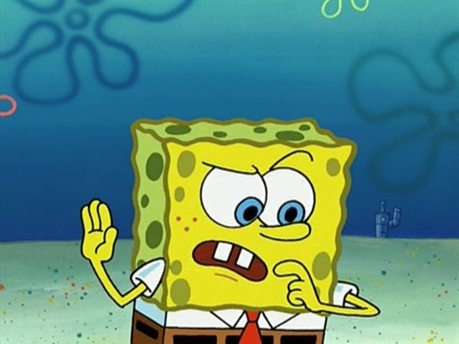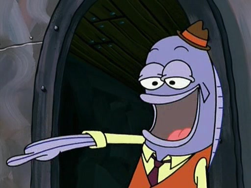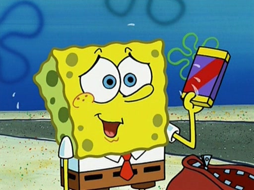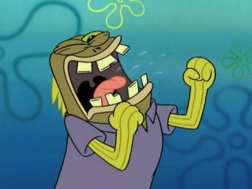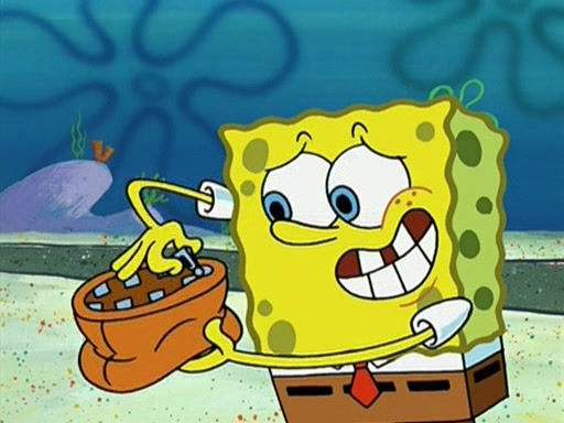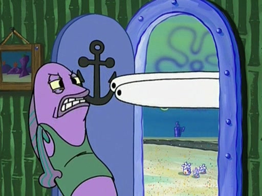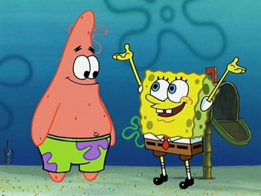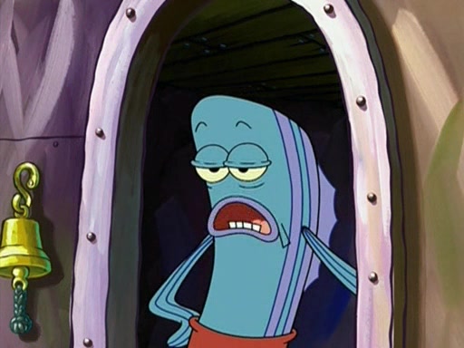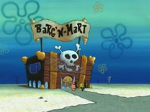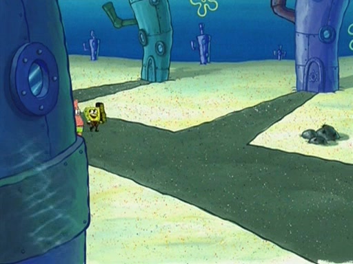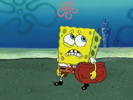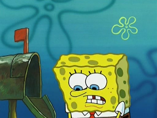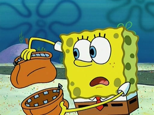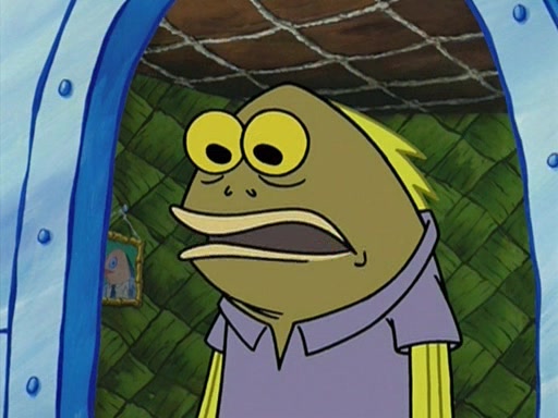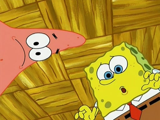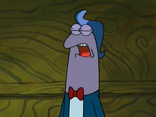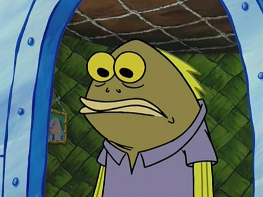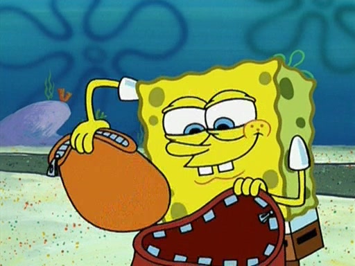 Along the way, SpongeBob and Patrick are also convinced to purchase candy bar carrying bags by a con artist who is only known as The Con Man. He later scams them again, selling them "candy bar bag carrying bags." The next person was Sadie, but SpongeBob couldn't find her candy bar, which made her impatient and slam the door in their faces. After running away from Tom again, they sit in the diner and think about a new approach. Patrick says "Let's get naked," but SpongeBob says they should save that strategy for when they're selling real estate, then decides to be nice. Patrick says "I love you" to the first guy they try this on, but he slams the door in disgust. They try again, but the customer refuses to buy chocolate since it made him obese as a teenager and shows a picture as proof, which Patrick buys. SpongeBob figures that they are too easily distracted and need to stay focused on selling. Patrick takes this literally and freaks out their next customer by focusing on him with his eyes. Eventually, after seeing an advertisement for "Barnacle Chips," SpongeBob and Patrick decide to increase the appeal of their product by "stretching" the truth. The first customers they use this tactic on are an old lady and her very old mother (The mother is so old she is only a shriveled up spine). They claim that the chocolate will make one immortal by rubbing it on their skin, which the extremely old mother is delighted by to her daughter's dismay.