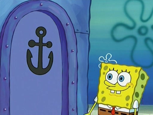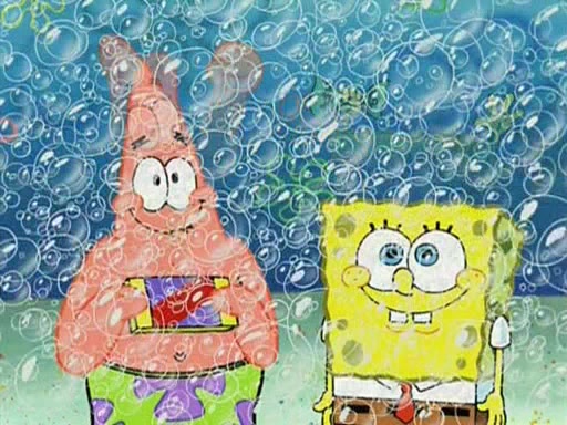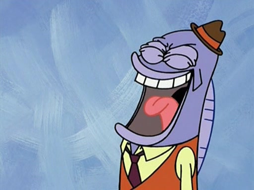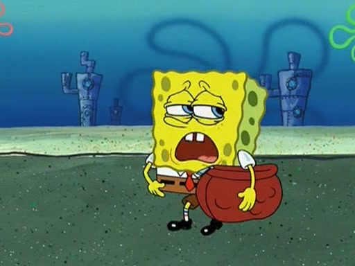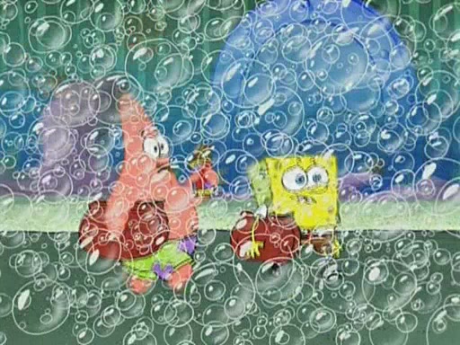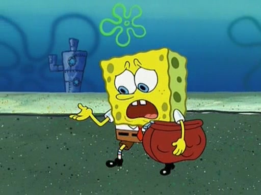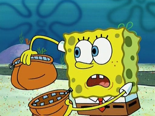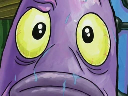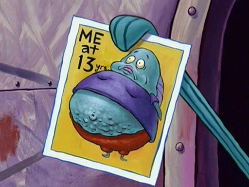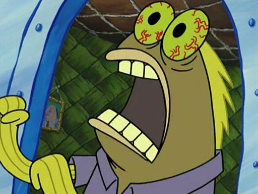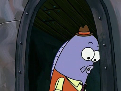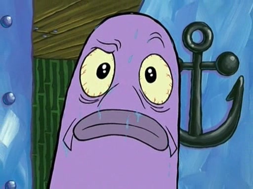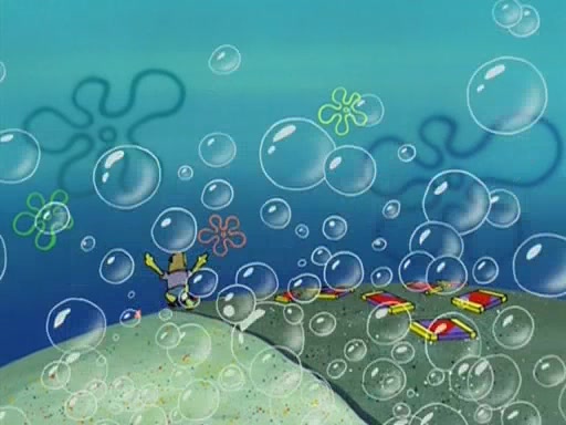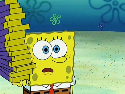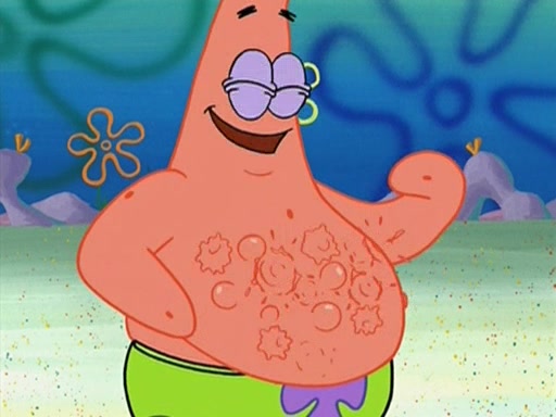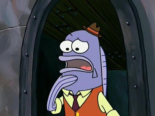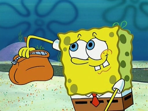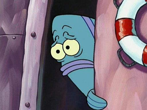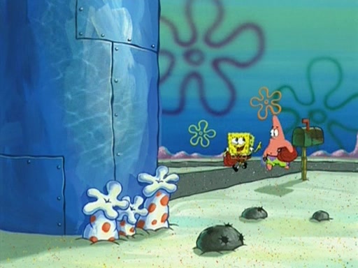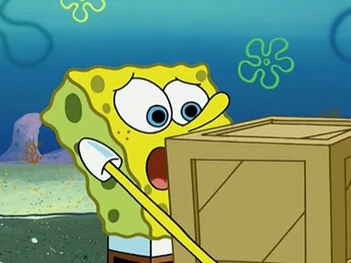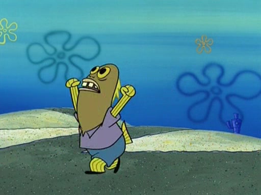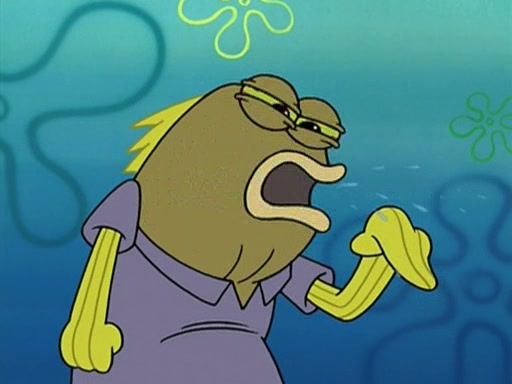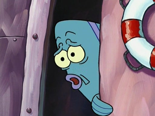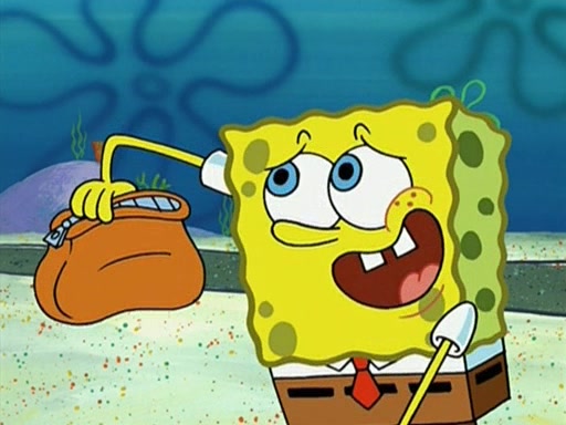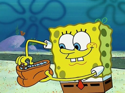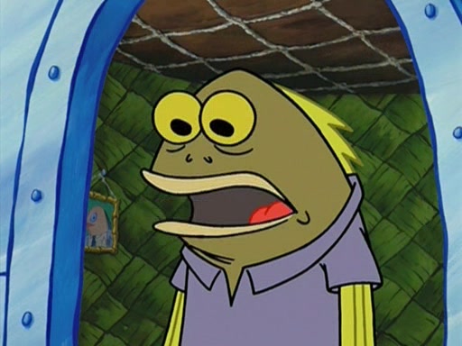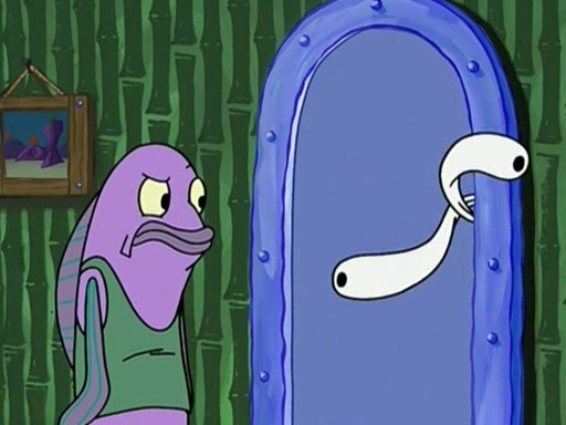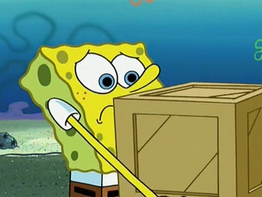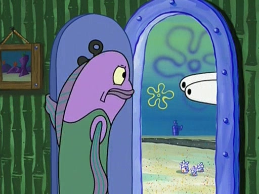 Along the way, SpongeBob and Patrick are also convinced to purchase candy bar carrying bags by a con artist who is only known as The Con Man. He later scams them again, selling them "candy bar bag carrying bags." The next person was Sadie, but SpongeBob couldn't find her candy bar, which made her impatient and slam the door in their faces. After running away from Tom again, they sit in the diner and think about a new approach. Patrick says "Let's get naked," but SpongeBob says they should save that strategy for when they're selling real estate, then decides to be nice. Patrick says "I love you" to the first guy they try this on, but he slams the door in disgust. They try again, but the customer refuses to buy chocolate since it made him obese as a teenager and shows a picture as proof, which Patrick buys. SpongeBob figures that they are too easily distracted and need to stay focused on selling. Patrick takes this literally and freaks out their next customer by focusing on him with his eyes. Eventually, after seeing an advertisement for "Barnacle Chips," SpongeBob and Patrick decide to increase the appeal of their product by "stretching" the truth. The first customers they use this tactic on are an old lady and her very old mother (The mother is so old she is only a shriveled up spine). They claim that the chocolate will make one immortal by rubbing it on their skin, which the extremely old mother is delighted by to her daughter's dismay.