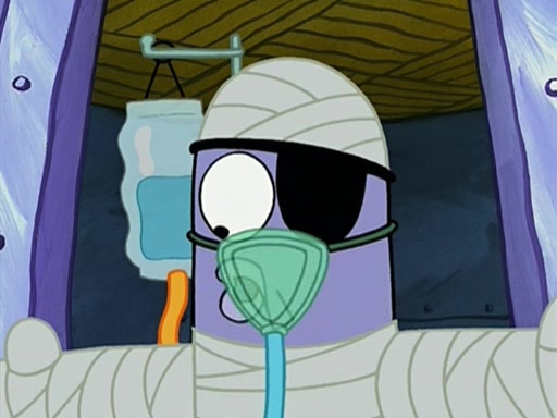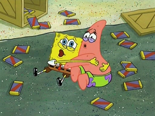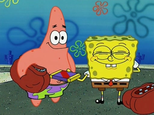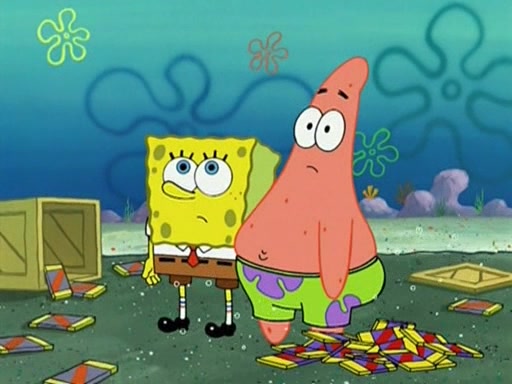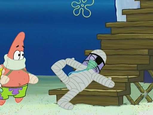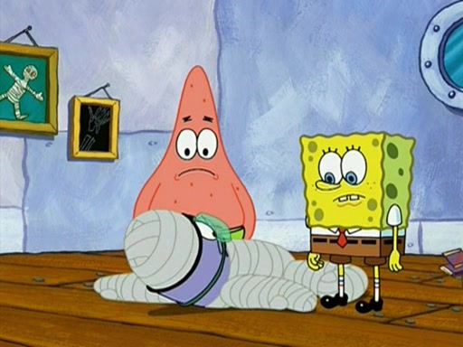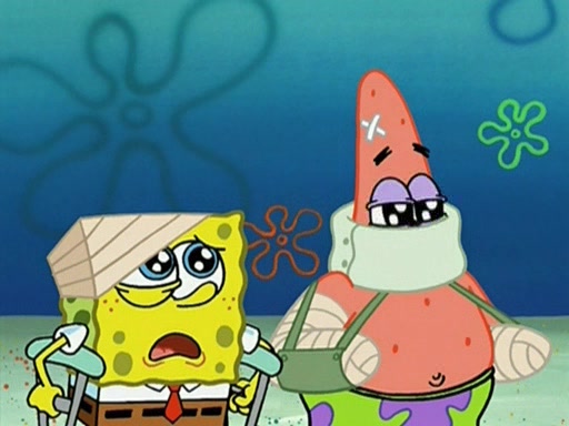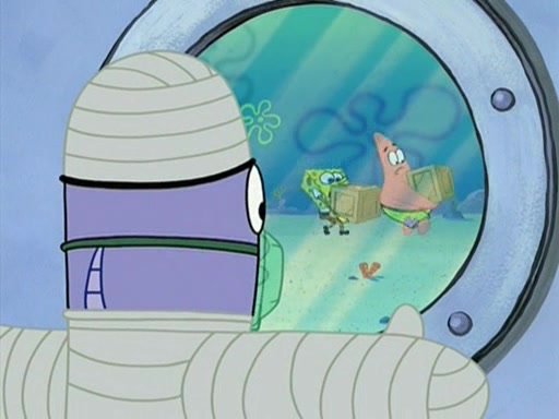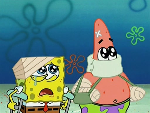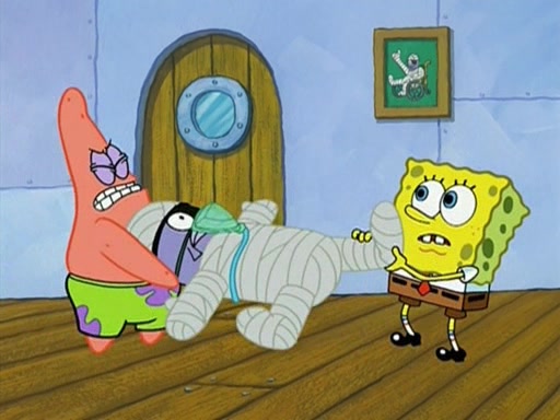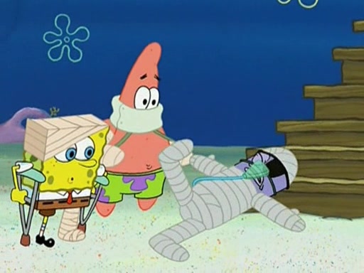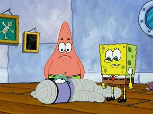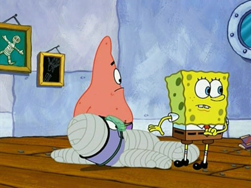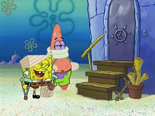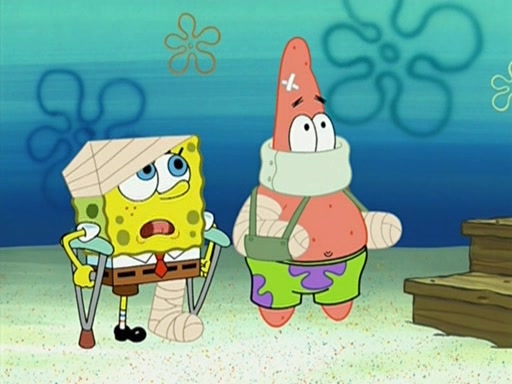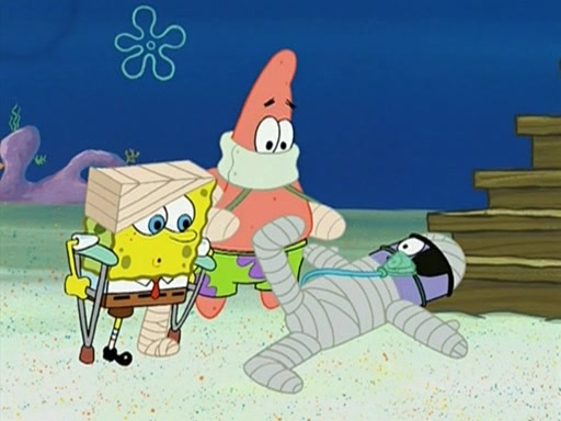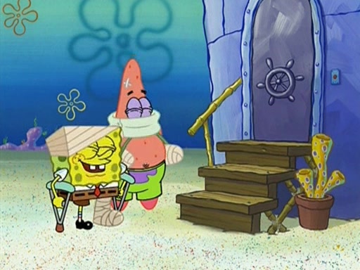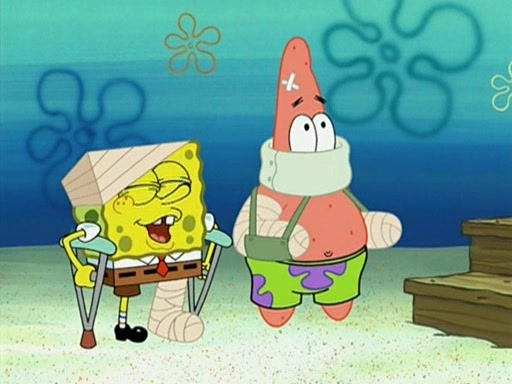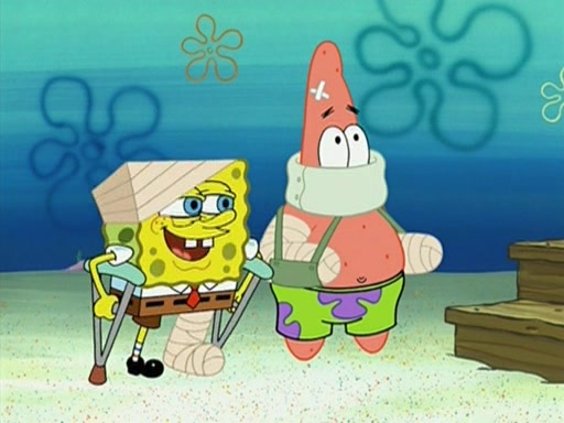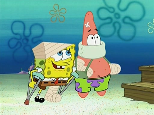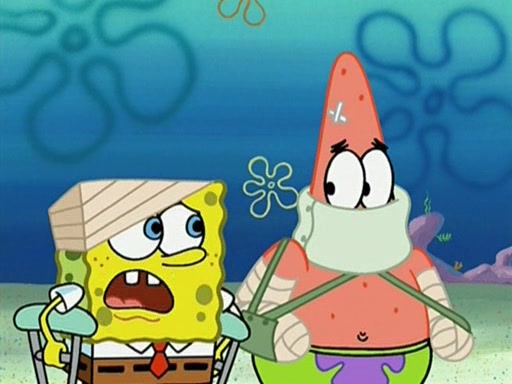 The duo continue this strategy, making several absurd promises about the chocolate. Their lies culminate in them dressing in bandages and pretending to be badly injured and in need of an operation. However, the customer they go to is himself in far worse shape than they claim to be, and must sell chocolate to pay his medical bills. Feeling extreme sympathy for the man, SpongeBob and Patrick buy a huge amount of chocolate from him with all the money they had just made. However, the man is then revealed to be the same con artist who had scammed them twice before.