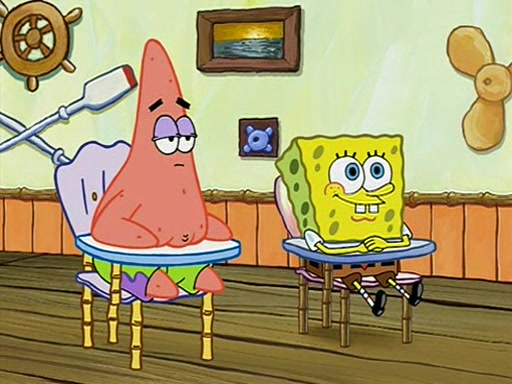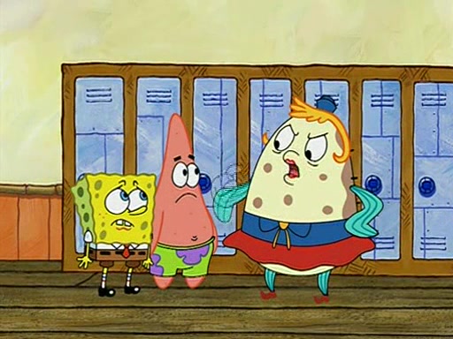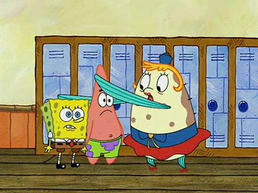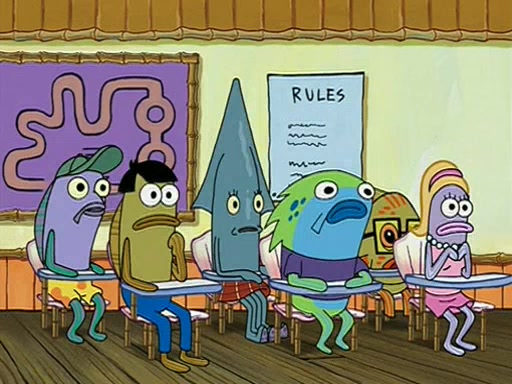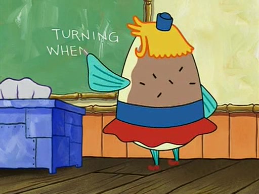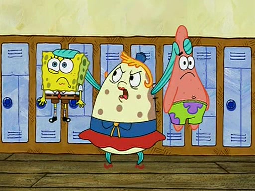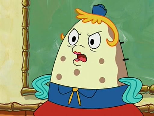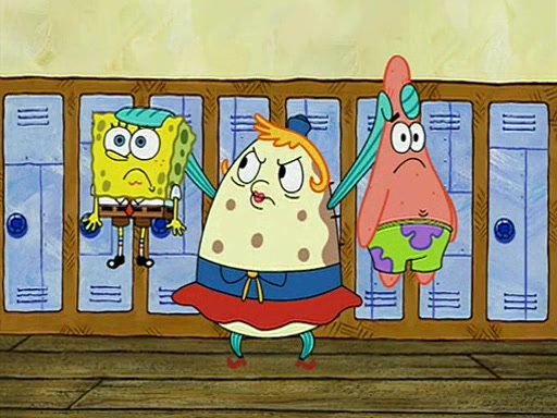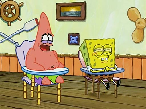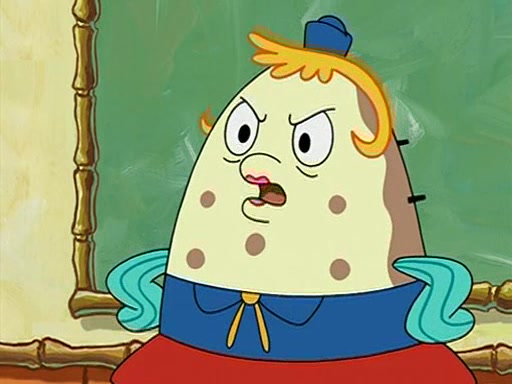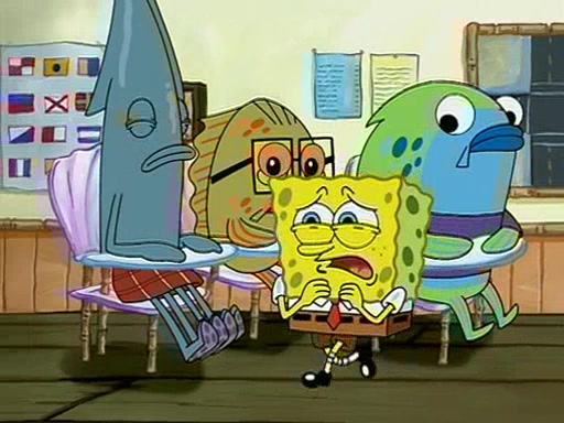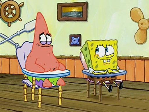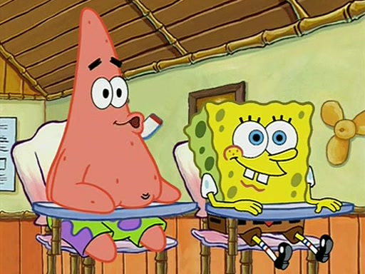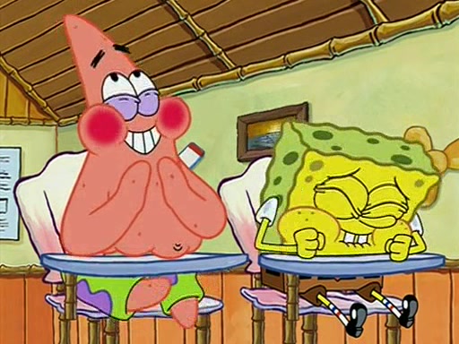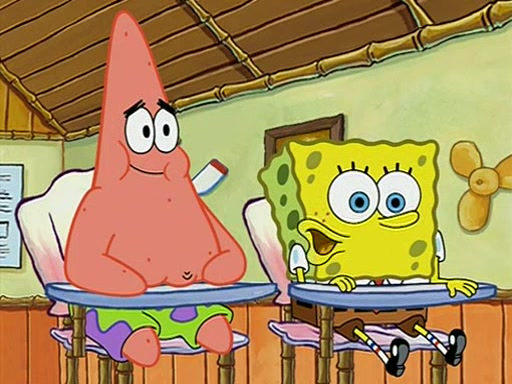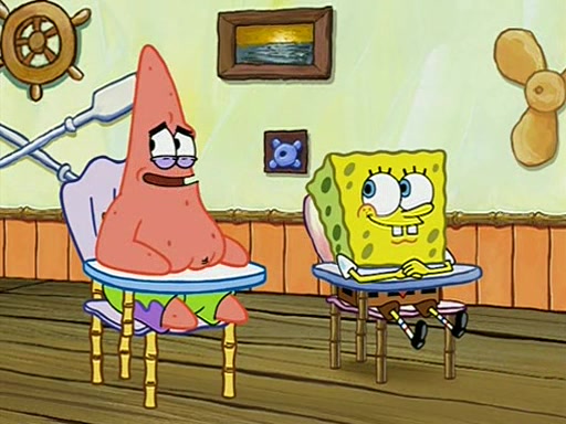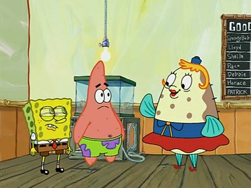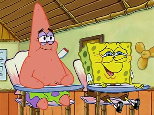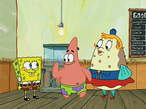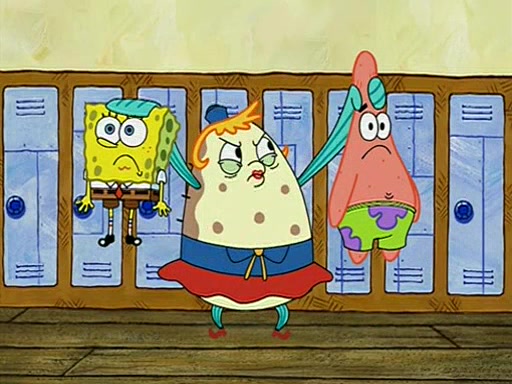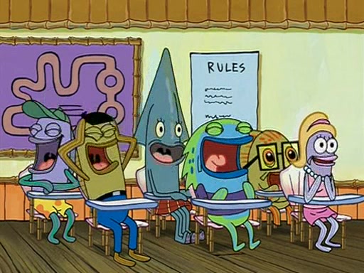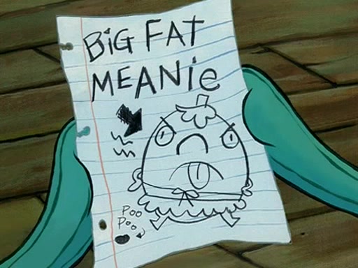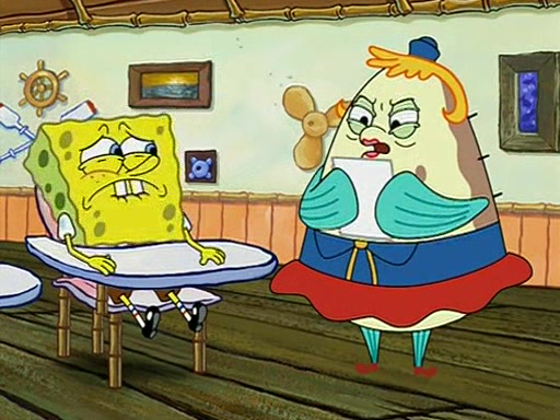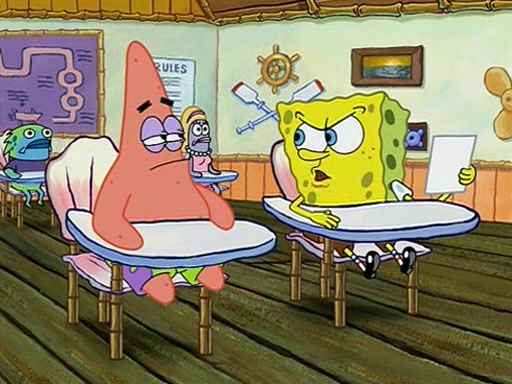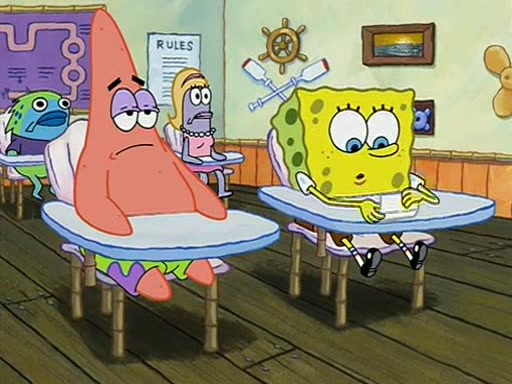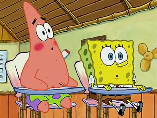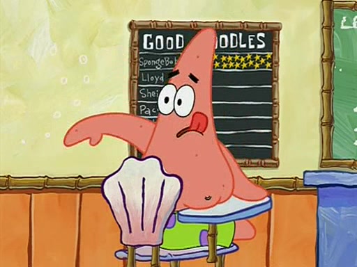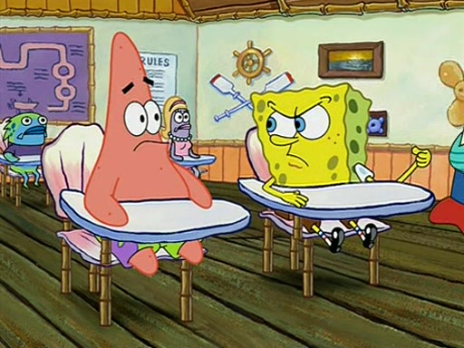 When class starts, Mrs. Puff sees the new student and asks him his name, Patrick gets nervous and replies with "twenty-four," and the whole class laughs at. At their desks, SpongeBob and Patrick laugh among each other about the what comes after number "twenty-four, SpongeBob said "twenty-five," and Mrs. Puff warns them to pay attention. Later, Patrick draws an ugly picture of Mrs. Puff, which she believes was made by SpongeBob. "Big Fat Meanie!" and on the bottom and it says "poo poo". Mrs. Puff has a small plastic spatula and removes one of his stars from his good noodles. much to his horror, and tells him to move to the available desk in the back of the room. Soon after, Patrick tries to tell SpongeBob something, and SpongeBob, very angry at him, tries to ignore him. Patrick begins throwing spitballs at SpongeBob to get his attention, and says that he has "something important" to tell him. SpongeBob finally asks him what he has to say, and Patrick simply says "Hi." SpongeBob is furious, and screams out "Hiiiiiiiii!" in frustration, causing the spitballs on him to fly all the way to Mrs. Puff, who angrily says "Perhaps this would be a good time for recess."