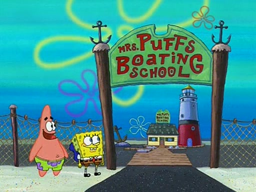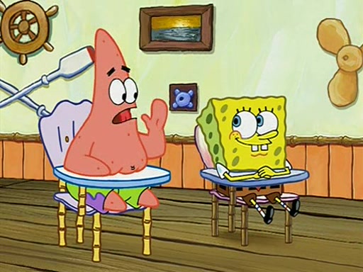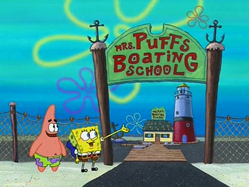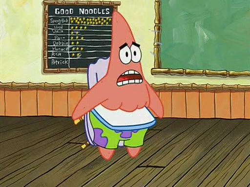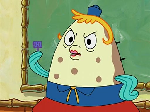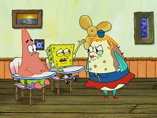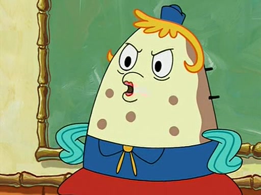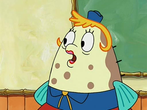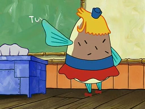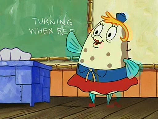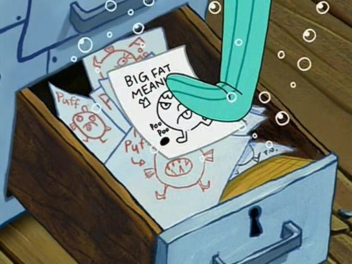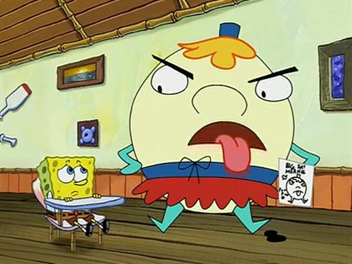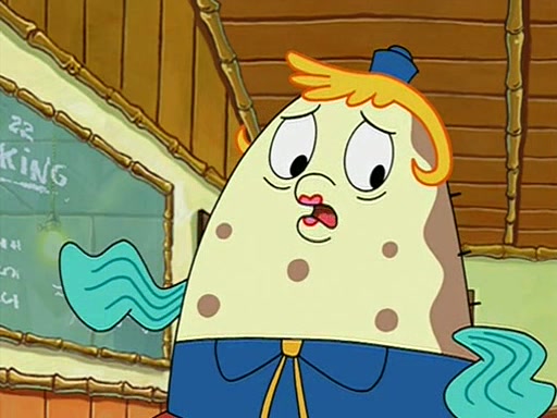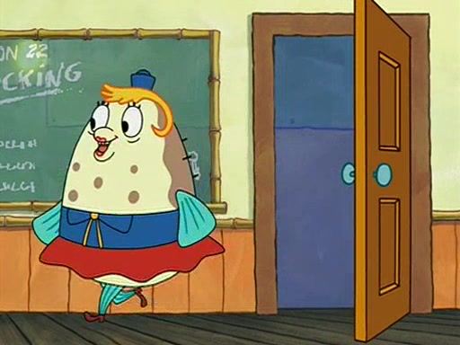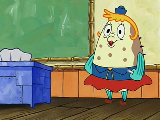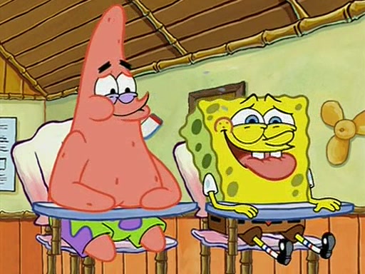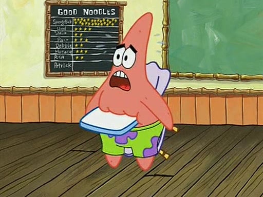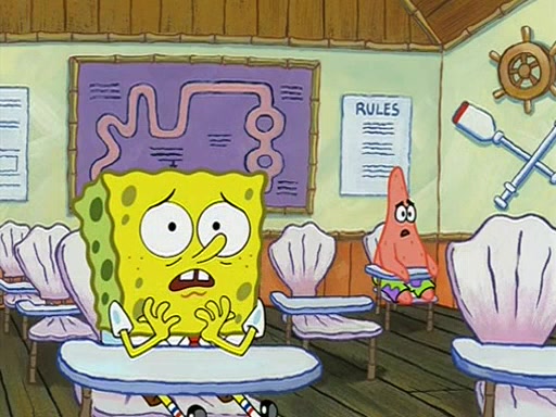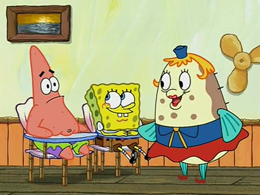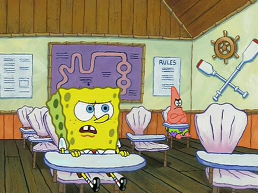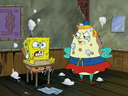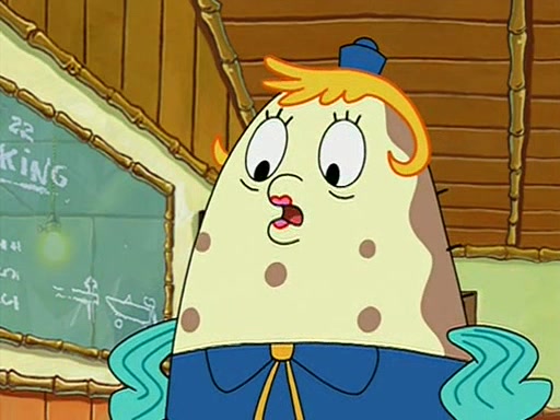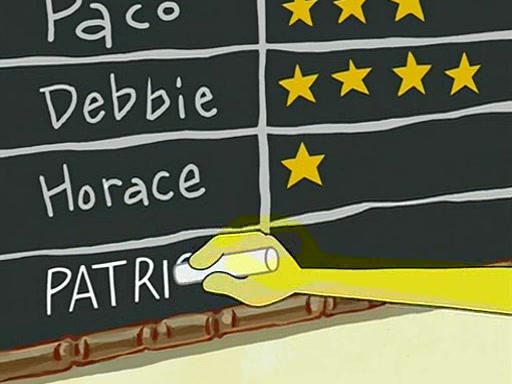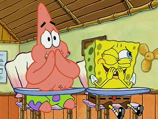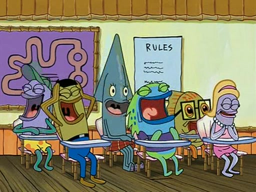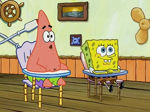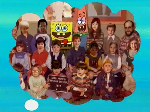 When class starts, Mrs. Puff sees the new student and asks him his name, Patrick gets nervous and replies with "twenty-four," and the whole class laughs at. At their desks, SpongeBob and Patrick laugh among each other about the what comes after number "twenty-four, SpongeBob said "twenty-five," and Mrs. Puff warns them to pay attention. Later, Patrick draws an ugly picture of Mrs. Puff, which she believes was made by SpongeBob. "Big Fat Meanie!" and on the bottom and it says "poo poo". Mrs. Puff has a small plastic spatula and removes one of his stars from his good noodles. much to his horror, and tells him to move to the available desk in the back of the room. Soon after, Patrick tries to tell SpongeBob something, and SpongeBob, very angry at him, tries to ignore him. Patrick begins throwing spitballs at SpongeBob to get his attention, and says that he has "something important" to tell him. SpongeBob finally asks him what he has to say, and Patrick simply says "Hi." SpongeBob is furious, and screams out "Hiiiiiiiii!" in frustration, causing the spitballs on him to fly all the way to Mrs. Puff, who angrily says "Perhaps this would be a good time for recess."