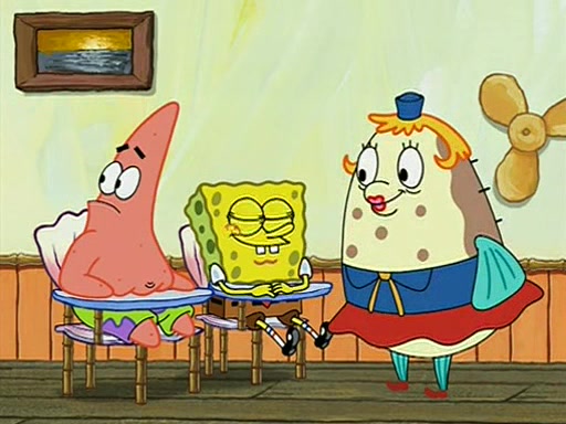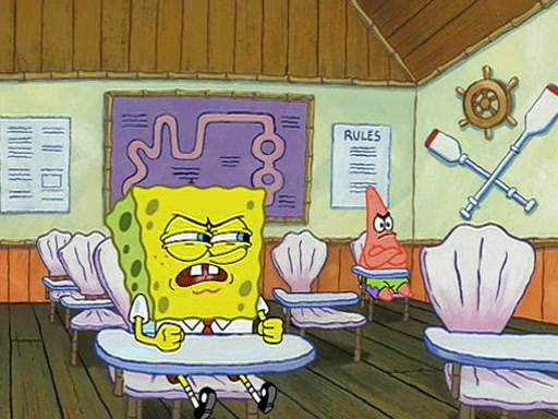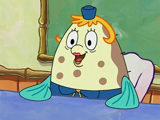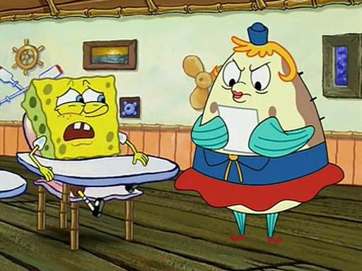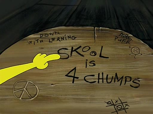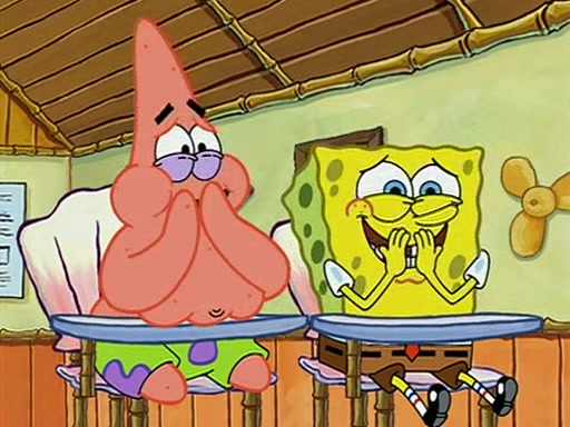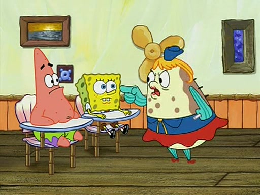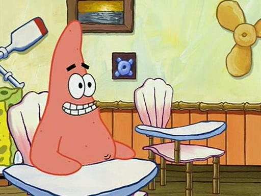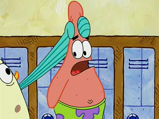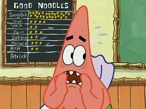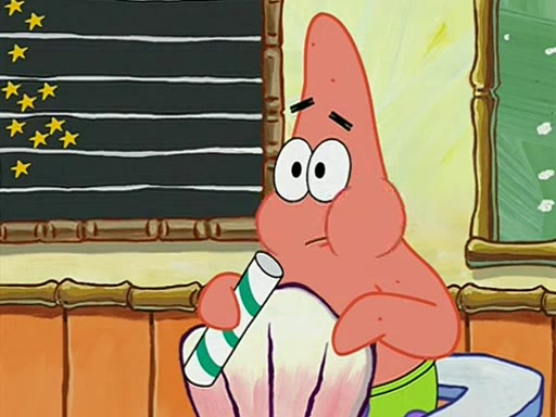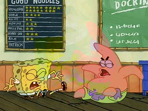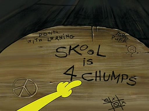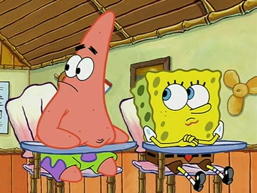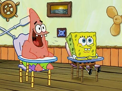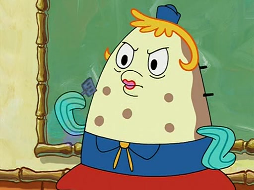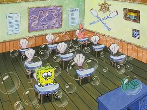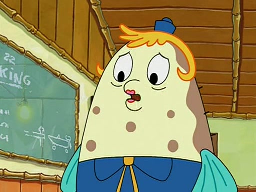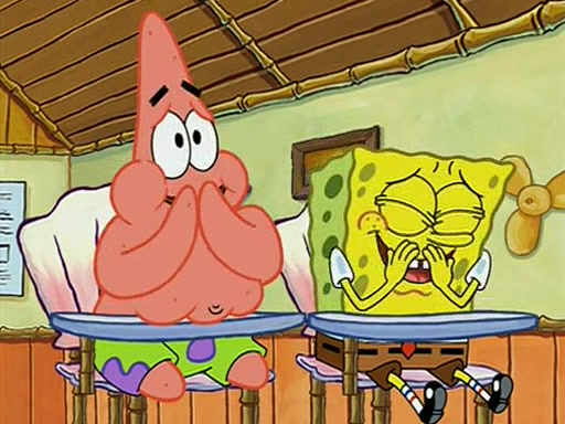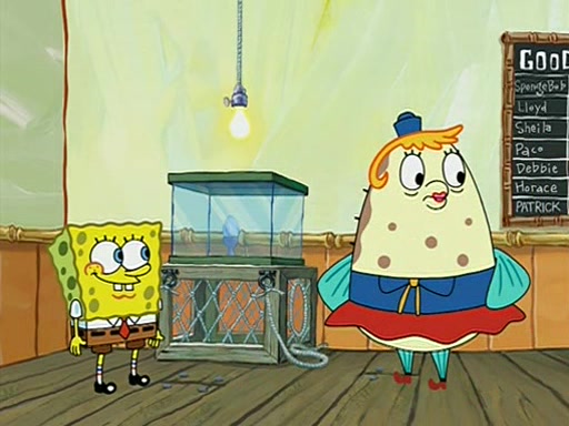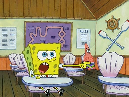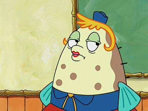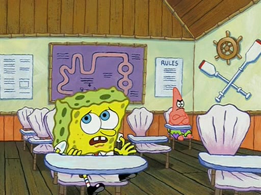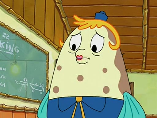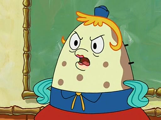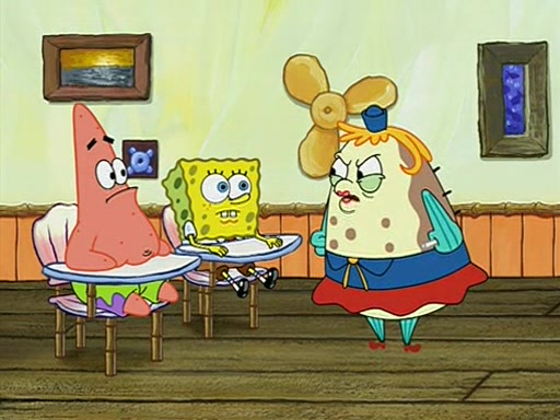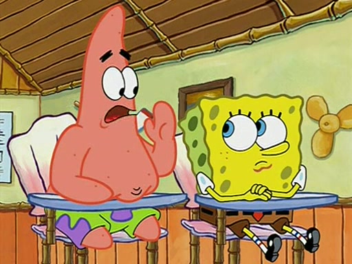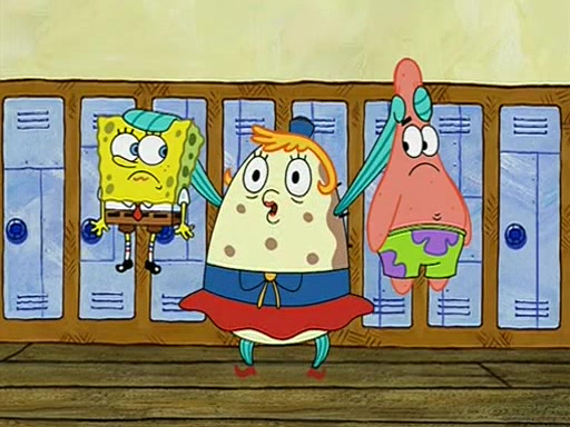 When class starts, Mrs. Puff sees the new student and asks him his name, Patrick gets nervous and replies with "twenty-four," and the whole class laughs at. At their desks, SpongeBob and Patrick laugh among each other about the what comes after number "twenty-four, SpongeBob said "twenty-five," and Mrs. Puff warns them to pay attention. Later, Patrick draws an ugly picture of Mrs. Puff, which she believes was made by SpongeBob. "Big Fat Meanie!" and on the bottom and it says "poo poo". Mrs. Puff has a small plastic spatula and removes one of his stars from his good noodles. much to his horror, and tells him to move to the available desk in the back of the room. Soon after, Patrick tries to tell SpongeBob something, and SpongeBob, very angry at him, tries to ignore him. Patrick begins throwing spitballs at SpongeBob to get his attention, and says that he has "something important" to tell him. SpongeBob finally asks him what he has to say, and Patrick simply says "Hi." SpongeBob is furious, and screams out "Hiiiiiiiii!" in frustration, causing the spitballs on him to fly all the way to Mrs. Puff, who angrily says "Perhaps this would be a good time for recess."