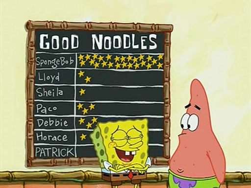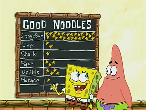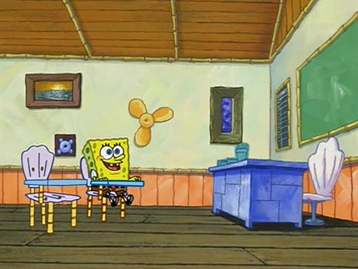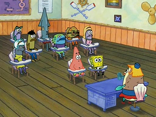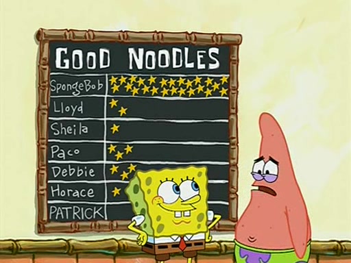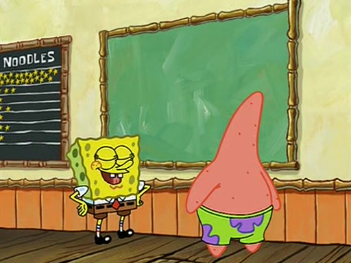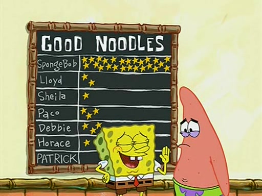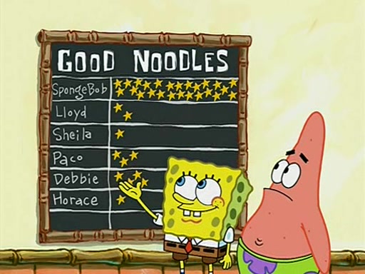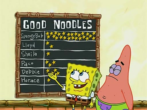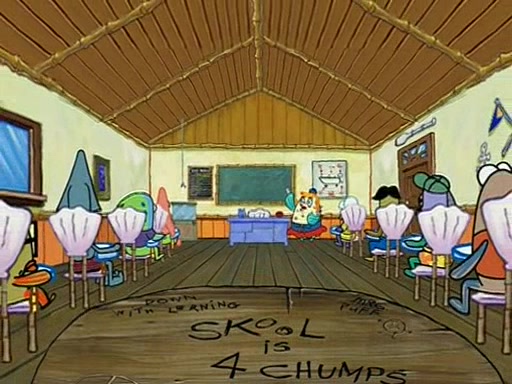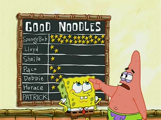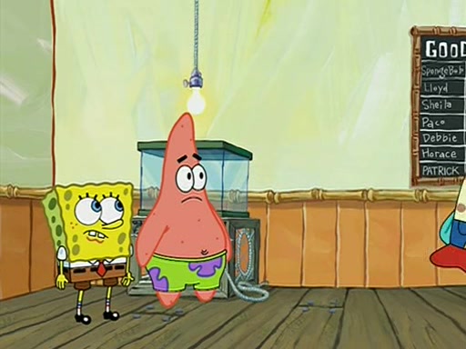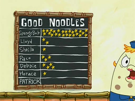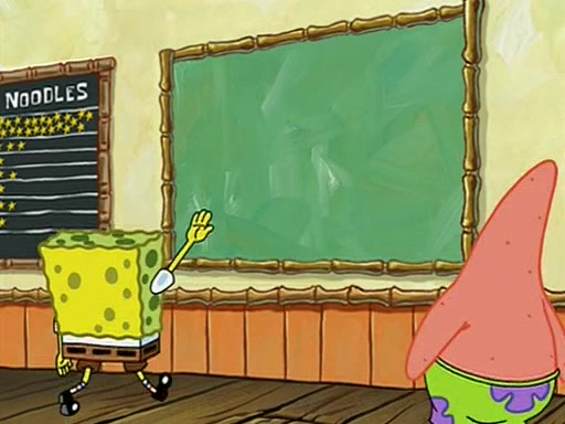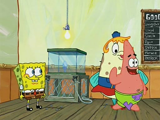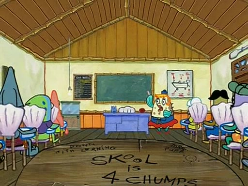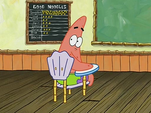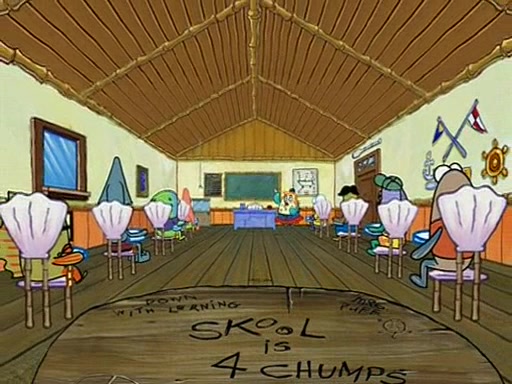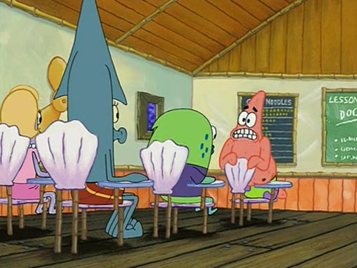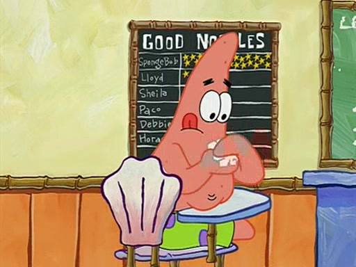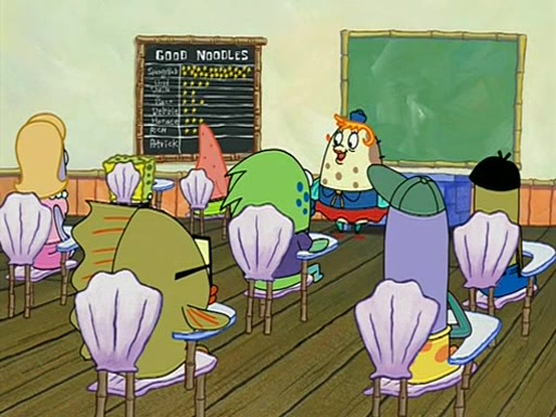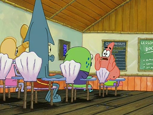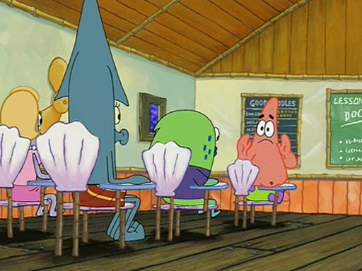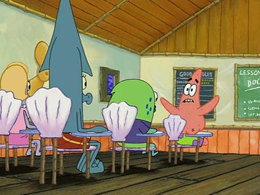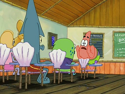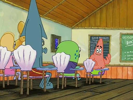 They arrive at 6:20 a.m., and class starts at 9:00 a.m., which SpongeBob considers "Late for being early", he then shows Patrick around the school, and explains their classroom's "Good Noodle board" system, where "good noodle stars" are placed on a good noodle board next to the chalkboard. SpongeBob has by far the most stars of anyone in the class, (seventy-four) and adds Patrick's name to the chart so he can start collecting stars. He also shows Roger, an unborn animal egg in a case with only a light-bulb for warmth.