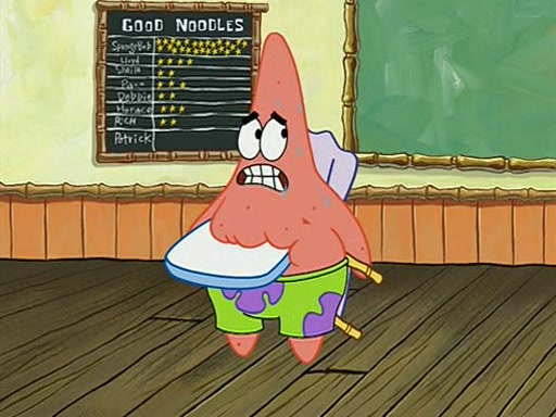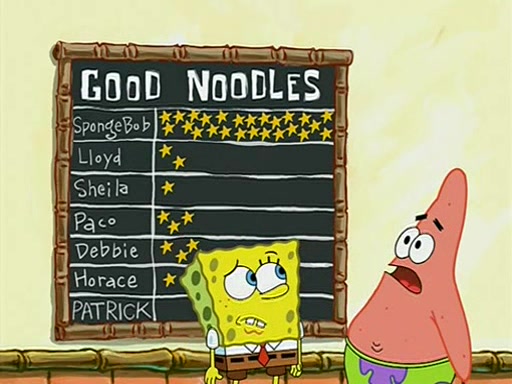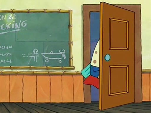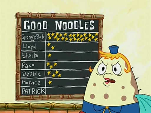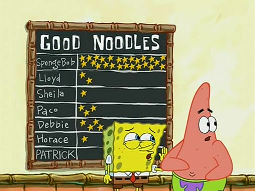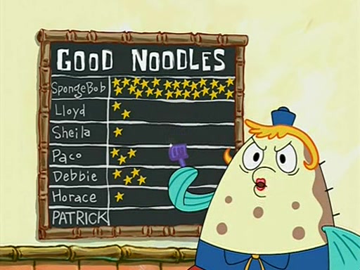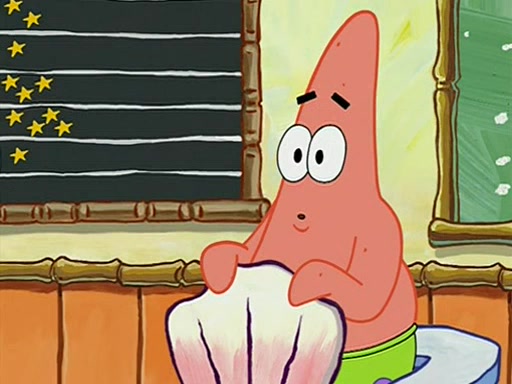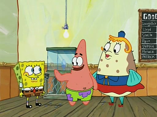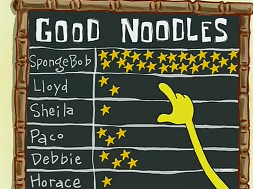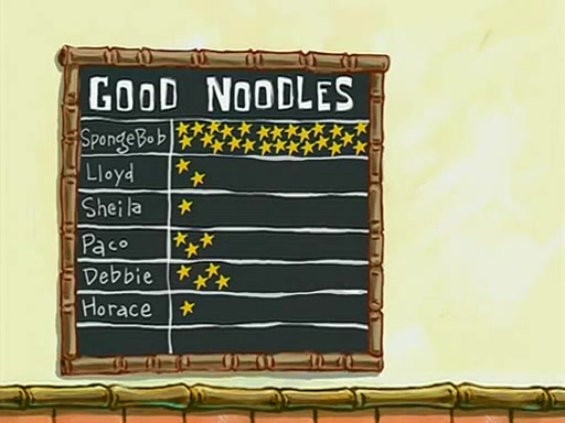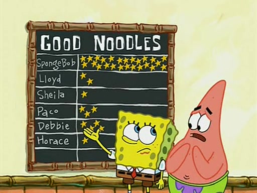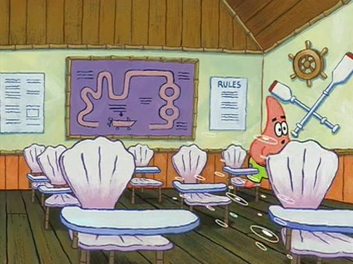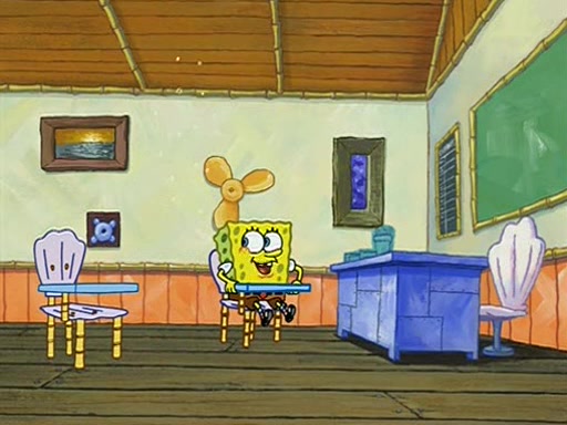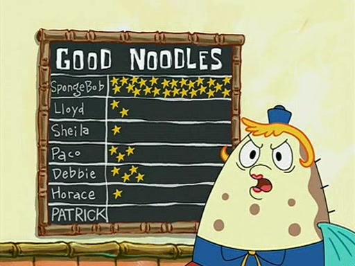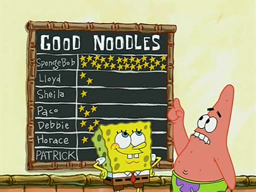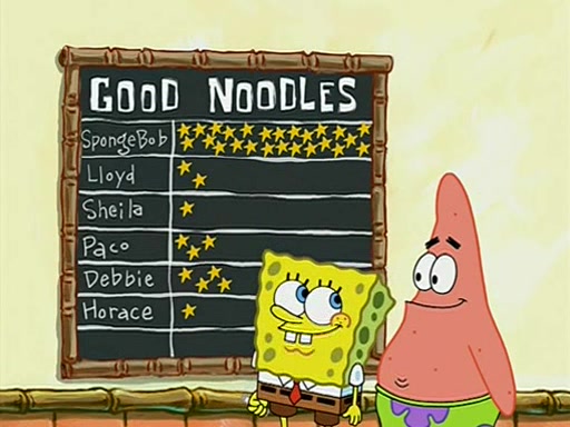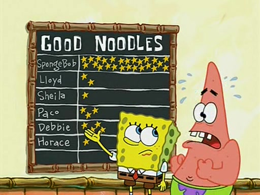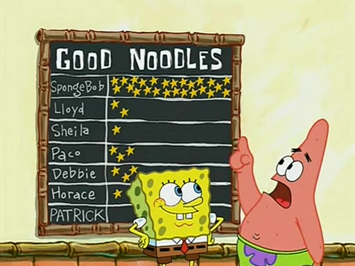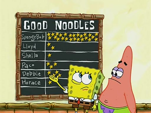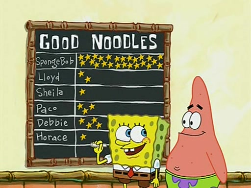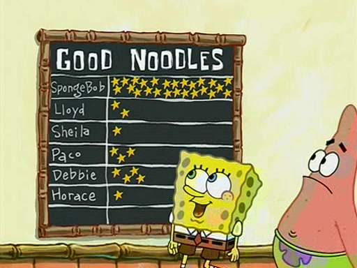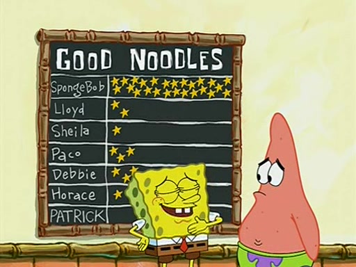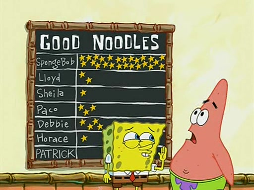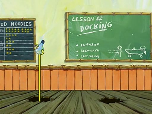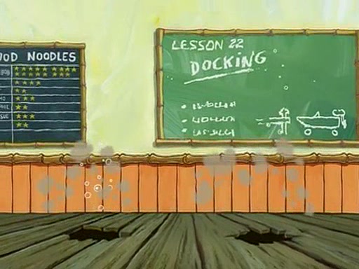 They arrive at 6:20 a.m., and class starts at 9:00 a.m., which SpongeBob considers "Late for being early", he then shows Patrick around the school, and explains their classroom's "Good Noodle board" system, where "good noodle stars" are placed on a good noodle board next to the chalkboard. SpongeBob has by far the most stars of anyone in the class, (seventy-four) and adds Patrick's name to the chart so he can start collecting stars. He also shows Roger, an unborn animal egg in a case with only a light-bulb for warmth.