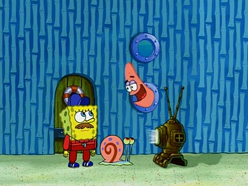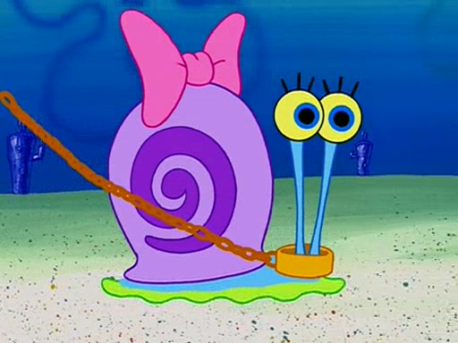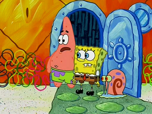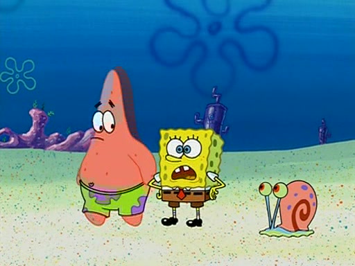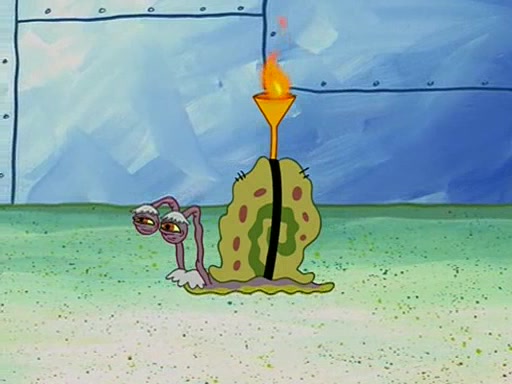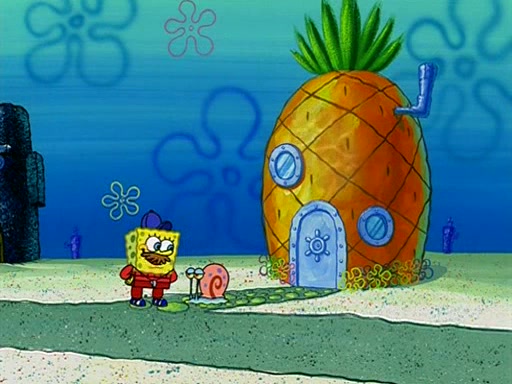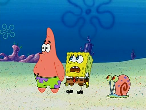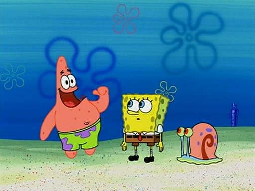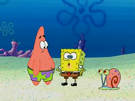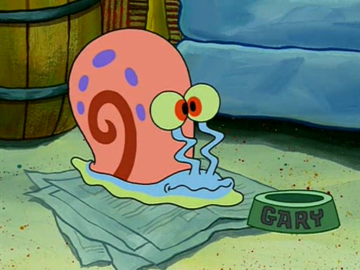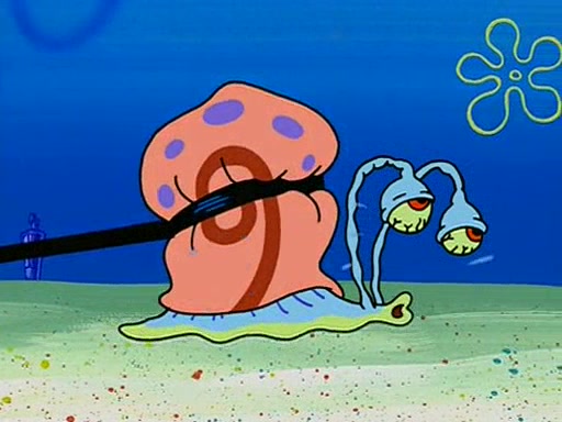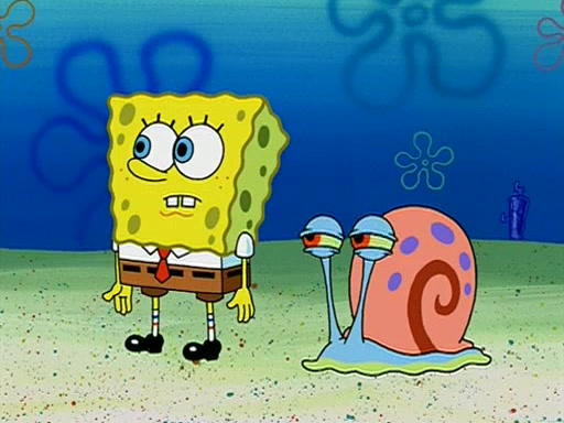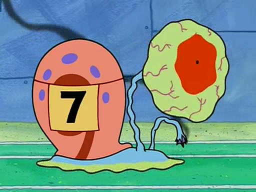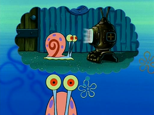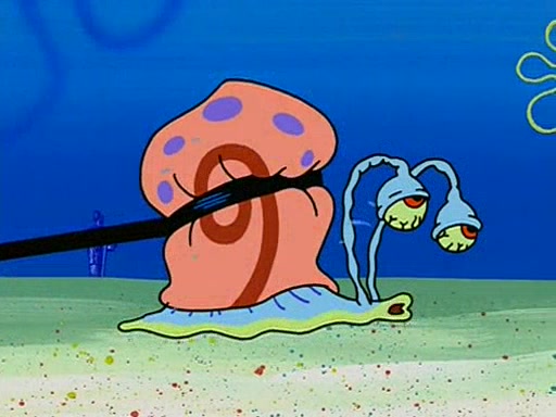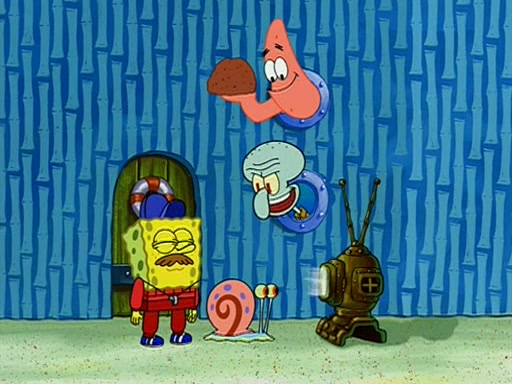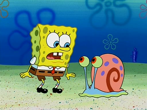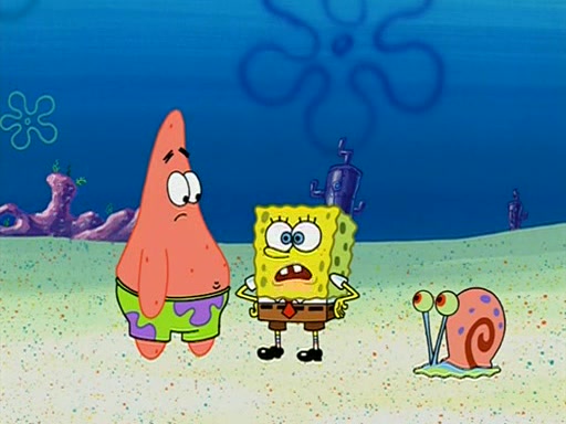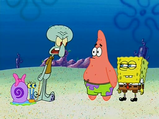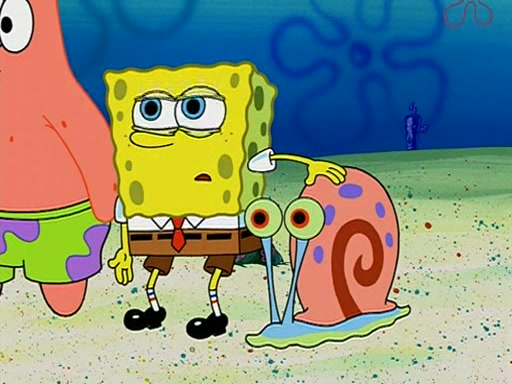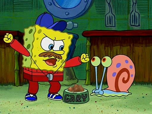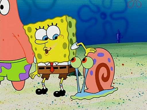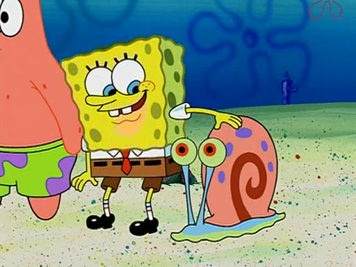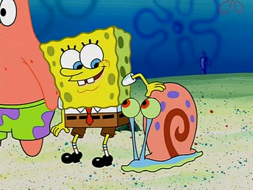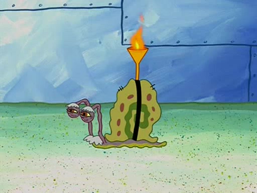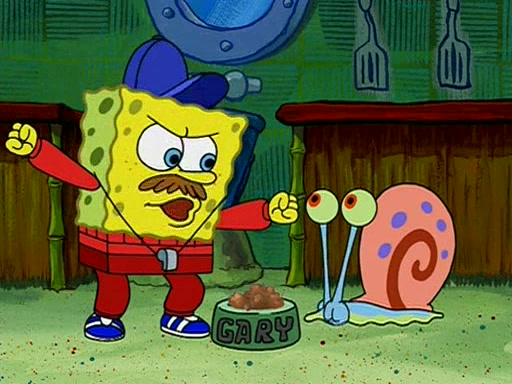 SpongeBob makes a shake with weird ingredients and gives it to Gary, but Gary runs to the living room. Patrick shows SpongeBob his snail, which is a rock. Patrick says he has nerves of steel.