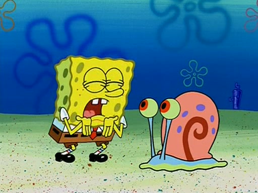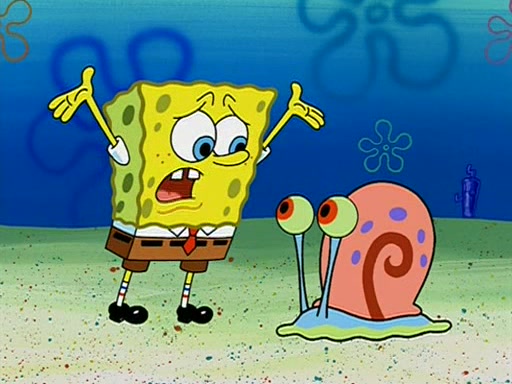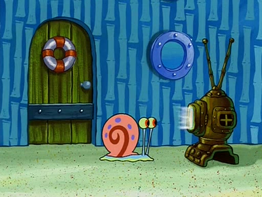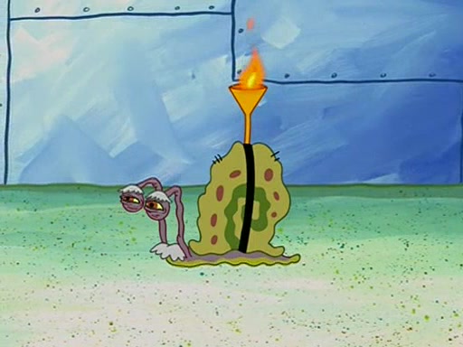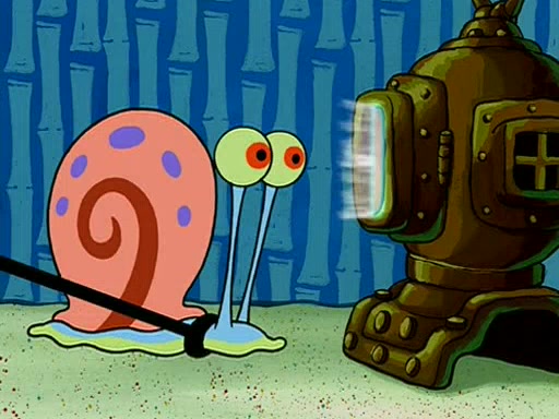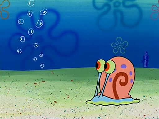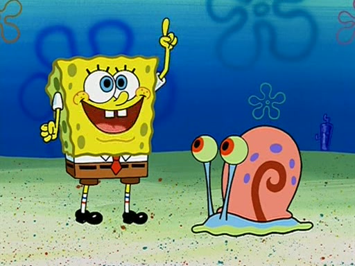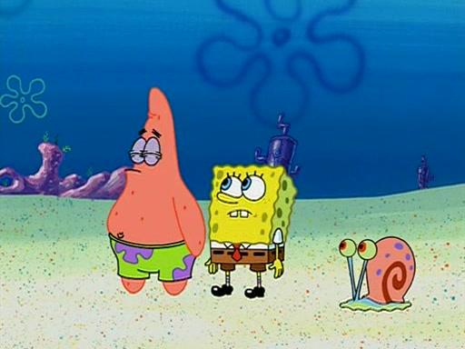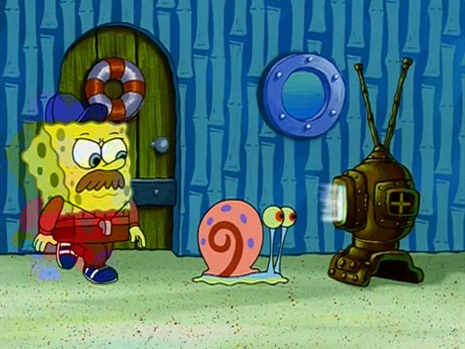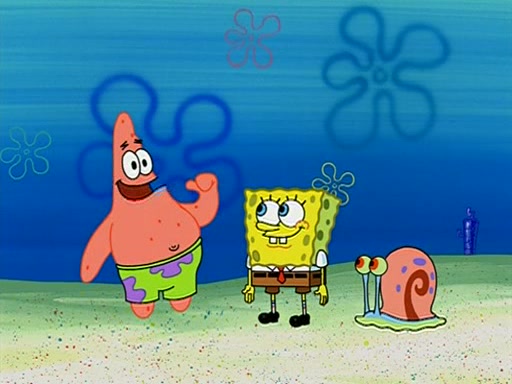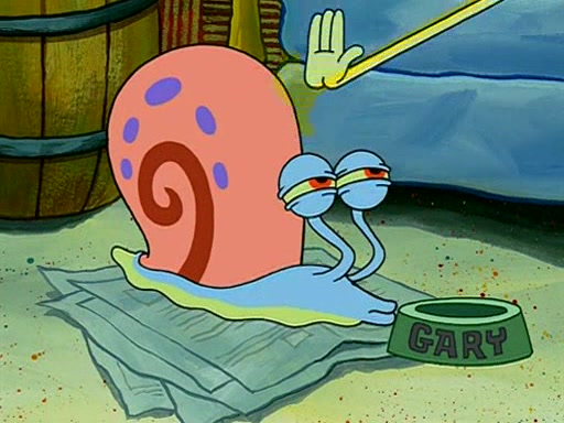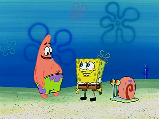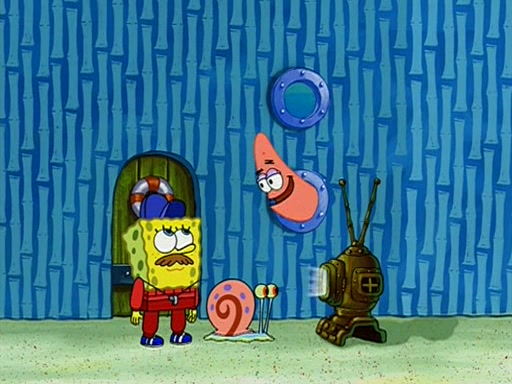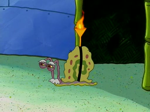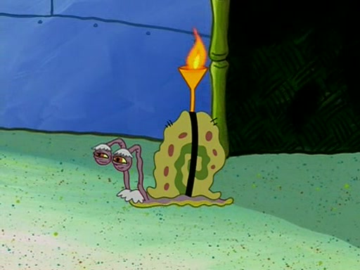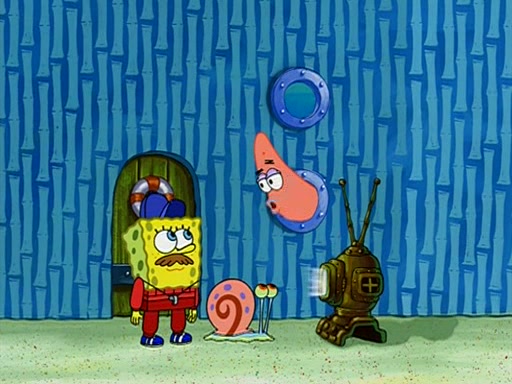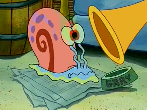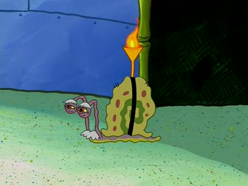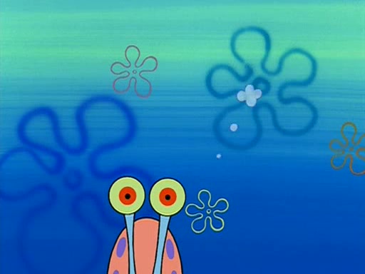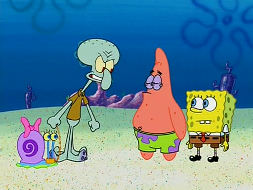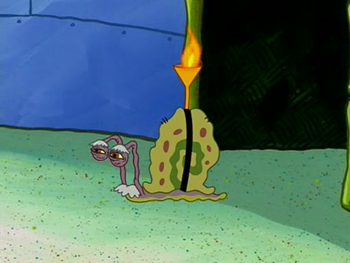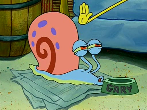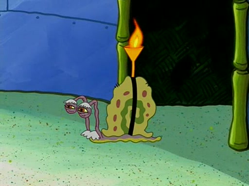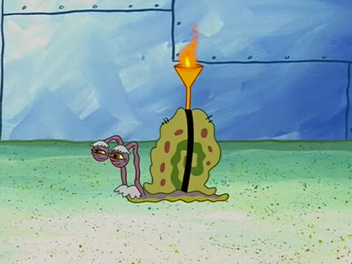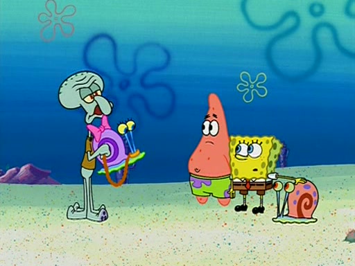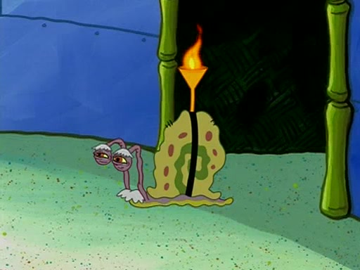 SpongeBob makes a shake with weird ingredients and gives it to Gary, but Gary runs to the living room. Patrick shows SpongeBob his snail, which is a rock. Patrick says he has nerves of steel.